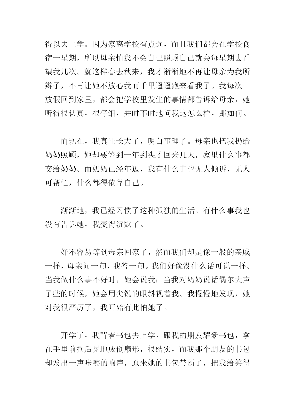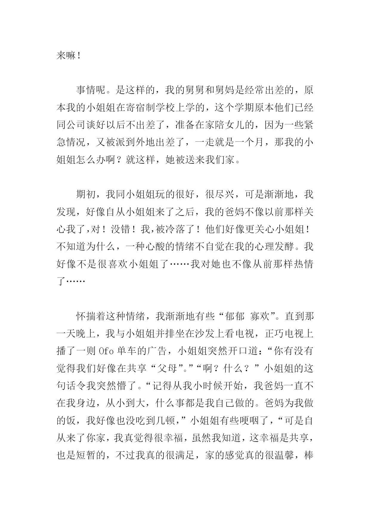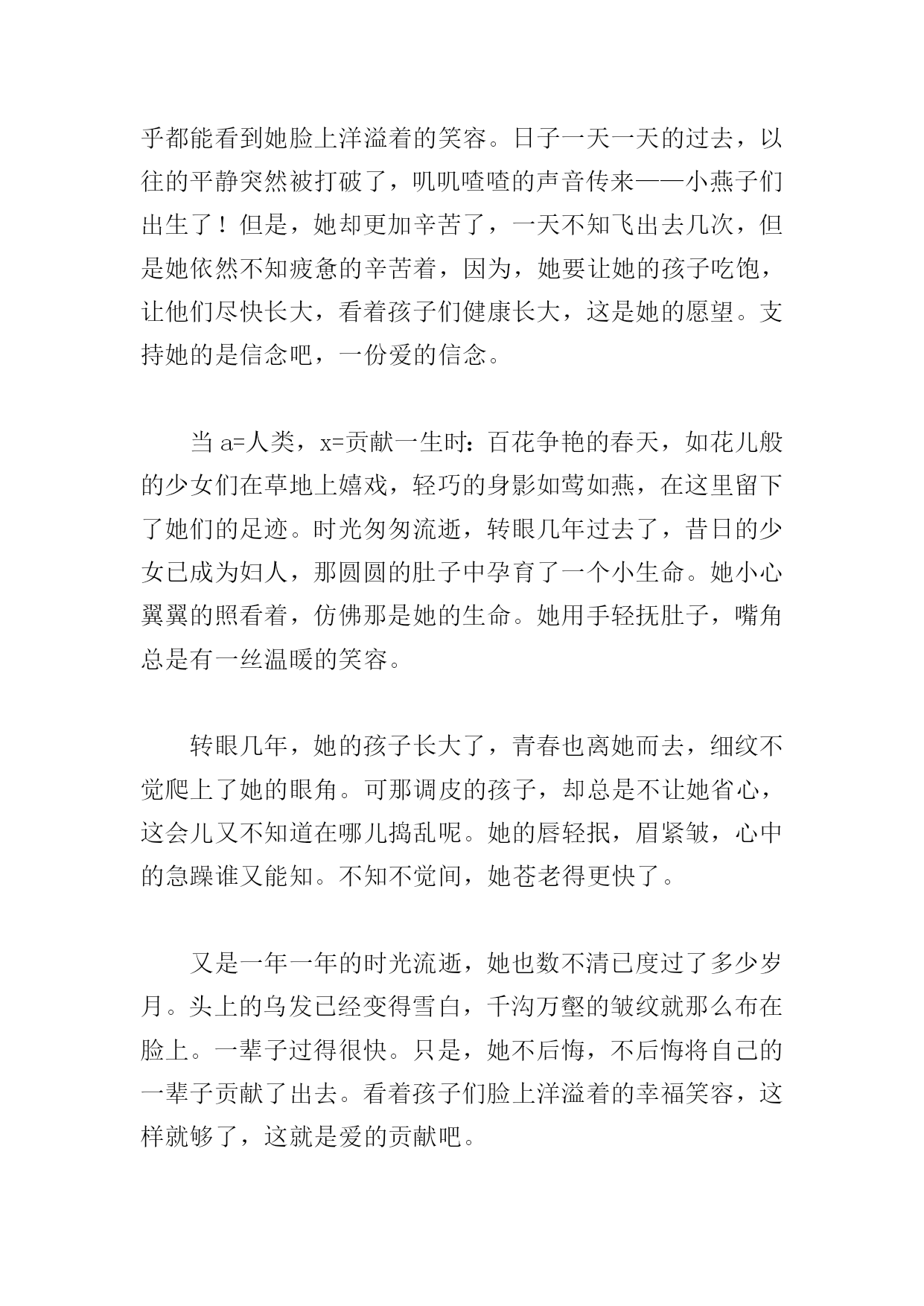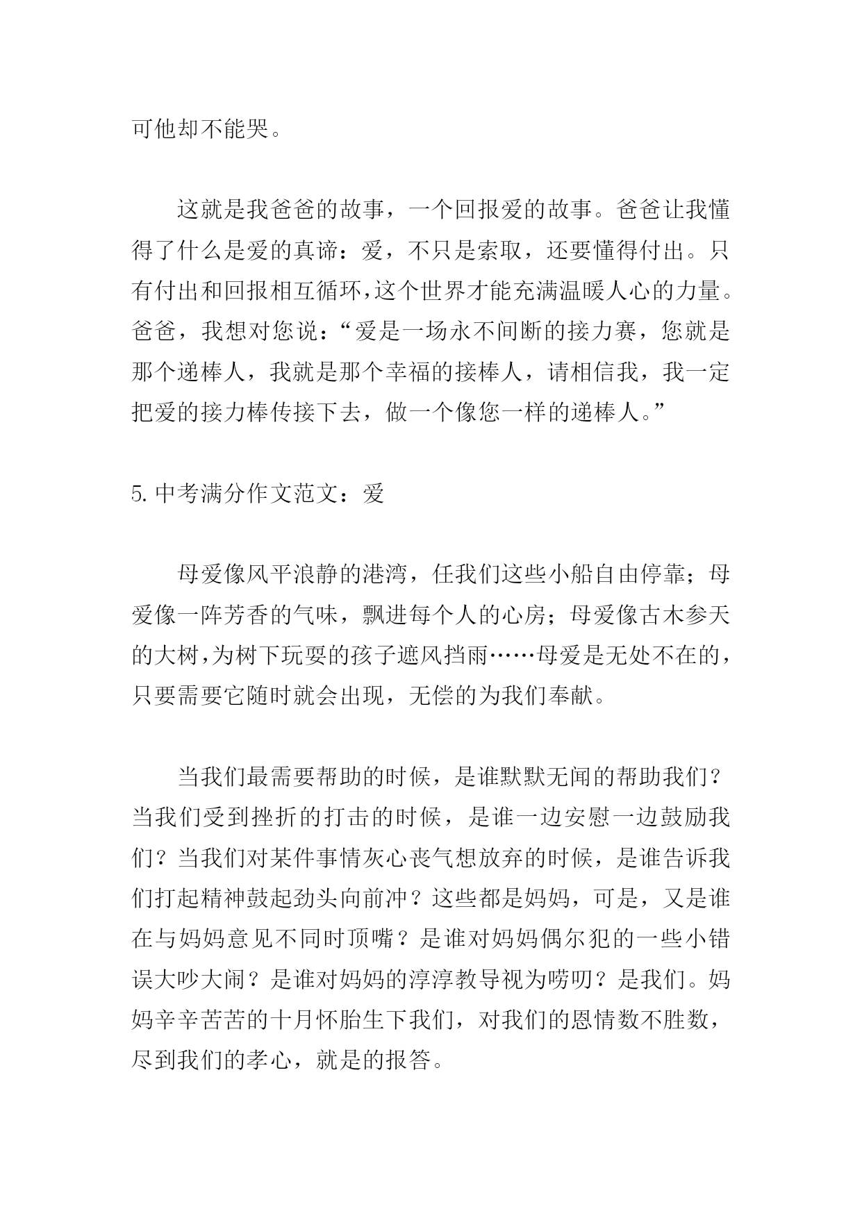 中考满分作文范文:爱1.中考满分作文范文:爱爱是多种多样的,几乎没有人可以用具体的语言来描绘它。但是,我就可以。设世间的生物为a,爱的方式为x,则ax=爱。当a=桃花,x=枯萎自己时:幽幽的微风吹来了三月的春天,娇艳的桃花如舞会上美丽的贵族小姐,青春,靓丽。只是,这春天来的快,去得也快。辛勤的蜜蜂带来了花粉,昔日美丽的桃花,褪去华丽的外衣,正在精心的照看她的宝宝。因为害怕他的营养不够,她枯萎了自己,只是那枯黄的花瓣却依旧挂在枝头,眷恋那逐渐成熟的果实,即使脆弱得不堪一击,也死命地挡住那狂风的攻击,她依靠的是一份牵挂吧,一份爱的牵挂。当a=燕子,x=劳累自己时:迎春花开,迎来了春天,也迎回了燕子。那轻巧的身影来不及休息,就接着忙了起来,来来回回,进进出出,不停地衔着泥丸,经过一天的劳累,一个可爱的家就建好了。她欣喜的绕着新家不停的飞舞,似乎都能看到她脸上洋溢着的笑容。日子一天一天的过去,以往的平静突然被打破了,叽叽喳喳的声音传来——小燕子们出生了!但是,她却更加辛苦了,一天不知飞出去几次,但是她依然不知疲惫的辛苦着,因为,她要让她的孩子吃饱,让他们尽快长大,看着孩子们健康长大,这是她的愿望。支持她的是信念吧,一份爱的信念。当a=人类,x=贡献一生时:百花争艳的春天,如花儿般的少女们在草地上嬉戏,轻巧的身影如莺如燕,在这里留下了她们的足迹。时光匆匆流逝,转眼几年过去了,昔日的少女已成为妇人,那圆圆的肚子中孕育了一个小生命。她小心翼翼的照看着,仿佛那是她的生命。她用手轻抚肚子,嘴角总是有一丝温暖的笑容。转眼几年,她的孩子长大了,青春也离她而去,细纹不觉爬上了她的眼角。可那调皮的孩子,却总是不让她省心,这会儿又不知道在哪儿捣乱呢。她的唇轻抿,眉紧皱,心中的急躁谁又能知。不知不觉间,她苍老得更快了。又是一年一年的时光流逝,她也数不清已度过了多少岁月。头上的乌发已经变得雪白,千沟万壑的皱纹就那么布在脸上。一辈子过得很快。只是,她不后悔,不后悔将自己的一辈子贡献了出去。看着孩子们脸上洋溢着的幸福笑容,这样就够了,这就是爱的贡献吧。经过验证,可得结论:a和x为任意值,爱没有限制,但每个爱都符合方程式。世界上到处都有爱的方程式。世界充满爱!2.中考满分作文范文:爱小时候,我觉得母亲是伟大的,是可敬的。我们无所不谈,亲亲昵昵。把母亲当作是无所不能的,一有事情就找他。早晨起床时,我就一直赖在床上等着母亲来料理我;吃饭时偶尔也会要好喂我,连碗都话在桌子上;晚上睡觉时,我喜欢母亲抱着我进入梦乡,仿佛这样有安全感一些;半夜我从恶梦中惊醒,母亲就慢慢地安抚我入睡。我的一切似乎都离不开母亲。长大后,我每天大清早要起床去上学。那时,我的头发已长成了长长的小辫子。早晨起床时,由于我的小辫子有些长,所以还不足以自己伸手去弄,只得靠母亲那双巧手在我头上挥舞两下,我才得以去上学。因为家离学校有点远,而且我们都会在学校食宿一星期,所以母亲怕我不会自己照顾自己就会每星期去看望我几次。就这样春去秋来,我才渐渐地不再让母亲为我所辫子,不再让她不放心我而千里迢迢跑来看我了。我每次一放假回到家里,都会把学校里发生的事情都告诉给母亲,她听得很认真,很仔细,并时不时地问我这怎么样,那如何。而现在,我真正长大了,明白事理了。母亲也把我扔给奶奶照顾,她却要等到一年到头才回来几天,家里什么事都交给奶奶。而奶奶已经年迈,我有什么事也无人倾诉,无人可帮忙,什么都得依靠自己。渐渐地,我已经习惯了这种孤独的生活。有什么事我也没有告诉她,我变得沉默了。好不容易等到母亲回家了,然而我们却是像一般的亲戚一样,母亲问一句,我答一句。我们好像没什么话可说一样。当我做什么事不好时,她会说我;当我对奶奶说话偶尔大声了些的时候,她会用尖锐的眼斜视着我。我慢慢地发现,她对我很严厉了,我开始有此怕她了。开学了,我背着书包去上学。跟我的朋友耀新书包,拿在手里前摆后晃地成倒扇形,很结实,而我那个朋友的书包却发出一声咔嚓的响声,原来她的书包带断了,把我给笑得前倒后仰。这时,她气不过却要将我的扯断,就在我们俩相持之下,结果,我听到了一声刺耳的声音——我的书包带也断了。这时,我才忽然发现,我的书包带上好像有几根坚固的细线的痕迹。原来,这是母亲前一天晚上在灯光下做的“手脚”,她知道我好动就故意事先在上面缝好了一道道“链条”以至牢固。顿时,我的心底有一股莫名的暖流冲上来。我的眼眶里仿佛布满了银霜,原来母亲一直都在我背后默默地关心我,而我却一直没有发现而已。3.中考满分作文范文:爱随着科技的迅速发展,越来越多的新鲜的产生出现在我们的身边,最近呢,有一种叫共享单车的新工具,逐渐遍布在我们生活的每个角落,随着共享单车的兴起,“共享”这词,逐