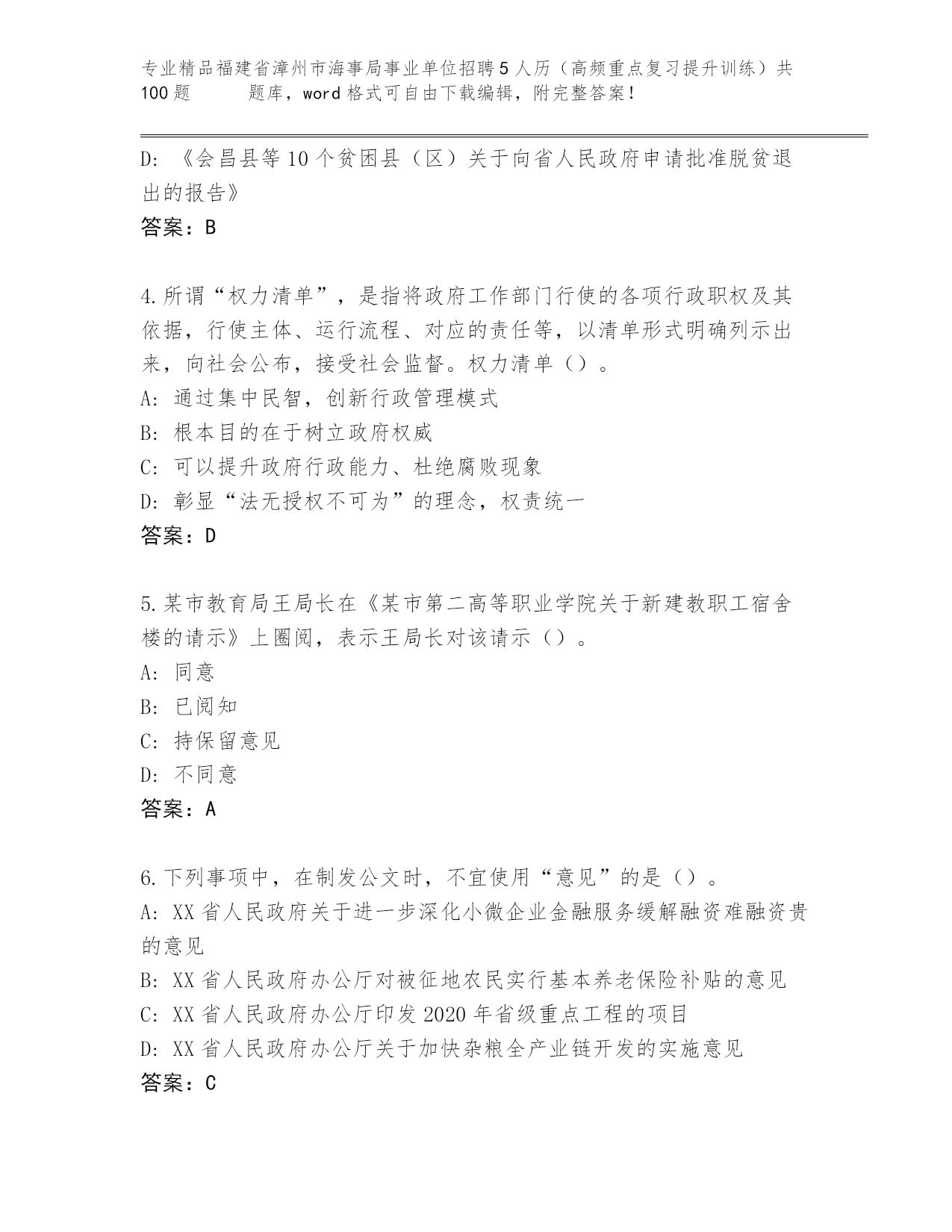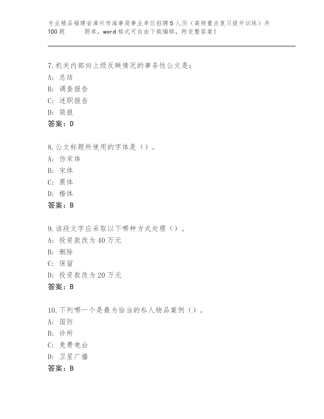 完整版福建省漳州市海事局事业单位招聘5人历(高频重点复习提升训练)共100题 题库完整答案