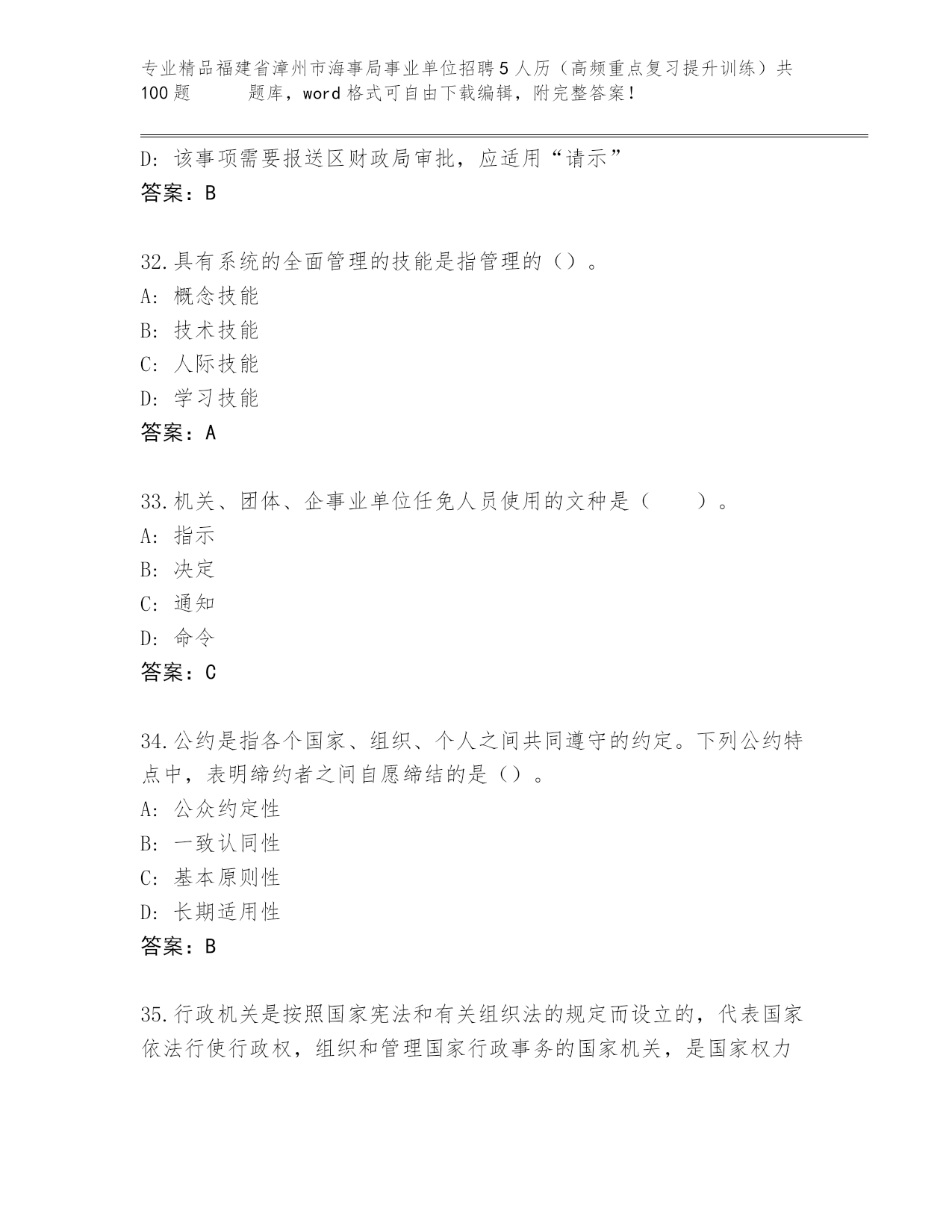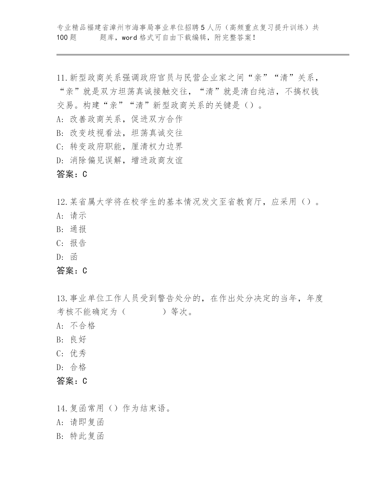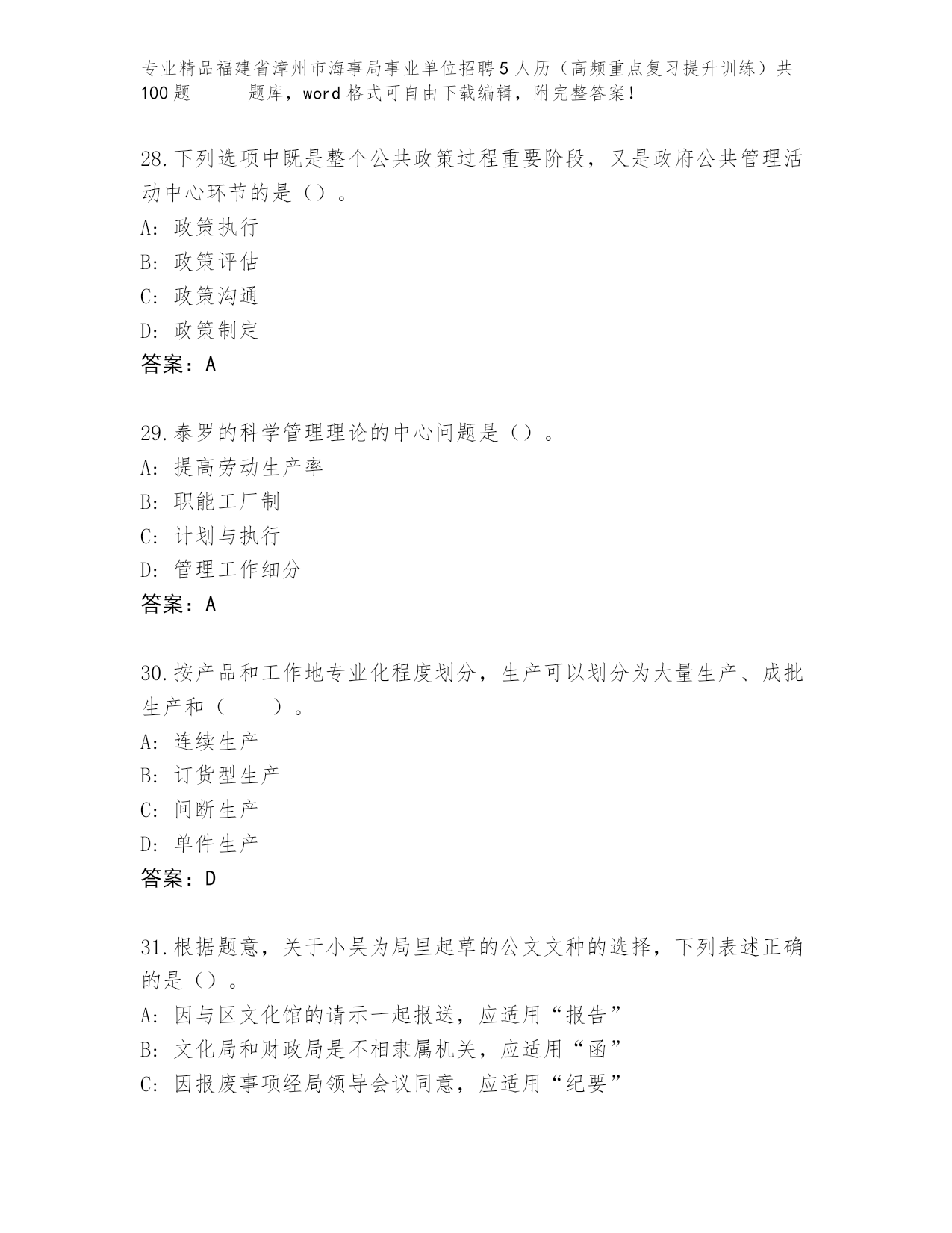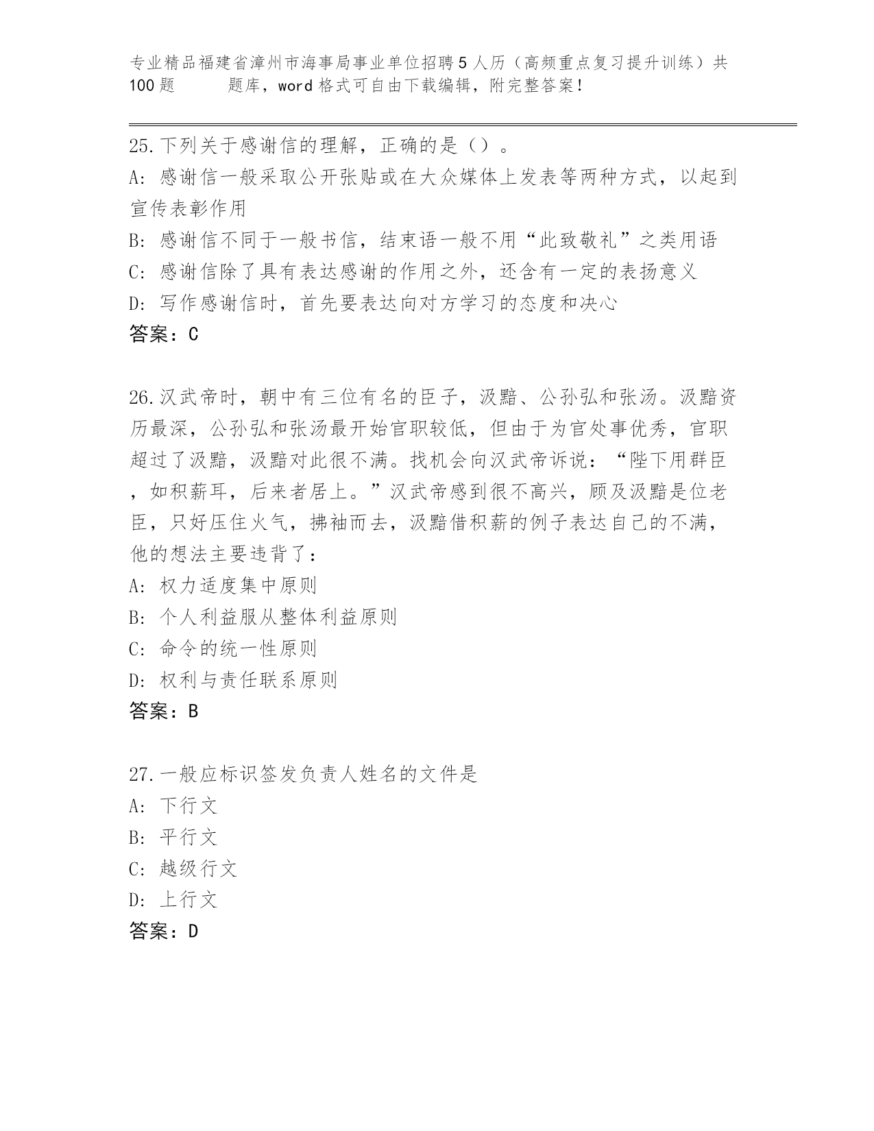 内部培训福建省漳州市海事局事业单位招聘5人历(高频重点复习提升训练)共100题 精品题库及答案(基础+提升)