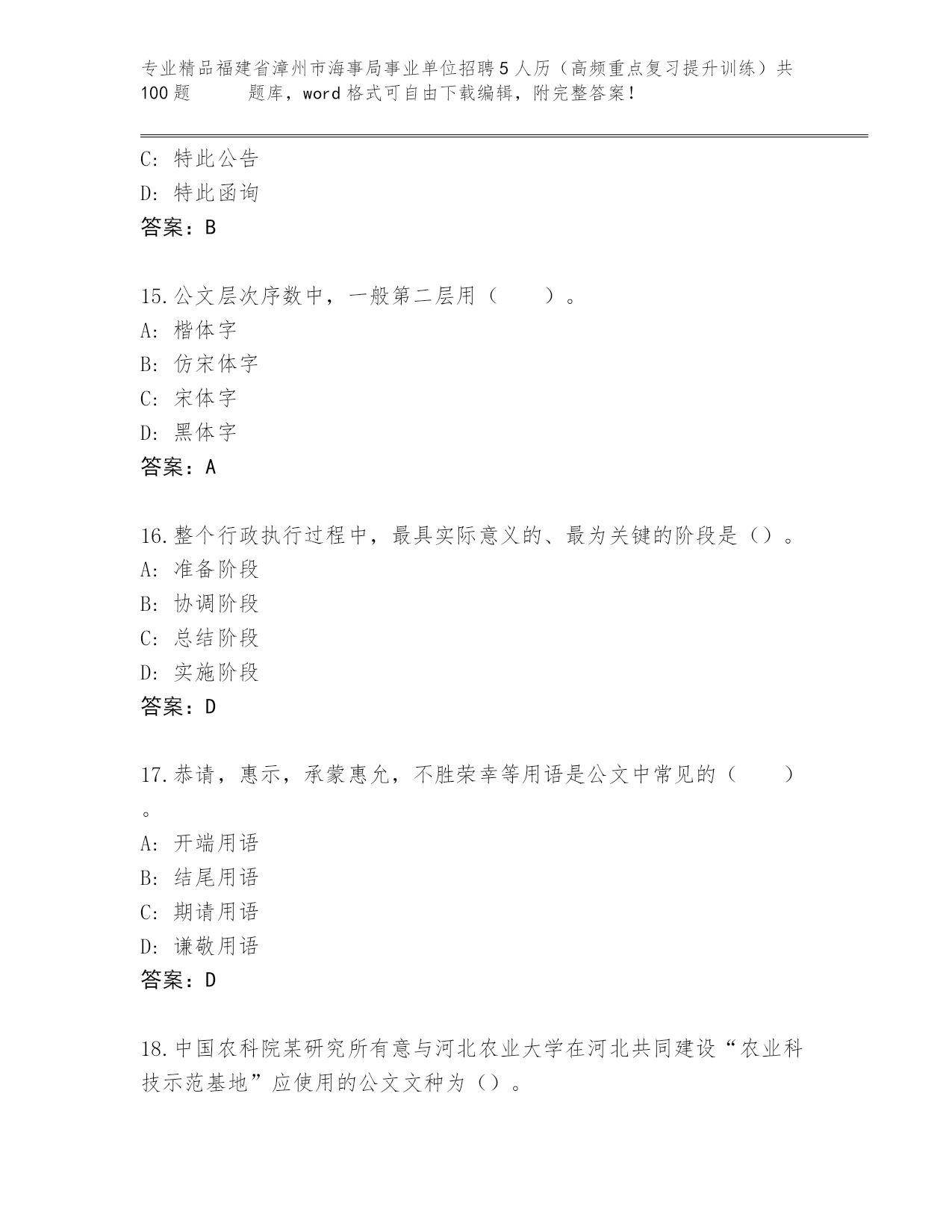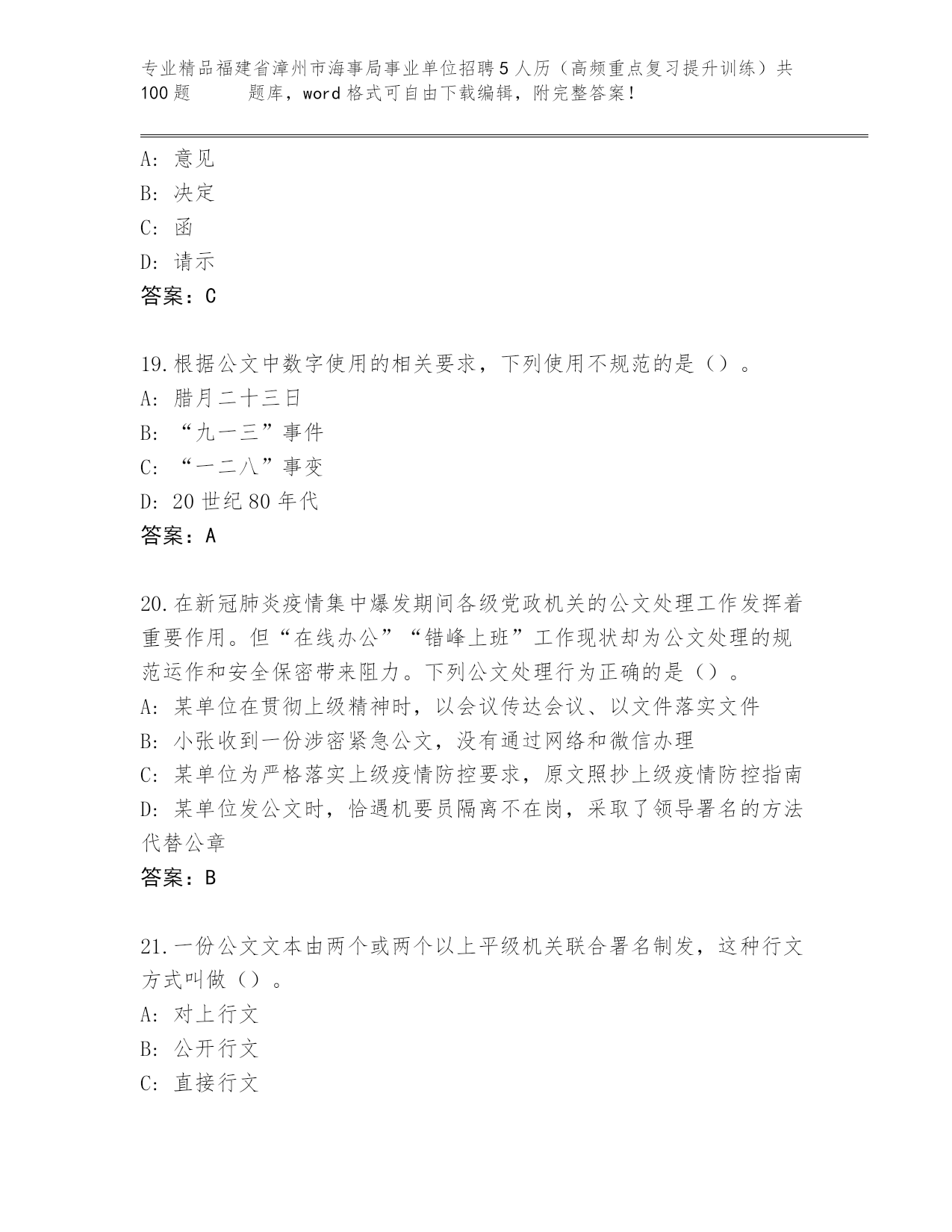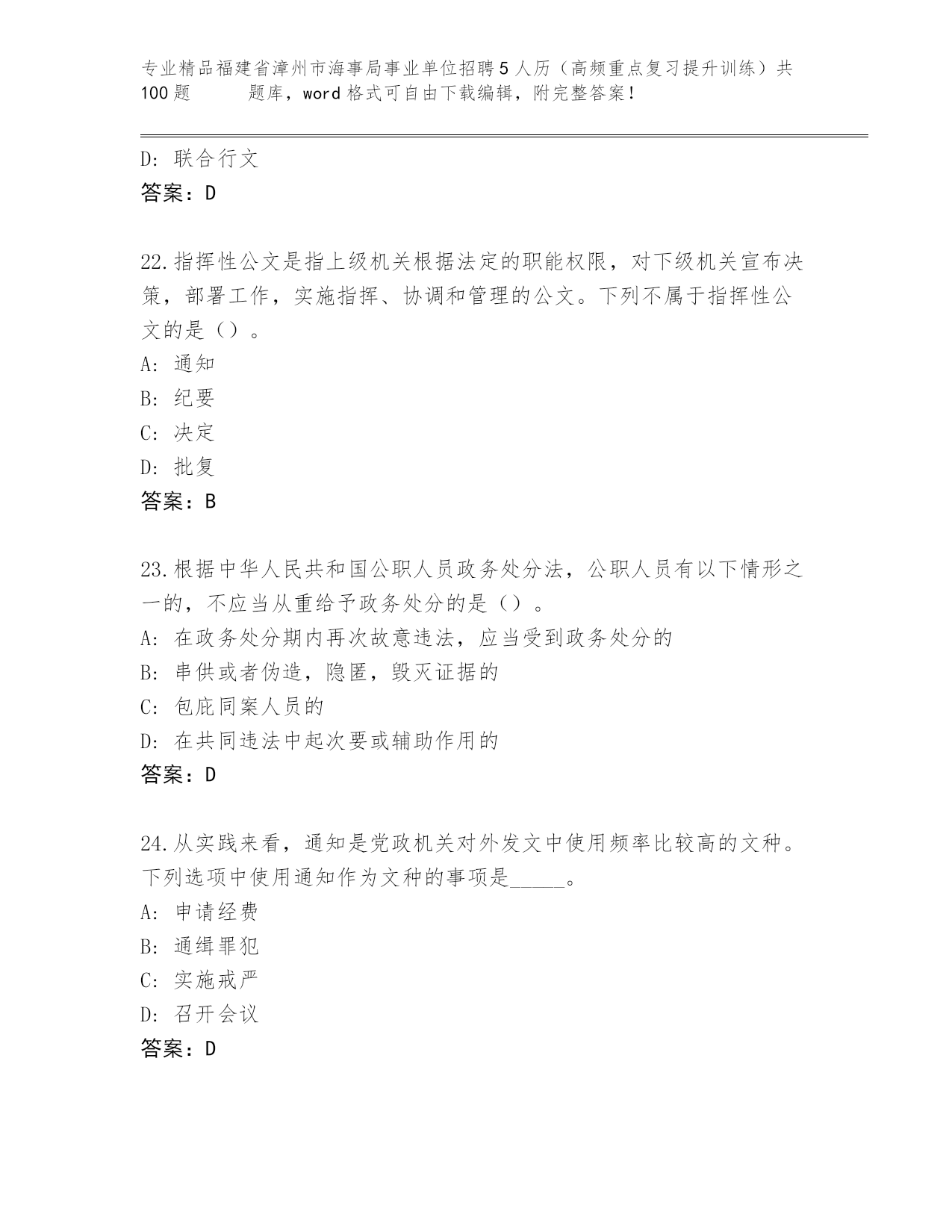福建省漳州市海事局事业单位招聘5人历(高频重点复习提升训练)共100题 题库及答案【全优】