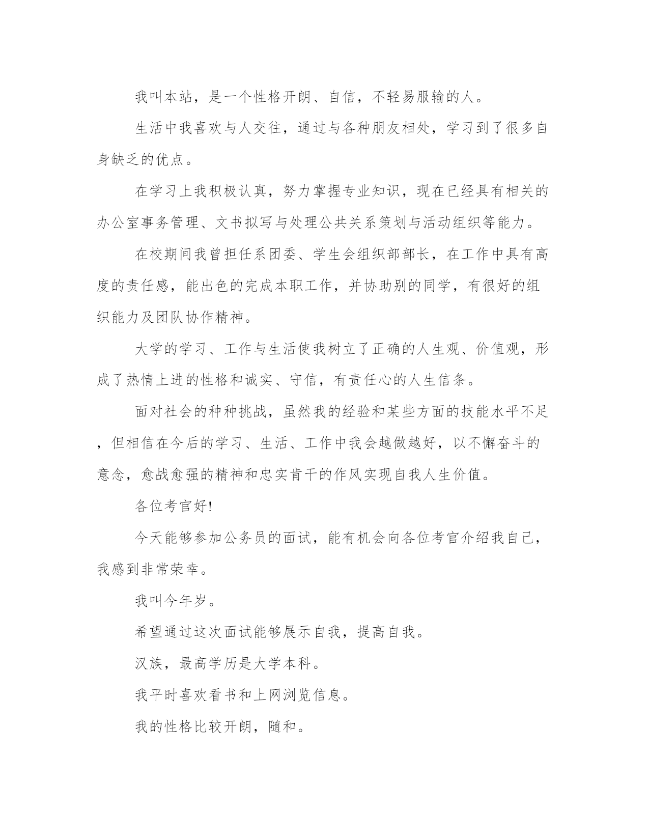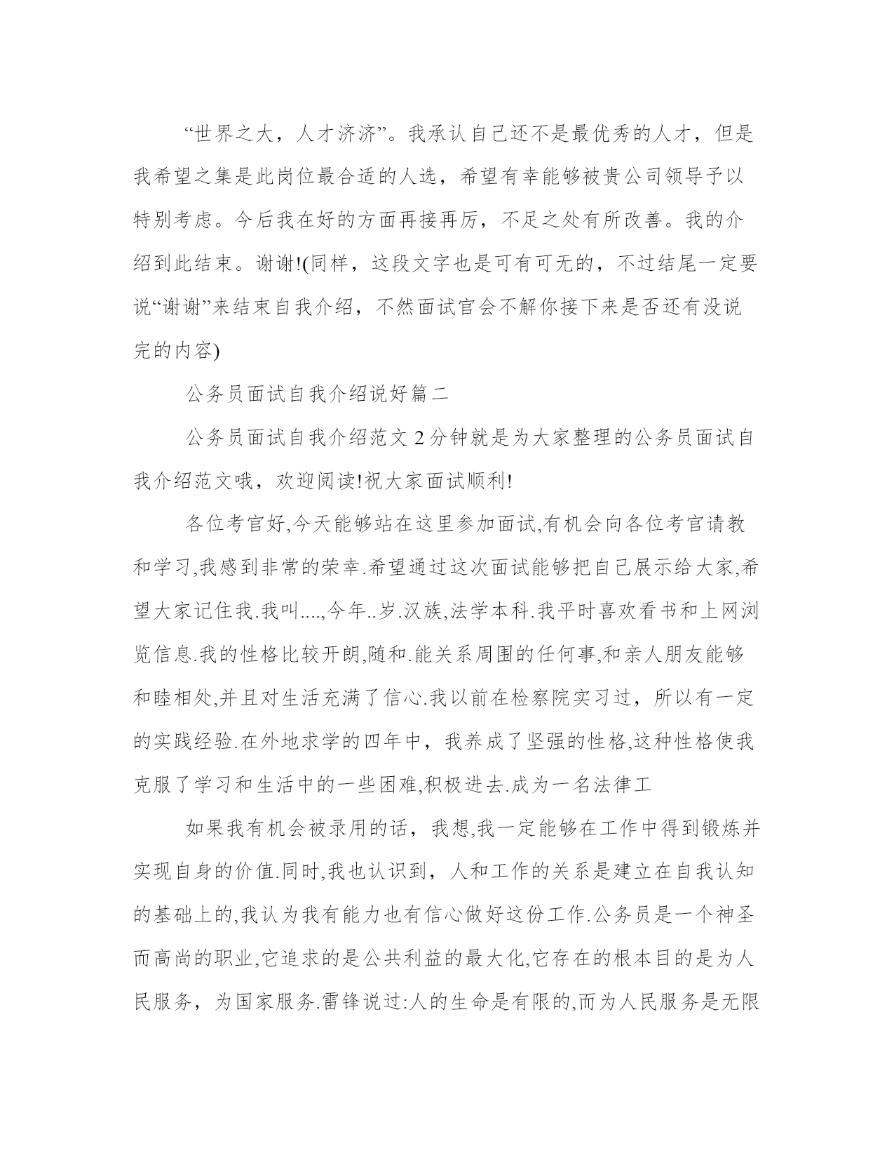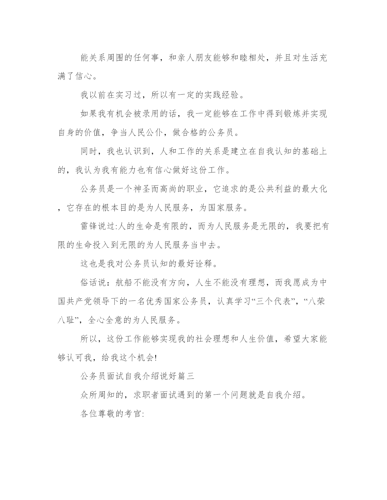 公务员面试自我介绍说好公务员面试三分钟自我介绍(大全13篇)在日常的学习、工作、生活中,肯定对各类范文都很熟悉吧。写范文的时候需要注意什么呢?有哪些格式需要注意呢?这里我整理了一些优秀的范文,希望对大家有所帮助,下面我们就来了解一下吧。公务员面试自我介绍说好篇一公务员是很多人挤破头脑都想做的,竞争那么大,面试的时候就要全身心付出,给面试官表现一个成熟智慧的你。下面是小编为大家带来的公务员面试三分钟自我介绍范文,欢迎大家阅读参考!各位尊敬的考官:大家下午好!很荣幸能在这里面试,让我有向各位考官学习与交流的机会,现将自己的情况简要介绍一下:(这句话其实是可有可无的,不过一般在群面的时候还是很有必要用到的)我叫xxx,来自于中国最美的乡村—婺源(有必要用几个词修饰下自己的家乡)。性格比较温和、谦虚、认真细致、踏实、吃苦耐劳、有较强的责任心和社会适应能力(这里可以用一些修饰性的词语对自己的性格做一个简单的介绍,当然是好的方面啦)。即将于2009年7月毕业于江西工业职业技术学院,作为一名电子商务专业的'大学生,我更喜欢平面设计方面的内容,在大学三年的学习生活中,我对平面这一领域的相关知识有了一定的掌握,同时具有实际的操作能力与技术(这里就是为了体现自己的专业技能以及期望的职业发展方向了)。为了使在校所学的知识更好地应用到实际生活中,于08年12月有幸来北京中科院计算机所培训中心,通过三个月的实践训练,全面系统地学习了平面方面的专业知识与技能,能够应用平面设计的相关软件(photoshop图像处理软件、illustrator与coreidraw矢量绘图软件、indesigin与pagemaker排版软件)做基本的图像处理、海报、企业宣传册等,能够将所学知识真正应用到实际生活中。(主要交代你之前的实习经验以及技能运用方面的状况,最好用一些具体的数据来表达)在投身于社会之际,为了找到符合自己专业和兴趣的工作,更好地适应社会,我希望自己能够做到一种被别人需要的一种状态,至于做什么,就是在实践中,不断的学习、不断的锻炼.因此,我希望加入贵单位,如果能够成为公司的一份子,我相信我一定在自己的岗位上尽职尽责、踏踏实实地贡献之集的一份力量,与公司共同促进、发展。(这段话其实是有缺陷的,虽然看上去很通顺自然,但是整体上给人一种夸夸其谈的感觉,编者的主张就是:直接说出你将来的发展方向,以及你的职业规划,3-5年的规划等,这样会切实的多,也会让面试官觉得你是一个脚踏实地的人)“世界之大,人才济济”。我承认自己还不是最优秀的人才,但是我希望之集是此岗位最合适的人选,希望有幸能够被贵公司领导予以特别考虑。今后我在好的方面再接再厉,不足之处有所改善。我的介绍到此结束。谢谢!(同样,这段文字也是可有可无的,不过结尾一定要说“谢谢”来结束自我介绍,不然面试官会不解你接下来是否还有没说完的内容)公务员面试自我介绍说好篇二公务员面试自我介绍范文2分钟就是为大家整理的公务员面试自我介绍范文哦,欢迎阅读!祝大家面试顺利!各位考官好,今天能够站在这里参加面试,有机会向各位考官请教和学习,我感到非常的荣幸.希望通过这次面试能够把自己展示给大家,希望大家记住我.我叫....,今年..岁.汉族,法学本科.我平时喜欢看书和上网浏览信息.我的性格比较开朗,随和.能关系周围的任何事,和亲人朋友能够和睦相处,并且对生活充满了信心.我以前在检察院实习过,所以有一定的实践经验.在外地求学的四年中,我养成了坚强的性格,这种性格使我克服了学习和生活中的一些困难,积极进去.成为一名法律工如果我有机会被录用的话,我想,我一定能够在工作中得到锻炼并实现自身的价值.同时,我也认识到,人和工作的关系是建立在自我认知的基础上的,我认为我有能力也有信心做好这份工作.公务员是一个神圣而高尚的职业,它追求的是公共利益的最大化,它存在的根本目的是为人民服务,为国家服务.雷锋说过:人的生命是有限的,而为人民服务是无限的,我要把有限的生命投入到无限的为人民服务当中去.这也是我对公务员认知的最好诠释.所以,这份工作能够实现我的社会理想和人生价值,希望大家能够认可我,给我这个机会!各位尊敬的考官,早上好。今天能在这里参加面试,有机会向各位考官请教和学习,我感到十分的荣幸,同时通过这次面试也可以把我自己展现给大家,希望你们能记住我,下面介绍一下我的基本情况。我叫***,现年**岁,*族,大专文化,平时我喜欢看书和上网流览信息,性格活泼开朗,能关心身边的人和事,和亲人朋友融洽相处,能做到理解和原谅,我对生活充满信心。我曾经在**工作,在公司里先后在不同的岗位工作过,开始我从事**工作,随后因公司需要到**,有一定的社会实践经验,在工作上取得一些的成绩,同时也得到公司的认可。通过几年的工