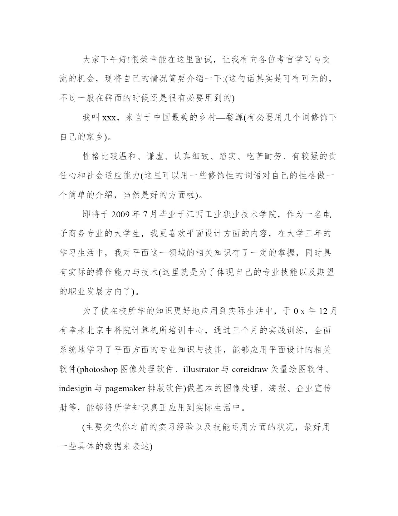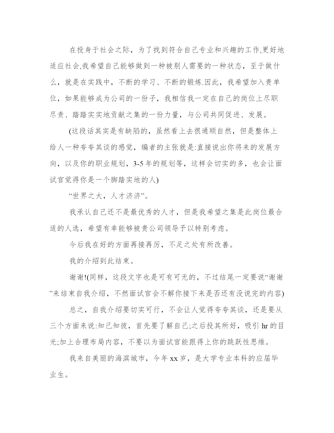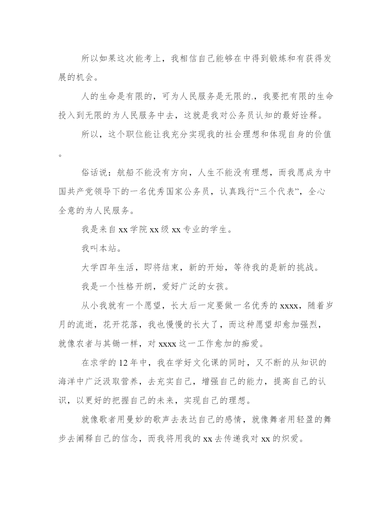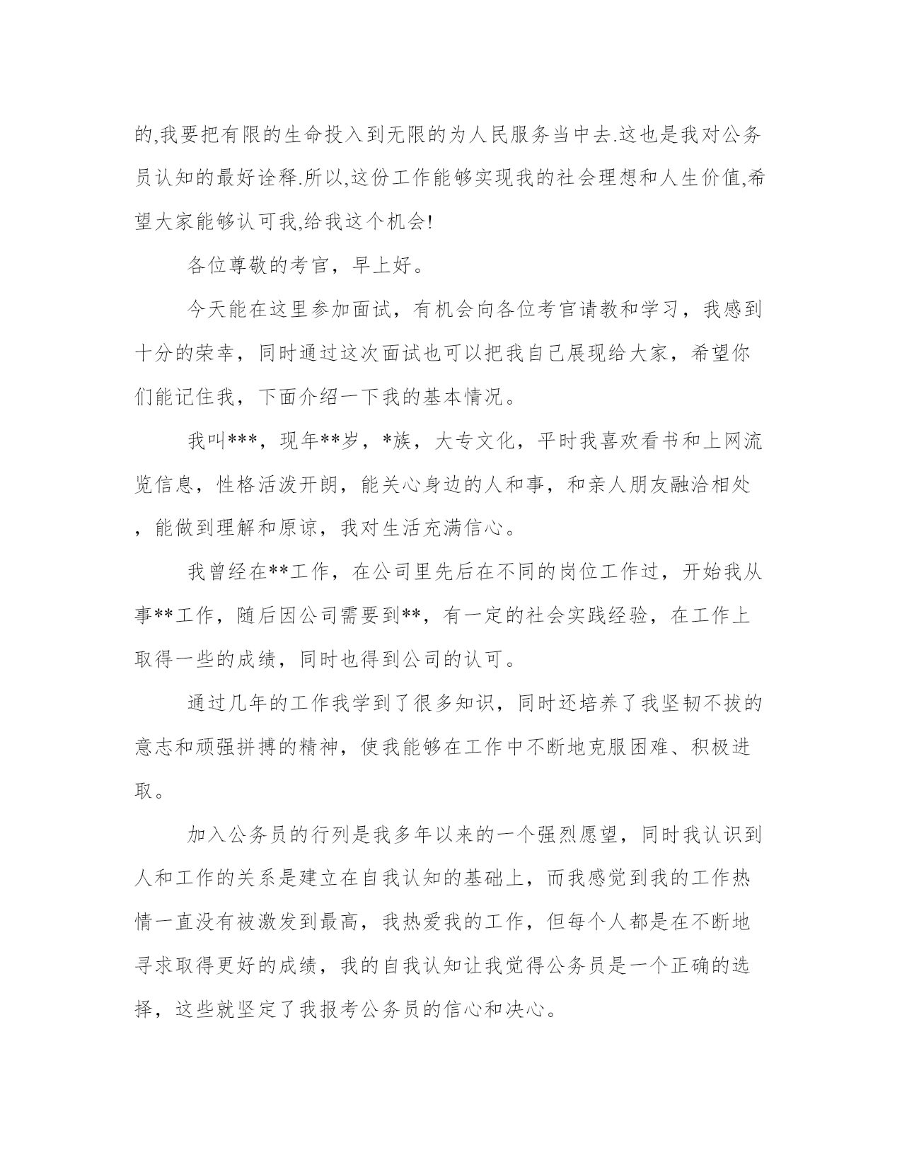 公务员面试自我介绍说好公务员面试三分钟自我介绍(大全13篇)在日常的学习、工作、生活中,肯定对各类范文都很熟悉吧。写范文的时候需要注意什么呢?有哪些格式需要注意呢?这里我整理了一些优秀的范文,希望对大家有所帮助,下面我们就来了解一下吧。公务员面试自我介绍说好篇一公务员是很多人挤破头脑都想做的,竞争那么大,面试的时候就要全身心付出,给面试官表现一个成熟智慧的你。下面是小编为大家带来的公务员面试三分钟自我介绍范文,欢迎大家阅读参考!各位尊敬的考官:大家下午好!很荣幸能在这里面试,让我有向各位考官学习与交流的机会,现将自己的情况简要介绍一下:(这句话其实是可有可无的,不过一般在群面的时候还是很有必要用到的)我叫xxx,来自于中国最美的乡村—婺源(有必要用几个词修饰下自己的家乡)。性格比较温和、谦虚、认真细致、踏实、吃苦耐劳、有较强的责任心和社会适应能力(这里可以用一些修饰性的词语对自己的性格做一个简单的介绍,当然是好的方面啦)。即将于2009年7月毕业于江西工业职业技术学院,作为一名电子商务专业的'大学生,我更喜欢平面设计方面的内容,在大学三年的学习生活中,我对平面这一领域的相关知识有了一定的掌握,同时具有实际的操作能力与技术(这里就是为了体现自己的专业技能以及期望的职业发展方向了)。为了使在校所学的知识更好地应用到实际生活中,于08年12月有幸来北京中科院计算机所培训中心,通过三个月的实践训练,全面系统地学习了平面方面的专业知识与技能,能够应用平面设计的相关软件(photoshop图像处理软件、illustrator与coreidraw矢量绘图软件、indesigin与pagemaker排版软件)做基本的图像处理、海报、企业宣传册等,能够将所学知识真正应用到实际生活中。(主要交代你之前的实习经验以及技能运用方面的状况,最好用一些具体的数据来表达)在投身于社会之际,为了找到符合自己专业和兴趣的工作,更好地适应社会,我希望自己能够做到一种被别人需要的一种状态,至于做什么,就是在实践中,不断的学习、不断的锻炼.因此,我希望加入贵单位,如果能够成为公司的一份子,我相信我一定在自己的岗位上尽职尽责、踏踏实实地贡献之集的一份力量,与公司共同促进、发展。(这段话其实是有缺陷的,虽然看上去很通顺自然,但是整体上给人一种夸夸其谈的感觉,编者的主张就是:直接说出你将来的发展方向,以及你的职业规划,3-5年的规划等,这样会切实的多,也会让面试官觉得你是一个脚踏实地的人)“世界之大,人才济济”。我承认自己还不是最优秀的人才,但是我希望之集是此岗位最合适的人选,希望有幸能够被贵公司领导予以特别考虑。今后我在好的方面再接再厉,不足之处有所改善。我的介绍到此结束。谢谢!(同样,这段文字也是可有可无的,不过结尾一定要说“谢谢”来结束自我介绍,不然面试官会不解你接下来是否还有没说完的内容)公务员面试自我介绍说好篇二公务员面试自我介绍范文2分钟就是为大家整理的公务员面试自我介绍范文哦,欢迎阅读!祝大家面试顺利!各位考官好,今天能够站在这里参加面试,有机会向各位考官请教和学习,我感到非常的荣幸.希望通过这次面试能够把自己展示给大家,希望大家记住我.我叫....,今年..岁.汉族,法学本科.我平时喜欢看书和上网浏览信息.我的性格比较开朗,随和.能关系周围的任何事,和亲人朋友能够和睦相处,并且对生活充满了信心.我以前在检察院实习过,所以有一定的实践经验.在外地求学的四年中,我养成了坚强的性格,这种性格使我克服了学习和生活中的一些困难,积极进去.成为一名法律工如果我有机会被录用的话,我想,我一定能够在工作中得到锻炼并实现自身的价值.同时,我也认识到,人和工作的关系是建立在自我认知的基础上的,我认为我有能力也有信心做好这份工作.公务员是一个神圣而高尚的职业,它追求的是公共利益的最大化,它存在的根本目的是为人民服务,为国家服务.雷锋说过:人的生命是有限的,而为人民服务是无限的,我要把有限的生命投入到无限的为人民服务当中去.这也是我对公务员认知的最好诠释.所以,这份工作能够实现我的社会理想和人生价值,希望大家能够认可我,给我这个机会!各位尊敬的考官,早上好。今天能在这里参加面试,有机会向各位考官请教和学习,我感到十分的荣幸,同时通过这次面试也可以把我自己展现给大家,希望你们能记住我,下面介绍一下我的基本情况。我叫***,现年**岁,*族,大专文化,平时我喜欢看书和上网流览信息,性格活泼开朗,能关心身边的人和事,和亲人朋友融洽相处,能做到理解和原谅,我对生活充满信心。我曾经在**工作,在公司里先后在不同的岗位工作过,开始我从事**工作,随后因公司需要到**,有一定的社会实践经验,在工作上取得一些的成绩,同时也得到公司的认可。通过几年的工