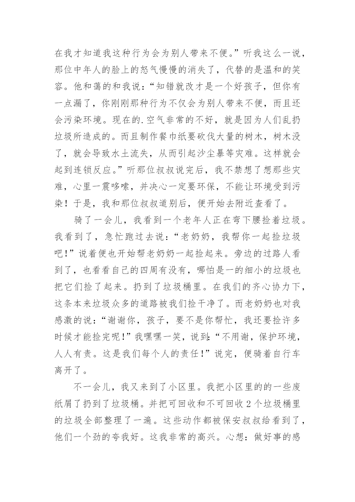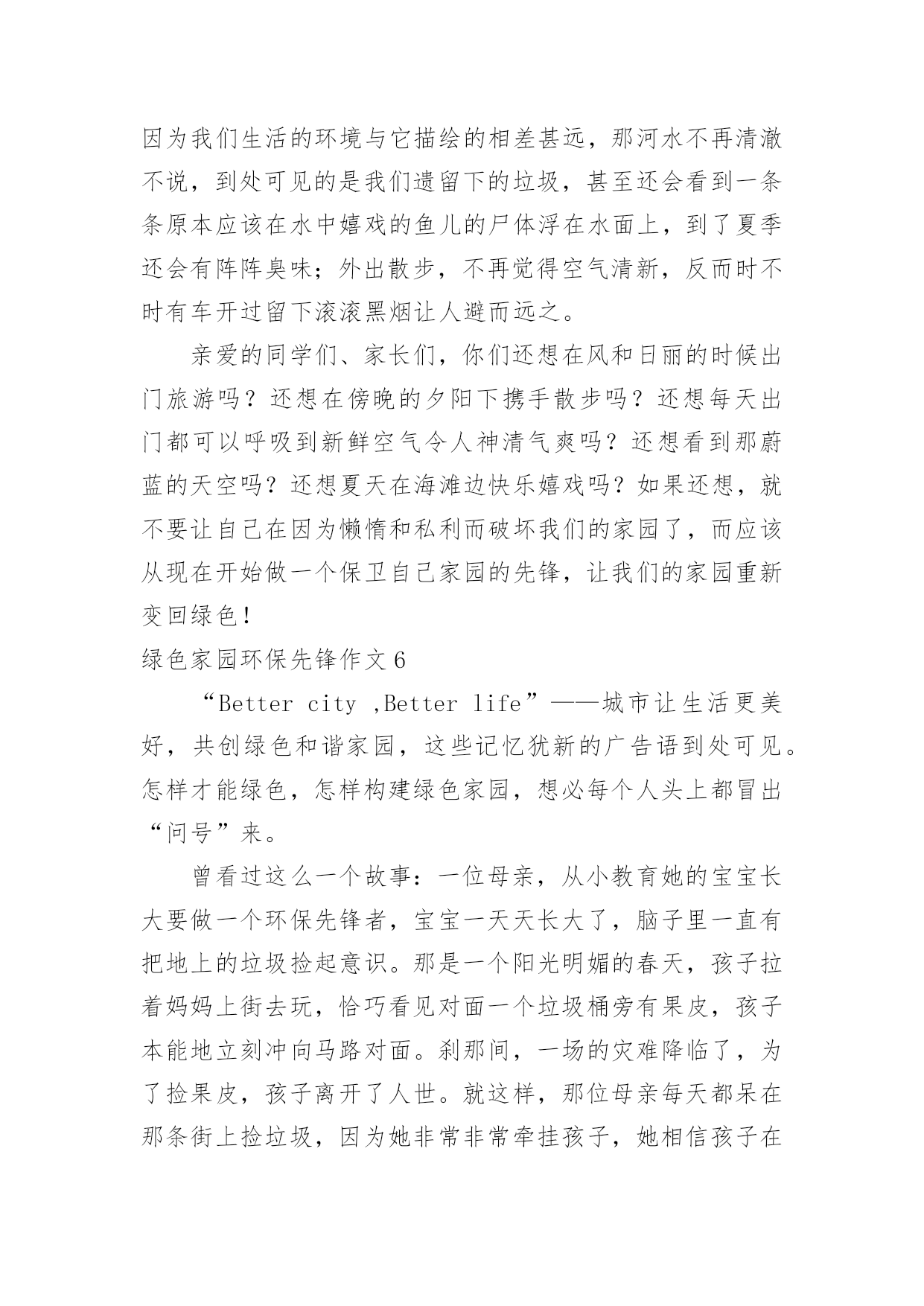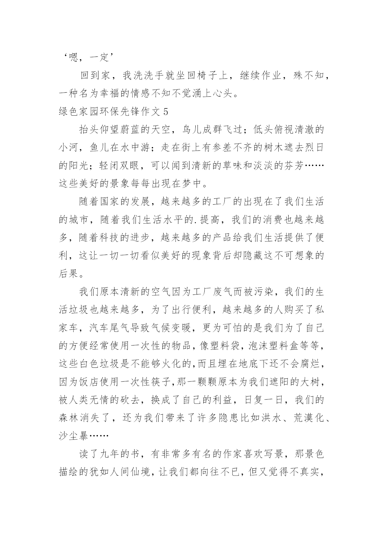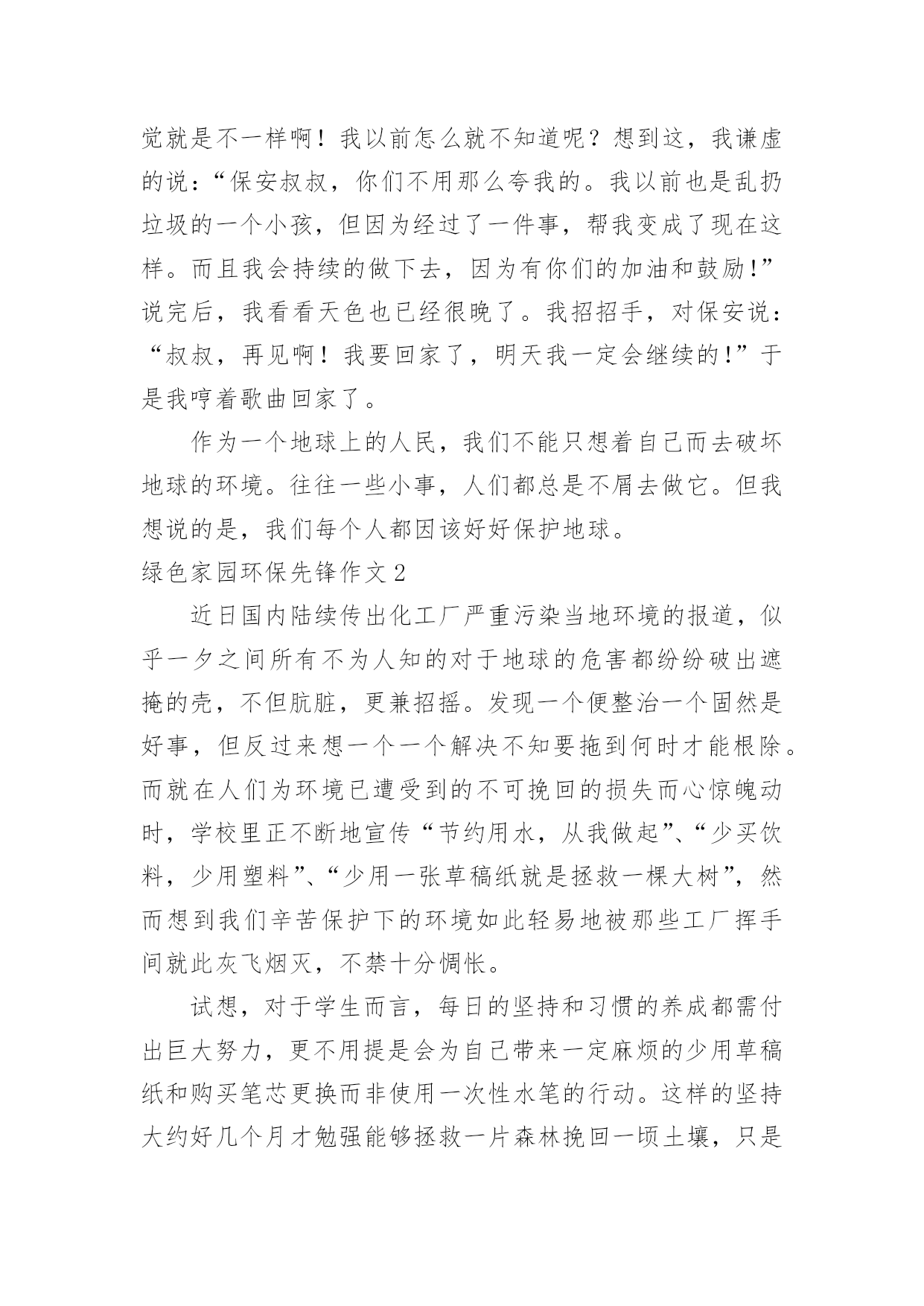 绿色家园环保先锋作文绿色家园环保先锋作文【推荐】在平日的学习、工作和生活里,许多人都写过作文吧,作文是由文字组成,经过人的思想考虑,通过语言组织来表达一个主题意义的文体。如何写一篇有思想、有文采的作文呢?下面是小编为大家收集的绿色家园环保先锋作文,供大家参考借鉴,希望可以帮助到有需要的朋友。绿色家园环保先锋作文1环保,这个词语,对我们的生活非常的重要,如果我们不环保,就会带来许多的灾难。所以,我们要无时无刻的记住它!随着人类社会的高度发展,人类已经进入了空前的时代。这位我们带来了许多的方便,但对环境的污染也非常的大。可人们虽然知道其中的危害性,但还是不停的污染环境,我,就是其中的一个。在一个晴朗的日子里,我骑着自行车,准备去溜达几圈。骑了一会儿,我感觉脚有点酸,于是就找了一个地方做了下来。我先拿餐巾纸擦了下汗,把他随手一仍,便躺了下来。因为风大,那张餐巾纸飘到了一个人的脸上,那个人脸上眉头紧皱,一脸的怒气。这时,我才发觉自己的错误。跑过去说:“对不起。叔叔,我错了,不应该随手的扔餐巾纸。现在我才知道我这种行为会为别人带来不便。”听我这么一说,那位中年人的脸上的怒气慢慢的消失了,代替的是温和的笑容。他和蔼的和我说:“知错就改才是一个好孩子,但你有一点漏了,你刚刚那种行为不仅会为别人带来不便,而且还会污染环境。现在的.空气非常的不好,就是因为人们乱扔垃圾所造成的。而且制作餐巾纸要砍伐大量的树木,树木没了,就会导致水土流失,从而引起沙尘暴等灾难。这样就会起到连锁反应。”听那位叔叔说完后,我不禁想了想那些灾难,心里一震哆嗦,并决心一定要环保,不能让环境受到污染!于是,我和那位叔叔道别后,便开始去附近查看了。骑了一会儿,我看到一个老年人正在弯下腰捡着垃圾。我看到了,急忙跑过去说:“老奶奶,我帮你一起捡垃圾吧!”说着便也开始帮老奶奶一起捡起来。旁边的过路人看到了,也看看自己的四周有没有,哪怕是一的细小的垃圾也把它们捡了起来。扔到了垃圾桶里。在我们的齐心协力下,这条本来垃圾众多的道路被我们捡干净了。而老奶奶也对我感激的说:“谢谢你,孩子,要不是你帮忙,我还要捡许多时候才能捡完呢!”我嘿嘿一笑,说到:“不用谢,保护环境,人人有责。这是我们每个人的责任!”说完,便骑着自行车离开了。不一会儿,我又来到了小区里。我把小区里的的一些废纸屑了扔到了垃圾桶。并把可回收和不可回收2个垃圾桶里的垃圾全部整理了一遍。这些动作都被保安叔叔给看到了,他们一个劲的夸我好。这我非常的高兴。心想:做好事的感觉就是不一样啊!我以前怎么就不知道呢?想到这,我谦虚的说:“保安叔叔,你们不用那么夸我的。我以前也是乱扔垃圾的一个小孩,但因为经过了一件事,帮我变成了现在这样。而且我会持续的做下去,因为有你们的加油和鼓励!”说完后,我看看天色也已经很晚了。我招招手,对保安说:“叔叔,再见啊!我要回家了,明天我一定会继续的!”于是我哼着歌曲回家了。作为一个地球上的人民,我们不能只想着自己而去破坏地球的环境。往往一些小事,人们都总是不屑去做它。但我想说的是,我们每个人都因该好好保护地球。绿色家园环保先锋作文2近日国内陆续传出化工厂严重污染当地环境的报道,似乎一夕之间所有不为人知的对于地球的危害都纷纷破出遮掩的壳,不但肮脏,更兼招摇。发现一个便整治一个固然是好事,但反过来想一个一个解决不知要拖到何时才能根除。而就在人们为环境已遭受到的不可挽回的损失而心惊魄动时,学校里正不断地宣传“节约用水,从我做起”、“少买饮料,少用塑料”、“少用一张草稿纸就是拯救一棵大树”,然而想到我们辛苦保护下的环境如此轻易地被那些工厂挥手间就此灰飞烟灭,不禁十分惆怅。试想,对于学生而言,每日的坚持和习惯的养成都需付出巨大努力,更不用提是会为自己带来一定麻烦的少用草稿纸和购买笔芯更换而非使用一次性水笔的行动。这样的坚持大约好几个月才勉强能够拯救一片森林挽回一顷土壤,只是杯水车薪;而与此形成强烈对比的是化工厂,可能为了节约几十元的成本就任意倾倒化工废料,一天就能永久性毁掉一大块耕地。这样的庞然大物的可怖能力,从近期披露的云南铬渣污染的严重程度就可见一斑。在云南的案例中,共有超过五千吨铬渣被随意倾倒于村落水沟之间。即便将所有的铬渣全部进行无害处理——然而这本身就极难办到,因为不但所需费用是天文数字,所要消耗的人力物力、因此被停滞甚至拖后的GDP都不是当地可以承受的——要想让土壤和水源回复本来面貌,也要过好几代人才有可能。一边是万分艰难的保护,另一边是举手之劳的破坏,这样的事实岂不是让原本热衷于环保的学生们寒心?“环保”二字,远不是小小学生的行为习惯就能真正贯彻的。然而,目前以学生作为重点宣传对象的做法,却是最正确的。现在的学生总有一天会成为日后的人才,其中大概不乏与化工业扯上关系的。那么,如今一直都自许为环保斗士的孩