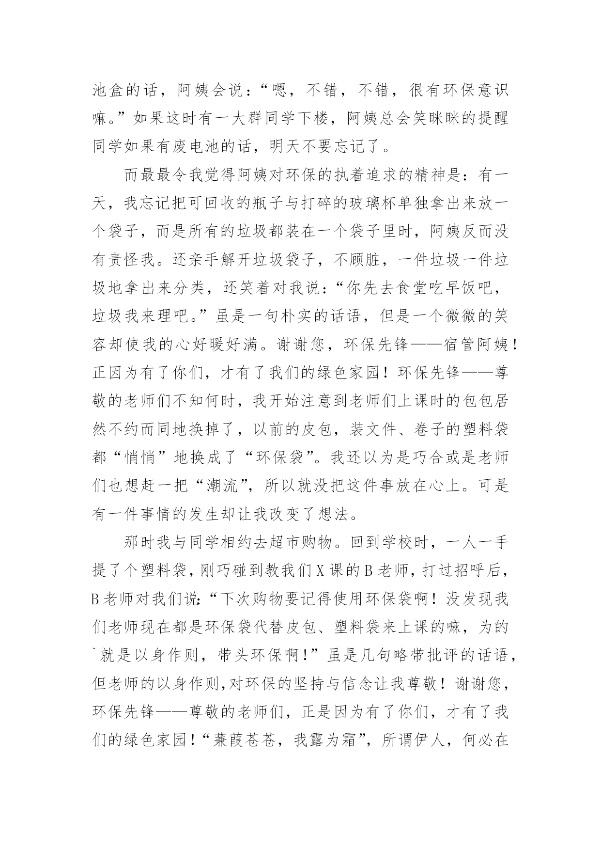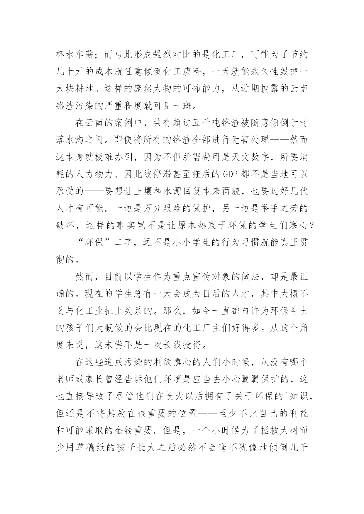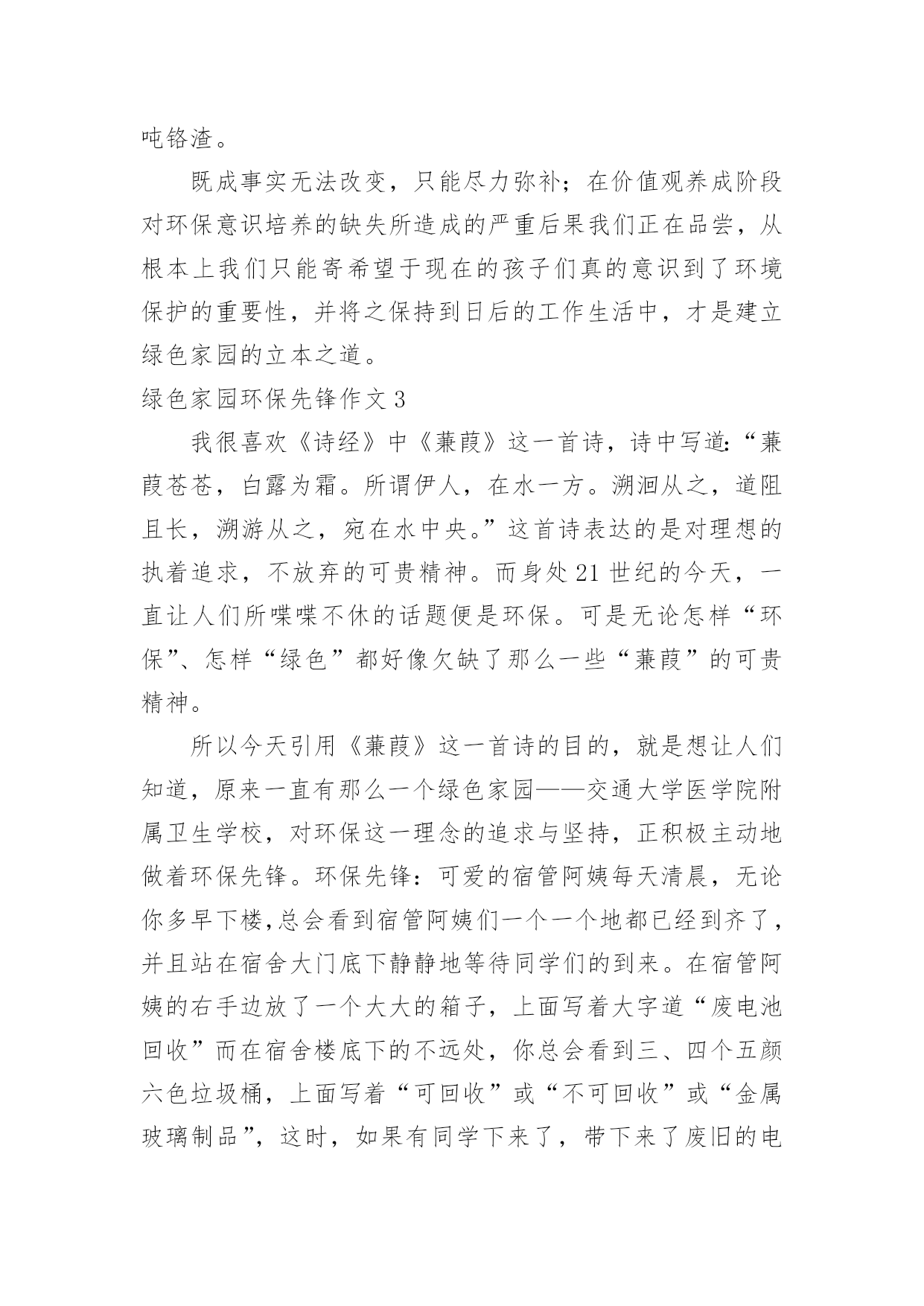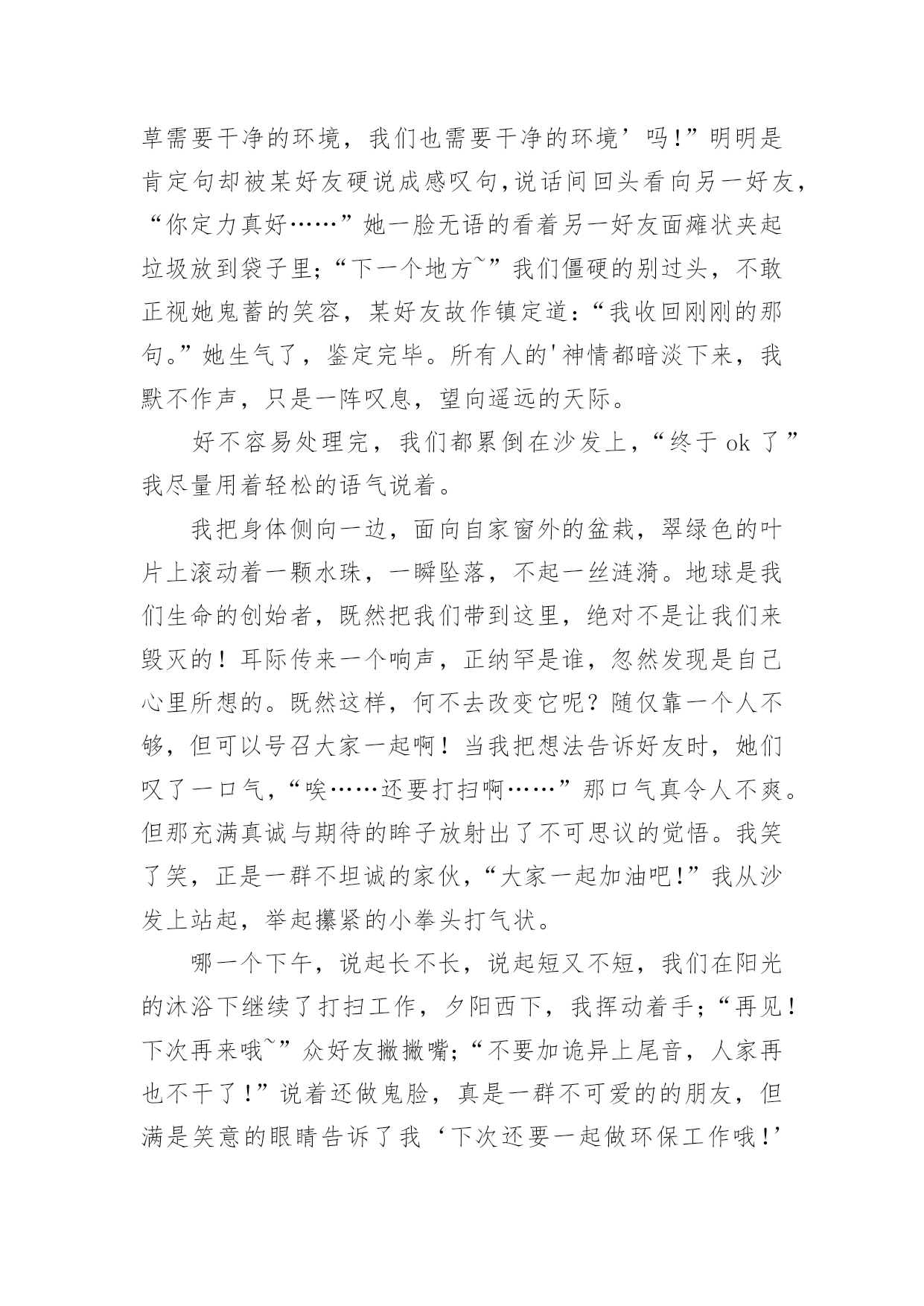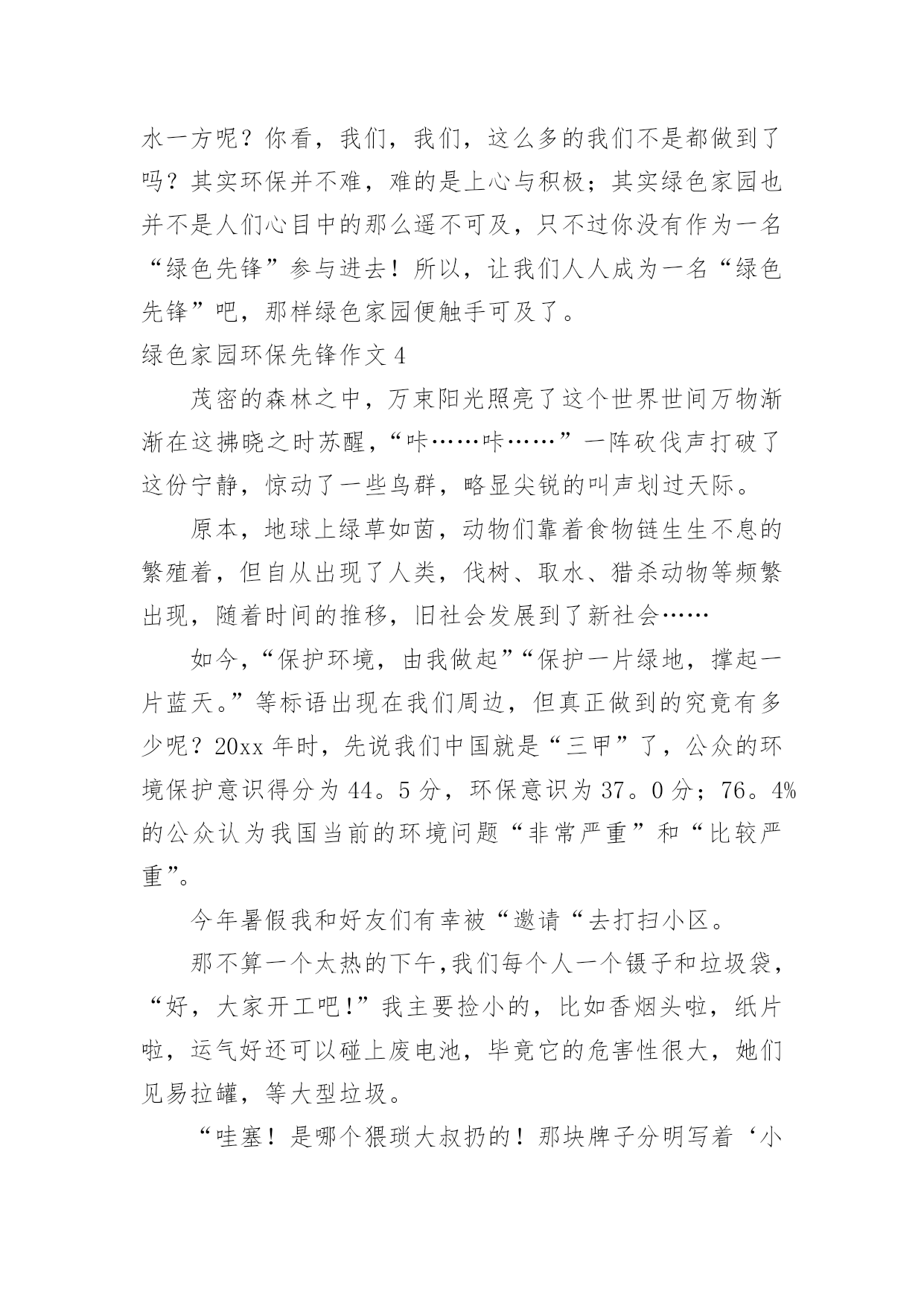 绿色家园环保先锋作文绿色家园环保先锋作文【推荐】在平日的学习、工作和生活里,许多人都写过作文吧,作文是由文字组成,经过人的思想考虑,通过语言组织来表达一个主题意义的文体。如何写一篇有思想、有文采的作文呢?下面是小编为大家收集的绿色家园环保先锋作文,供大家参考借鉴,希望可以帮助到有需要的朋友。绿色家园环保先锋作文1环保,这个词语,对我们的生活非常的重要,如果我们不环保,就会带来许多的灾难。所以,我们要无时无刻的记住它!随着人类社会的高度发展,人类已经进入了空前的时代。这位我们带来了许多的方便,但对环境的污染也非常的大。可人们虽然知道其中的危害性,但还是不停的污染环境,我,就是其中的一个。在一个晴朗的日子里,我骑着自行车,准备去溜达几圈。骑了一会儿,我感觉脚有点酸,于是就找了一个地方做了下来。我先拿餐巾纸擦了下汗,把他随手一仍,便躺了下来。因为风大,那张餐巾纸飘到了一个人的脸上,那个人脸上眉头紧皱,一脸的怒气。这时,我才发觉自己的错误。跑过去说:“对不起。叔叔,我错了,不应该随手的扔餐巾纸。现在我才知道我这种行为会为别人带来不便。”听我这么一说,那位中年人的脸上的怒气慢慢的消失了,代替的是温和的笑容。他和蔼的和我说:“知错就改才是一个好孩子,但你有一点漏了,你刚刚那种行为不仅会为别人带来不便,而且还会污染环境。现在的.空气非常的不好,就是因为人们乱扔垃圾所造成的。而且制作餐巾纸要砍伐大量的树木,树木没了,就会导致水土流失,从而引起沙尘暴等灾难。这样就会起到连锁反应。”听那位叔叔说完后,我不禁想了想那些灾难,心里一震哆嗦,并决心一定要环保,不能让环境受到污染!于是,我和那位叔叔道别后,便开始去附近查看了。骑了一会儿,我看到一个老年人正在弯下腰捡着垃圾。我看到了,急忙跑过去说:“老奶奶,我帮你一起捡垃圾吧!”说着便也开始帮老奶奶一起捡起来。旁边的过路人看到了,也看看自己的四周有没有,哪怕是一的细小的垃圾也把它们捡了起来。扔到了垃圾桶里。在我们的齐心协力下,这条本来垃圾众多的道路被我们捡干净了。而老奶奶也对我感激的说:“谢谢你,孩子,要不是你帮忙,我还要捡许多时候才能捡完呢!”我嘿嘿一笑,说到:“不用谢,保护环境,人人有责。这是我们每个人的责任!”说完,便骑着自行车离开了。不一会儿,我又来到了小区里。我把小区里的的一些废纸屑了扔到了垃圾桶。并把可回收和不可回收2个垃圾桶里的垃圾全部整理了一遍。这些动作都被保安叔叔给看到了,他们一个劲的夸我好。这我非常的高兴。心想:做好事的感觉就是不一样啊!我以前怎么就不知道呢?想到这,我谦虚的说:“保安叔叔,你们不用那么夸我的。我以前也是乱扔垃圾的一个小孩,但因为经过了一件事,帮我变成了现在这样。而且我会持续的做下去,因为有你们的加油和鼓励!”说完后,我看看天色也已经很晚了。我招招手,对保安说:“叔叔,再见啊!我要回家了,明天我一定会继续的!”于是我哼着歌曲回家了。作为一个地球上的人民,我们不能只想着自己而去破坏地球的环境。往往一些小事,人们都总是不屑去做它。但我想说的是,我们每个人都因该好好保护地球。绿色家园环保先锋作文2近日国内陆续传出化工厂严重污染当地环境的报道,似乎一夕之间所有不为人知的对于地球的危害都纷纷破出遮掩的壳,不但肮脏,更兼招摇。发现一个便整治一个固然是好事,但反过来想一个一个解决不知要拖到何时才能根除。而就在人们为环境已遭受到的不可挽回的损失而心惊魄动时,学校里正不断地宣传“节约用水,从我做起”、“少买饮料,少用塑料”、“少用一张草稿纸就是拯救一棵大树”,然而想到我们辛苦保护下的环境如此轻易地被那些工厂挥手间就此灰飞烟灭,不禁十分惆怅。试想,对于学生而言,每日的坚持和习惯的养成都需付出巨大努力,更不用提是会为自己带来一定麻烦的少用草稿纸和购买笔芯更换而非使用一次性水笔的行动。这样的坚持大约好几个月才勉强能够拯救一片森林挽回一顷土壤,只是杯水车薪;而与此形成强烈对比的是化工厂,可能为了节约几十元的成本就任意倾倒化工废料,一天就能永久性毁掉一大块耕地。这样的庞然大物的可怖能力,从近期披露的云南铬渣污染的严重程度就可见一斑。在云南的案例中,共有超过五千吨铬渣被随意倾倒于村落水沟之间。即便将所有的铬渣全部进行无害处理——然而这本身就极难办到,因为不但所需费用是天文数字,所要消耗的人力物力、因此被停滞甚至拖后的GDP都不是当地可以承受的——要想让土壤和水源回复本来面貌,也要过好几代人才有可能。一边是万分艰难的保护,另一边是举手之劳的破坏,这样的事实岂不是让原本热衷于环保的学生们寒心?“环保”二字,远不是小小学生的行为习惯就能真正贯彻的。然而,目前以学生作为重点宣传对象的做法,却是最正确的。现在的学生总有一天会成为日后的人才,其中大概不乏与化工业扯上关系的。那么,如今一直都自许为环保斗士的孩