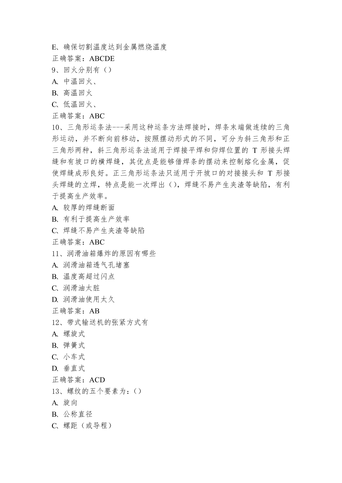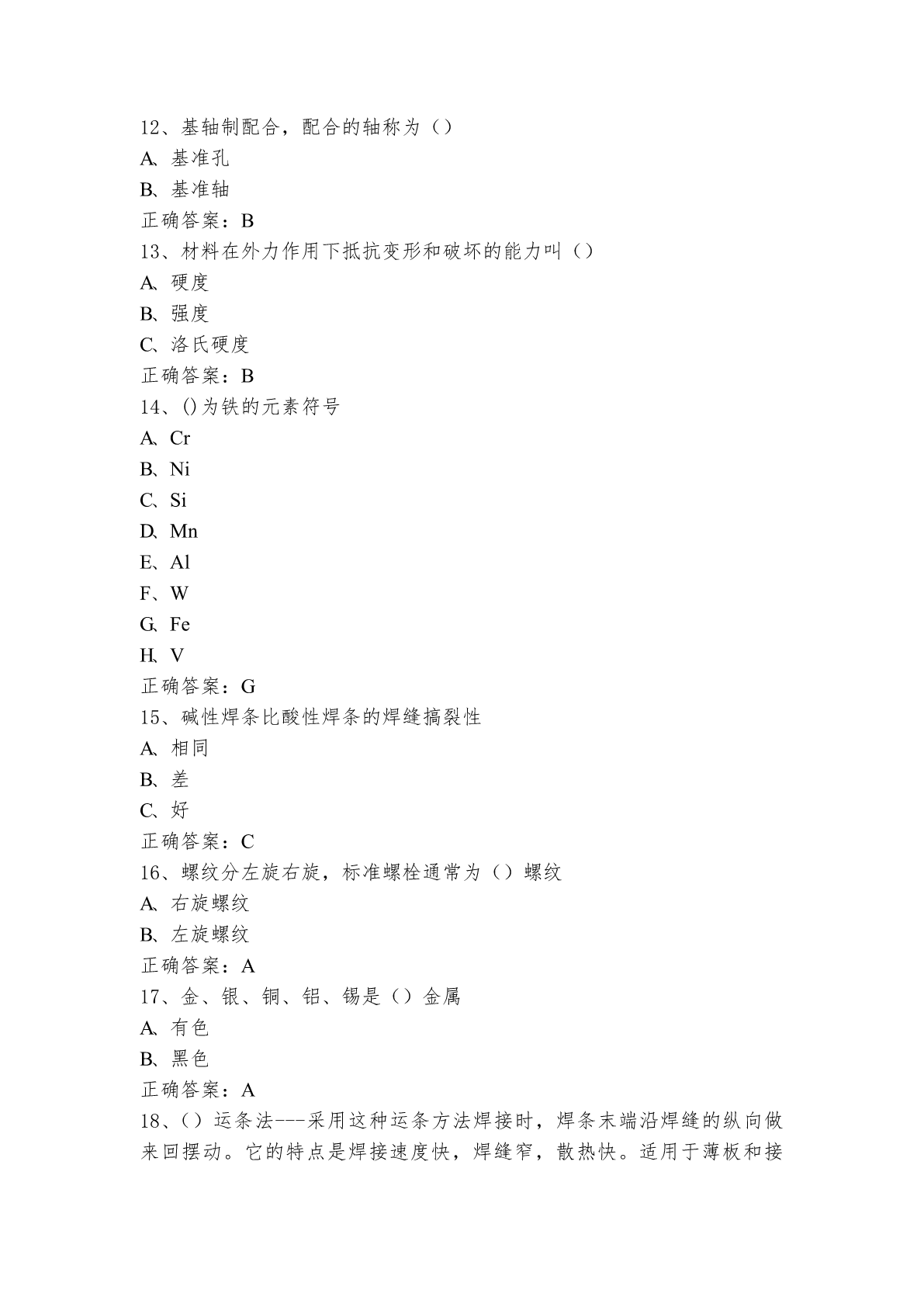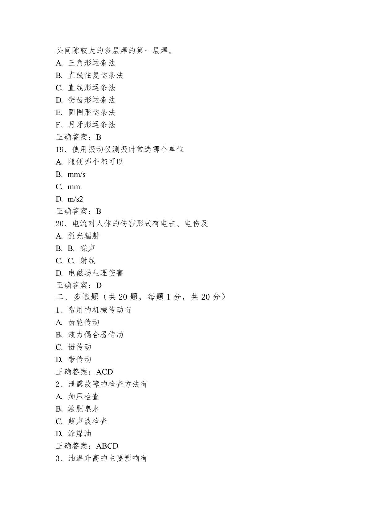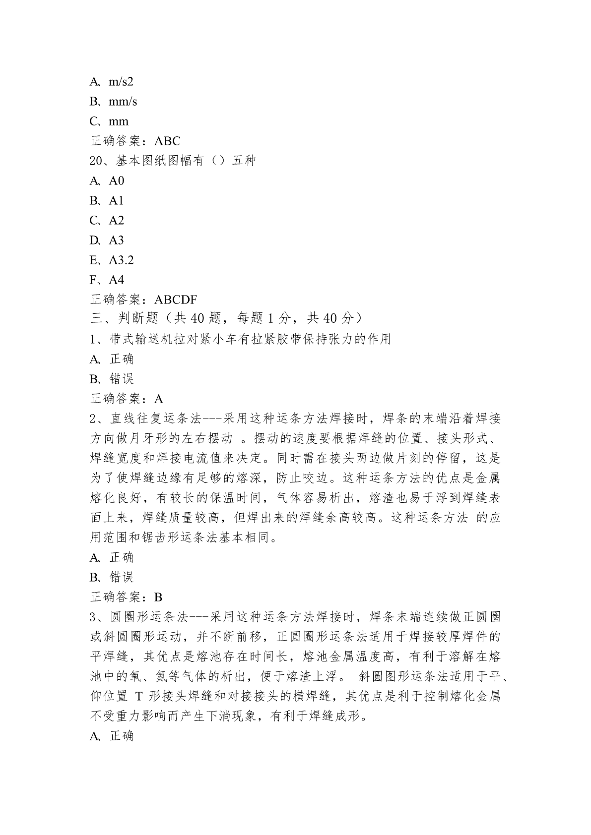 机械基础题库及答案一、单选题(共20题,每题1分,共20分)1、空气输送斜槽的规格是指A、斜槽的输送量B、斜槽的宽度C、斜槽风量D、斜槽的长度正确答案:B2、采用热装法装配轴承时,将轴承放入机油槽中加热,温度不超过A、A.120°CB、150°CC、200°C正确答案:A3、采用分段退焊法的好处是可以A、A减小变形B、减小应力C、即减小变形又减小应力正确答案:C4、焊接电流过(),不仅引弧困难,而且电弧不稳定,容易造成未焊透及夹渣缺陷A、大B、小正确答案:B5、只能发生在焊缝表面的缺陷是A、气孔B、夹渣C、裂纹D、咬边正确答案:A6、基轴制配合:()为一定的轴与不同基本偏差的孔的公差带=形成的各种配合的一种制度A、基本偏差B、实际偏差正确答案:A7、齿轮泵泵体的磨损一般发生在A、吸油腔B、压油腔C、连心线两端正确答案:A8、静压轴承的油膜压力的建立,是依靠()来保证的。A、A.旋转速度B、B.供油压力C、负载大小正确答案:B9、锉刀的规格指锉刀的A、尺寸规格和粗细规格B、尺寸规格C、粗细规格正确答案:A10、在其它条件相同时,焊件刚性越大,焊接变形越A、小B、大C、相同正确答案:A11、()运条法---采用这种运条方法焊接时,焊条末端做连续的三角形运动,并不断向前移动,按照摆动形式的不同,可分为斜三角形和正三角形两种,斜三角形运条法适用于焊接平焊和仰焊位置的T形接头焊缝和有坡口的横焊缝,其优点是能够借焊条的摆动来控制熔化金属,促使焊缝成形良好。正三角形运条法只适用于开坡口的对接接头和T形接头焊缝的立焊,特点是能一次焊出较厚的焊缝断面,焊缝不易产生夹渣等缺陷,有利于提高生产效率。A、三角形运条法B、直线往复运条法C、月牙形运条法D、圆圈形运条法E、直线形运条法F、锯齿形运条法正确答案:A12、基轴制配合,配合的轴称为()A、基准孔B、基准轴正确答案:B13、材料在外力作用下抵抗变形和破坏的能力叫()A、硬度B、强度C、洛氏硬度正确答案:B14、()为铁的元素符号A、CrB、NiC、SiD、MnE、AlF、WG、FeH、V正确答案:G15、碱性焊条比酸性焊条的焊缝搞裂性A、相同B、差C、好正确答案:C16、螺纹分左旋右旋,标准螺栓通常为()螺纹A、右旋螺纹B、左旋螺纹正确答案:A17、金、银、铜、铝、锡是()金属A、有色B、黑色正确答案:A18、()运条法---采用这种运条方法焊接时,焊条末端沿焊缝的纵向做来回摆动。它的特点是焊接速度快,焊缝窄,散热快。适用于薄板和接头间隙较大的多层焊的第一层焊。A、三角形运条法B、直线往复运条法C、直线形运条法D、锯齿形运条法E、圆圈形运条法F、月牙形运条法正确答案:B19、使用振动仪测振时常选哪个单位A、随便哪个都可以B、mm/sC、mmD、m/s2正确答案:B20、电流对人体的伤害形式有电击、电伤及A、弧光辐射B、B、噪声C、C、射线D、电磁场生理伤害正确答案:D二、多选题(共20题,每题1分,共20分)1、常用的机械传动有A、齿轮传动B、液力偶合器传动C、链传动D、带传动正确答案:ACD2、泄露故障的检查方法有A、加压检查B、涂肥皂水C、超声波检查D、涂煤油正确答案:ABCD3、油温升高的主要影响有A、元件与系统内泄漏增多B、粘度降低C、油的冷却效果变差正确答案:ABC4、设备润滑规定中的“五定”是指:A、定质B、定点C、定人D、定量E、定时正确答案:ABCDE5、焊接电弧分(),电弧长度大于焊条直径为长弧,小于焊条直径为短弧A、长弧B、短弧C、1/3弧正确答案:AB6、提升机的卸料方式A、重力式B、抛卸式C、混合式D、其它正确答案:ABC7、带传动分为()A、同步带传动B、链条传动C、V带传动D、平带传动正确答案:ACD8、气割必须满足下列条件:()A、金属燃点低于溶度B、导热低C、金属燃烧热量释放足够大D、燃烧后的氧化物熔点低于金属本身熔点E、确保切割温度达到金属燃烧温度正确答案:ABCDE9、回火分别有()A、中温回火、B、高温回火C、低温回火、正确答案:ABC10、三角形运条法---采用这种运条方法焊接时,焊条末端做连续的三角形运动,并不断向前移动,按照摆动形式的不同,可分为斜三角形和正三角形两种,斜三角形运条法适用于焊接平焊和仰焊位置的T形接头焊缝和有坡口的横焊缝,其优点是能够借焊条的摆动来控制熔化金属,促