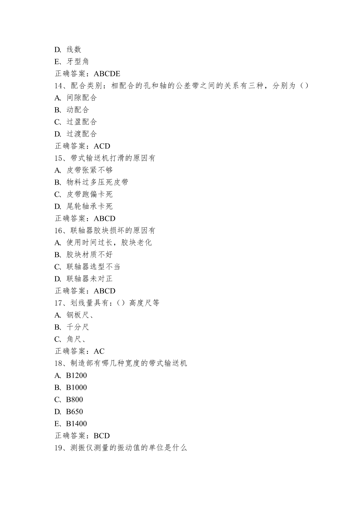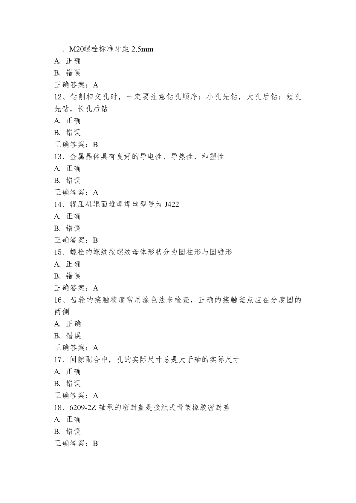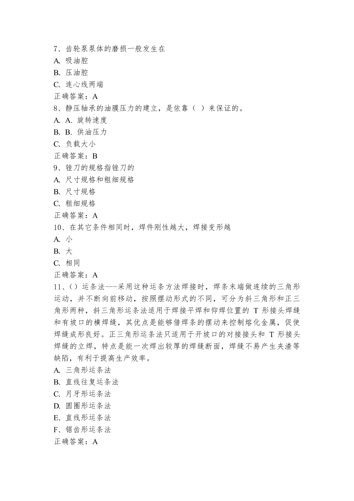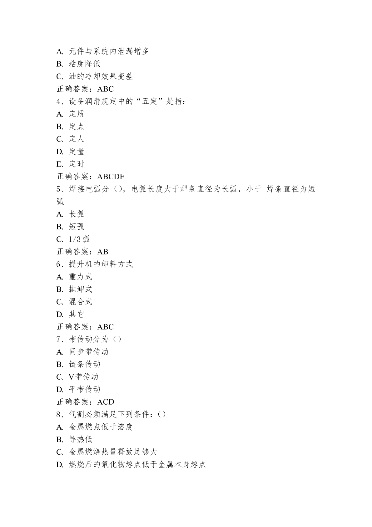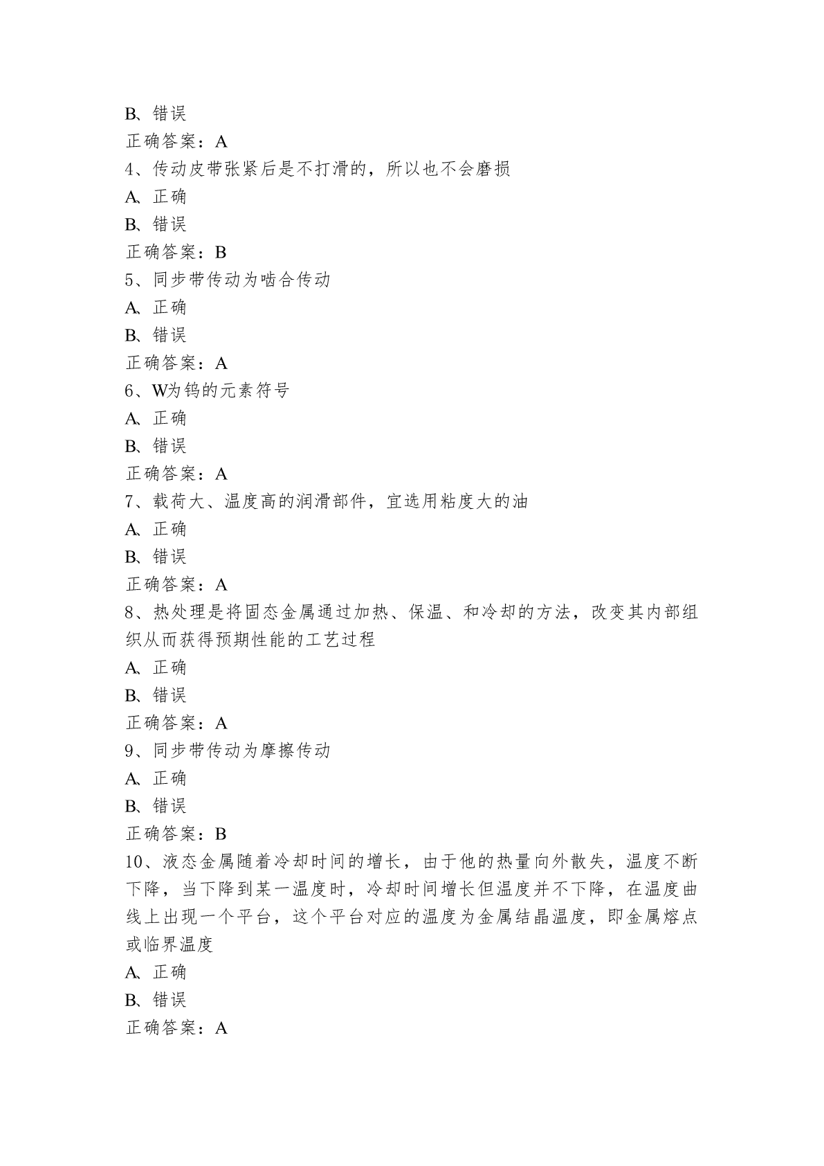 机械基础题库及答案一、单选题(共20题,每题1分,共20分)1、空气输送斜槽的规格是指A、斜槽的输送量B、斜槽的宽度C、斜槽风量D、斜槽的长度正确答案:B2、采用热装法装配轴承时,将轴承放入机油槽中加热,温度不超过A、A.120°CB、150°CC、200°C正确答案:A3、采用分段退焊法的好处是可以A、A减小变形B、减小应力C、即减小变形又减小应力正确答案:C4、焊接电流过(),不仅引弧困难,而且电弧不稳定,容易造成未焊透及夹渣缺陷A、大B、小正确答案:B5、只能发生在焊缝表面的缺陷是A、气孔B、夹渣C、裂纹D、咬边正确答案:A6、基轴制配合:()为一定的轴与不同基本偏差的孔的公差带=形成的各种配合的一种制度A、基本偏差B、实际偏差正确答案:A7、齿轮泵泵体的磨损一般发生在A、吸油腔B、压油腔C、连心线两端正确答案:A8、静压轴承的油膜压力的建立,是依靠()来保证的。A、A.旋转速度B、B.供油压力C、负载大小正确答案:B9、锉刀的规格指锉刀的A、尺寸规格和粗细规格B、尺寸规格C、粗细规格正确答案:A10、在其它条件相同时,焊件刚性越大,焊接变形越A、小B、大C、相同正确答案:A11、()运条法---采用这种运条方法焊接时,焊条末端做连续的三角形运动,并不断向前移动,按照摆动形式的不同,可分为斜三角形和正三角形两种,斜三角形运条法适用于焊接平焊和仰焊位置的T形接头焊缝和有坡口的横焊缝,其优点是能够借焊条的摆动来控制熔化金属,促使焊缝成形良好。正三角形运条法只适用于开坡口的对接接头和T形接头焊缝的立焊,特点是能一次焊出较厚的焊缝断面,焊缝不易产生夹渣等缺陷,有利于提高生产效率。A、三角形运条法B、直线往复运条法C、月牙形运条法D、圆圈形运条法E、直线形运条法F、锯齿形运条法正确答案:A12、基轴制配合,配合的轴称为()A、基准孔B、基准轴正确答案:B13、材料在外力作用下抵抗变形和破坏的能力叫()A、硬度B、强度C、洛氏硬度正确答案:B14、()为铁的元素符号A、CrB、NiC、SiD、MnE、AlF、WG、FeH、V正确答案:G15、碱性焊条比酸性焊条的焊缝搞裂性A、相同B、差C、好正确答案:C16、螺纹分左旋右旋,标准螺栓通常为()螺纹A、右旋螺纹B、左旋螺纹正确答案:A17、金、银、铜、铝、锡是()金属A、有色B、黑色正确答案:A18、()运条法---采用这种运条方法焊接时,焊条末端沿焊缝的纵向做来回摆动。它的特点是焊接速度快,焊缝窄,散热快。适用于薄板和接头间隙较大的多层焊的第一层焊。A、三角形运条法B、直线往复运条法C、直线形运条法D、锯齿形运条法E、圆圈形运条法F、月牙形运条法正确答案:B19、使用振动仪测振时常选哪个单位A、随便哪个都可以B、mm/sC、mmD、m/s2正确答案:B20、电流对人体的伤害形式有电击、电伤及A、弧光辐射B、B、噪声C、C、射线D、电磁场生理伤害正确答案:D二、多选题(共20题,每题1分,共20分)1、常用的机械传动有A、齿轮传动B、液力偶合器传动C、链传动D、带传动正确答案:ACD2、泄露故障的检查方法有A、加压检查B、涂肥皂水C、超声波检查D、涂煤油正确答案:ABCD3、油温升高的主要影响有A、元件与系统内泄漏增多B、粘度降低C、油的冷却效果变差正确答案:ABC4、设备润滑规定中的“五定”是指:A、定质B、定点C、定人D、定量E、定时正确答案:ABCDE5、焊接电弧分(),电弧长度大于焊条直径为长弧,小于焊条直径为短弧A、长弧B、短弧C、1/3弧正确答案:AB6、提升机的卸料方式A、重力式B、抛卸式C、混合式D、其它正确答案:ABC7、带传动分为()A、同步带传动B、链条传动C、V带传动D、平带传动正确答案:ACD8、气割必须满足下列条件:()A、金属燃点低于溶度B、导热低C、金属燃烧热量释放足够大D、燃烧后的氧化物熔点低于金属本身熔点E、确保切割温度达到金属燃烧温度正确答案:ABCDE9、回火分别有()A、中温回火、B、高温回火C、低温回火、正确答案:ABC10、三角形运条法---采用这种运条方法焊接时,焊条末端做连续的三角形运动,并不断向前移动,按照摆动形式的不同,可分为斜三角形和正三角形两种,斜三角形运条法适用于焊接平焊和仰焊位置的T形接头焊缝和有坡口的横焊缝,其优点是能够借焊条的摆动来控制熔化金属,促
