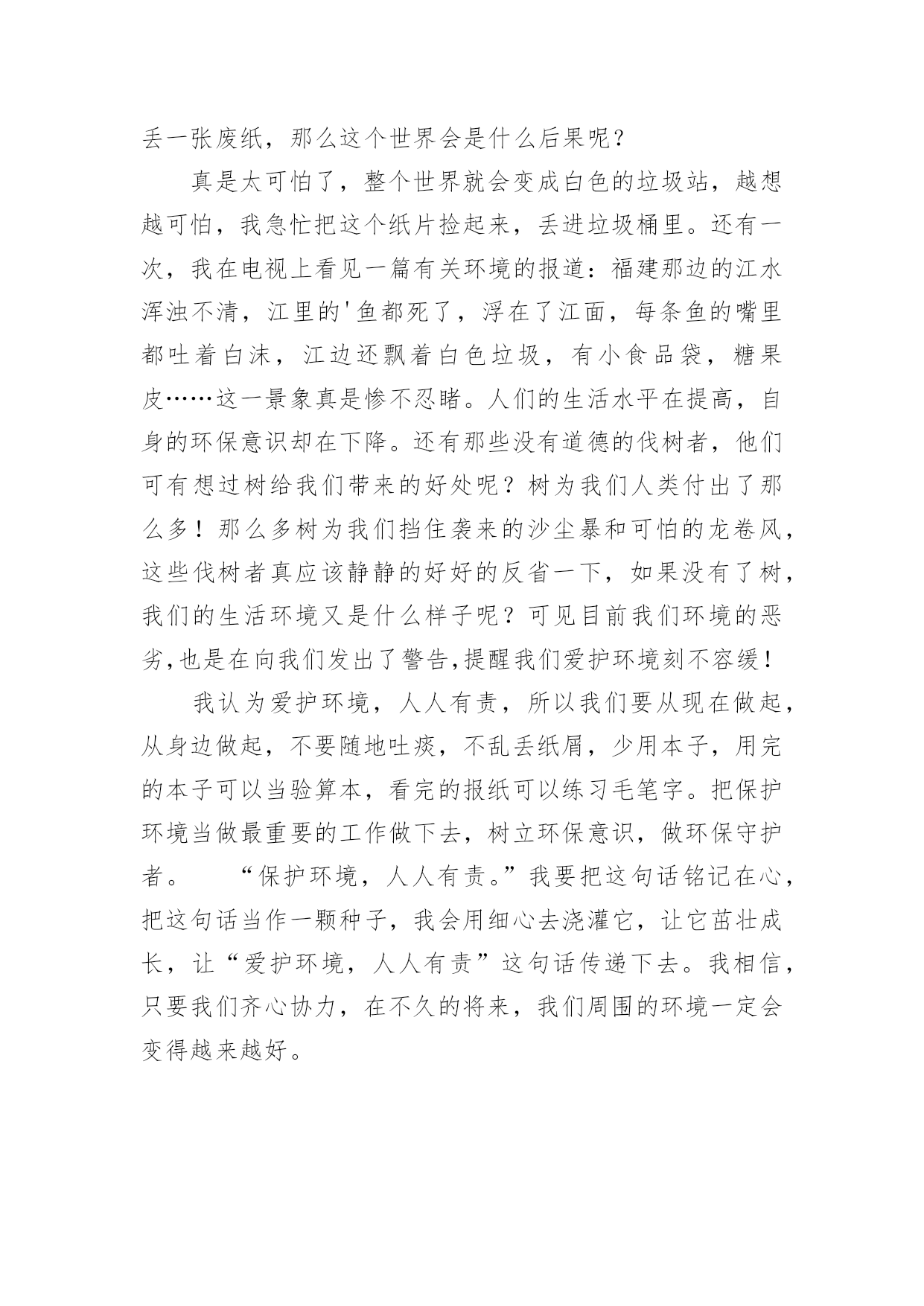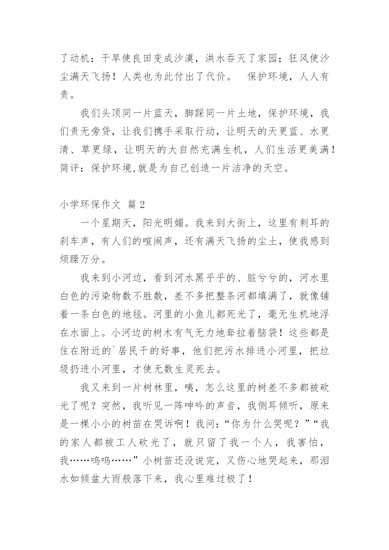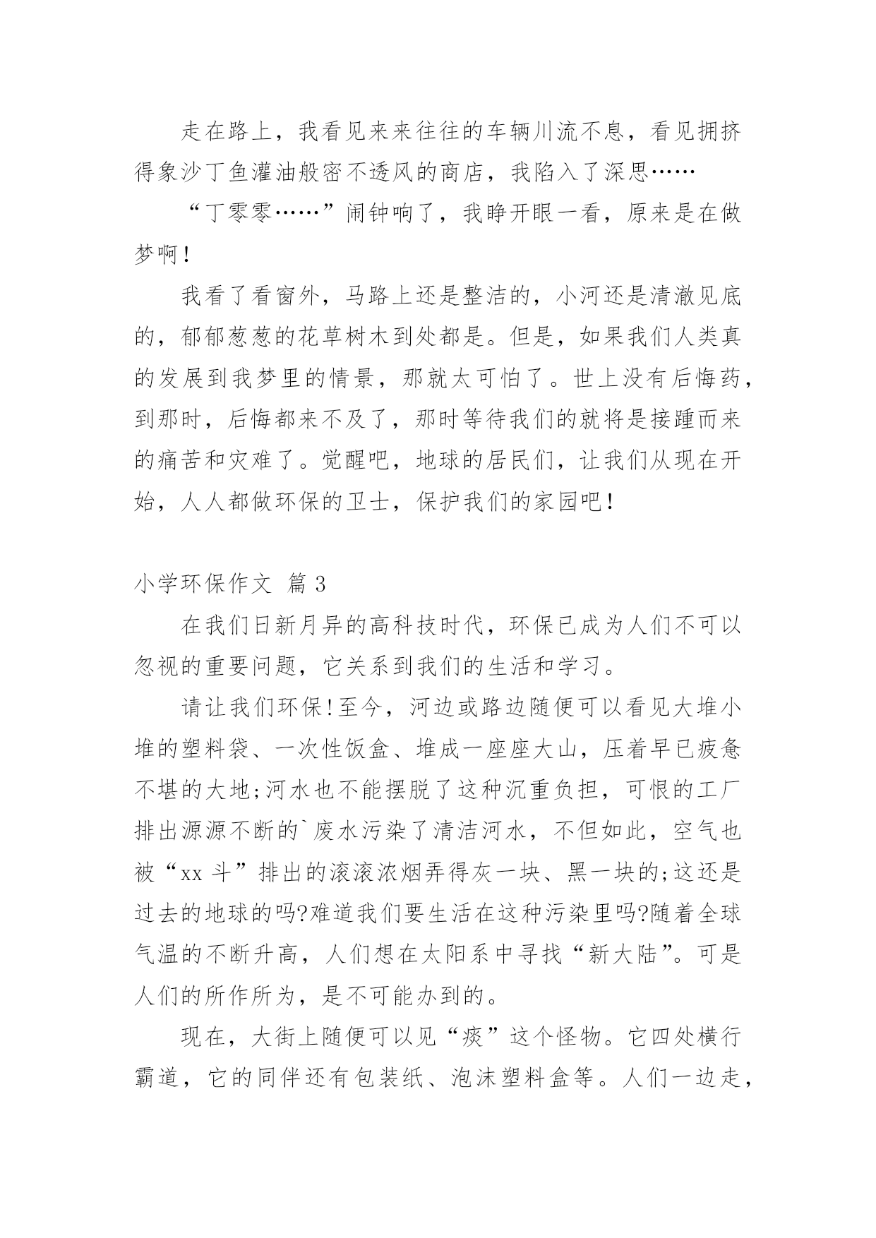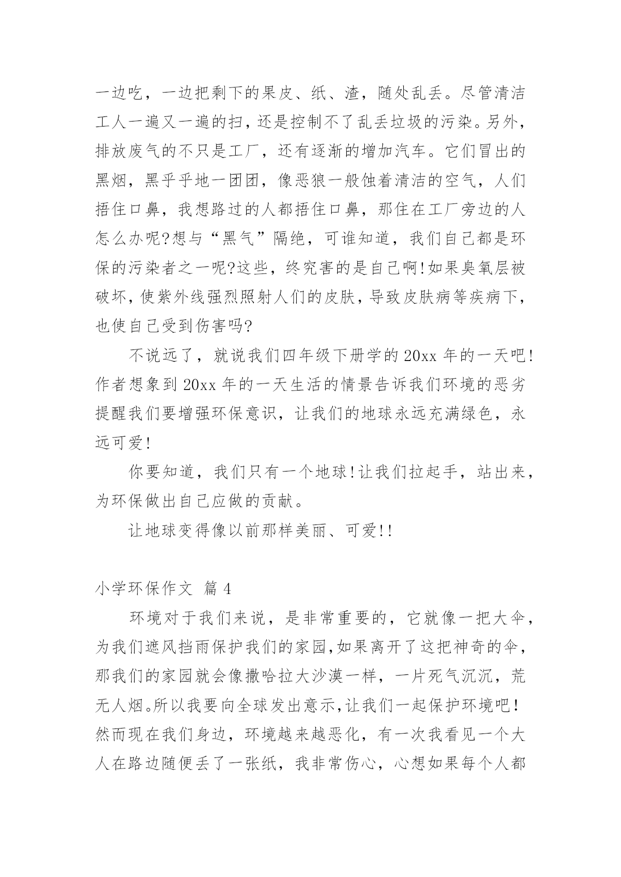 小学环保作文实用的小学环保作文四篇在平平淡淡的日常中,大家都写过作文,肯定对各类作文都很熟悉吧,作文是人们以书面形式表情达意的言语活动。相信很多朋友都对写作文感到非常苦恼吧,以下是小编为大家整理的小学环保作文4篇,欢迎阅读与收藏。小学环保作文篇1环保之梦一天晚上,我做了一个梦,梦见人们无法在地球上生存。因为空气已经完全被污染了。大街上到处是垃圾,有塑料袋、快餐盒、一次性筷子……工厂的烟囱不停地冒着黑烟,天空灰蒙蒙的,小鸟都没有了活动场所,在天空叽叽喳喳的乱叫着。污水管毫无保留地将各种又脏又臭的工业、生活污水排进小河,变成混浊不清,臭味熏天的.水沟,小鱼都死光了……难道这就是我们赖以生存的家园吗?我被这可怕的情景惊醒了,出了一身冷汗,幸好这只是一场梦。虽然是一个梦,但现实生活中的地球,不正是在逐渐变成这个样子的吗?有些人为了个人的利益,不断破坏树木,毁坏森林,小动物都没有了去处,濒临灭绝。工业污染更是加剧恶化,原来清澈见底的河水,现在变得肮脏不堪,这种种行为人类是罪魁祸首呀!但是人类也遭到了报应。树木变成平地,二氧化碳越来越少;原料濒临灭绝,人类工业没有了动机;干旱使良田变成沙漠,洪水吞灭了家园;狂风使沙尘满天飞扬!人类也为此付出了代价。保护环境,人人有责。我们头顶同一片蓝天,脚踩同一片土地,保护环境,我们责无旁贷,让我们携手采取行动,让明天的天更蓝、水更清、草更绿,让明天的大自然充满生机,人们生活更美满!简评:保护环境,就是为自己创造一片洁净的天空。小学环保作文篇2一个星期天,阳光明媚。我来到大街上,这里有刺耳的刹车声,有人们的喧闹声,还有满天飞扬的尘土,使我感到烦躁万分。我来到小河边,看到河水黑乎乎的、脏兮兮的,河水里白色的污染物数不胜数,差不多把整条河都填满了,就像铺着一条白色的地毯。河里的小鱼儿都死光了,毫无生机地浮在水面上。小河边的树木有气无力地耷拉着脑袋!这些都是住在附近的`居民干的好事,他们把污水排进小河里,把垃圾扔进小河里,才使无数生灵死去。我又来到一片树林里,咦,怎么这里的树差不多都被砍光了呢?突然,我听见一阵呻吟的声音,我侧耳倾听,原来是一棵小小的树苗在哭诉啊!我问:“你为什么哭呢?”“我的家人都被工人砍光了,就只留了我一个人,我害怕,我……呜呜……”小树苗还没说完,又伤心地哭起来,那泪水如倾盆大雨般落下来,我心里难过极了!走在路上,我看见来来往往的车辆川流不息,看见拥挤得象沙丁鱼灌油般密不透风的商店,我陷入了深思……“丁零零……”闹钟响了,我睁开眼一看,原来是在做梦啊!我看了看窗外,马路上还是整洁的,小河还是清澈见底的,郁郁葱葱的花草树木到处都是。但是,如果我们人类真的发展到我梦里的情景,那就太可怕了。世上没有后悔药,到那时,后悔都来不及了,那时等待我们的就将是接踵而来的痛苦和灾难了。觉醒吧,地球的居民们,让我们从现在开始,人人都做环保的卫士,保护我们的家园吧!小学环保作文篇3在我们日新月异的高科技时代,环保已成为人们不可以忽视的重要问题,它关系到我们的生活和学习。请让我们环保!至今,河边或路边随便可以看见大堆小堆的塑料袋、一次性饭盒、堆成一座座大山,压着早已疲惫不堪的大地;河水也不能摆脱了这种沉重负担,可恨的工厂排出源源不断的`废水污染了清洁河水,不但如此,空气也被“xx斗”排出的滚滚浓烟弄得灰一块、黑一块的;这还是过去的地球的吗?难道我们要生活在这种污染里吗?随着全球气温的不断升高,人们想在太阳系中寻找“新大陆”。可是人们的所作所为,是不可能办到的。现在,大街上随便可以见“痰”这个怪物。它四处横行霸道,它的同伴还有包装纸、泡沫塑料盒等。人们一边走,一边吃,一边把剩下的果皮、纸、渣,随处乱丢。尽管清洁工人一遍又一遍的扫,还是控制不了乱丢垃圾的污染。另外,排放废气的不只是工厂,还有逐渐的增加汽车。它们冒出的黑烟,黑乎乎地一团团,像恶狼一般蚀着清洁的空气,人们捂住口鼻,我想路过的人都捂住口鼻,那住在工厂旁边的人怎么办呢?想与“黑气”隔绝,可谁知道,我们自己都是环保的污染者之一呢?这些,终究害的是自己啊!如果臭氧层被破坏,使紫外线强烈照射人们的皮肤,导致皮肤病等疾病下,也使自己受到伤害吗?不说远了,就说我们四年级下册学的20xx年的一天吧!作者想象到20xx年的一天生活的情景告诉我们环境的恶劣提醒我们要增强环保意识,让我们的地球永远充满绿色,永远可爱!你要知道,我们只有一个地球!让我们拉起手,站出来,为环保做出自己应做的贡献。让地球变得像以前那样美丽、可爱!!小学环保作文篇4环境对于我们来说,是非常重要的,它就像一把大伞,为我们遮风挡雨保护我们的家园,如果离开了这把神奇的伞,那我们的家园就会像撒哈拉大沙漠一样,一片死气沉沉,荒无人烟。所以我要向全球发出意示,让我们一起保护环境吧!然而现在我们身边,环境越来越