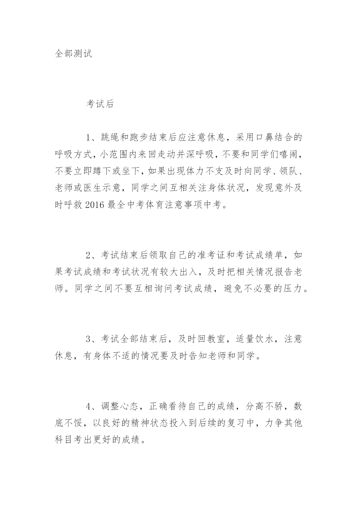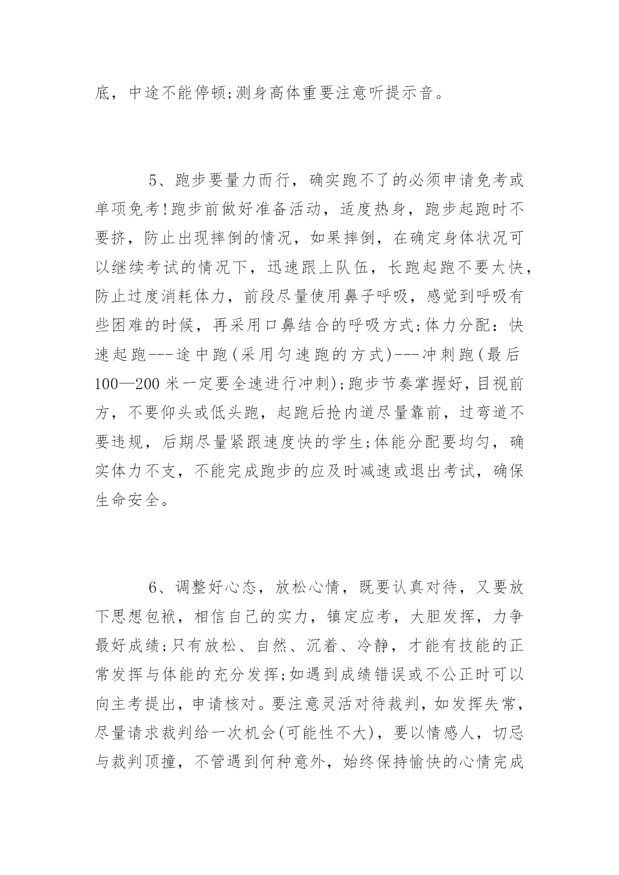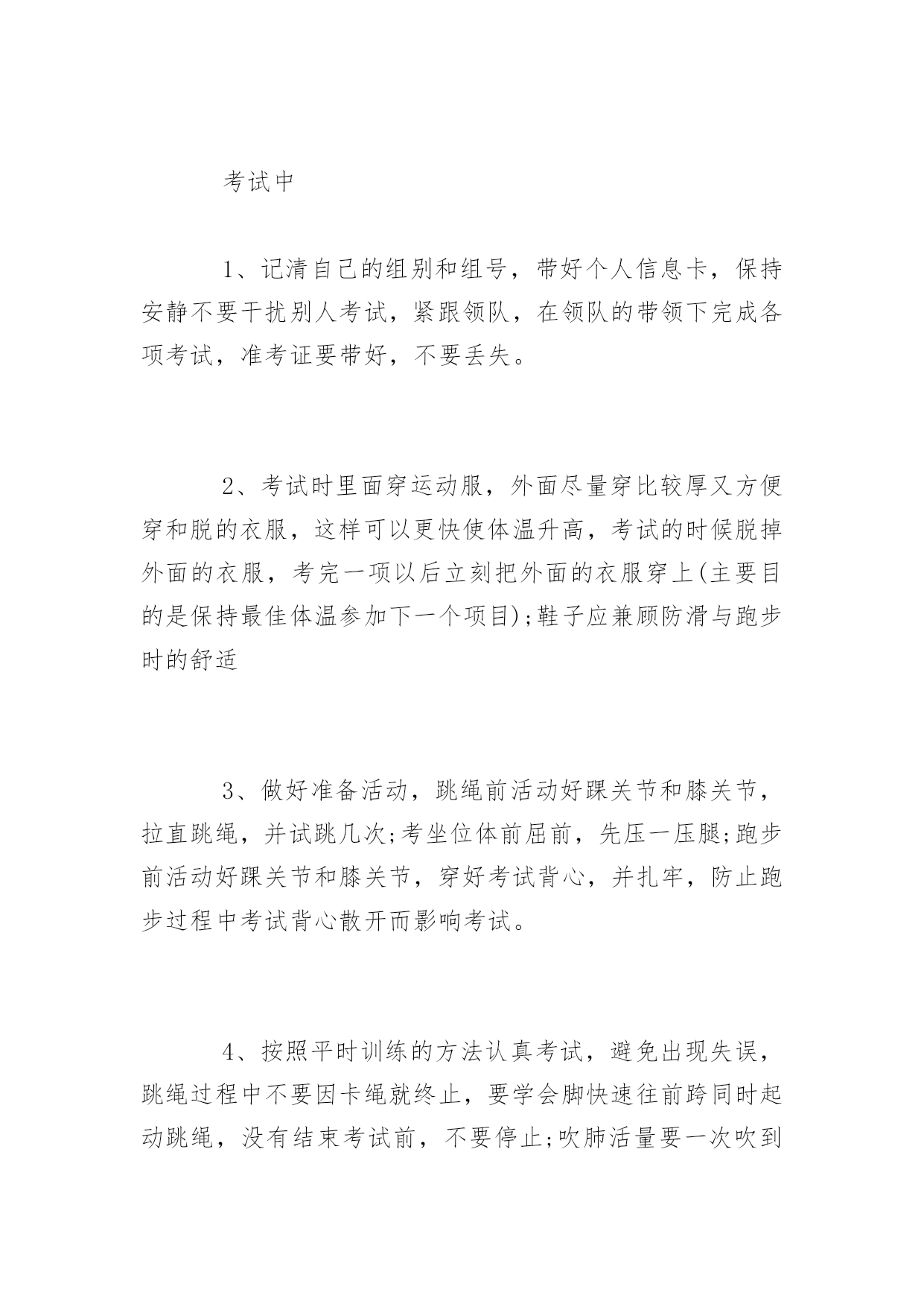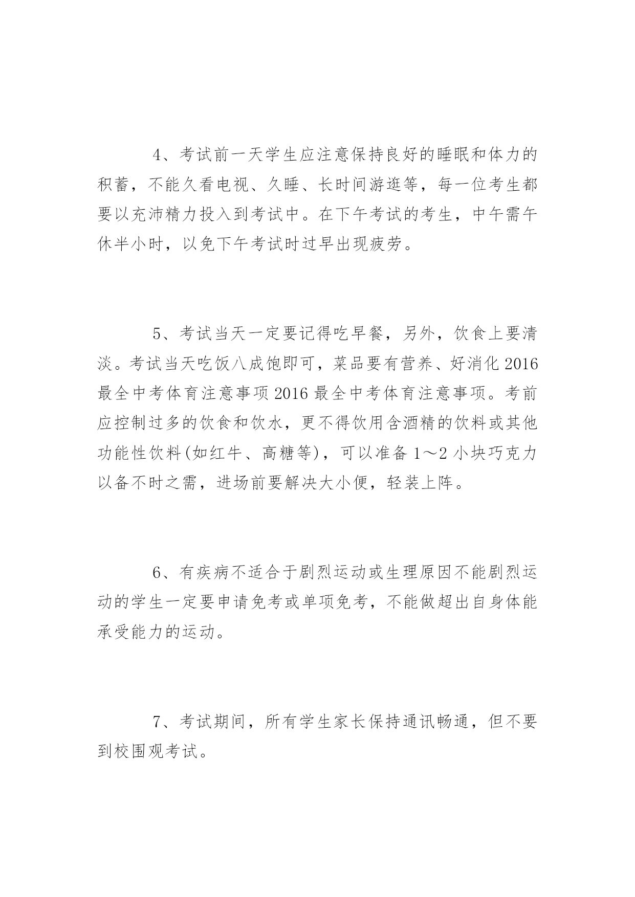 中考体育跑步注意事项中考体育的分数可不少,除非你是学霸,下面小编为你带来的中考体育跑步注意事项,希望你喜欢。考试前1、考试前认真训练,科学训练,全面提高个人体能,考试前两天仅做适应性练习,不应做大强度训练,确保体能。2、准备好物品,所有考生准备一双轻便的运动鞋,建议选用半旧的鞋子,尽量不要选用新鞋;准备一套合适的运动装,学生尽量穿背心与短裤,在测试时身上不要戴任何与考试无关的东西,衣服上的徽章和口袋里的钥匙等硬质物品要取出轻装上阵,绝不能穿牛仔裤、裙子等;跳绳调整到适合的长度,并将两端扎紧防止滑脱;了解同组的同学的跳绳,如果在考试中自己的.跳绳出现问题,及时和同学借用。3、调整好心态相信通过自己刻苦的训练,已经具备了获得高分的能力,轻松备考。4、考试前一天学生应注意保持良好的睡眠和体力的积蓄,不能久看电视、久睡、长时间游逛等,每一位考生都要以充沛精力投入到考试中。在下午考试的考生,中午需午休半小时,以免下午考试时过早出现疲劳。5、考试当天一定要记得吃早餐,另外,饮食上要清淡。考试当天吃饭八成饱即可,菜品要有营养、好消化2016最全中考体育注意事项2016最全中考体育注意事项。考前应控制过多的饮食和饮水,更不得饮用含酒精的饮料或其他功能性饮料(如红牛、高糖等),可以准备1~2小块巧克力以备不时之需,进场前要解决大小便,轻装上阵。6、有疾病不适合于剧烈运动或生理原因不能剧烈运动的学生一定要申请免考或单项免考,不能做超出自身体能承受能力的运动。7、考试期间,所有学生家长保持通讯畅通,但不要到校围观考试。考试中1、记清自己的组别和组号,带好个人信息卡,保持安静不要干扰别人考试,紧跟领队,在领队的带领下完成各项考试,准考证要带好,不要丢失。2、考试时里面穿运动服,外面尽量穿比较厚又方便穿和脱的衣服,这样可以更快使体温升高,考试的时候脱掉外面的衣服,考完一项以后立刻把外面的衣服穿上(主要目的是保持最佳体温参加下一个项目);鞋子应兼顾防滑与跑步时的舒适3、做好准备活动,跳绳前活动好踝关节和膝关节,拉直跳绳,并试跳几次;考坐位体前屈前,先压一压腿;跑步前活动好踝关节和膝关节,穿好考试背心,并扎牢,防止跑步过程中考试背心散开而影响考试。4、按照平时训练的方法认真考试,避免出现失误,跳绳过程中不要因卡绳就终止,要学会脚快速往前跨同时起动跳绳,没有结束考试前,不要停止;吹肺活量要一次吹到底,中途不能停顿;测身高体重要注意听提示音。5、跑步要量力而行,确实跑不了的必须申请免考或单项免考!跑步前做好准备活动,适度热身,跑步起跑时不要挤,防止出现摔倒的情况,如果摔倒,在确定身体状况可以继续考试的情况下,迅速跟上队伍,长跑起跑不要太快,防止过度消耗体力,前段尽量使用鼻子呼吸,感觉到呼吸有些困难的时候,再采用口鼻结合的呼吸方式;体力分配:快速起跑---途中跑(采用匀速跑的方式)---冲刺跑(最后100—200米一定要全速进行冲刺);跑步节奏掌握好,目视前方,不要仰头或低头跑,起跑后抢内道尽量靠前,过弯道不要违规,后期尽量紧跟速度快的学生;体能分配要均匀,确实体力不支,不能完成跑步的应及时减速或退出考试,确保生命安全。6、调整好心态,放松心情,既要认真对待,又要放下思想包袱,相信自己的实力,镇定应考,大胆发挥,力争最好成绩;只有放松、自然、沉着、冷静,才能有技能的正常发挥与体能的充分发挥;如遇到成绩错误或不公正时可以向主考提出,申请核对。要注意灵活对待裁判,如发挥失常,尽量请求裁判给一次机会(可能性不大),要以情感人,切忌与裁判顶撞,不管遇到何种意外,始终保持愉快的心情完成全部测试考试后1、跳绳和跑步结束后应注意休息,采用口鼻结合的呼吸方式,小范围内来回走动并深呼吸,不要和同学们嘻闹,不要立即蹲下或坐下,如果出现体力不支及时向同学、领队、老师或医生示意,同学之间互相关注身体状况,发现意外及时呼救2016最全中考体育注意事项中考。2、考试结束后领取自己的准考证和考试成绩单,如果考试成绩和考试状况有较大出入,及时把相关情况报告老师。同学之间不要互相询问考试成绩,避免不必要的压力。3、考试全部结束后,及时回教室,适量饮水,注意休息,有身体不适的情况要及时告知老师和同学。4、调整心态,正确看待自己的成绩,分高不骄,数底不馁,以良好的精神状态投入到后续的复习中,力争其他科目考出更好的成绩。