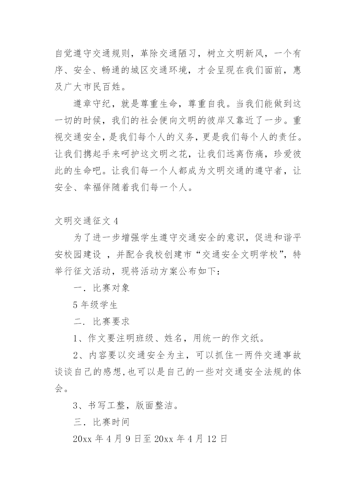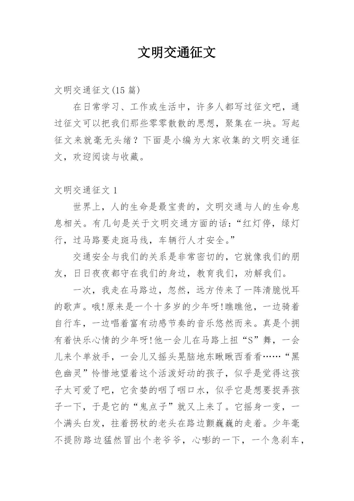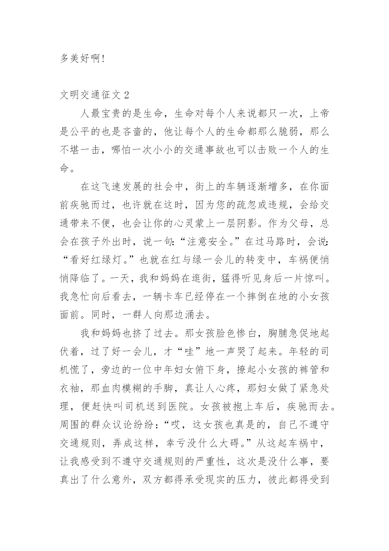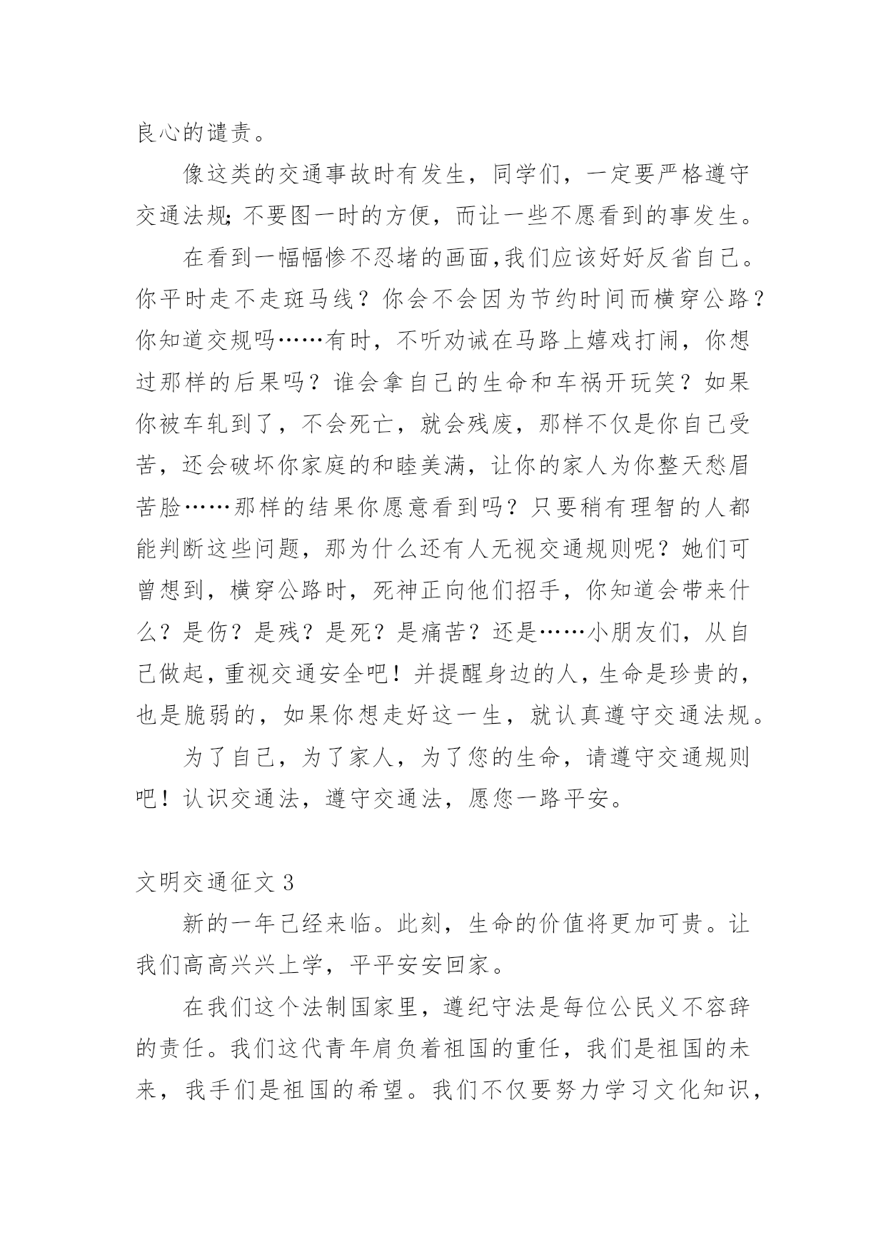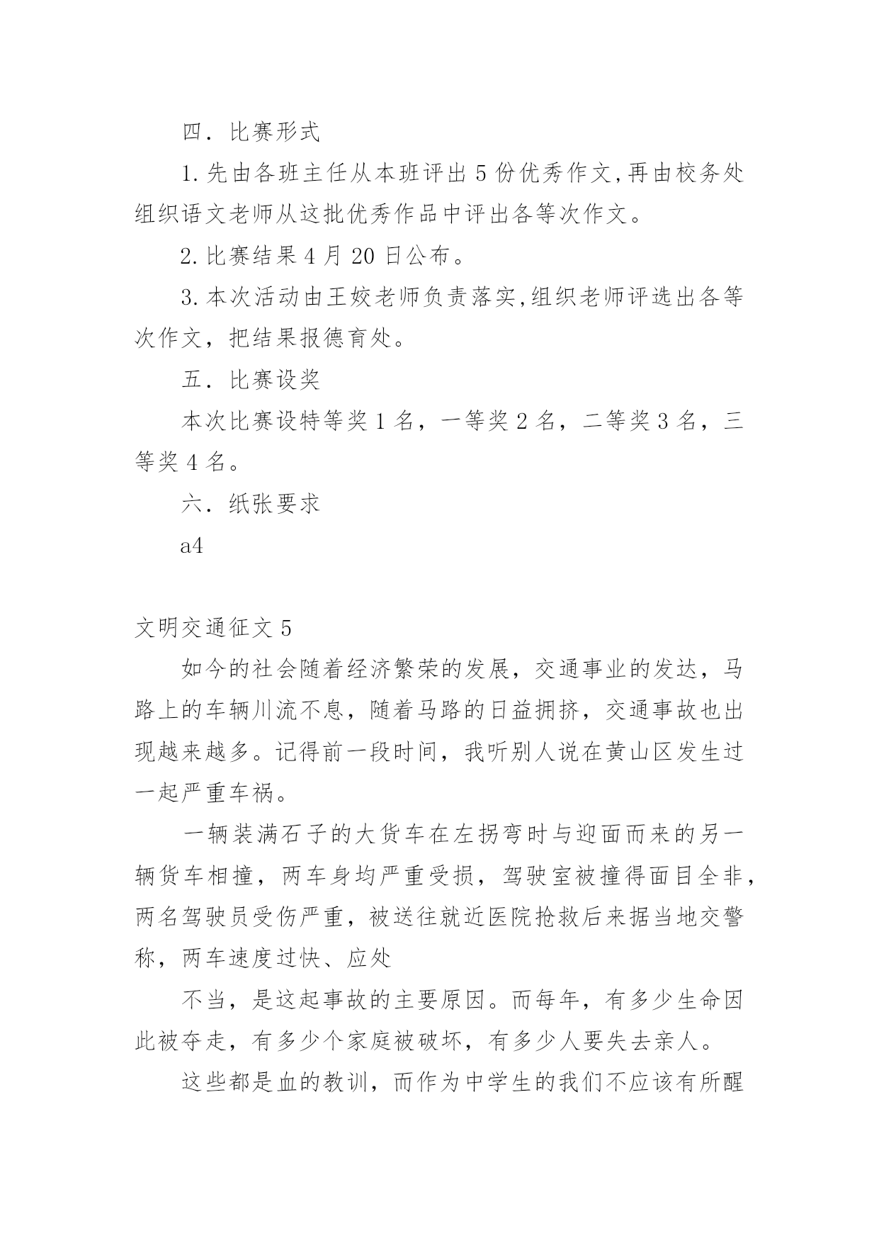 文明交通征文文明交通征文(15篇)在日常学习、工作或生活中,许多人都写过征文吧,通过征文可以把我们那些零零散散的思想,聚集在一块。写起征文来就毫无头绪?下面是小编为大家收集的文明交通征文,欢迎阅读与收藏。文明交通征文1世界上,人的生命是最宝贵的,文明交通与人的生命息息相关。有几句是关于文明交通方面的话:“红灯停,绿灯行,过马路要走斑马线,车辆行人才安全。”交通安全与我们的关系是非常密切的,它就像我们的朋友,日日夜夜都守在我们的身边,教育我们,劝解我们。一次,我走在马路边,忽然,远方传来了一阵清脆悦耳的歌声。哦!原来是一个十多岁的少年呀!瞧瞧他,一边骑着自行车,一边唱着富有动感节奏的音乐悠然而来。真是个拥有着快乐心情的少年呀!他一会儿在马路上扭“S”舞,一会儿来个单放手,一会儿又摇头晃脑地东瞅瞅西看看……“黑色幽灵”怜惜地望着这个活泼好动的孩子,似乎是觉得这孩子太可爱了吧,它贪婪的咽了咽口水,似乎它是想要捉弄孩子一下,于是它的“鬼点子”就又上来了。它摇身一变,一个满头白发,拄着拐杖的老头在路边颤巍巍的走着。少年毫不提防路边猛然冒出个老爷爷,心嘭的一下,一个急刹车,却又把握不住,连车带人摔倒在地上,歌声瞬间成了令人心碎的呻吟……交通事故随时都有可能发生,它就像一颗威力十足的炸弹,所以当大人们吃饭的时候,千万不万不要让他们喝酒。因为如果喝了酒再开车,随时都有可能发生交通事故。有一位哲学家说过:人生只有昨天,今天和明天。是的,生命在慢慢的离去,生命不在于长短而是在于是否精彩,把握住每一个瞬间,让生命如同璀璨的星群,发光发亮……当我们看到一朵鲜花盛开的时候,我为之高兴;可是,当我看着一朵朵花儿慢慢凋谢,不免有些伤感。我的定义中,花开就是生命的开始,花谢就是生命的结束,人的一生中可以看到多少个花开花谢呢?每你看一回时间,时间久悄悄溜走了一次。我不禁感叹一句——生命如此短暂!所以说,上帝是吝啬的,也是公平的,他只给每一个人一次生命,让我们都明白生命只有一次要好好珍惜,还让我们明白了校园的安全是不可以忽略的。交通安全,我们应当牢记在心。更主要的,是要知道交通安全常识:首先,行人必须在人行横道内行走,没有人行横道烤邮编行走;穿越马路须走人行横道(斑马线);通过有交通信号控制的人行横道须遵守信号的规定;通过没有交通信号控制的人行横道,要左顾右盼,注意车辆来往,不准追逐奔跑。人的生命只有一次,交通安全丝毫不能马虎,要是人人做到文明交通伴我行,人人都献上一份爱心,这个世界那该多美好啊!文明交通征文2人最宝贵的是生命,生命对每个人来说都只一次,上帝是公平的也是吝啬的,他让每个人的生命都那么脆弱,那么不堪一击,哪怕一次小小的交通事故也可以击败一个人的生命。在这飞速发展的社会中,街上的车辆逐渐增多,在你面前疾驰而过,也许就在这时,因为您的疏忽或违规,会给交通带来不便,也会让你的心灵蒙上一层阴影。作为父母,总会在孩子外出时,说一句:“注意安全。”在过马路时,会说:“看好红绿灯。”也就在红与绿一会儿的转变中,车祸便悄悄降临了。一天,我和妈妈在逛街,猛得听见身后一片惊叫。我急忙向后看去,一辆卡车已经停在一个摔倒在地的小女孩面前。同时,一群人向那边涌去。我和妈妈也挤了过去。那女孩脸色惨白,胸脯急促地起伏着,过了好一会儿,才“哇”地一声哭了起来。年轻的司机慌了,旁边的一位中年妇女俯下身,撩起小女孩的裤管和衣袖,那血肉模糊的手脚,真让人心疼,那妇女做了紧急处理,便赶快叫司机送到医院。女孩被抱上车后,疾驰而去。周围的群众议论纷纷:“哎,这女孩也真是的,自己不遵守交通规则,弄成这样,幸亏没什么大碍。”从这起车祸中,让我感受到不遵守交通规则的严重性,这次是没什么事,要真出了什么意外,双方都得承受现实的压力,彼此都得受到良心的谴责。像这类的交通事故时有发生,同学们,一定要严格遵守交通法规;不要图一时的方便,而让一些不愿看到的事发生。在看到一幅幅惨不忍堵的画面,我们应该好好反省自己。你平时走不走斑马线?你会不会因为节约时间而横穿公路?你知道交规吗……有时,不听劝诫在马路上嬉戏打闹,你想过那样的后果吗?谁会拿自己的生命和车祸开玩笑?如果你被车轧到了,不会死亡,就会残废,那样不仅是你自己受苦,还会破坏你家庭的和睦美满,让你的家人为你整天愁眉苦脸……那样的结果你愿意看到吗?只要稍有理智的人都能判断这些问题,那为什么还有人无视交通规则呢?她们可曾想到,横穿公路时,死神正向他们招手,你知道会带来什么?是伤?是残?是死?是痛苦?还是……小朋友们,从自己做起,重视交通安全吧!并提醒身边的人,生命是珍贵的,也是脆弱的,如果你想走好这一生,就认真遵守交通法规。为了自己,为了家人,为了您的生命,请遵守交通规则吧!认识交通法,遵守交通法,愿您一路平安。文明交通征文3新的一年己经来临。此刻,生命的