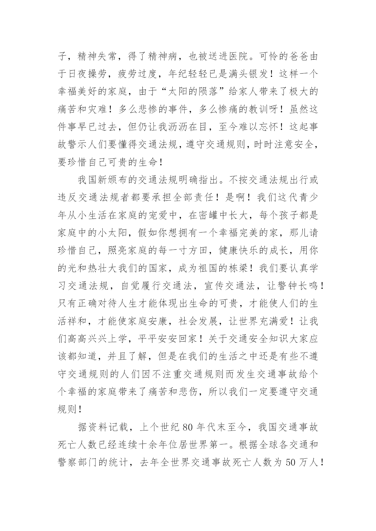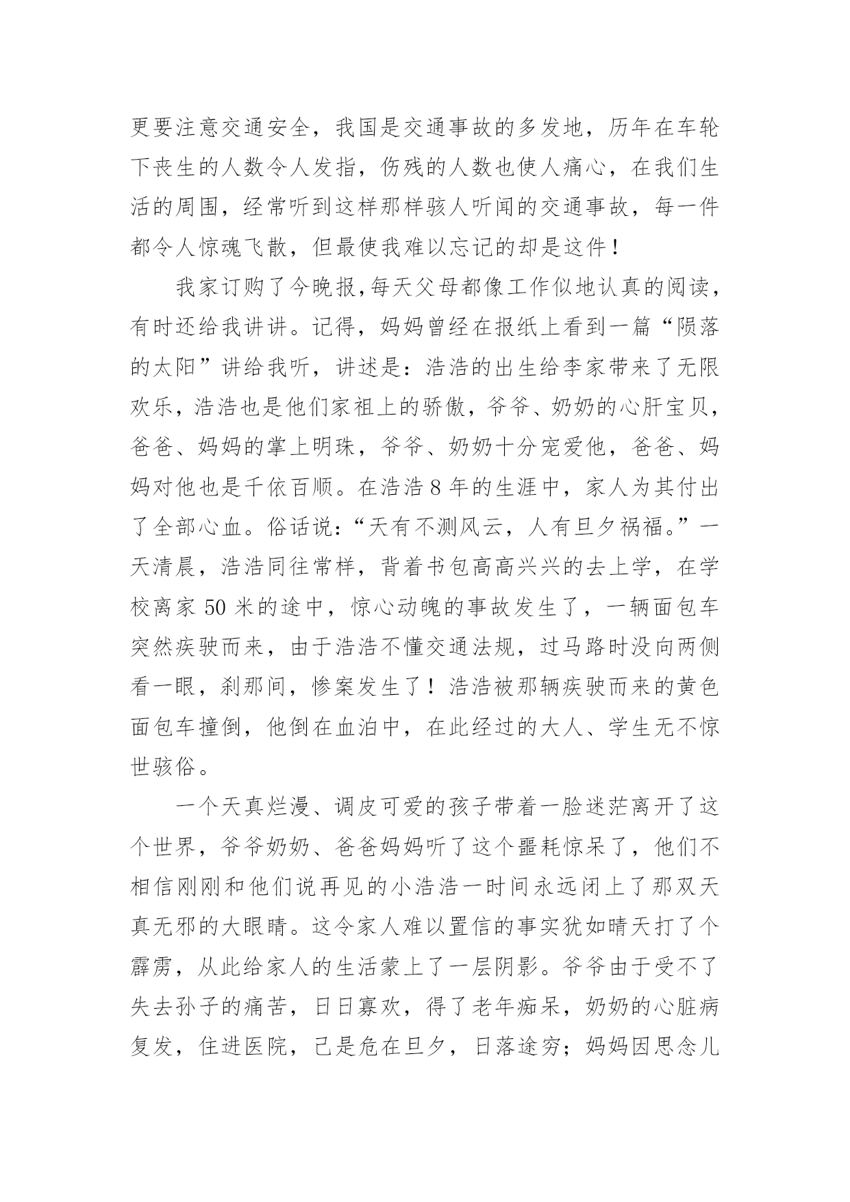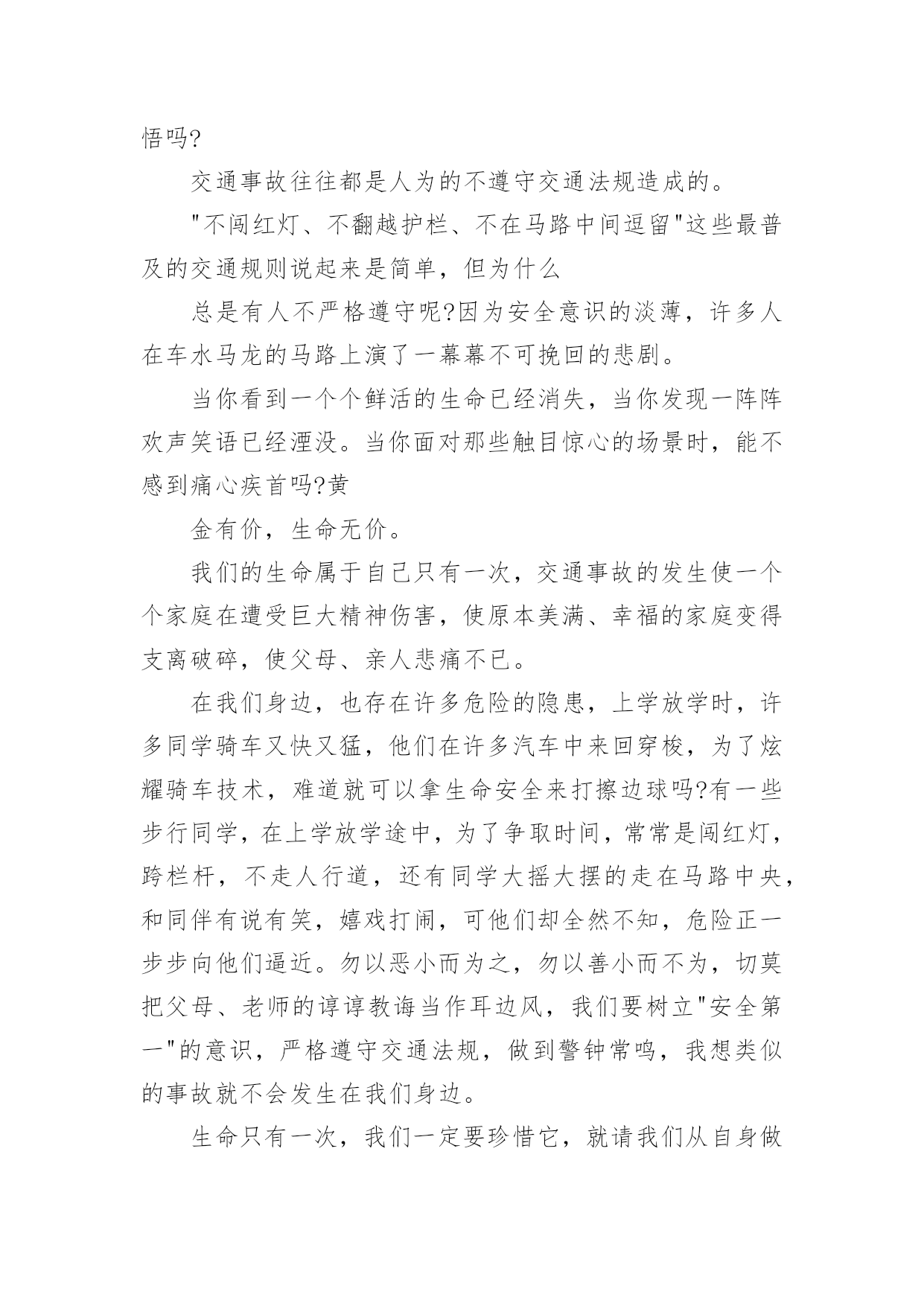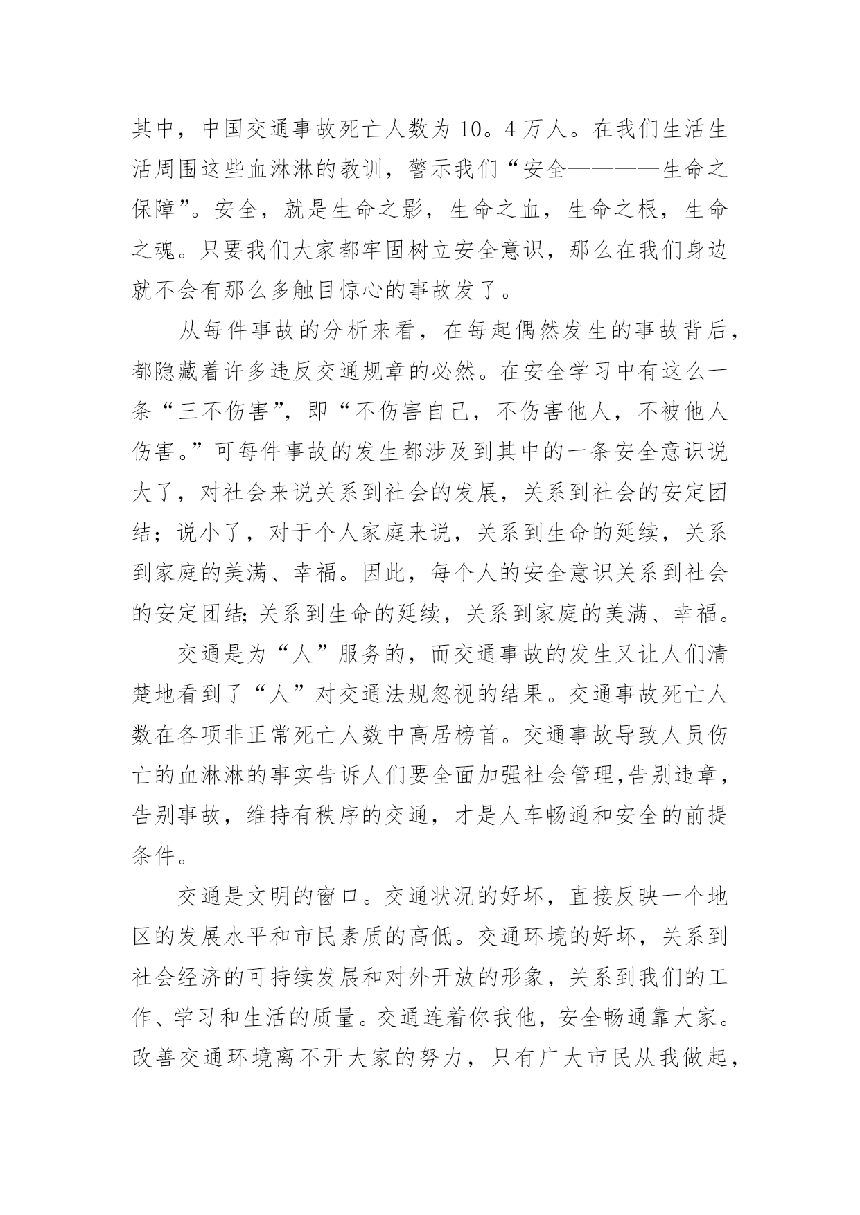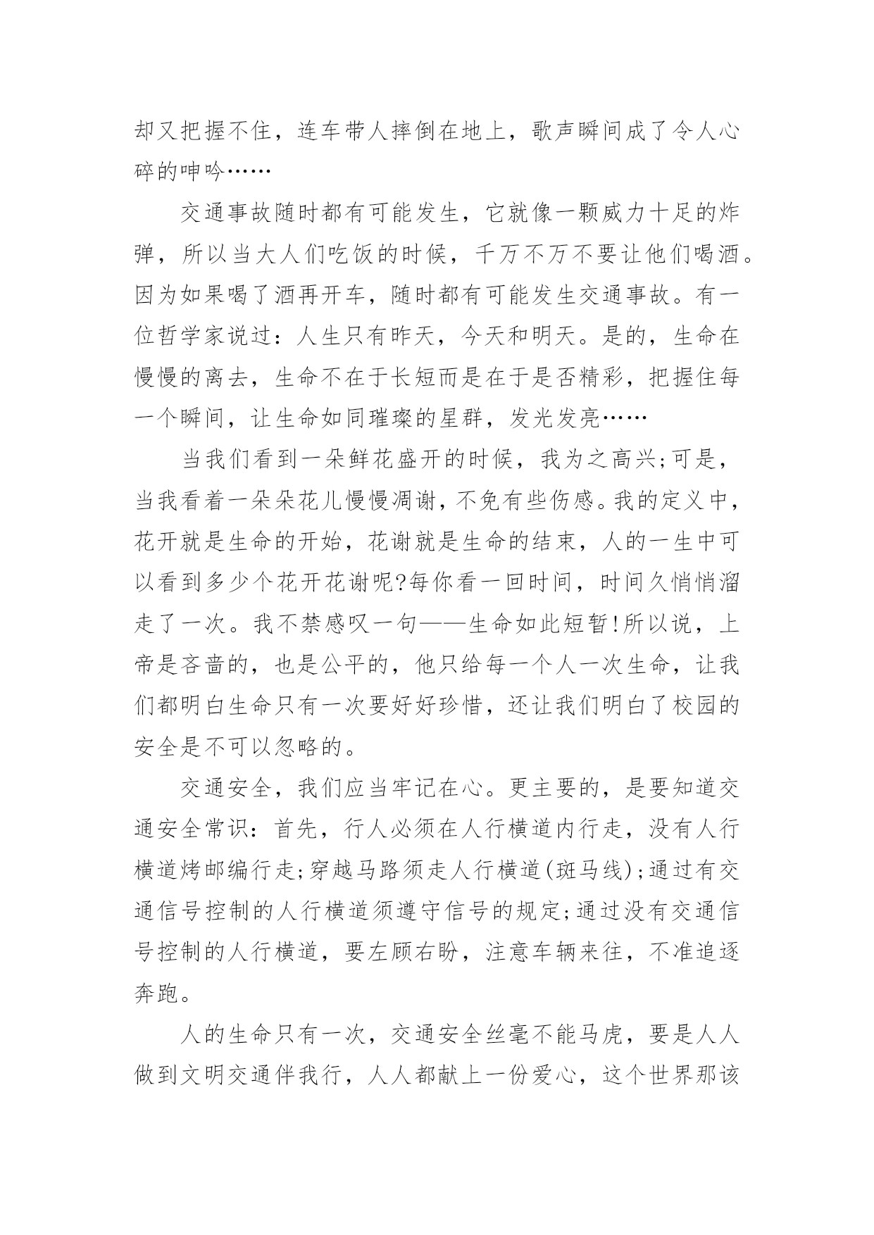 文明交通征文文明交通征文(15篇)在日常学习、工作或生活中,许多人都写过征文吧,通过征文可以把我们那些零零散散的思想,聚集在一块。写起征文来就毫无头绪?下面是小编为大家收集的文明交通征文,欢迎阅读与收藏。文明交通征文1世界上,人的生命是最宝贵的,文明交通与人的生命息息相关。有几句是关于文明交通方面的话:“红灯停,绿灯行,过马路要走斑马线,车辆行人才安全。”交通安全与我们的关系是非常密切的,它就像我们的朋友,日日夜夜都守在我们的身边,教育我们,劝解我们。一次,我走在马路边,忽然,远方传来了一阵清脆悦耳的歌声。哦!原来是一个十多岁的少年呀!瞧瞧他,一边骑着自行车,一边唱着富有动感节奏的音乐悠然而来。真是个拥有着快乐心情的少年呀!他一会儿在马路上扭“S”舞,一会儿来个单放手,一会儿又摇头晃脑地东瞅瞅西看看……“黑色幽灵”怜惜地望着这个活泼好动的孩子,似乎是觉得这孩子太可爱了吧,它贪婪的咽了咽口水,似乎它是想要捉弄孩子一下,于是它的“鬼点子”就又上来了。它摇身一变,一个满头白发,拄着拐杖的老头在路边颤巍巍的走着。少年毫不提防路边猛然冒出个老爷爷,心嘭的一下,一个急刹车,却又把握不住,连车带人摔倒在地上,歌声瞬间成了令人心碎的呻吟……交通事故随时都有可能发生,它就像一颗威力十足的炸弹,所以当大人们吃饭的时候,千万不万不要让他们喝酒。因为如果喝了酒再开车,随时都有可能发生交通事故。有一位哲学家说过:人生只有昨天,今天和明天。是的,生命在慢慢的离去,生命不在于长短而是在于是否精彩,把握住每一个瞬间,让生命如同璀璨的星群,发光发亮……当我们看到一朵鲜花盛开的时候,我为之高兴;可是,当我看着一朵朵花儿慢慢凋谢,不免有些伤感。我的定义中,花开就是生命的开始,花谢就是生命的结束,人的一生中可以看到多少个花开花谢呢?每你看一回时间,时间久悄悄溜走了一次。我不禁感叹一句——生命如此短暂!所以说,上帝是吝啬的,也是公平的,他只给每一个人一次生命,让我们都明白生命只有一次要好好珍惜,还让我们明白了校园的安全是不可以忽略的。交通安全,我们应当牢记在心。更主要的,是要知道交通安全常识:首先,行人必须在人行横道内行走,没有人行横道烤邮编行走;穿越马路须走人行横道(斑马线);通过有交通信号控制的人行横道须遵守信号的规定;通过没有交通信号控制的人行横道,要左顾右盼,注意车辆来往,不准追逐奔跑。人的生命只有一次,交通安全丝毫不能马虎,要是人人做到文明交通伴我行,人人都献上一份爱心,这个世界那该多美好啊!文明交通征文2人最宝贵的是生命,生命对每个人来说都只一次,上帝是公平的也是吝啬的,他让每个人的生命都那么脆弱,那么不堪一击,哪怕一次小小的交通事故也可以击败一个人的生命。在这飞速发展的社会中,街上的车辆逐渐增多,在你面前疾驰而过,也许就在这时,因为您的疏忽或违规,会给交通带来不便,也会让你的心灵蒙上一层阴影。作为父母,总会在孩子外出时,说一句:“注意安全。”在过马路时,会说:“看好红绿灯。”也就在红与绿一会儿的转变中,车祸便悄悄降临了。一天,我和妈妈在逛街,猛得听见身后一片惊叫。我急忙向后看去,一辆卡车已经停在一个摔倒在地的小女孩面前。同时,一群人向那边涌去。我和妈妈也挤了过去。那女孩脸色惨白,胸脯急促地起伏着,过了好一会儿,才“哇”地一声哭了起来。年轻的司机慌了,旁边的一位中年妇女俯下身,撩起小女孩的裤管和衣袖,那血肉模糊的手脚,真让人心疼,那妇女做了紧急处理,便赶快叫司机送到医院。女孩被抱上车后,疾驰而去。周围的群众议论纷纷:“哎,这女孩也真是的,自己不遵守交通规则,弄成这样,幸亏没什么大碍。”从这起车祸中,让我感受到不遵守交通规则的严重性,这次是没什么事,要真出了什么意外,双方都得承受现实的压力,彼此都得受到良心的谴责。像这类的交通事故时有发生,同学们,一定要严格遵守交通法规;不要图一时的方便,而让一些不愿看到的事发生。在看到一幅幅惨不忍堵的画面,我们应该好好反省自己。你平时走不走斑马线?你会不会因为节约时间而横穿公路?你知道交规吗……有时,不听劝诫在马路上嬉戏打闹,你想过那样的后果吗?谁会拿自己的生命和车祸开玩笑?如果你被车轧到了,不会死亡,就会残废,那样不仅是你自己受苦,还会破坏你家庭的和睦美满,让你的家人为你整天愁眉苦脸……那样的结果你愿意看到吗?只要稍有理智的人都能判断这些问题,那为什么还有人无视交通规则呢?她们可曾想到,横穿公路时,死神正向他们招手,你知道会带来什么?是伤?是残?是死?是痛苦?还是……小朋友们,从自己做起,重视交通安全吧!并提醒身边的人,生命是珍贵的,也是脆弱的,如果你想走好这一生,就认真遵守交通法规。为了自己,为了家人,为了您的生命,请遵守交通规则吧!认识交通法,遵守交通法,愿您一路平安。文明交通征文3新的一年己经来临。此刻,生命的
