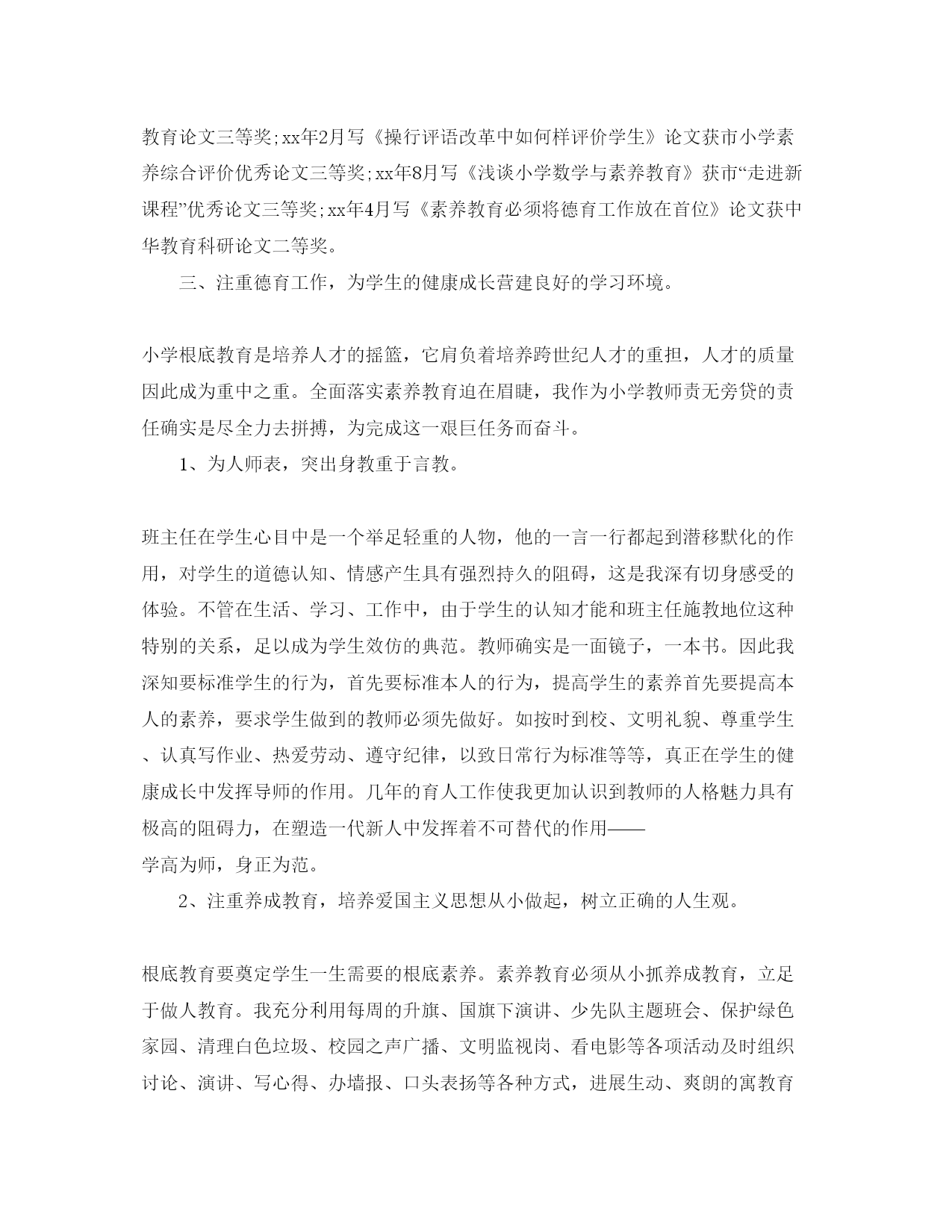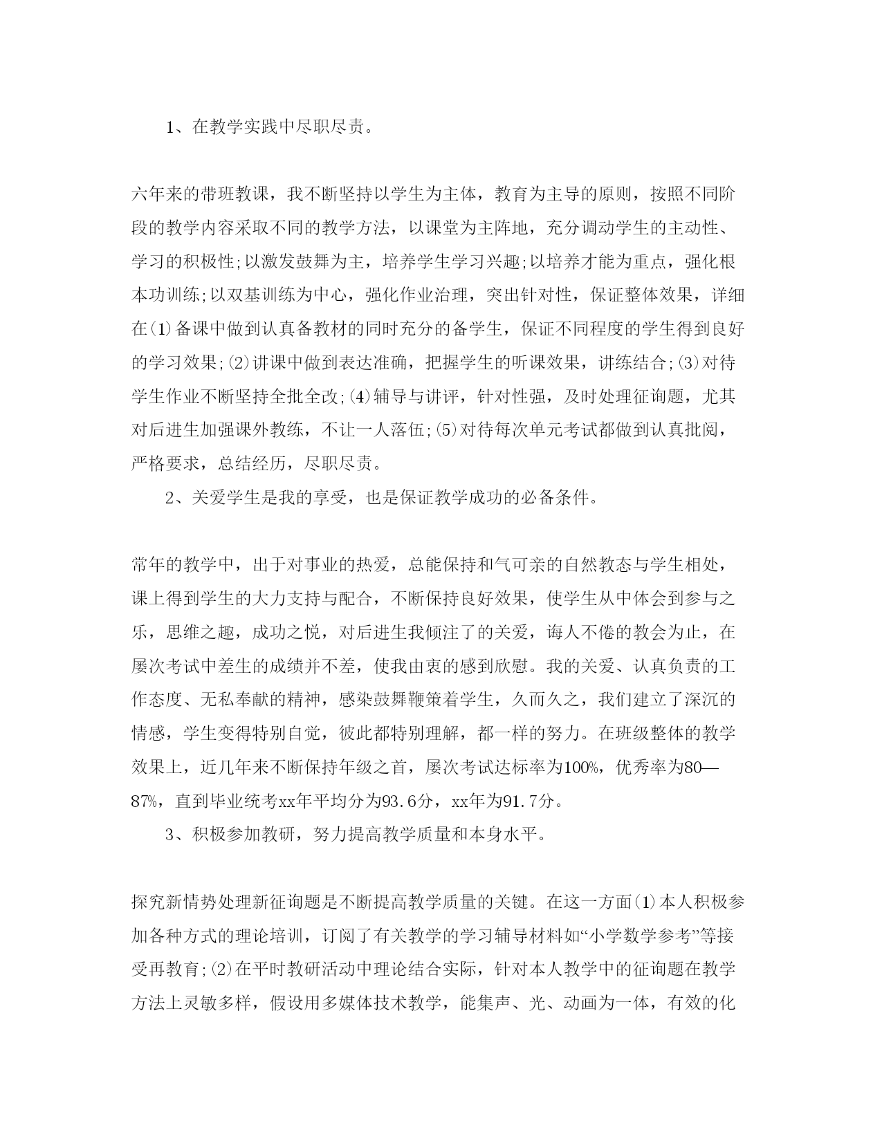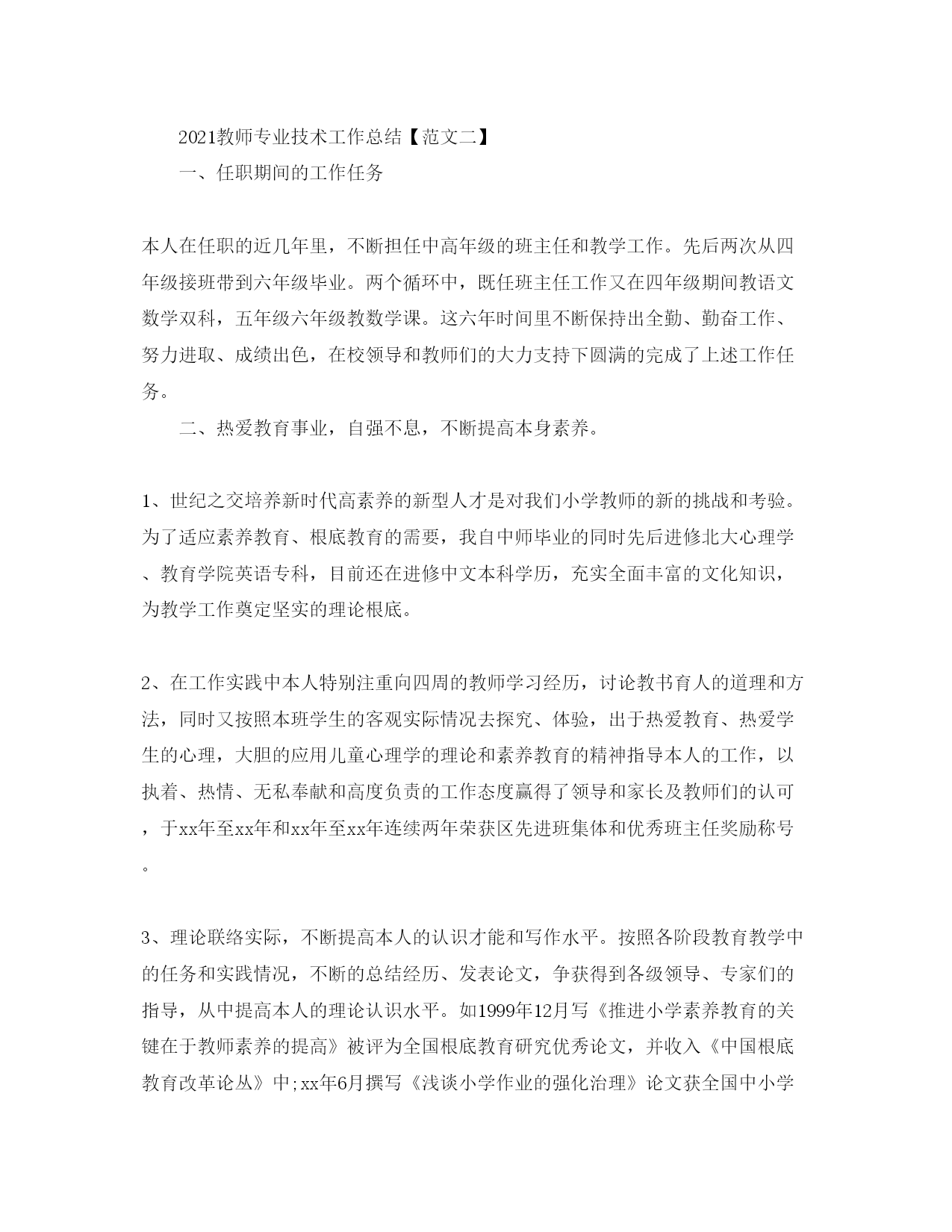 2021教师专业技术工作参考总结2021教师专业技术工作总结【范文一】本人自任小学一级教师以来,以更加饱满的工作热情,发奋向上的精神,积极完本钱职工作。在党和上级领导的关心和协助下,思想进步,积极进取,团结同事,遵纪守法,响应学校的号召。能积极执行党的各项方针政策,努力提高自已的政治思想觉悟,不断加强本身品德修养,以适应新情势下教育的需要。在工作中任劳任怨,扎实求进,服从领导,服从学校一切安排,从不计较个人得失,保质保量完成各项工作任务。本人在教学工作和班主任工作中不断尽职尽责。工作中本人能够认真研究大纲,研究教法,细心备课,不断加强教学理论的学习,为适应教育改革开展的要求,积极汲取先进教师的教学经历,以适应新素养教育的要求。但教学有法,教无定法,工作之余我不断充实自已、丰富自我,为了自已教法的更新,不断加强业务学习,积极听取有丰富经历的教师的讲课,学习新的教学理论,特别注重学生对根底知识的掌握程度,因此近几年我的教学水平大幅度提高,所任课班级学科成绩不断名列榜首。因此,教师不但要教书,更重要的是教给学生如何样做人。为此,我在班主任工作中,本着“树人先正已”的工作作风,来治理班级,阻碍学生的品行。但凡要求学生做到的,自已首先要做到,同时经常对学生进展耐心细致的思想工作,做到晓之以理、动之以情、导之以行。几年来所担任的班级,班风正,学风浓,成绩优良,遭到学校领导和家长的好评,本人也获得了“优秀班主任”的称号。如今,教育对教师素养的要求越来越高已成为现实,假设不进展学习就会落伍、被淘汰,为此,我抓住每年的在职接着教育学习时机,深化学习研究,来提高自已的业务水平,以适应新素养教育开展的要求。2021教师专业技术工作总结【范文二】一、任职期间的工作任务本人在任职的近几年里,不断担任中高年级的班主任和教学工作。先后两次从四年级接班带到六年级毕业。两个循环中,既任班主任工作又在四年级期间教语文数学双科,五年级六年级教数学课。这六年时间里不断保持出全勤、勤奋工作、努力进取、成绩出色,在校领导和教师们的大力支持下圆满的完成了上述工作任务。二、热爱教育事业,自强不息,不断提高本身素养。1、世纪之交培养新时代高素养的新型人才是对我们小学教师的新的挑战和考验。为了适应素养教育、根底教育的需要,我自中师毕业的同时先后进修北大心理学、教育学院英语专科,目前还在进修中文本科学历,充实全面丰富的文化知识,为教学工作奠定坚实的理论根底。2、在工作实践中本人特别注重向四周的教师学习经历,讨论教书育人的道理和方法,同时又按照本班学生的客观实际情况去探究、体验,出于热爱教育、热爱学生的心理,大胆的应用儿童心理学的理论和素养教育的精神指导本人的工作,以执着、热情、无私奉献和高度负责的工作态度赢得了领导和家长及教师们的认可,于xx年至xx年和xx年至xx年连续两年荣获区先进班集体和优秀班主任奖励称号。3、理论联络实际,不断提高本人的认识才能和写作水平。按照各阶段教育教学中的任务和实践情况,不断的总结经历、发表论文,争获得到各级领导、专家们的指导,从中提高本人的理论认识水平。如1999年12月写《推进小学素养教育的关键在于教师素养的提高》被评为全国根底教育研究优秀论文,并收入《中国根底教育改革论丛》中;xx年6月撰写《浅谈小学作业的强化治理》论文获全国中小学教育论文三等奖;xx年2月写《操行评语改革中如何样评价学生》论文获市小学素养综合评价优秀论文三等奖;xx年8月写《浅谈小学数学与素养教育》获市“走进新课程”优秀论文三等奖;xx年4月写《素养教育必须将德育工作放在首位》论文获中华教育科研论文二等奖。三、注重德育工作,为学生的健康成长营建良好的学习环境。小学根底教育是培养人才的摇篮,它肩负着培养跨世纪人才的重担,人才的质量因此成为重中之重。全面落实素养教育迫在眉睫,我作为小学教师责无旁贷的责任确实是尽全力去拼搏,为完成这一艰巨任务而奋斗。1、为人师表,突出身教重于言教。班主任在学生心目中是一个举足轻重的人物,他的一言一行都起到潜移默化的作用,对学生的道德认知、情感产生具有强烈持久的阻碍,这是我深有切身感受的体验。不管在生活、学习、工作中,由于学生的认知才能和班主任施教地位这种特别的关系,足以成为学生效仿的典范。教师确实是一面镜子,一本书。因此我深知要标准学生的行为,首先要标准本人的行为,提高学生的素养首先要提高本人的素养,要求学生做到的教师必须先做好。如按时到校、文明礼貌、尊重学生、认真写作业、热爱劳动、遵守纪律,以致日常行为标准等等,真正在学生的健康成长中发挥导师的作用。几年的育人工作使我更加认识到教师的人格魅力具有极高的阻碍力,在塑造一代新人中发挥着不可替代的作用——学高为师,身正为范。2、注重养成教育,培养爱国主义思想从小做起,树