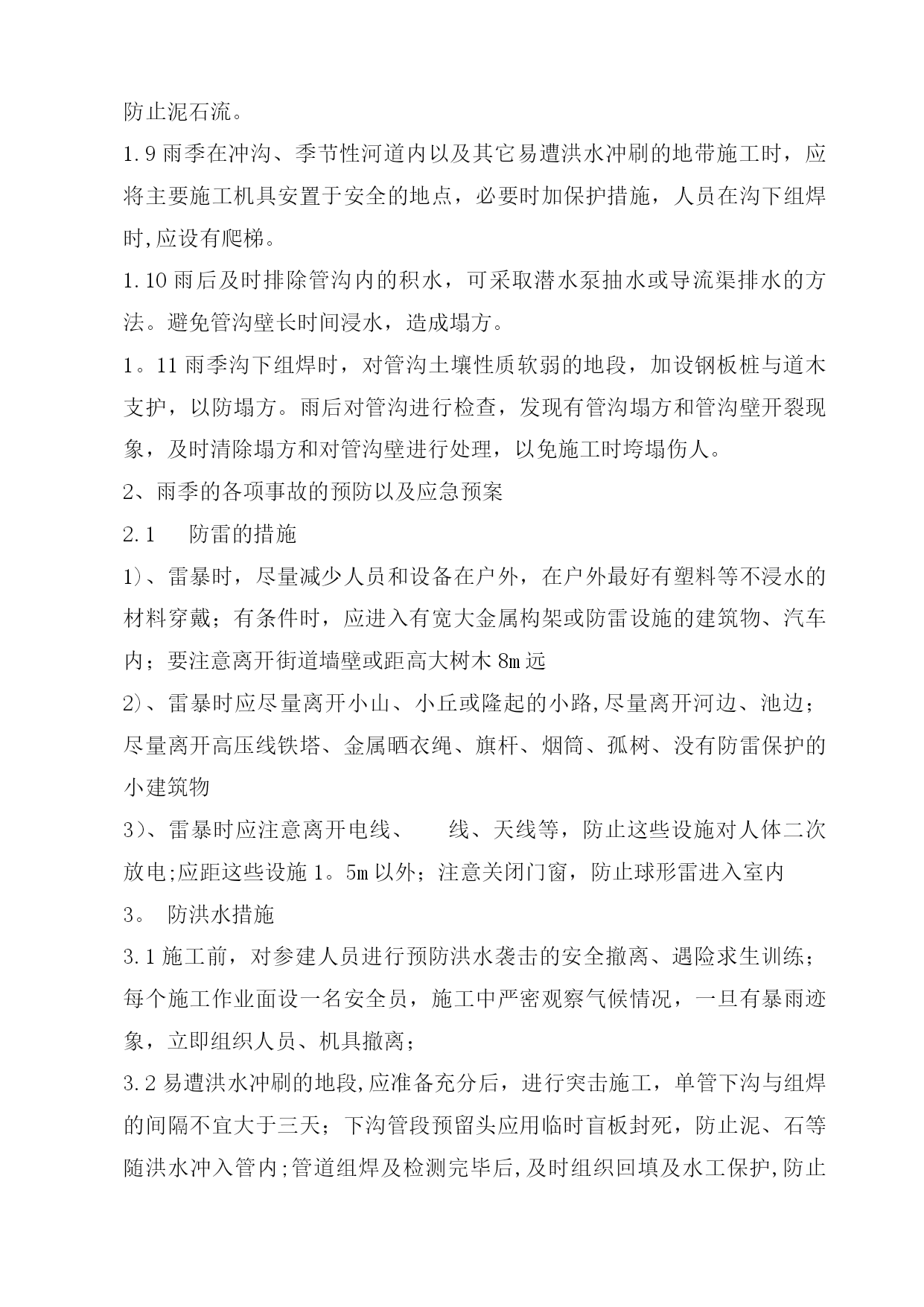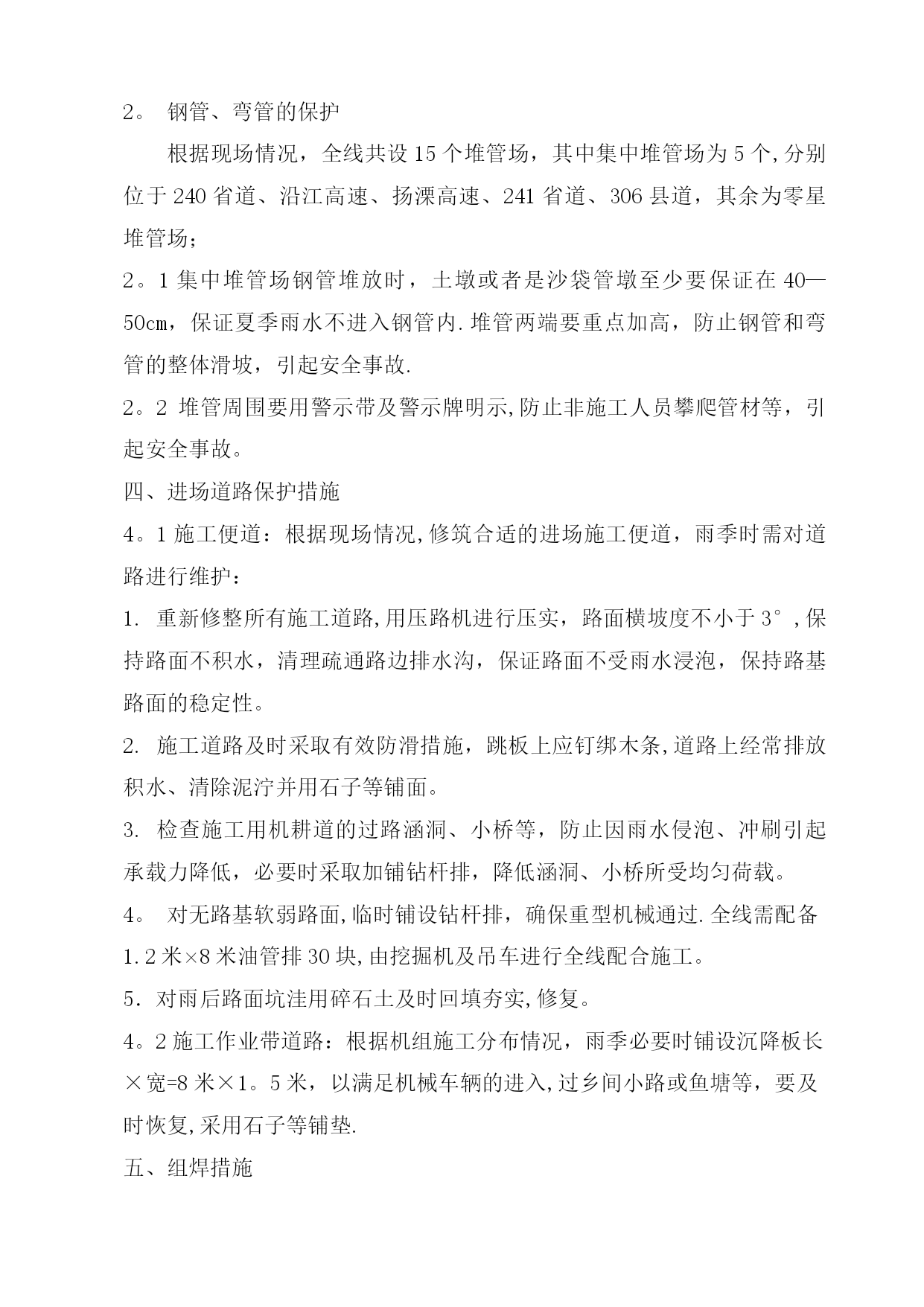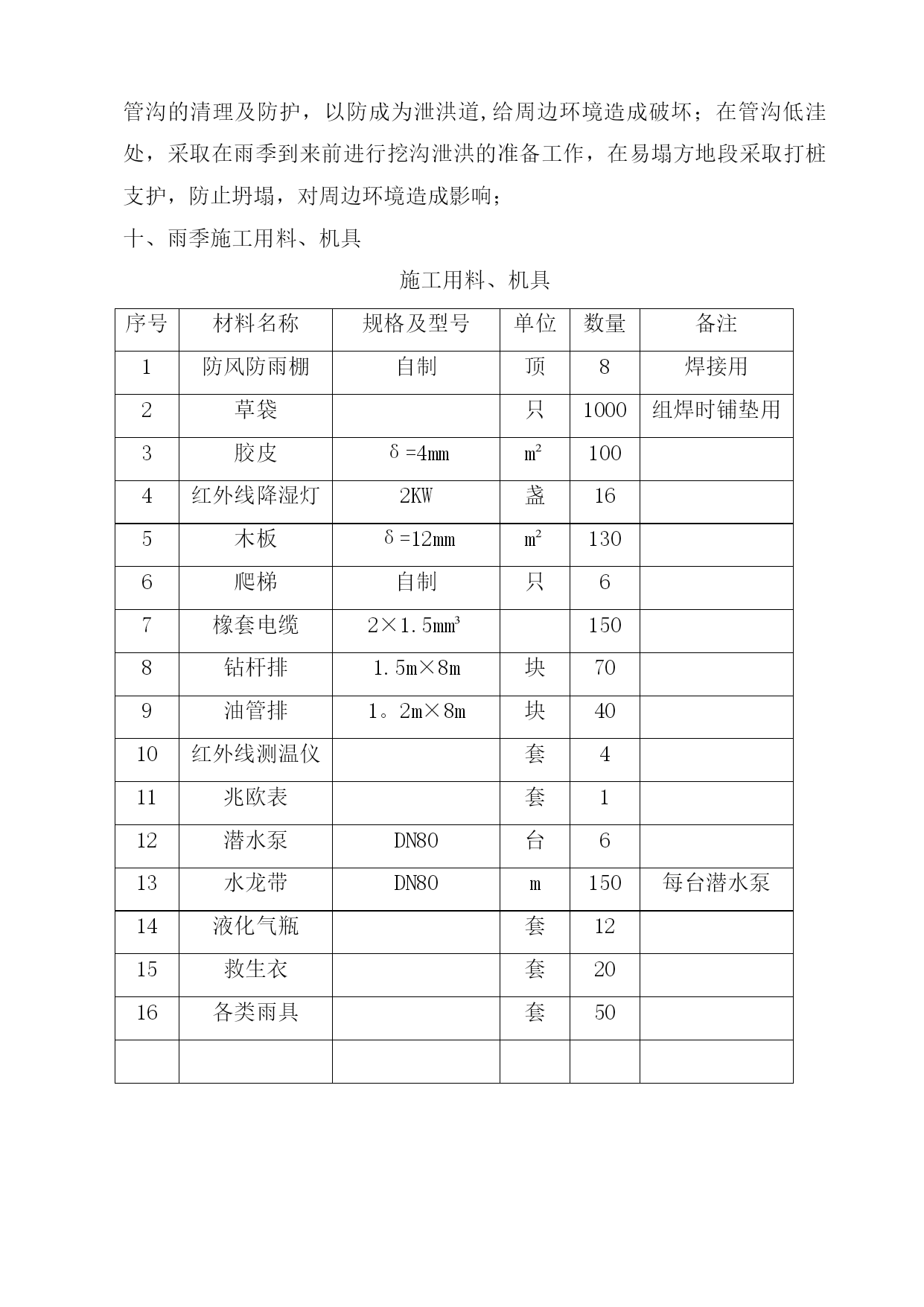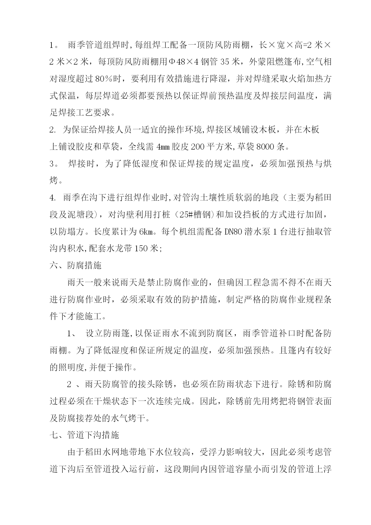 雨季施工方案41965实用文档(实用文档,可以直接使用,可编辑优秀版资料,欢迎下载)施工方案川气东送江苏配套管线一期工程金武管线工程二标段雨季施工方案编制人:审核人:审批人:编制单位:江苏石油勘探局油田建设处江苏项目部(盖章)2012年6月10日一、工程概况本工程自川气东送江苏配套管线工程薛埠分输站接出经金城镇、尧塘镇抵达S240,并沿S240西侧向南敷设至金坛市和宜兴市交界处,与川气东送江苏配套管线一期工程金武管道工程一标段相接.具体工作量包括线路安装34.645km,线路截断阀室2座,薛埠分输站扩建一座。设计压力6.3Mpa,设计管材¢610*11.9mm和¢610*9.5mm,管材成型方式为JCOE直缝双面埋弧焊钢管,材质为API5LL415(X60),采用3PE防腐。由于该段主体施工处于夏季,考虑在该地区地形、地质及气候条件下雨季施工难度较大,在稻田、河流由于雨季的到来常常诱发洪涝、管沟塌方等灾害,为保证工程优质、按期完工,特编制以下雨季施工措施。二、项目组织机构及施工人员劳动保护2.1项目组织机构项目执行经理:丁峰项目副经理:陈林、陈海泉项目总工程师:张峰技术质检室生产协调室HSE管理室综合管理室施工机组雨季施工管理人员及相关机构联系方式一览表序号姓名职务号码1丁峰项目执行经理2陈海泉项目副经理3陈林项目副经理4张峰技术总负责5徐会武外协经理6郭振林外协员7姜慧明外协员8范振东技术员9罗义刚技术员10李军材料员11王金兵安全员12刘国宝质检员14我部值班0519—825842852.2施工人员雨季劳动保护用品及用量见下表:序号工种劳保配置单位数量备注1管工分体雨衣、高腰防水劳保鞋套81套/人2电焊分体雨衣(防火)、高腰防水劳保鞋、皮围裙、胶皮手套套302套/人3操作手分体雨衣、高腰防水劳保鞋套101套/人4防腐工分体雨衣、高腰防水劳保鞋套101套/人5起重工分体雨衣、高腰防水劳保鞋(防滑)套21套/人三、雨季材料保管保护措施1。焊材的保管保护1。1焊材必须保管在通风干燥的仓库中,仓库配备2千瓦电热油灯一台,控制库房相对湿度不超过60%。1.2现场焊条需放在保温桶内,随用随取;更换药芯焊丝时,严禁焊条接触泥污。1.3当日回收焊条置于烘箱内保温,保温温度按焊条使用说明书执行。2。钢管、弯管的保护根据现场情况,全线共设15个堆管场,其中集中堆管场为5个,分别位于240省道、沿江高速、扬溧高速、241省道、306县道,其余为零星堆管场;2。1集中堆管场钢管堆放时,土墩或者是沙袋管墩至少要保证在40—50cm,保证夏季雨水不进入钢管内.堆管两端要重点加高,防止钢管和弯管的整体滑坡,引起安全事故.2。2堆管周围要用警示带及警示牌明示,防止非施工人员攀爬管材等,引起安全事故。四、进场道路保护措施4。1施工便道:根据现场情况,修筑合适的进场施工便道,雨季时需对道路进行维护:1.重新修整所有施工道路,用压路机进行压实,路面横坡度不小于3°,保持路面不积水,清理疏通路边排水沟,保证路面不受雨水浸泡,保持路基路面的稳定性。2.施工道路及时采取有效防滑措施,跳板上应钉绑木条,道路上经常排放积水、清除泥泞并用石子等铺面。3.检查施工用机耕道的过路涵洞、小桥等,防止因雨水侵泡、冲刷引起承载力降低,必要时采取加铺钻杆排,降低涵洞、小桥所受均匀荷载。4。对无路基软弱路面,临时铺设钻杆排,确保重型机械通过.全线需配备1.2米×8米油管排30块,由挖掘机及吊车进行全线配合施工。5.对雨后路面坑洼用碎石土及时回填夯实,修复。4。2施工作业带道路:根据机组施工分布情况,雨季必要时铺设沉降板长×宽=8米×1。5米,以满足机械车辆的进入,过乡间小路或鱼塘等,要及时恢复,采用石子等铺垫.五、组焊措施1。雨季管道组焊时,每组焊工配备一顶防风防雨棚,长×宽×高=2米×2米×2米,每顶防风防雨棚用Φ48×4钢管35米,外蒙阻燃篷布,空气相对湿度超过80%时,要利用有效措施进行降湿,并对焊缝采取火焰加热方式保温,每层焊道必须都要预热以保证焊前预热温度及焊接层间温度,满足焊接工艺要求。2.为保证给焊接人员一适宜的操作环境,焊接区域铺设木板,并在木板上铺设胶皮和草袋,全线需4mm胶皮200平方米,草袋8000条。3。焊接时,为了降低湿度和保证焊接的规定温度,必须加强预热与烘烤。4.雨季在沟下进行组焊作业时,对管沟土壤性质软弱的地段(主要为稻田段及泥塘段),对沟壁利用打桩(25#槽钢)和加设挡板的方式进行加固,以防塌方。长度累计为6km。每个机组需配备DN80潜水泵1台进行抽取管沟内积水,配套水龙带150米;