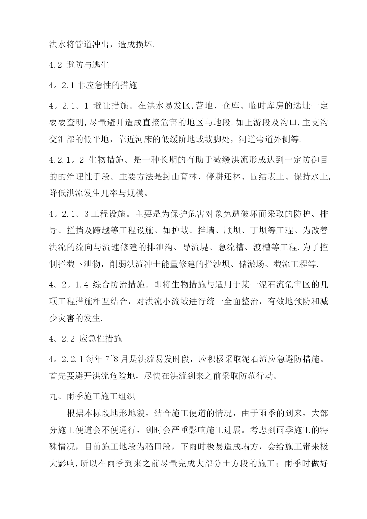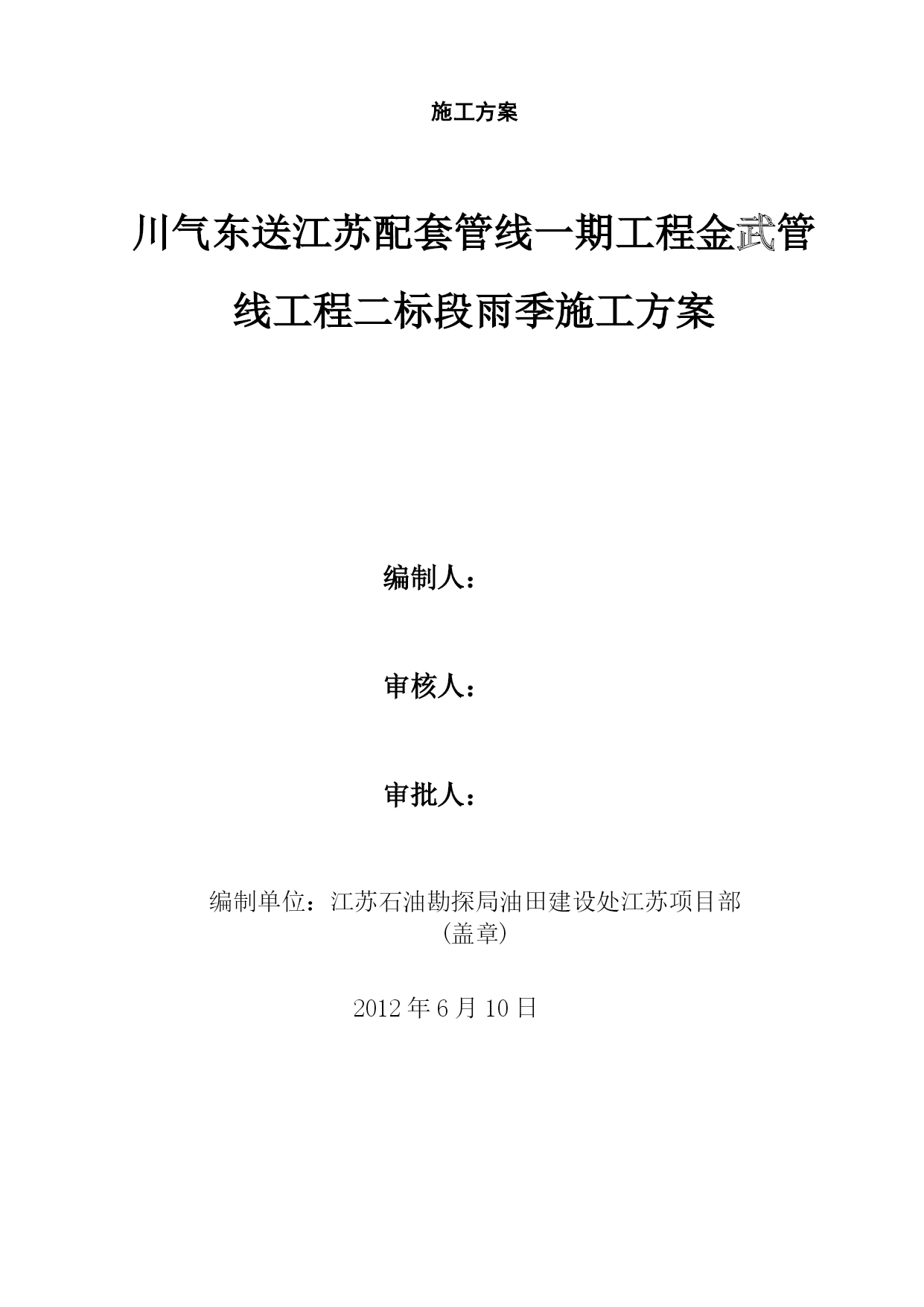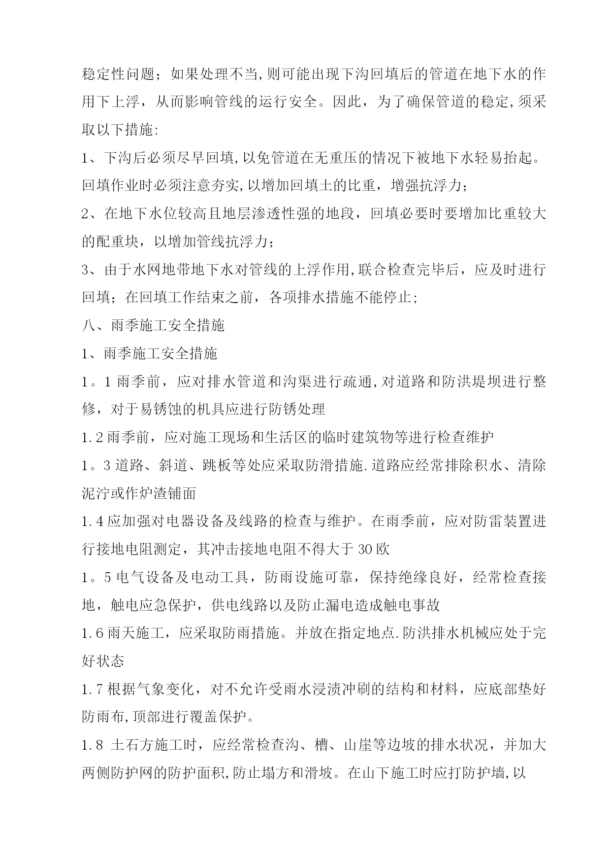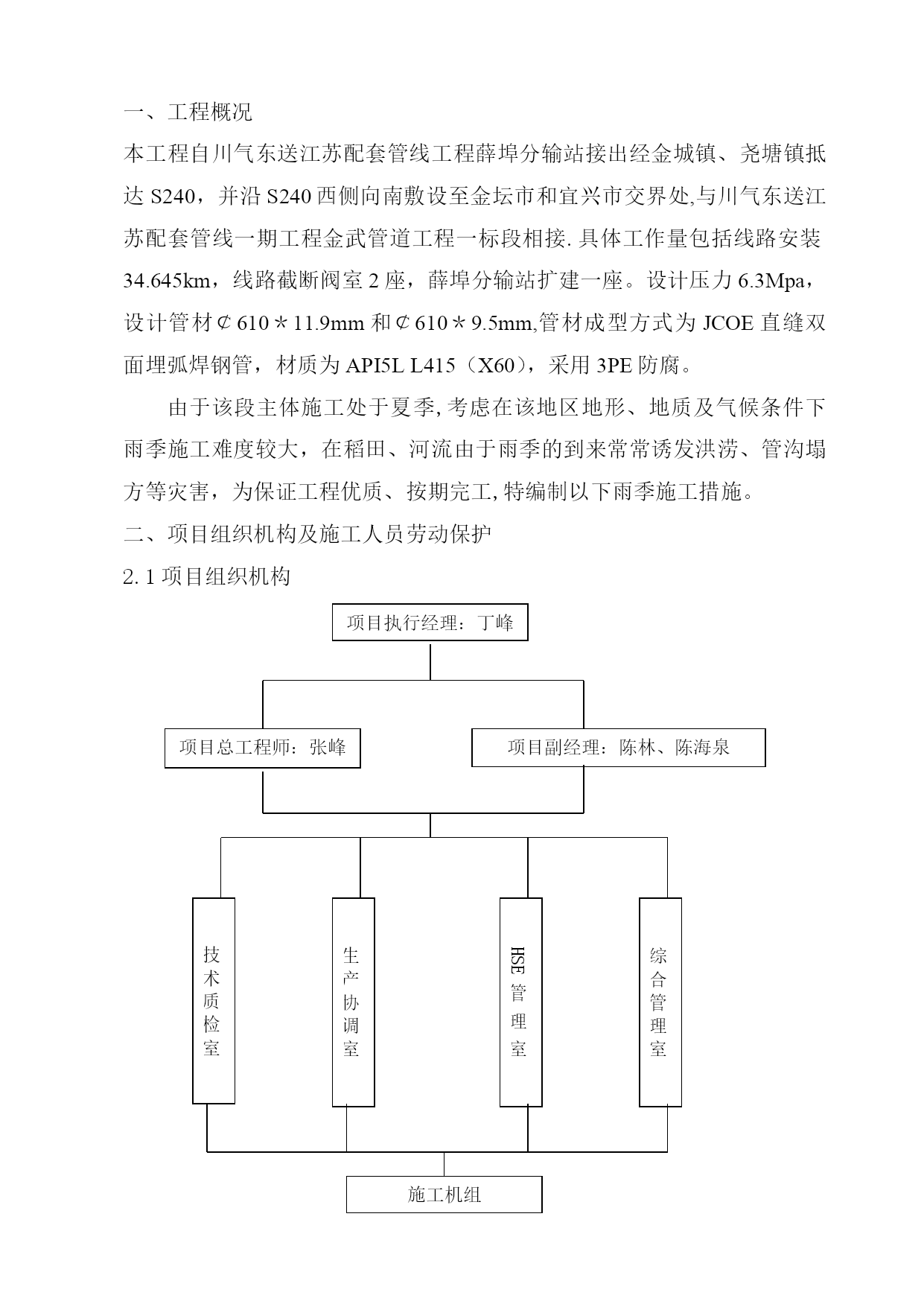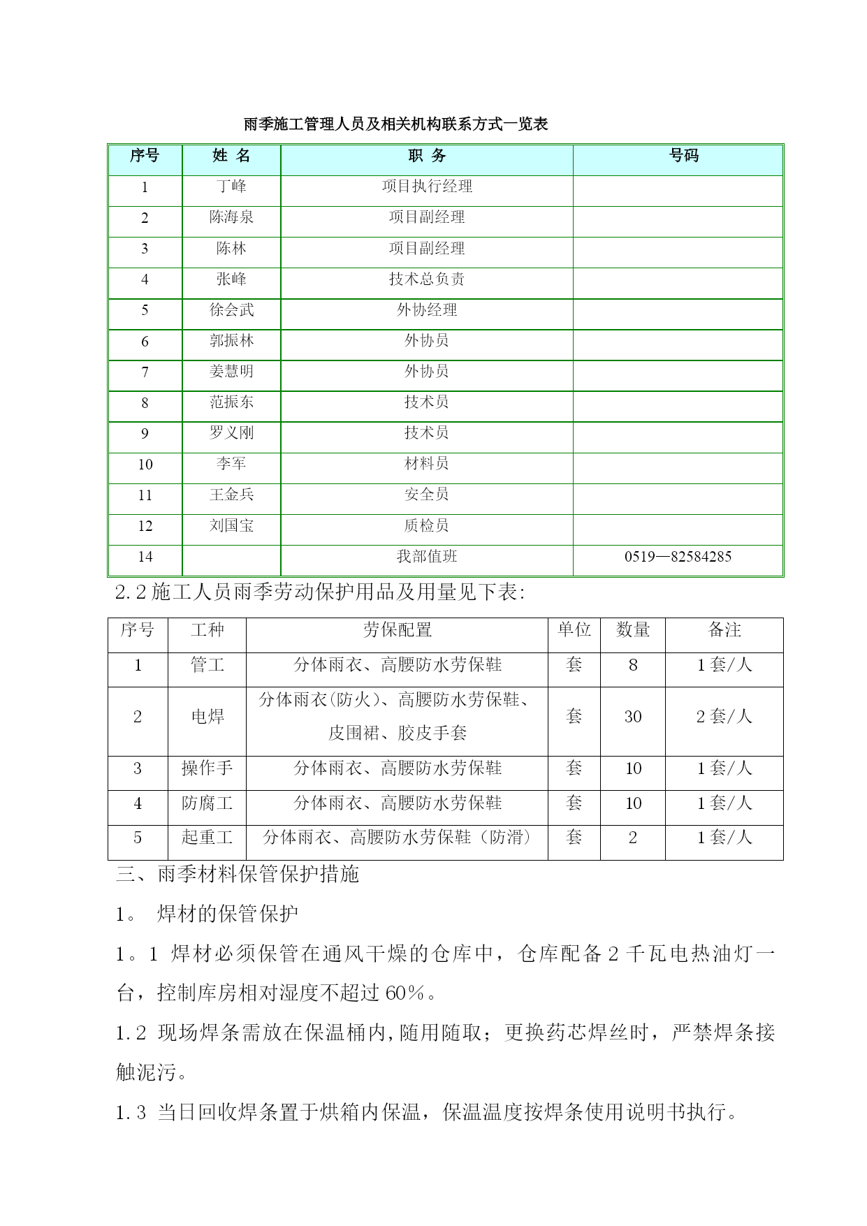 雨季施工方案41965实用文档(实用文档,可以直接使用,可编辑优秀版资料,欢迎下载)施工方案川气东送江苏配套管线一期工程金武管线工程二标段雨季施工方案编制人:审核人:审批人:编制单位:江苏石油勘探局油田建设处江苏项目部(盖章)2012年6月10日一、工程概况本工程自川气东送江苏配套管线工程薛埠分输站接出经金城镇、尧塘镇抵达S240,并沿S240西侧向南敷设至金坛市和宜兴市交界处,与川气东送江苏配套管线一期工程金武管道工程一标段相接.具体工作量包括线路安装34.645km,线路截断阀室2座,薛埠分输站扩建一座。设计压力6.3Mpa,设计管材¢610*11.9mm和¢610*9.5mm,管材成型方式为JCOE直缝双面埋弧焊钢管,材质为API5LL415(X60),采用3PE防腐。由于该段主体施工处于夏季,考虑在该地区地形、地质及气候条件下雨季施工难度较大,在稻田、河流由于雨季的到来常常诱发洪涝、管沟塌方等灾害,为保证工程优质、按期完工,特编制以下雨季施工措施。二、项目组织机构及施工人员劳动保护2.1项目组织机构项目执行经理:丁峰项目副经理:陈林、陈海泉项目总工程师:张峰技术质检室生产协调室HSE管理室综合管理室施工机组雨季施工管理人员及相关机构联系方式一览表序号姓名职务号码1丁峰项目执行经理2陈海泉项目副经理3陈林项目副经理4张峰技术总负责5徐会武外协经理6郭振林外协员7姜慧明外协员8范振东技术员9罗义刚技术员10李军材料员11王金兵安全员12刘国宝质检员14我部值班0519—825842852.2施工人员雨季劳动保护用品及用量见下表:序号工种劳保配置单位数量备注1管工分体雨衣、高腰防水劳保鞋套81套/人2电焊分体雨衣(防火)、高腰防水劳保鞋、皮围裙、胶皮手套套302套/人3操作手分体雨衣、高腰防水劳保鞋套101套/人4防腐工分体雨衣、高腰防水劳保鞋套101套/人5起重工分体雨衣、高腰防水劳保鞋(防滑)套21套/人三、雨季材料保管保护措施1。焊材的保管保护1。1焊材必须保管在通风干燥的仓库中,仓库配备2千瓦电热油灯一台,控制库房相对湿度不超过60%。1.2现场焊条需放在保温桶内,随用随取;更换药芯焊丝时,严禁焊条接触泥污。1.3当日回收焊条置于烘箱内保温,保温温度按焊条使用说明书执行。2。钢管、弯管的保护根据现场情况,全线共设15个堆管场,其中集中堆管场为5个,分别位于240省道、沿江高速、扬溧高速、241省道、306县道,其余为零星堆管场;2。1集中堆管场钢管堆放时,土墩或者是沙袋管墩至少要保证在40—50cm,保证夏季雨水不进入钢管内.堆管两端要重点加高,防止钢管和弯管的整体滑坡,引起安全事故.2。2堆管周围要用警示带及警示牌明示,防止非施工人员攀爬管材等,引起安全事故。四、进场道路保护措施4。1施工便道:根据现场情况,修筑合适的进场施工便道,雨季时需对道路进行维护:1.重新修整所有施工道路,用压路机进行压实,路面横坡度不小于3°,保持路面不积水,清理疏通路边排水沟,保证路面不受雨水浸泡,保持路基路面的稳定性。2.施工道路及时采取有效防滑措施,跳板上应钉绑木条,道路上经常排放积水、清除泥泞并用石子等铺面。3.检查施工用机耕道的过路涵洞、小桥等,防止因雨水侵泡、冲刷引起承载力降低,必要时采取加铺钻杆排,降低涵洞、小桥所受均匀荷载。4。对无路基软弱路面,临时铺设钻杆排,确保重型机械通过.全线需配备1.2米×8米油管排30块,由挖掘机及吊车进行全线配合施工。5.对雨后路面坑洼用碎石土及时回填夯实,修复。4。2施工作业带道路:根据机组施工分布情况,雨季必要时铺设沉降板长×宽=8米×1。5米,以满足机械车辆的进入,过乡间小路或鱼塘等,要及时恢复,采用石子等铺垫.五、组焊措施1。雨季管道组焊时,每组焊工配备一顶防风防雨棚,长×宽×高=2米×2米×2米,每顶防风防雨棚用Φ48×4钢管35米,外蒙阻燃篷布,空气相对湿度超过80%时,要利用有效措施进行降湿,并对焊缝采取火焰加热方式保温,每层焊道必须都要预热以保证焊前预热温度及焊接层间温度,满足焊接工艺要求。2.为保证给焊接人员一适宜的操作环境,焊接区域铺设木板,并在木板上铺设胶皮和草袋,全线需4mm胶皮200平方米,草袋8000条。3。焊接时,为了降低湿度和保证焊接的规定温度,必须加强预热与烘烤。4.雨季在沟下进行组焊作业时,对管沟土壤性质软弱的地段(主要为稻田段及泥塘段),对沟壁利用打桩(25#槽钢)和加设挡板的方式进行加固,以防塌方。长度累计为6km。每个机组需配备DN80潜水泵1台进行抽取管沟内积水,配套水龙带150米;