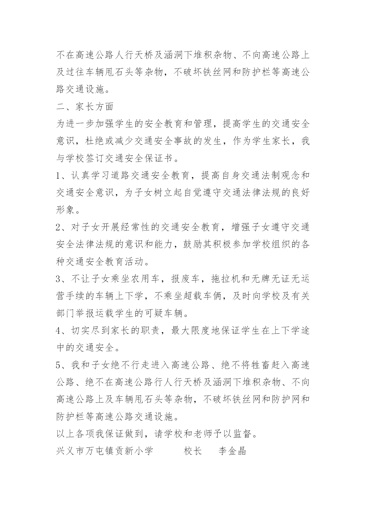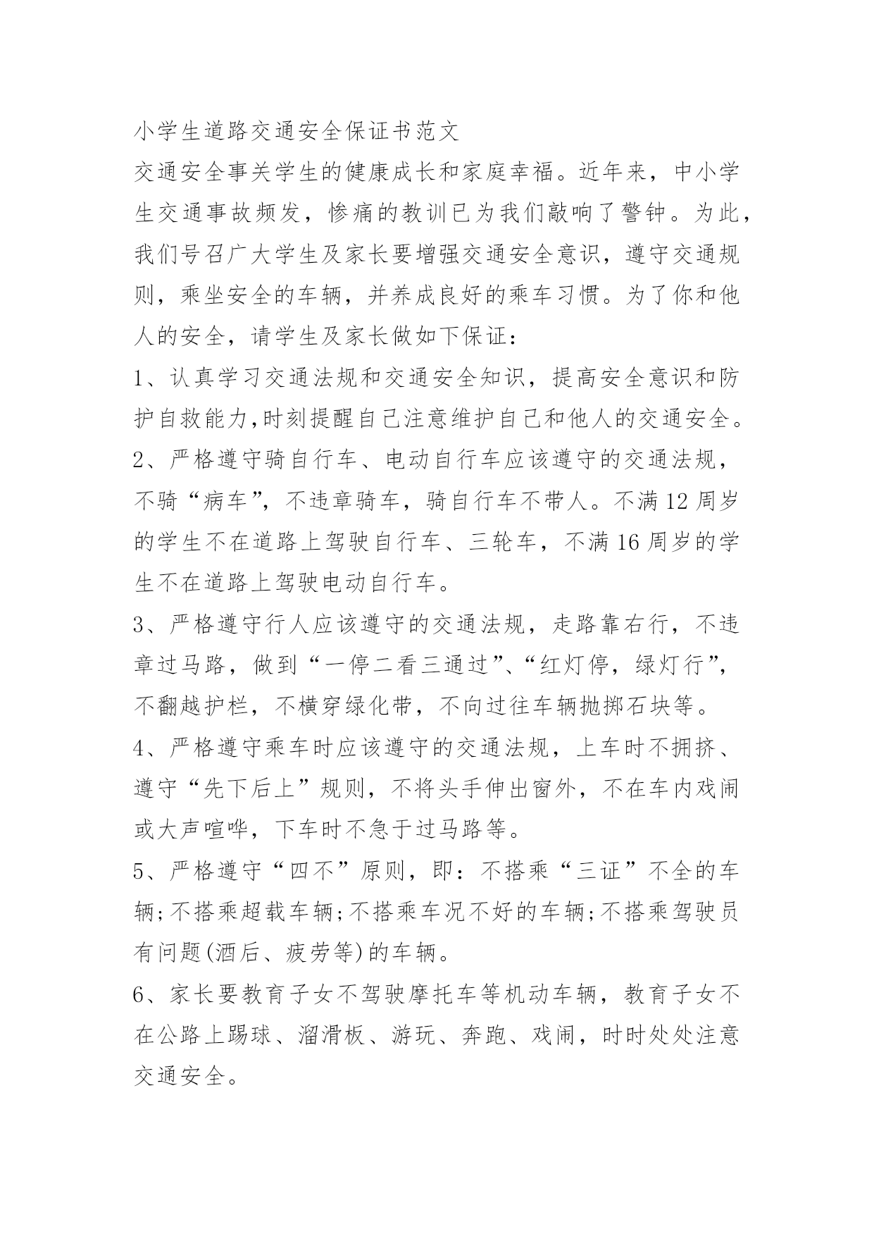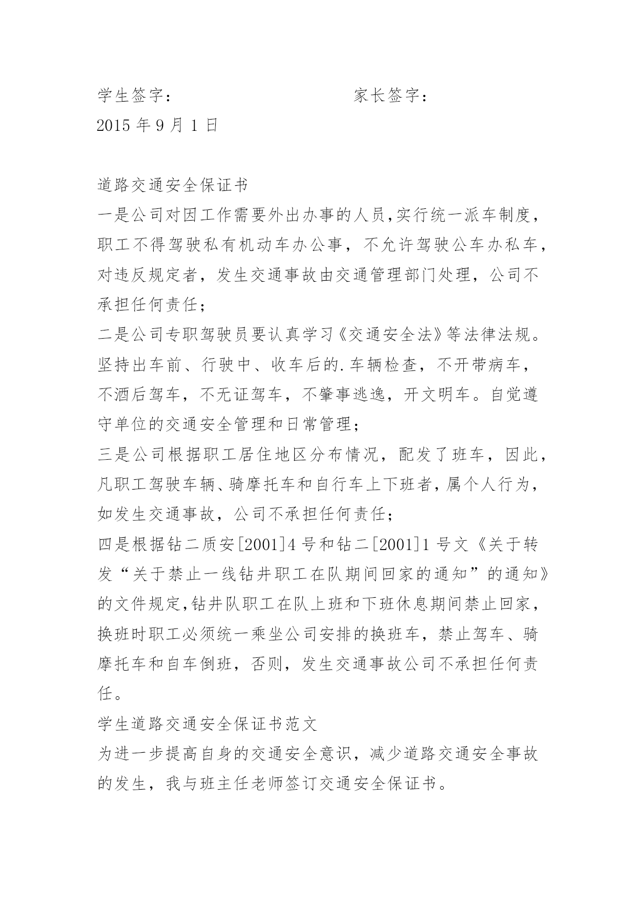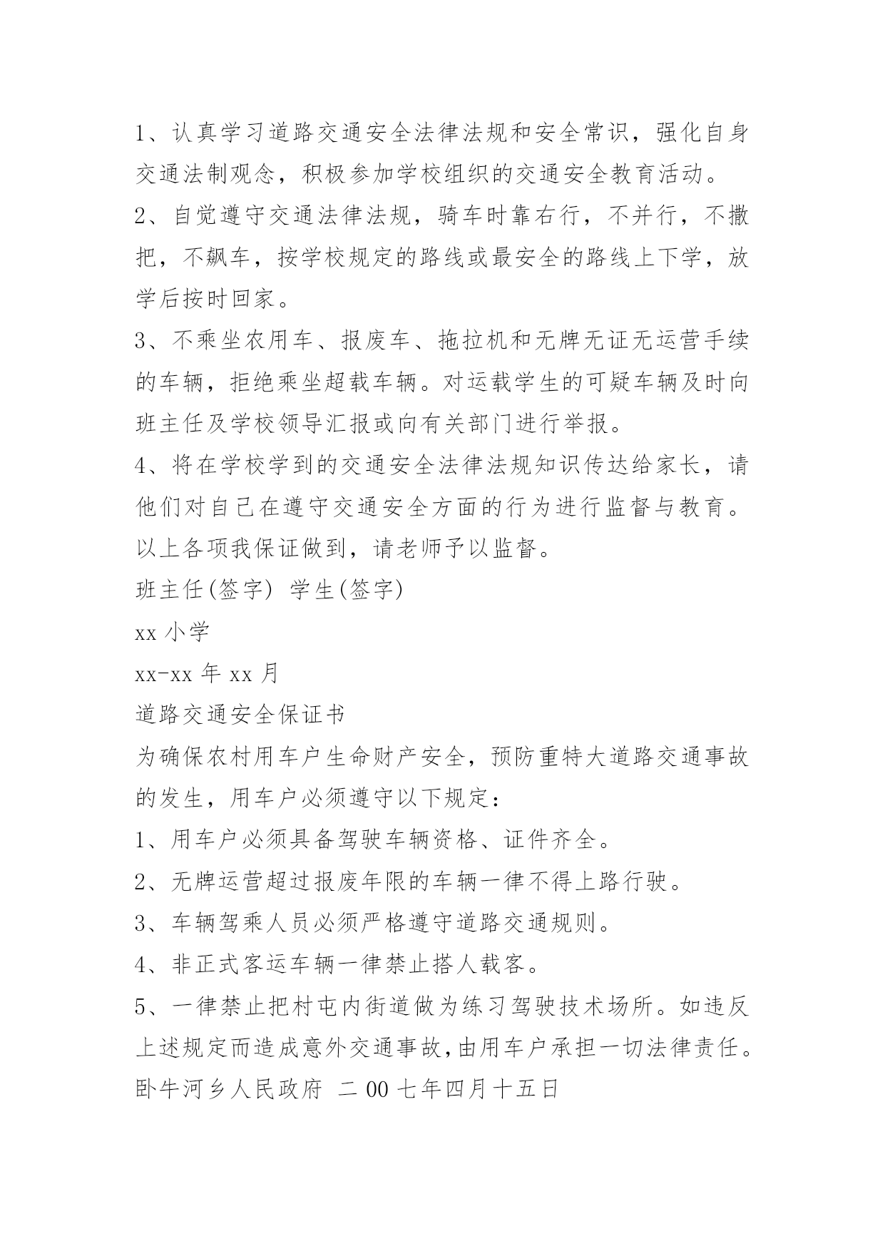 道路交通安全保证书道路交通安全保证书为进一步增强广大师生交通安全意识,预发和减少学生交通事故的发生,根据黔西南州公安局、教育局,兴义市公安局的文件精神,结合我校实际,特制作该保证书。一、学生方面:为进一步提高自身的交通安全意识,减少交通安全事故的发生,我坚决响应学校“关爱生命、文明乘车、安全出行”的号召,自觉遵守,并大力向家人宣布交通规则,我保证做到:1、认真学习交通知识,积极参加学校组织的交通安全教育活动,自觉遵守交通法律法规;2、坚决拒坐“三轮车、三无车、超载车、报废车,拖拉机和无牌无证无营运手续的车辆”等不符合安全规范的车辆;对运载学生的可疑车辆及时向班主任及学校领导汇报或向有关部门进行举报。3、路途中坚决做到“一躲避、二靠边、三观望、四通过”的原则;按学校规定的路线或最安全的路线上下学,放学后按时回家。4、将在学校学到的交通安全法律法规知识传达给家长,请他们对自己在遵守交通安全方面的行为进行监督与教育。5、不在公路上嬉戏打闹、不互相追逐,无驾驶证、行车证绝不骑摩托车。6、绝不行走进入高速公路、绝不将畜牧赶入高速公路、绝不在高速公路人行天桥及涵洞下堆积杂物、不向高速公路上及过往车辆甩石头等杂物,不破坏铁丝网和防护栏等高速公路交通设施。二、家长方面为进一步加强学生的安全教育和管理,提高学生的交通安全意识,杜绝或减少交通安全事故的发生,作为学生家长,我与学校签订交通安全保证书。1、认真学习道路交通安全教育,提高自身交通法制观念和交通安全意识,为子女树立起自觉遵守交通法律法规的良好形象。2、对子女开展经常性的交通安全教育,增强子女遵守交通安全法律法规的意识和能力,鼓励其积极参加学校组织的各种交通安全教育活动。3、不让子女乘坐农用车,报废车,拖拉机和无牌无证无运营手续的车辆上下学,不乘坐超载车俩,及时向学校及有关部门举报运载学生的可疑车辆。4、切实尽到家长的职责,最大限度地保证学生在上下学途中的交通安全。5、我和子女绝不行走进入高速公路、绝不将牲畜赶入高速公路、绝不在高速公路行人行天桥及涵洞下堆积杂物、不向高速公路上及车辆甩石头等杂物,不破坏铁丝网和防护网和防护栏等高速公路交通设施。以上各项我保证做到,请学校和老师予以监督。兴义市万屯镇贡新小学校长李金晶学生签字:家长签字:2015年9月1日道路交通安全保证书一是公司对因工作需要外出办事的人员,实行统一派车制度,职工不得驾驶私有机动车办公事,不允许驾驶公车办私车,对违反规定者,发生交通事故由交通管理部门处理,公司不承担任何责任;二是公司专职驾驶员要认真学习《交通安全法》等法律法规。坚持出车前、行驶中、收车后的.车辆检查,不开带病车,不酒后驾车,不无证驾车,不肇事逃逸,开文明车。自觉遵守单位的交通安全管理和日常管理;三是公司根据职工居住地区分布情况,配发了班车,因此,凡职工驾驶车辆、骑摩托车和自行车上下班者,属个人行为,如发生交通事故,公司不承担任何责任;四是根据钻二质安[2001]4号和钻二[2001]1号文《关于转发“关于禁止一线钻井职工在队期间回家的通知”的通知》的文件规定,钻井队职工在队上班和下班休息期间禁止回家,换班时职工必须统一乘坐公司安排的换班车,禁止驾车、骑摩托车和自车倒班,否则,发生交通事故公司不承担任何责任。学生道路交通安全保证书范文为进一步提高自身的交通安全意识,减少道路交通安全事故的发生,我与班主任老师签订交通安全保证书。1、认真学习道路交通安全法律法规和安全常识,强化自身交通法制观念,积极参加学校组织的交通安全教育活动。2、自觉遵守交通法律法规,骑车时靠右行,不并行,不撒把,不飙车,按学校规定的路线或最安全的路线上下学,放学后按时回家。3、不乘坐农用车、报废车、拖拉机和无牌无证无运营手续的车辆,拒绝乘坐超载车辆。对运载学生的可疑车辆及时向班主任及学校领导汇报或向有关部门进行举报。4、将在学校学到的交通安全法律法规知识传达给家长,请他们对自己在遵守交通安全方面的行为进行监督与教育。以上各项我保证做到,请老师予以监督。班主任(签字)学生(签字)xx小学xx-xx年xx月道路交通安全保证书为确保农村用车户生命财产安全,预防重特大道路交通事故的发生,用车户必须遵守以下规定:1、用车户必须具备驾驶车辆资格、证件齐全。2、无牌运营超过报废年限的车辆一律不得上路行驶。3、车辆驾乘人员必须严格遵守道路交通规则。4、非正式客运车辆一律禁止搭人载客。5、一律禁止把村屯内街道做为练习驾驶技术场所。如违反上述规定而造成意外交通事故,由用车户承担一切法律责任。卧牛河乡人民政府二00七年四月十五日小学生道路交通安全保证书范文交通安全事关学生的健康成长和家庭幸福。近年来,中小学生交通事故频发,惨痛的教训已为我们敲响了警钟。为此,我们号召广大学生及家长要增强交通安全意识,遵守交通规则