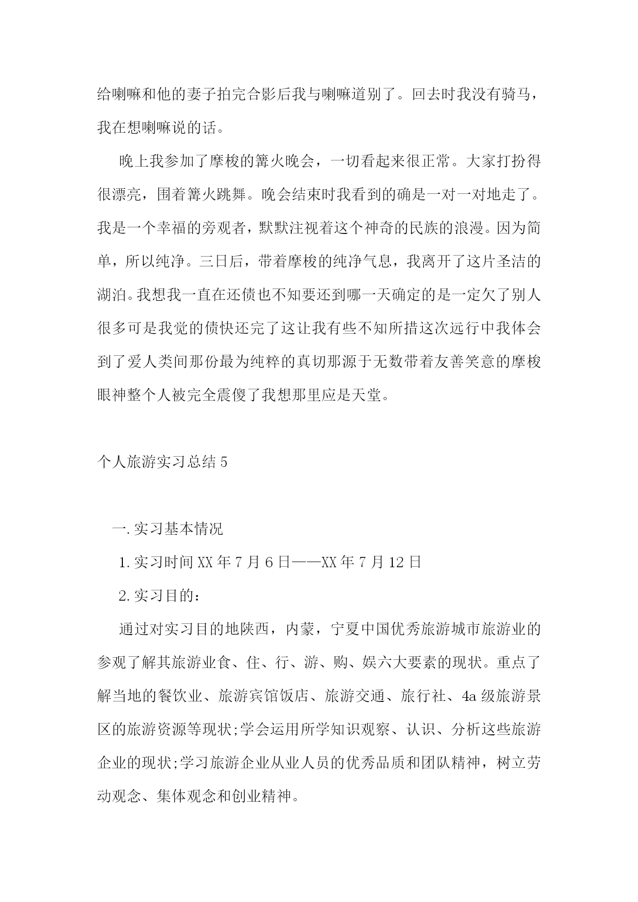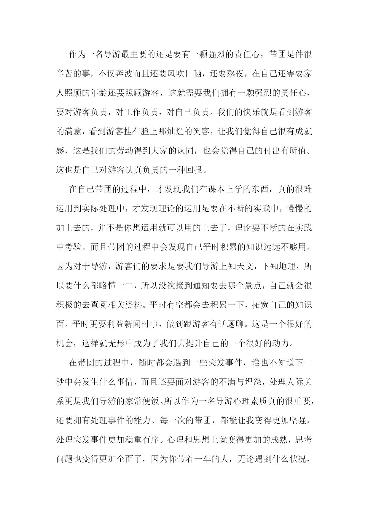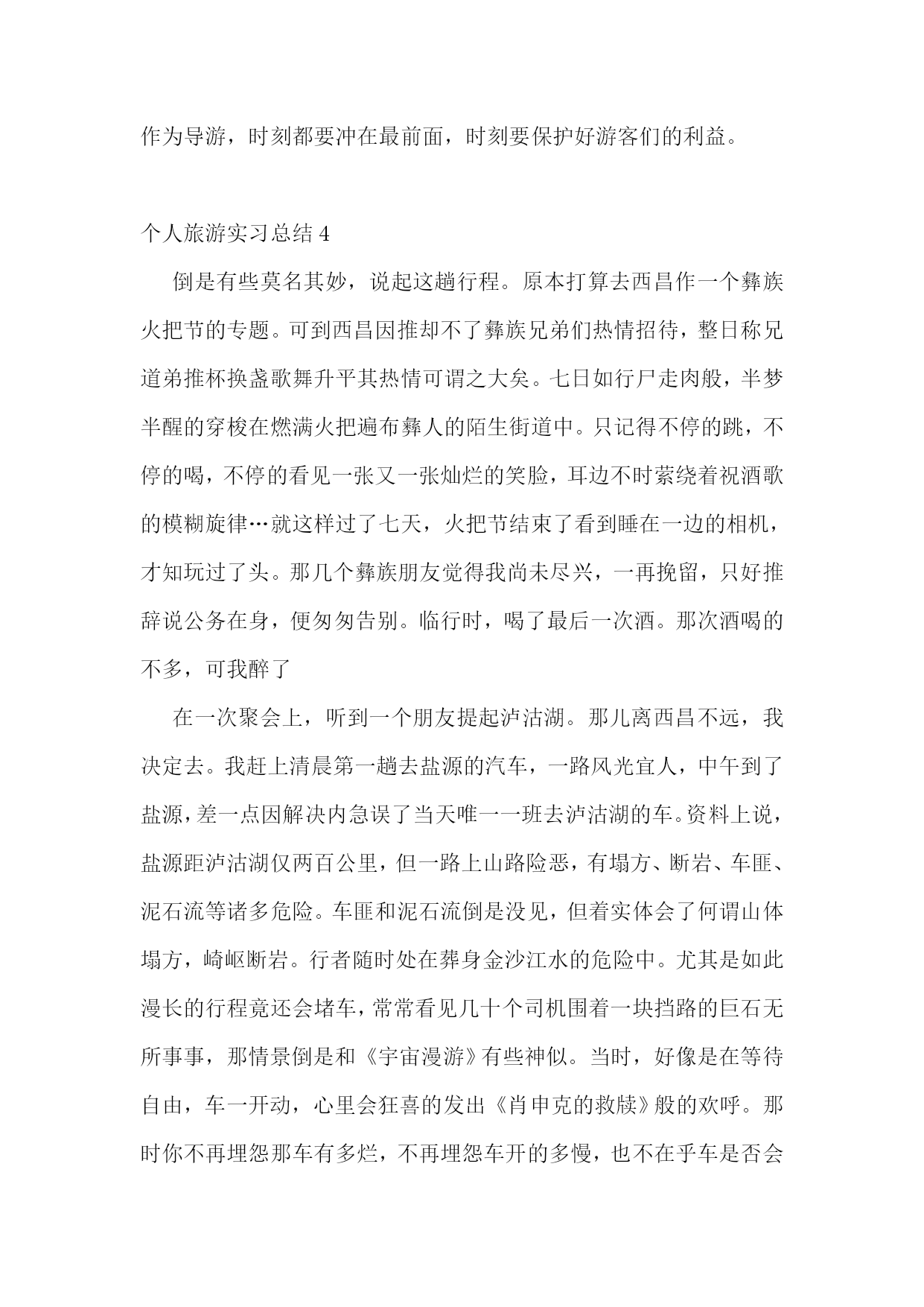 个人旅游实习总结个人旅游实习总结2作为一名导游,无论是心理上还是生理上都要承受着巨大的压力。心理上,每天要面对着不同人,要学会处理游客,司机,地陪等的关系,当出现点小差错,要面对着游客的不满与埋怨,要学会承受这种压力,又要表现出很坚强,要耐心周到细致的跟游客解释,要满足游客的每一个合理的要求。生理上,每天奔波,风吹日晒,又要不断的讲解,照顾客人,为游客的门票,吃饭,睡觉而跑完跑去,有时候要整理账目,或者有游客遗留下来的小问题要处理,加上一定的心理压力,睡眠不足等等。导游是非常的辛苦,而且工资导游补贴又低,加上不为人所理解,所以导游的流动性也是很大的。这次的实习,让我体会深刻。在旅行社的实习过程中,自己在实践中得到了很大程度上的锻炼,也让自己有机会将所学到的旅游管理方面的理论和知识运用大实践中,与实践进行了比较,学习和运用。也让自己学到了很多书本上没有的东西,学会了如何处理复杂的不同层面的人际关系,学会了如何处理突发事故,自己的责任心变得更加的强烈了。也给自己一个很大的动力去拓展知识面。这次的导游实习让我变得更加坚强了,在实习的过程中遇到了很多的困难,也很辛苦,但是很高兴自己还是坚持了下来,这将会是我大学生活里难忘的经历,是人生的一笔财富。个人旅游实习总结3作为一名导游最主要的还是要有一颗强烈的责任心,带团是件很辛苦的事,不仅奔波而且还要风吹日晒,还要熬夜,在自己还需要家人照顾的年龄还要照顾游客,这就需要我们拥有一颗强烈的责任心,要对游客负责,对工作负责,对自己负责。我们的快乐就是看到游客的满意,看到游客挂在脸上那灿烂的笑容,让我们觉得自己很有成就感,这是我们的劳动得到大家的认同,也会觉得自己的付出有所值。这也是自己对游客认真负责的一种回报。在自己带团的过程中,才发现我们在课本上学的东西,真的很难运用到实际处理中,才发现理论的运用是要在不断的实践中,慢慢的加上去的,并不是你想运用就可以用的上去了,理论要不断的在实践中考验。而且带团的过程中会发现自己平时积累的知识远远不够用。因为对于导游,游客们的要求是要我们导游上知天文,下知地理,所以要什么都略懂一二,所以没次接到通知要去哪个景点,自己就会很积极的去查阅相关资料。平时有空都会去积累一下,拓宽自己的知识面。平时更要利益新闻时事,做到跟游客有话题聊。这是一个很好的机会,这样就无形中成为了我们去提升自己的一个很好的动力。在带团的过程中,随时都会遇到一些突发事件,谁也不知道下一秒中会发生什么事情,而且还要面对游客的不满与埋怨,处理人际关系更是我们导游的家常便饭。所以作为一名导游心理素质真的很重要,还要拥有处理事件的能力。每一次的带团,都能让我变得更加坚强,处理突发事件更加稳重有序。心理和思想上就变得更加的成熟,思考问题也变得更加全面了,因为你带着一车的人,无论遇到什么状况,作为导游,时刻都要冲在最前面,时刻要保护好游客们的利益。个人旅游实习总结4倒是有些莫名其妙,说起这趟行程。原本打算去西昌作一个彝族火把节的专题。可到西昌因推却不了彝族兄弟们热情招待,整日称兄道弟推杯换盏歌舞升平其热情可谓之大矣。七日如行尸走肉般,半梦半醒的穿梭在燃满火把遍布彝人的陌生街道中。只记得不停的跳,不停的喝,不停的看见一张又一张灿烂的笑脸,耳边不时萦绕着祝酒歌的模糊旋律…就这样过了七天,火把节结束了看到睡在一边的相机,才知玩过了头。那几个彝族朋友觉得我尚未尽兴,一再挽留,只好推辞说公务在身,便匆匆告别。临行时,喝了最后一次酒。那次酒喝的不多,可我醉了在一次聚会上,听到一个朋友提起泸沽湖。那儿离西昌不远,我决定去。我赶上清晨第一趟去盐源的汽车,一路风光宜人,中午到了盐源,差一点因解决内急误了当天唯一一班去泸沽湖的车。资料上说,盐源距泸沽湖仅两百公里,但一路上山路险恶,有塌方、断岩、车匪、泥石流等诸多危险。车匪和泥石流倒是没见,但着实体会了何谓山体塌方,崎岖断岩。行者随时处在葬身金沙江水的危险中。尤其是如此漫长的行程竟还会堵车,常常看见几十个司机围着一块挡路的巨石无所事事,那情景倒是和《宇宙漫游》有些神似。当时,好像是在等待自由,车一开动,心里会狂喜的发出《肖申克的救牍》般的欢呼。那时你不再埋怨那车有多烂,不再埋怨车开的多慢,也不在乎车是否会有翻下山崖喂鱼的可能。你会欣然的继续享受五脏六腑被颠错位置的漫漫路途,你会满心欢喜的看着身边的摩梭人探出窗外把马路涂得一塌糊涂。山崖上不时出现的小瀑布会把你从梦中惊醒,你觉得那都是幸福。天色渐渐暗了,车在漆黑的凉山山脉上盘旋着。那晚居然看到了满天的星,那情景很久没见过了,眼前渐渐看到了零星的灯光。在历经16小时的难忘行程之后,我到了泸沽湖镇。对镇子的印象不是很清晰了。只记得那个镇子很小,没什么灯火,随便找了一家旅馆,我一头倒在床上直到第二天中午才醒,醒