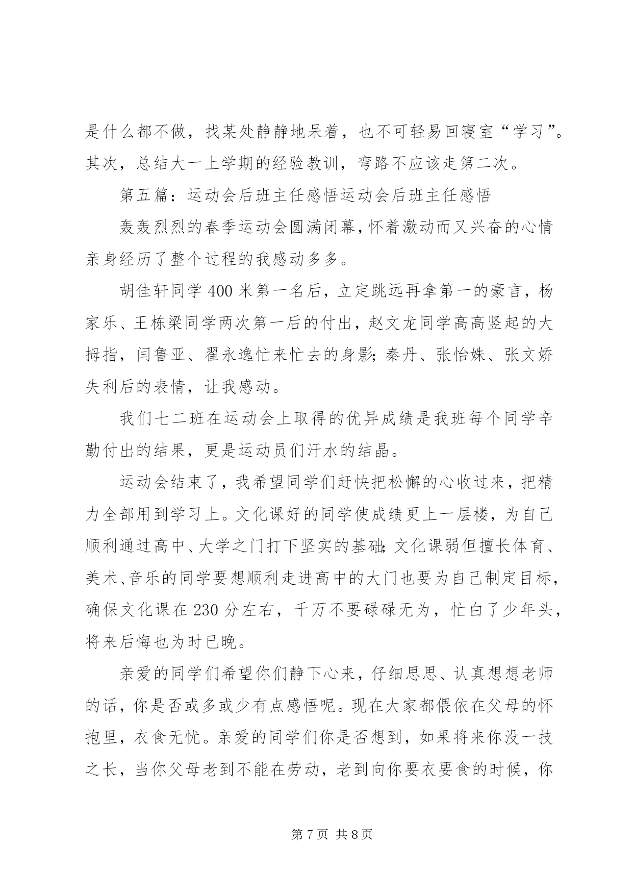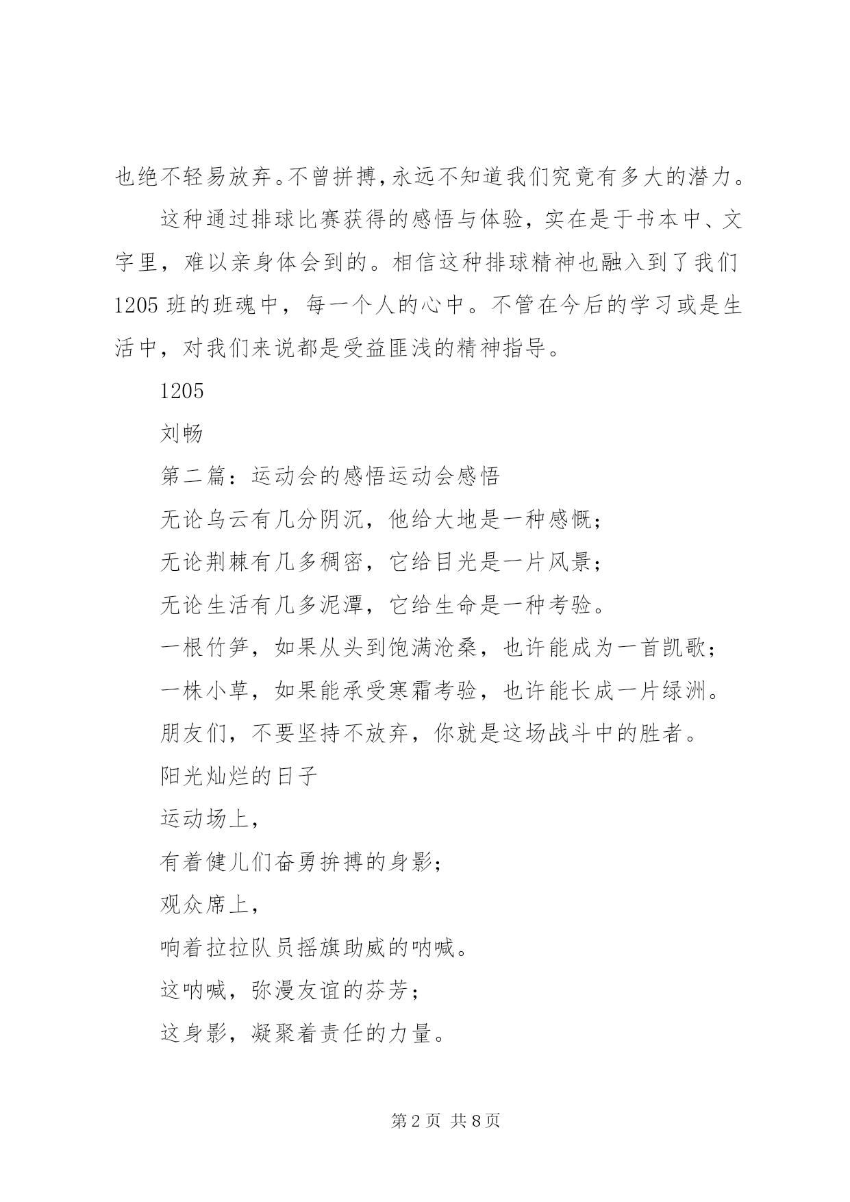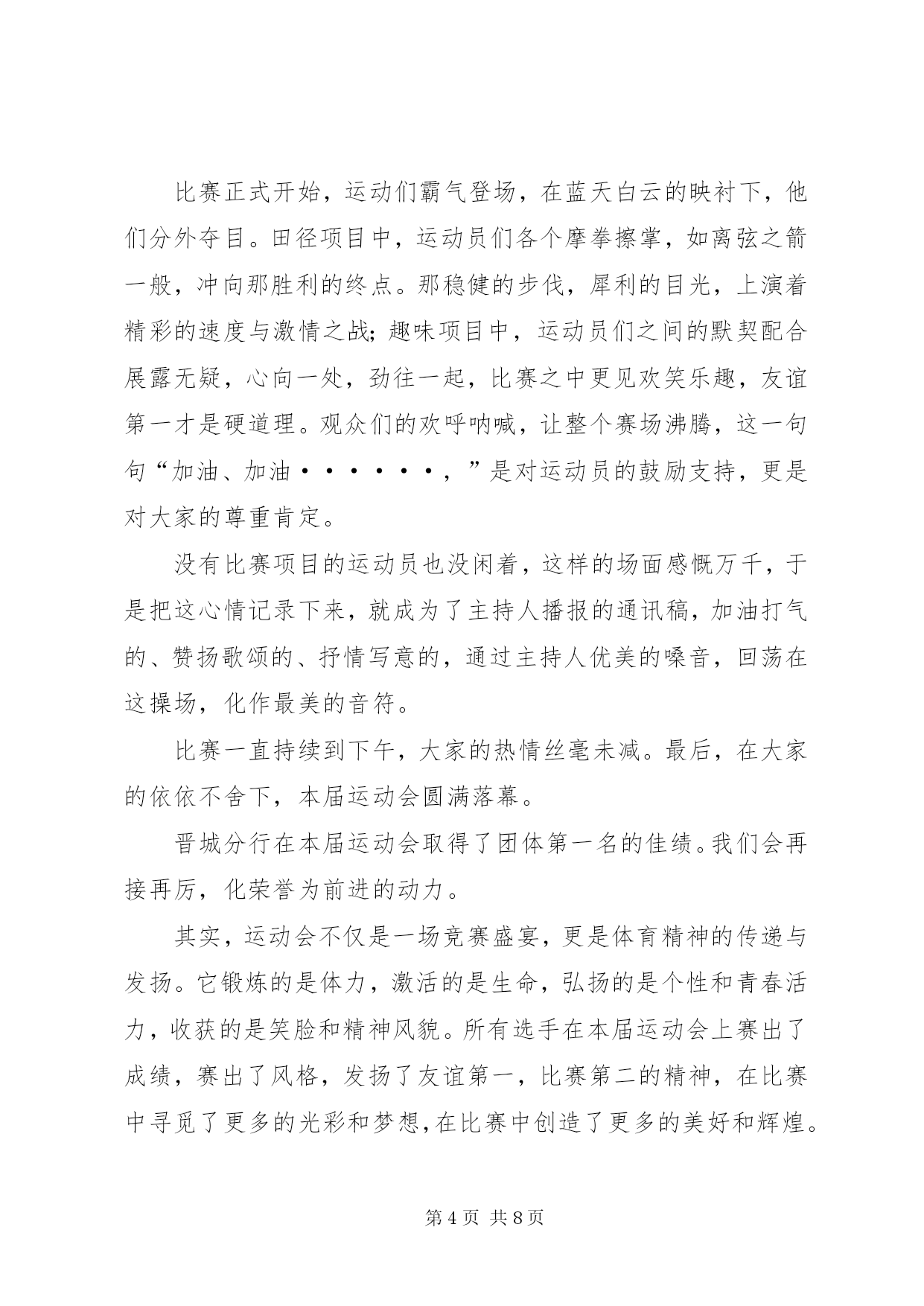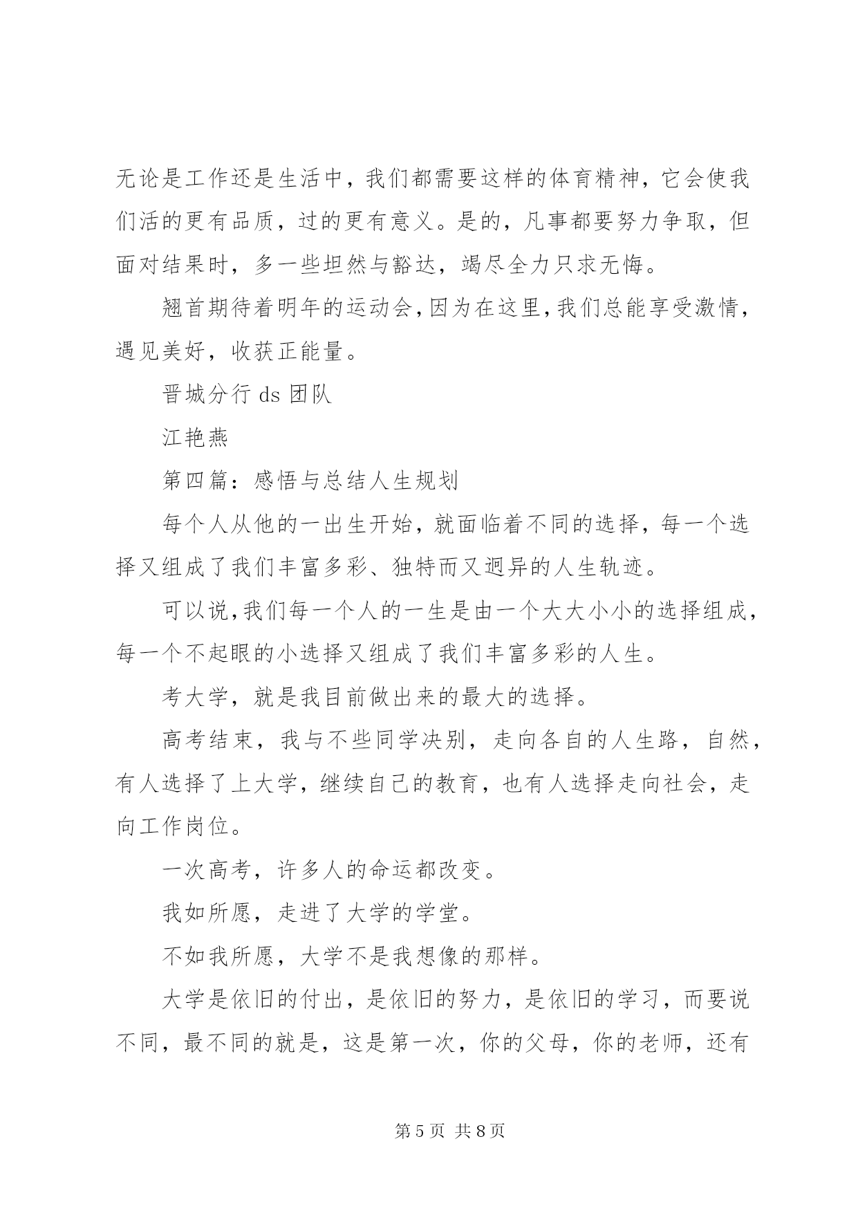 第PAGE\*Arabic\*MERGEFORMAT8页共NUMPAGES\*MERGEFORMAT8页运动会的感悟与总结当初听到要举行排球比赛的消息时,我们班上的同学都笑着打趣儿说,不用跟我们争倒数第一,我们势在必得。没错,因为我们班只有7位男同学,这跟理科班30多名甚至40几名男生的数量比起来实在悬殊过大,因此不免有些感慨担忧,只好以此打趣。嘴上虽然这么说,但是我们不曾真的消极的坐以待毙,抱着无所谓的看客的态度,相反,正因为我们深知男生数量很少,因此更是加倍努力练习。无论男生女生,都投入十二分的认真与热情,努力提高球技。从当初的连发球过网都十分困难,到最后甚至能形成一定战术,相互配合,顽强反击。这与排球队员们的努力是分不开的。请看看他们头上豆大的汗珠,请看看他们手腕上鲜红的印记,请看看他们执着的目光,请看看他们坚定地步伐。是这种不服输的精神,是这种对自己的挑战,是这种强烈的集体荣誉感,最终使我们1205班过关斩将,杀入四强。有人说感慨我们班真是幸运,错,这不是幸运,这叫——实力。1205班新组建不久就参加了这次排球比赛,是这次排球比赛真正的让我们这个刚刚建立的新的大家庭紧紧联系在一起,我们从这次排球比赛中看到的不只是最后这项令我们倍感骄傲的荣誉,我们更多的是看到原来只要我们凝成一股力,再大的困难我们都可以一起克服,只要我们去奋斗,一定会有得。即使弱小,也绝不轻易放弃。不曾拼搏,永远不知道我们究竟有多大的潜力。这种通过排球比赛获得的感悟与体验,实在是于书本中、文字里,难以亲身体会到的。相信这种排球精神也融入到了我们1205班的班魂中,每一个人的心中。不管在今后的学习或是生活中,对我们来说都是受益匪浅的精神指导。1205刘畅第二篇:运动会的感悟运动会感悟无论乌云有几分阴沉,他给大地是一种感慨;无论荆棘有几多稠密,它给目光是一片风景;无论生活有几多泥潭,它给生命是一种考验。一根竹笋,如果从头到饱满沧桑,也许能成为一首凯歌;一株小草,如果能承受寒霜考验,也许能长成一片绿洲。朋友们,不要坚持不放弃,你就是这场战斗中的胜者。阳光灿烂的日子运动场上,有着健儿们奋勇拚搏的身影;观众席上,响着拉拉队员摇旗助威的呐喊。这呐喊,弥漫友谊的芬芳;这身影,凝聚着责任的力量。但无论成功或是失败,无论欢笑或是泪水,我们永远铭记,这充满奋斗的日子。第三篇:运动会感悟运动会感悟九月的蓝天,九月的阳光,一个多姿多彩的九月,一个灿烂明媚的九月。——题记伴随着习习秋风,我们迎来了一年一度的招商银行太原分行秋季运动会。晋城分行全体员工作为这个大家庭中的一员,每个人的心情自然是分外激动。从前期认真严密的筹备:包括队形口号的编排、运动员的训练、运动会服装道具的采购,到运动会开幕当天大家的兴奋紧张,我们从未停止感受本届运动会带给我们的激情活力。2013年9月28号,在这艳阳高照的日子里,运动会开幕式拉开帷幕。看,整齐的步伐;听,响亮的口号。各分行代表队绕场一周,尽情挥洒着自信与风采。为本届运动会提祝贺词,太原分行行长王月光宣布运动会开幕。接着是拉拉队的精彩表演,绿色的草坪中,一群威武的小伙手拿锣盘,随着指挥的手势敲击,时高时低、时快时慢,很是振奋人心,鼓舞士气。比赛正式开始,运动们霸气登场,在蓝天白云的映衬下,他们分外夺目。田径项目中,运动员们各个摩拳擦掌,如离弦之箭一般,冲向那胜利的终点。那稳健的步伐,犀利的目光,上演着精彩的速度与激情之战;趣味项目中,运动员们之间的默契配合展露无疑,心向一处,劲往一起,比赛之中更见欢笑乐趣,友谊第一才是硬道理。观众们的欢呼呐喊,让整个赛场沸腾,这一句句“加油、加油······,”是对运动员的鼓励支持,更是对大家的尊重肯定。没有比赛项目的运动员也没闲着,这样的场面感慨万千,于是把这心情记录下来,就成为了主持人播报的通讯稿,加油打气的、赞扬歌颂的、抒情写意的,通过主持人优美的嗓音,回荡在这操场,化作最美的音符。比赛一直持续到下午,大家的热情丝毫未减。最后,在大家的依依不舍下,本届运动会圆满落幕。晋城分行在本届运动会取得了团体第一名的佳绩。我们会再接再厉,化荣誉为前进的动力。其实,运动会不仅是一场竞赛盛宴,更是体育精神的传递与发扬。它锻炼的是体力,激活的是生命,弘扬的是个性和青春活力,收获的是笑脸和精神风貌。所有选手在本届运动会上赛出了成绩,赛出了风格,发扬了友谊第一,比赛第二的精神,在比赛中寻觅了更多的光彩和梦想,在比赛中创造了更多的美好和辉煌。无论是工作还是生活中,我们都需要这样的体育精神,它会使我们活的更有品质,过的更有意义。是的,凡事都要努力争取,但面对结果时,多一些坦然与豁达,竭尽全力只求无悔。翘首期待着明年的运动会,因为在这里,我们总能享受激情,遇见美好,收获正能量。晋城分行ds团队江艳燕第四篇:感悟