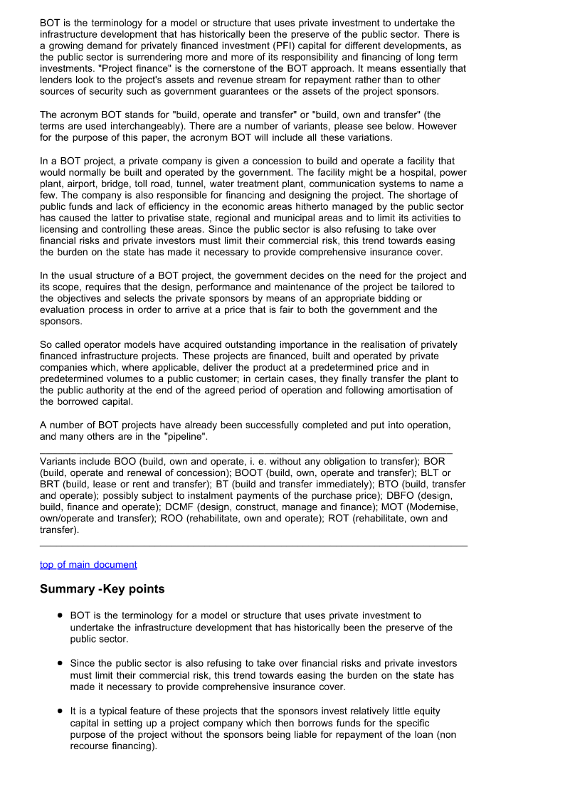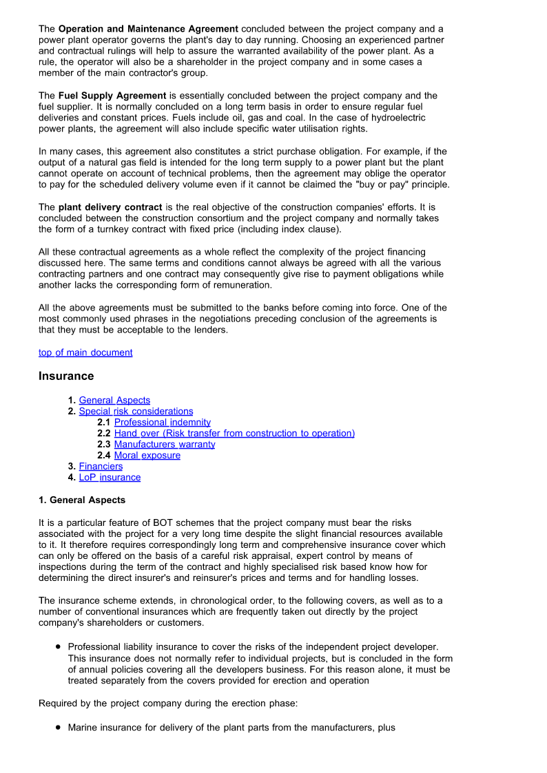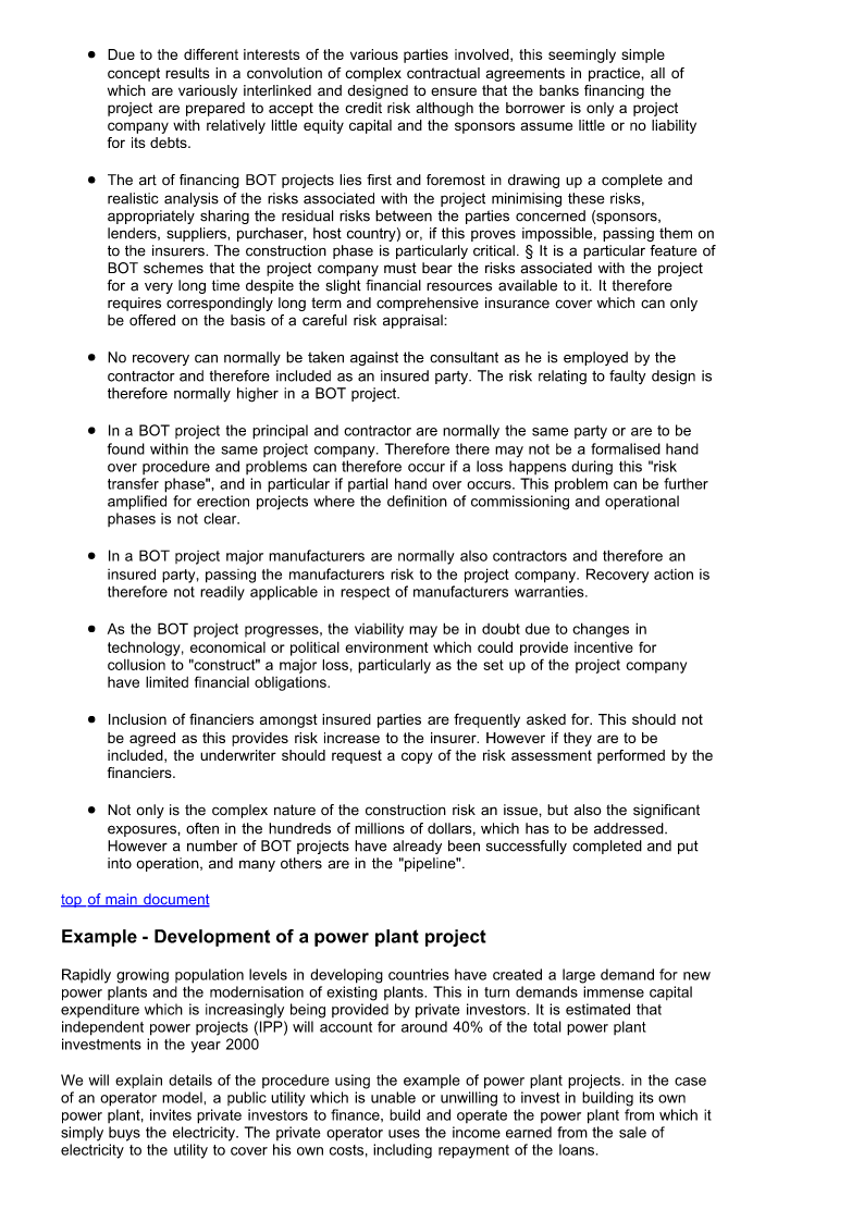 IMIA16-67(97)EINSURANCEOFBOTPROJECTSachallengeandanopportunityPresentedby:G.Ebner,H.Huppman,B.Jendren,H-B.Schittek,I.ZollerIMIAmeetingSunCitySouthAfricaNovember1997IntroductionProjectRisksSummary-KeypointsContractualAgreementsExample-DevelopmentofaInsurancePowerPlantProjectExamplesfromtheFieldofPartiesconcernedandtheirConstruction/ErectionInsuranceInterestsManagementSummaryThispaperdealswiththenewtrendinInfraStructureProjectswherePrivateCompaniesareformedinordertoBuild,OwnandOperatesuchprojectsandlateronhandthemovertoPublicInterests,ifatall.ThepapergivesanexampleofthestructureandarrangementsmadeinrespectofthedevelopmentofaPowerPlantProject.Furthermoreitdescribes"new"insurancerisksaccentuatedasaconsequenceofsuchprojectsandlistsanumberofongoingorcompletedBOTprojects.IntroductionBOTistheterminologyforamodelorstructurethatusesprivateinvestmenttoundertaketheinfrastructuredevelopmentthathashistoricallybeenthepreserveofthepublicsector.Thereisagrowingdemandforprivatelyfinancedinvestment(PFI)capitalfordifferentdevelopments,asthepublicsectorissurrenderingmoreandmoreofitsresponsibilityandfinancingoflongterminvestments."Projectfinance"isthecornerstoneoftheBOTapproach.Itmeansessentiallythatlenderslooktotheproject'sassetsandrevenuestreamforrepaymentratherthantoothersourcesofsecuritysuchasgovernmentguaranteesortheassetsoftheprojectsponsors.TheacronymBOTstandsfor"build,operateandtransfer"or"build,ownandtransfer"(thetermsareusedinterchangeably).Thereareanumberofvariants,pleaseseebelow.Howeverforthepurposeofthispaper,theacronymBOTwillincludeallthesevariations.InaBOTproject,aprivatecompanyisgivenaconcessiontobuildandoperateafacilitythatwouldnormallybebuiltandoperatedbythegovernment.Thefacilitymightbeahospital,powerplant,airport,bridge,tollroad,tunnel,watertreatmentplant,communicationsystemstonameafew.Thecompanyisalsoresponsibleforfinancinganddesigningtheproject.Theshortageofpublicfundsandlackofefficiencyintheeconomicareashithertomanaged