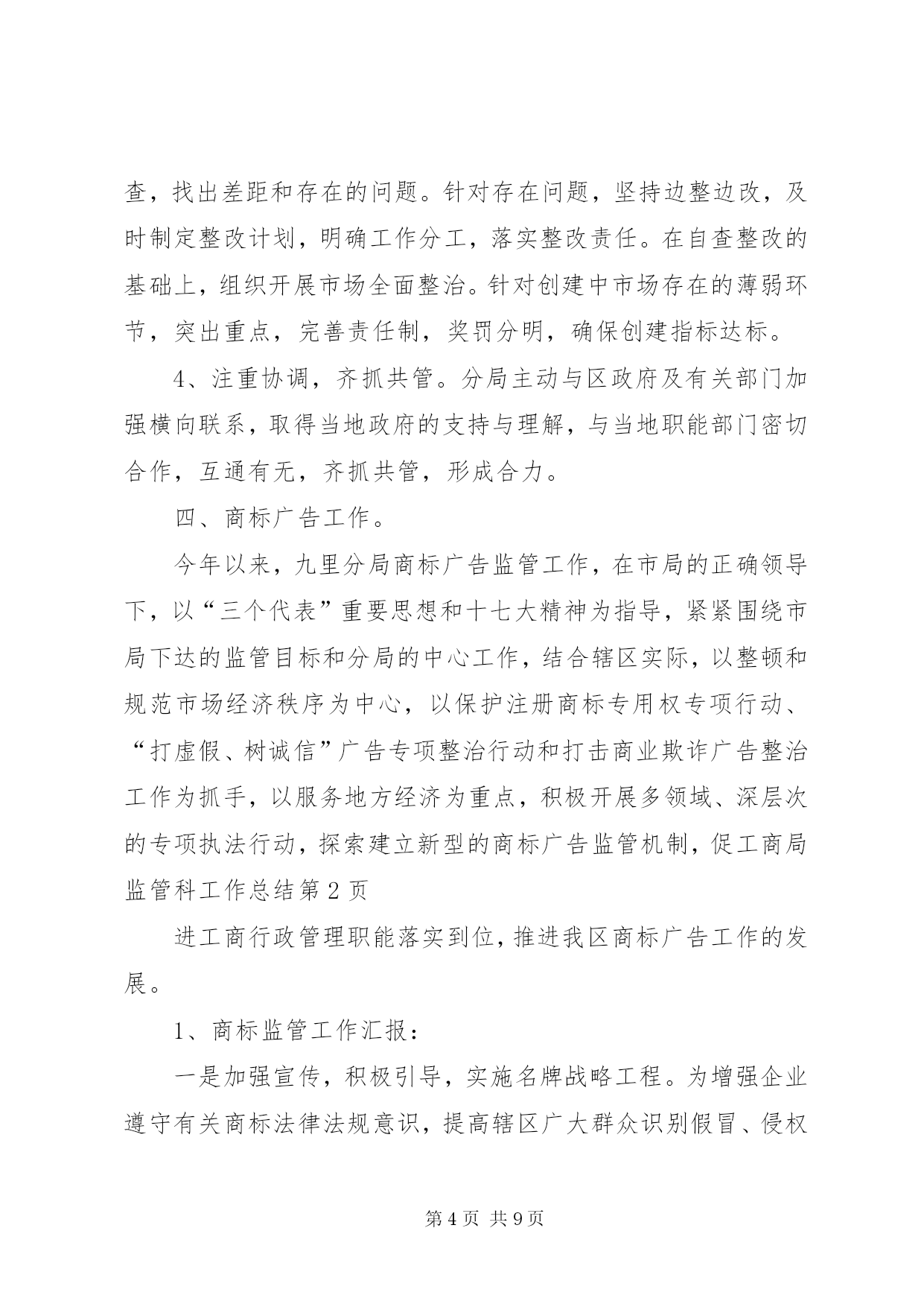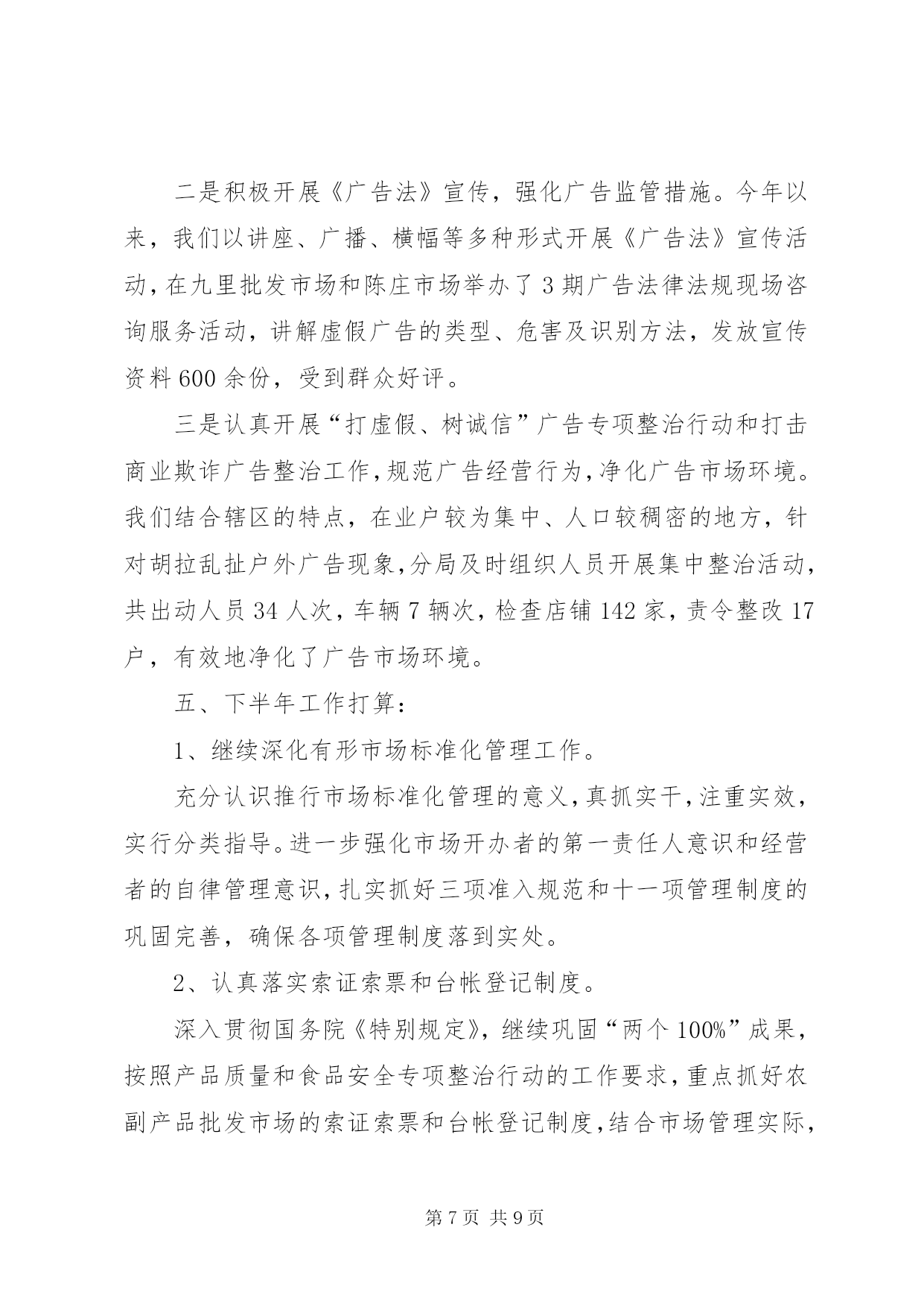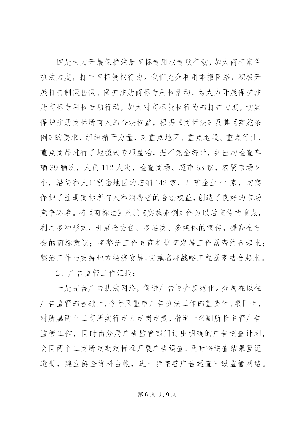 第PAGE\*Arabic\*MERGEFORMAT9页共NUMPAGES\*MERGEFORMAT9页工商局监管科工作总结工商局监管科工作总结今年以来,在分局党总支的正确领导下,我科以“三个代表”重要思想为指针,以分局年度工作思路为中心,以开展各项专项整治为抓手,陆续开展了节日市场大检查、肉菜粮放心工程、打假护农专项执法行动、创建“文明市场”活动、企业信用评价及重合同守信用工作、打击合同欺诈专项执法行动、农资市场专项整治行动等,由于领导重视,组织科学,措施得力,取得了阶段性的成效。现将主要工作情况汇报如下:一、狠抓市场规范化管理,着重建立长效管理机制。我们在传达学习、建立组织、统一认识的基础上,结合辖区市场实际,制定了可行的市场专项整治实施方案、工作目标分解责任书、市场开办者职责等,签定了责任状,落实了责任制,已初步形成了一个主要领导亲自抓,分管领导具体抓,各部门共同抓,坚持一级抓一级,层层抓落实的良好氛围。建立健全市场卫生管理、责任考评、检查结果公示、卫生服务承诺等制度,把任务落实到每个工商所、市场、行市、摊位和经营户。加强督导,建立制度。加强对本辖区市场整治工作的督导,督促市场主办单位加大投入,进一步完善各项配套服务设施,切实改变场容场貌。二、以重合同守信用为抓手,着重建立企业信用管理工作机制。我们充分运用合同管理职能,大力服务地方经济发展,对生产经营者上门征求意见、上门宣传法规、上门提供信息、上门受理投诉,既方便了经营者,又提高了工作效率。强化企业信用管理、提升信用监管层次。企业的信用管理是合同监管工作的一项重要内容。“以企业年检为契机,掌握企业综合情况,弥补日常巡查对企业监管的局限的要求。”注重收集企业一个年度中经营信息、纳税信息、信贷信息、合同履约情况等方面的信息,是建立企业信用管理制度的一项重要的基础性工作,是建立本辖区企业信用信息库一项重要手段。在审核企业年检材料的同时,注重收集企业的资信情况、资质情况、奖惩情况等相关信用信息,对重守企业的年检免除实质性审查。分局还要求各工商所在平时的综合检查、日常巡查中也要对企业的信用信息进行收集、整理。对获得市级以上重守企业称号的企业,则免于举报外的巡查。通过年检,对被定为b级、被警示和因有违法行为被处罚的企业纳入企业信用管理。为切实提升对企业信用监管的层次,分局组织相关人员认真学习了《信用管理办法》,通过学习使大家都充分认识到企业信用制度的建立,是工商机关每个职能部门、每一位工商干部共同的责任,在工商行政管理机关有些职能正在弱化的情况下,企业信用管理工作具有极其重要的地位。通过学习大家提高了认识、统一了思想,为做好全年信用管理工作提供了保障。三、创建国家文明城市活动情况1、统一思想,精心组织。分局领导班子高度重视,自觉融入创建、服务创建、推动创建,把该项工作作为一项全年工作的重要内容来抓。分局多次召开了全体人员参加的工作会议,学习传达贯彻市局会议精神,成立了分局创建工作领导小组,统一了全体人员的思想,提高了全员参与创建的自觉性。2、建章立制,夯实基础。我们在传达学习、建立组织、统一认识的基础上,结合辖区市场实际,制定了可行的市场专项整治实施方案,已初步形成了一个主要领导亲自抓,分管领导具体抓,各部门共同抓,坚持一级抓一级,层层抓落实的良好氛围。建立健全市场卫生管理、责任考评、检查结果公示、卫生服务承诺等制度,把任务落实到每个工商所、市场、行市、摊位和经营户。加强督导,建立制度。加强对本辖区市场创建整治工作的督导,督促市场主办单位加大投入,进一步完善各项配套服务设施,切实改变场容场貌。加强工作研究,建立市场创建例会制度。分局将适时对各阶段市场自查整改情况进行督查,并按照《市区农贸市场监管奖惩办法》兑现奖惩。3、对照标准,自查整改。对照国家文明城市标准,以工商所为单位,逐个市场进行排查,找出差距和存在的问题。针对存在问题,坚持边整边改,及时制定整改计划,明确工作分工,落实整改责任。在自查整改的基础上,组织开展市场全面整治。针对创建中市场存在的薄弱环节,突出重点,完善责任制,奖罚分明,确保创建指标达标。4、注重协调,齐抓共管。分局主动与区政府及有关部门加强横向联系,取得当地政府的支持与理解,与当地职能部门密切合作,互通有无,齐抓共管,形成合力。四、商标广告工作。今年以来,九里分局商标广告监管工作,在市局的正确领导下,以“三个代表”重要思想和十七大精神为指导,紧紧围绕市局下达的监管目标和分局的中心工作,结合辖区实际,以整顿和规范市场经济秩序为中心,以保护注册商标专用权专项行动、“打虚假、树诚信”广告专项整治行动和打击商业欺诈广告整治工作为抓手,以服务地方经济为重点,积极开展多领域、深层次的专项执法行动,探索建立新型的商标广告监管机制,促工商局监管科工作总