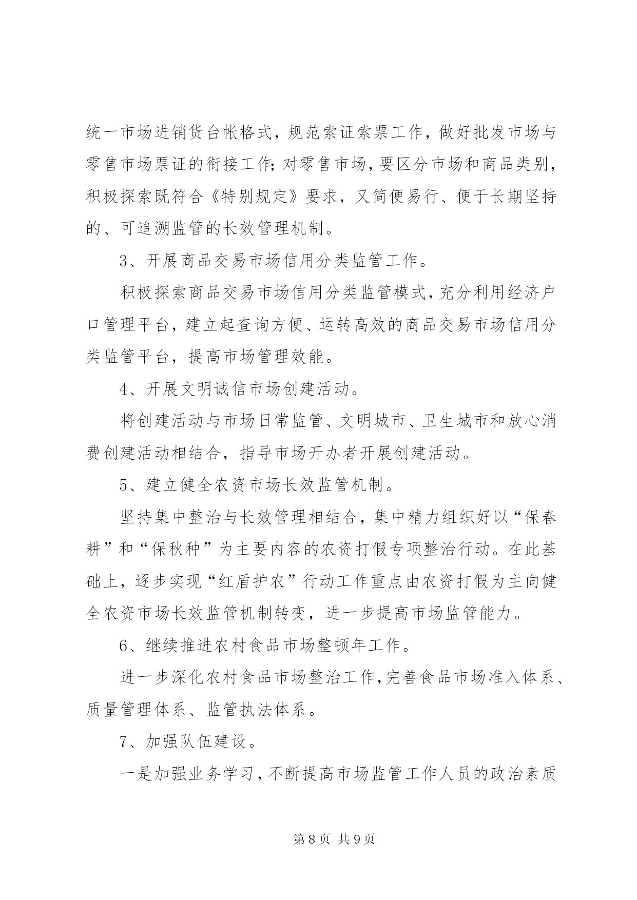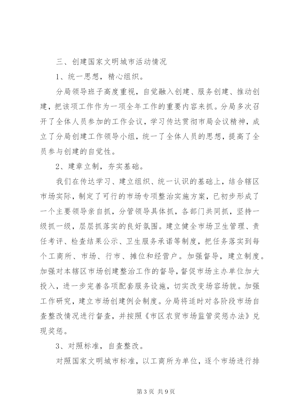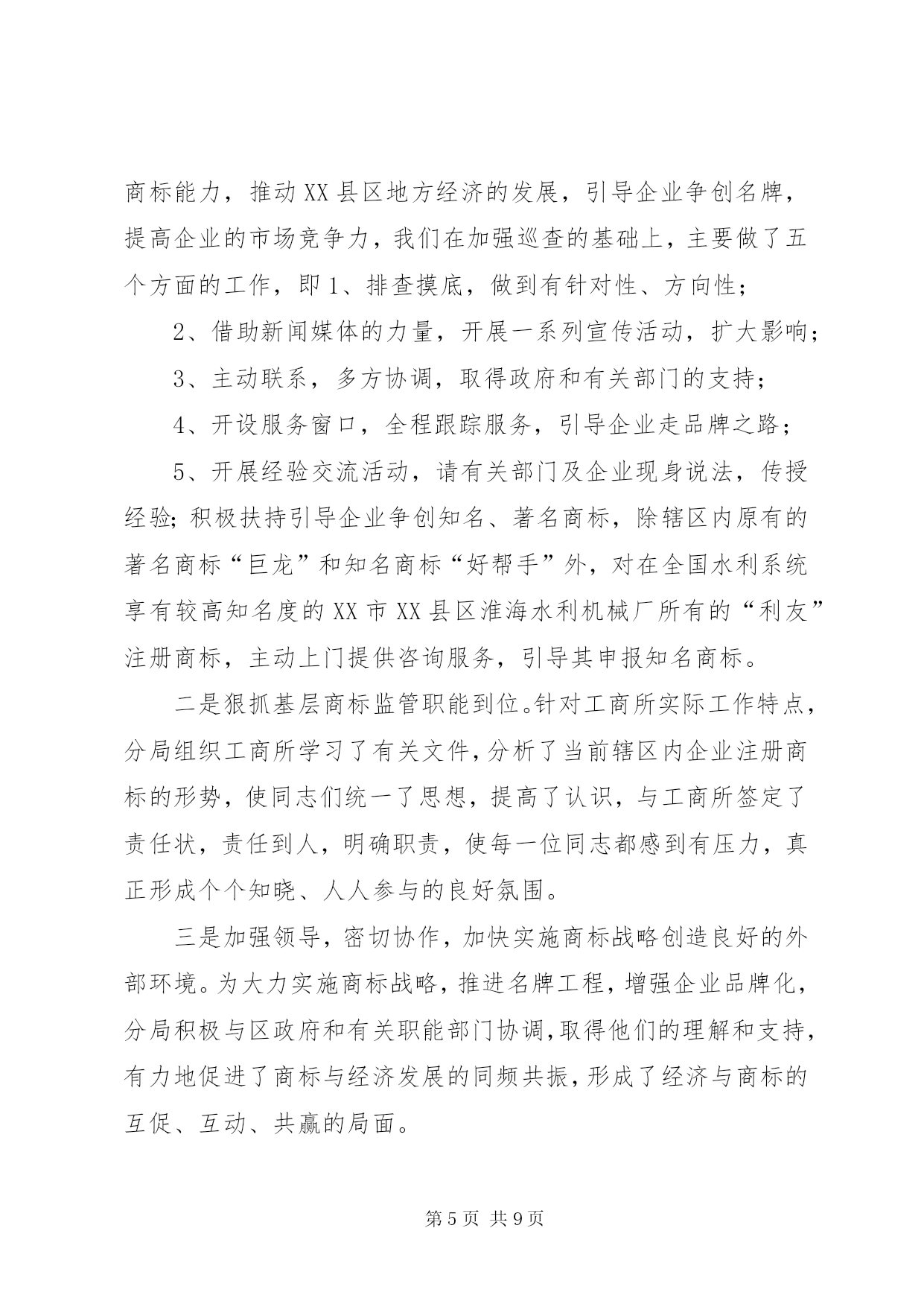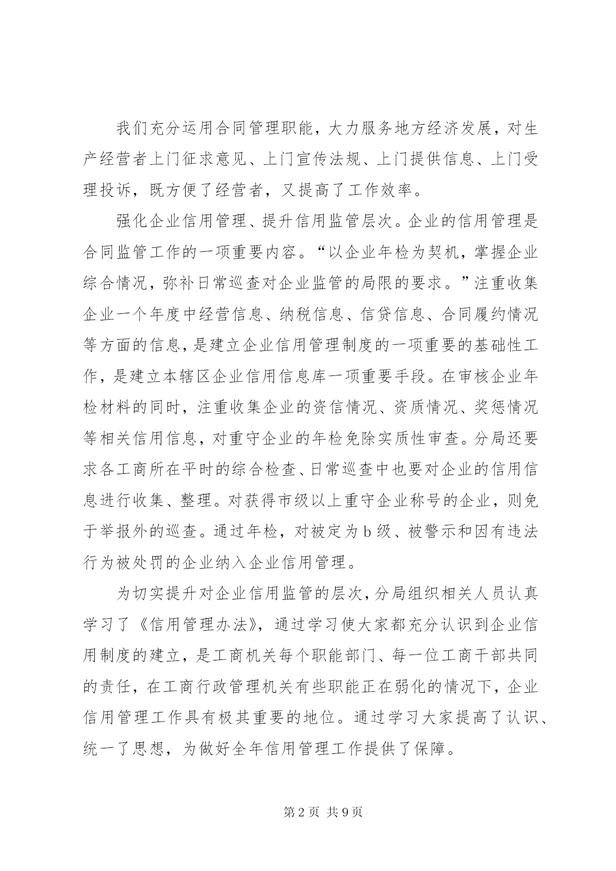 第PAGE\*Arabic\*MERGEFORMAT9页共NUMPAGES\*MERGEFORMAT9页工商局监管科工作总结工商局监管科工作总结今年以来,在分局党总支的正确领导下,我科以“三个代表”重要思想为指针,以分局年度工作思路为中心,以开展各项专项整治为抓手,陆续开展了节日市场大检查、肉菜粮放心工程、打假护农专项执法行动、创建“文明市场”活动、企业信用评价及重合同守信用工作、打击合同欺诈专项执法行动、农资市场专项整治行动等,由于领导重视,组织科学,措施得力,取得了阶段性的成效。现将主要工作情况汇报如下:一、狠抓市场规范化管理,着重建立长效管理机制。我们在传达学习、建立组织、统一认识的基础上,结合辖区市场实际,制定了可行的市场专项整治实施方案、工作目标分解责任书、市场开办者职责等,签定了责任状,落实了责任制,已初步形成了一个主要领导亲自抓,分管领导具体抓,各部门共同抓,坚持一级抓一级,层层抓落实的良好氛围。建立健全市场卫生管理、责任考评、检查结果公示、卫生服务承诺等制度,把任务落实到每个工商所、市场、行市、摊位和经营户。加强督导,建立制度。加强对本辖区市场整治工作的督导,督促市场主办单位加大投入,进一步完善各项配套服务设施,切实改变场容场貌。二、以重合同守信用为抓手,着重建立企业信用管理工作机制。我们充分运用合同管理职能,大力服务地方经济发展,对生产经营者上门征求意见、上门宣传法规、上门提供信息、上门受理投诉,既方便了经营者,又提高了工作效率。强化企业信用管理、提升信用监管层次。企业的信用管理是合同监管工作的一项重要内容。“以企业年检为契机,掌握企业综合情况,弥补日常巡查对企业监管的局限的要求。”注重收集企业一个年度中经营信息、纳税信息、信贷信息、合同履约情况等方面的信息,是建立企业信用管理制度的一项重要的基础性工作,是建立本辖区企业信用信息库一项重要手段。在审核企业年检材料的同时,注重收集企业的资信情况、资质情况、奖惩情况等相关信用信息,对重守企业的年检免除实质性审查。分局还要求各工商所在平时的综合检查、日常巡查中也要对企业的信用信息进行收集、整理。对获得市级以上重守企业称号的企业,则免于举报外的巡查。通过年检,对被定为b级、被警示和因有违法行为被处罚的企业纳入企业信用管理。为切实提升对企业信用监管的层次,分局组织相关人员认真学习了《信用管理办法》,通过学习使大家都充分认识到企业信用制度的建立,是工商机关每个职能部门、每一位工商干部共同的责任,在工商行政管理机关有些职能正在弱化的情况下,企业信用管理工作具有极其重要的地位。通过学习大家提高了认识、统一了思想,为做好全年信用管理工作提供了保障。三、创建国家文明城市活动情况1、统一思想,精心组织。分局领导班子高度重视,自觉融入创建、服务创建、推动创建,把该项工作作为一项全年工作的重要内容来抓。分局多次召开了全体人员参加的工作会议,学习传达贯彻市局会议精神,成立了分局创建工作领导小组,统一了全体人员的思想,提高了全员参与创建的自觉性。2、建章立制,夯实基础。我们在传达学习、建立组织、统一认识的基础上,结合辖区市场实际,制定了可行的市场专项整治实施方案,已初步形成了一个主要领导亲自抓,分管领导具体抓,各部门共同抓,坚持一级抓一级,层层抓落实的良好氛围。建立健全市场卫生管理、责任考评、检查结果公示、卫生服务承诺等制度,把任务落实到每个工商所、市场、行市、摊位和经营户。加强督导,建立制度。加强对本辖区市场创建整治工作的督导,督促市场主办单位加大投入,进一步完善各项配套服务设施,切实改变场容场貌。加强工作研究,建立市场创建例会制度。分局将适时对各阶段市场自查整改情况进行督查,并按照《市区农贸市场监管奖惩办法》兑现奖惩。3、对照标准,自查整改。对照国家文明城市标准,以工商所为单位,逐个市场进行排查,找出差距和存在的问题。针对存在问题,坚持边整边改,及时制定整改计划,明确工作分工,落实整改责任。在自查整改的基础上,组织开展市场全面整治。针对创建中市场存在的薄弱环节,突出重点,完善责任制,奖罚分明,确保创建指标达标。4、注重协调,齐抓共管。分局主动与区政府及有关部门加强横向联系,取得当地政府的支持与理解,与当地职能部门密切合作,互通有无,齐抓共管,形成合力。四、商标广告工作。今年以来,九里分局商标广告监管工作,在市局的正确领导下,以“三个代表”重要思想和十七大精神为指导,紧紧围绕市局下达的监管目标和分局的中心工作,结合辖区实际,以整顿和规范市场经济秩序为中心,以保护注册商标专用权专项行动、“打虚假、树诚信”广告专项整治行动和打击商业欺诈广告整治工作为抓手,以服务地方经济为重点,积极开展多领域、深层次的专项执法行动,探索建立新型的商标广告监管机制,促工商局监管科工作总