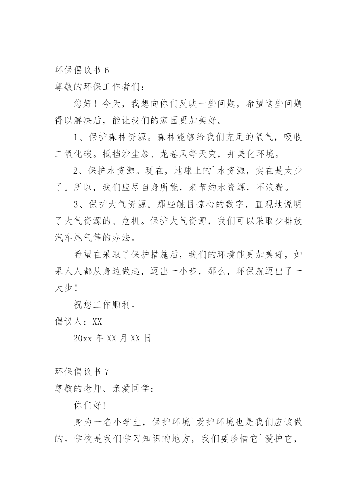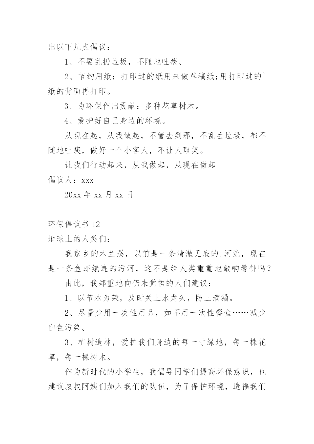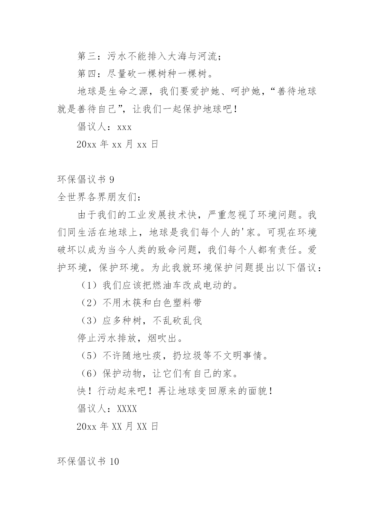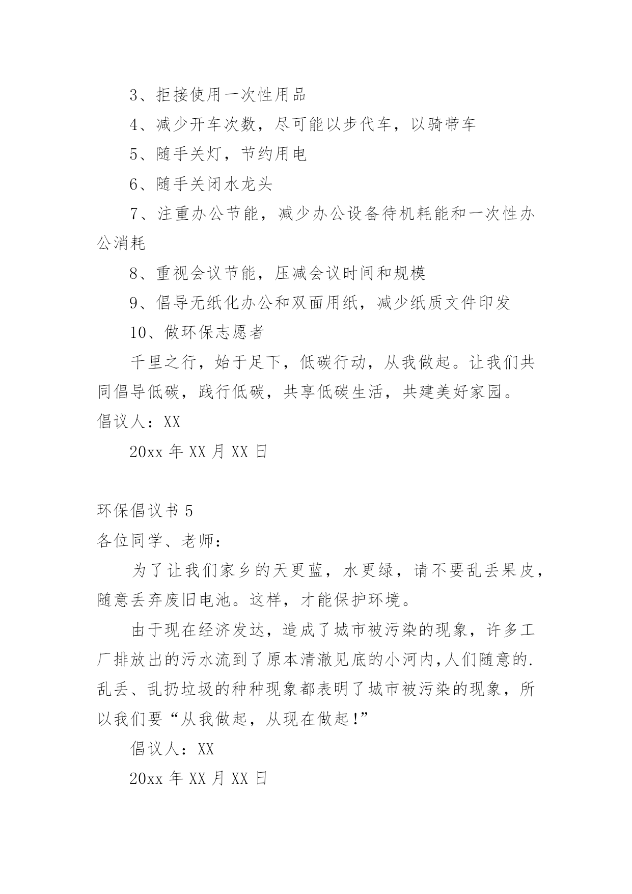 环保倡议书在日新月异的现代社会中,接触并使用倡议书的人越来越多,倡议书是为倡议、发起某项活动而写的号召性的公开提议性的专用书信。那要怎么写好倡议书呢?下面是小编整理的环保倡议书,仅供参考,大家一起来看看吧。环保倡议书1还未清醒的人们:大家好!地球,这位人类的母亲,曾是那样的壮观,和蔼可亲,但是由于我们的破坏,地球那容光焕发的面孔变得皱皱巴巴,一条条“皱纹”刻在了“母亲的.脸上!”为了母亲展开那久违的笑容,我想大家提出一些保护环境的建议,第一:不乱扔乱丢,不随地吐痰,不在公共场所吸烟;第二:节约水电,出门不忘关灯,洗手后关水龙头;第三:要爱护花草树木,不践踏草地;第四:不用塑料袋;第五:不用一次性筷子,以上是我提出的不大成熟的建议,我希望大家行动起来,从我做起,从身边的小事做起,让我们为建设一个环境优美的家园而共同努力!倡议人:XX20xx年XX月XX日环保倡议书2少先队队员们:地球是人类共同的家园。保护地球,人人有责!我们是祖国的未来和希望,是21世纪的小主人,应该成为环境保护的'小模范。为此,我们向全校的少先队员倡议一人人争当“环保小天使”。1、认真学习环境知识,关心社会环境问题。2、积极参加环保宣传,劝说、阻止破坏环境问题。3、从我做起,从小事做起一爱护花草树木,不乱丢垃圾。4、节约能源,随时关灯、关好水龙头。亲爱的小伙伴们,让我们行动起来吧!用小行动保护大地球!倡议人:XX20xx年XX月XX日环保倡议书3尊敬的老师、家长,可爱的'小朋友:近年来,国家大力倡导低碳生活方式,为节能减排做贡献。我们向全体同学发出如下倡议:请大家选择以下低碳生活方式,体验自然、简单、朴实、轻松的、生活。一、低碳出行:多选择公交、地铁、自行车、步行等交通方式,尽量少开车,采取节能驾驶。二、低碳生活习惯:生活中做到“四个一”(节约一滴水、节约一度电、节约一张纸、节约一粒米);使用环保购物袋,少用塑料袋;减少一次性用品的使用(木筷、纸杯、纸巾等);减少购买过度包装的商品;减少垃圾,进行垃圾分类。三、低碳消费:采用网上购物,减少交通出行;选购高效照明产品、节能空调、节能汽车、高效电视机等。四、低碳饮食:做饭做菜适量,不浪费;购买原材料食品回家自己加工,减少化学用品对人体的危害;少吃肉多吃素;请客吃饭不奢侈。让我们每一个人都成为低碳生活的践行者,并能坚持这种生活方式,从点滴小事做起,共同为建设资源节约型社会尽一份心、出一份力!倡议人:XX20xx年XX月XX日环保倡议书4尊敬的'老师、家长,可爱的小朋友:为了提高公众应对气候变化意识及参与程度,树立绿色低碳发展理念,提倡健康低碳生活方式,推广使用低碳产品,建立社会生态文明为目的的公益宣传,哈密市总工会要求全市各族干部职工争做低碳达人,宣传低碳生活,树立低碳环保意识。1、使用布袋或篮子代替超市塑料袋2、拒接使用一次性筷子3、拒接使用一次性用品4、减少开车次数,尽可能以步代车,以骑带车5、随手关灯,节约用电6、随手关闭水龙头7、注重办公节能,减少办公设备待机耗能和一次性办公消耗8、重视会议节能,压减会议时间和规模9、倡导无纸化办公和双面用纸,减少纸质文件印发10、做环保志愿者千里之行,始于足下,低碳行动,从我做起。让我们共同倡导低碳,践行低碳,共享低碳生活,共建美好家园。倡议人:XX20xx年XX月XX日环保倡议书5各位同学、老师:为了让我们家乡的天更蓝,水更绿,请不要乱丢果皮,随意丢弃废旧电池。这样,才能保护环境。由于现在经济发达,造成了城市被污染的现象,许多工厂排放出的污水流到了原本清澈见底的小河内,人们随意的.乱丢、乱扔垃圾的种种现象都表明了城市被污染的现象,所以我们要“从我做起,从现在做起!”倡议人:XX20xx年XX月XX日环保倡议书6尊敬的环保工作者们:您好!今天,我想向你们反映一些问题,希望这些问题得以解决后,能让我们的家园更加美好。1、保护森林资源。森林能够给我们充足的氧气,吸收二氧化碳。抵挡沙尘暴、龙卷风等天灾,并美化环境。2、保护水资源。现在,地球上的`水资源,实在是太少了。所以,我们应尽自身所能,来节约水资源,不浪费。3、保护大气资源。那些触目惊心的数字,直观地说明了大气资源的、危机。保护大气资源,我们可以采取少排放汽车尾气等的办法。希望在采取了保护措施后,我们的环境能更加美好,如果人人都从身边做起,迈出一小步,那么,环保就迈出了一大步!祝您工作顺利。倡议人:XX20xx年XX月XX日环保倡议书7尊敬的老师、亲爱同学:你们好!身为一名小学生,保护环境`爱护环境也是我们应该做的。学校是我们学习知识的地方,我们要珍惜它`爱护它,营造一个良好的学习环境是我们共同的责任。为此我提出以下几点建议:1、不乱丢垃圾、乱吐痰,看到垃圾要主动捡起来;2、爱惜学习用品,培养勤俭节约的'良好品质;3、种