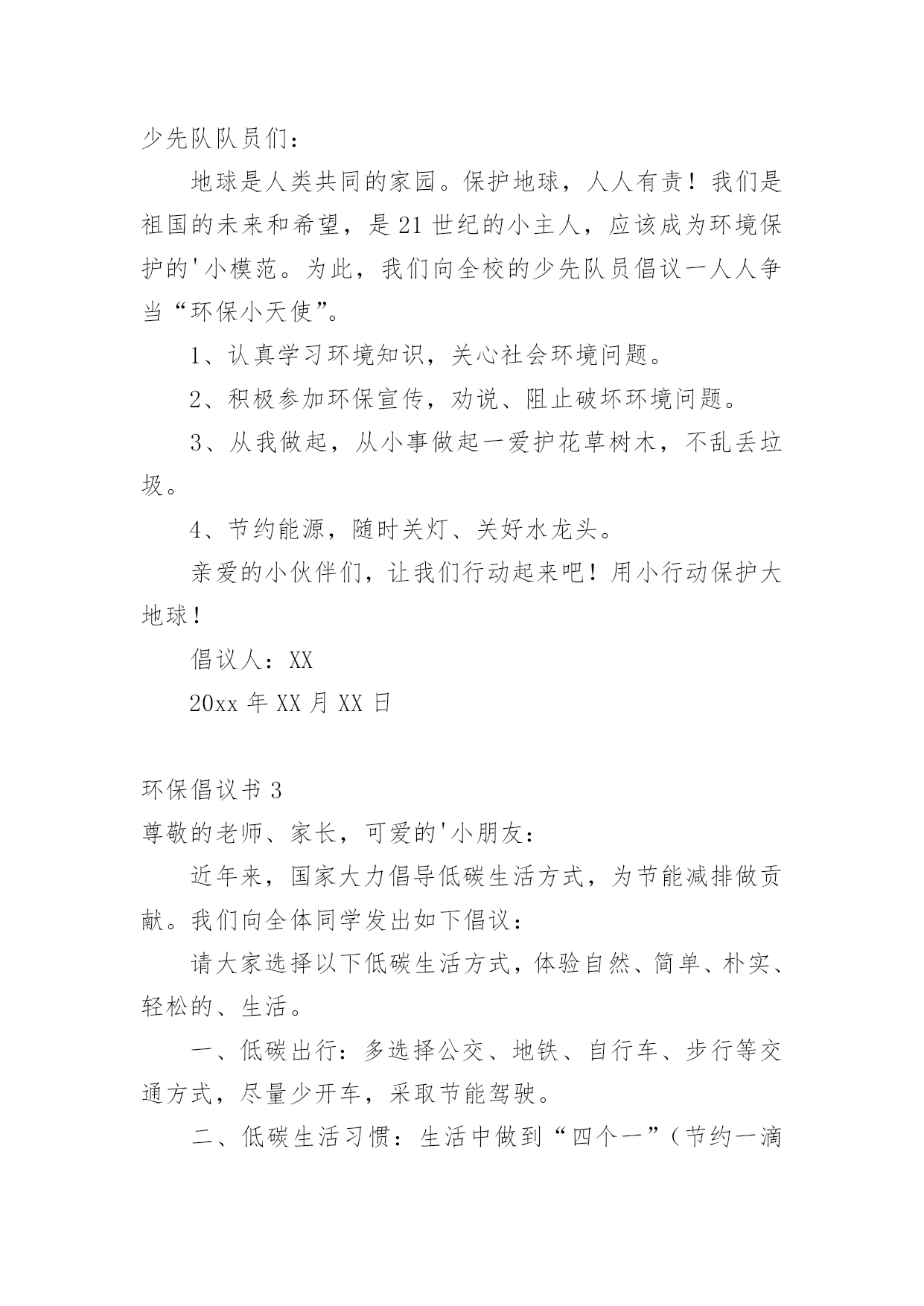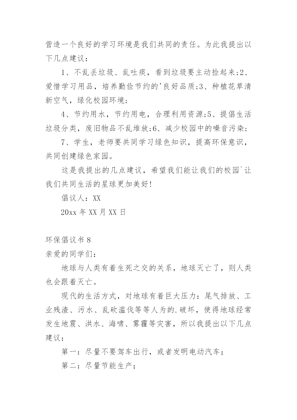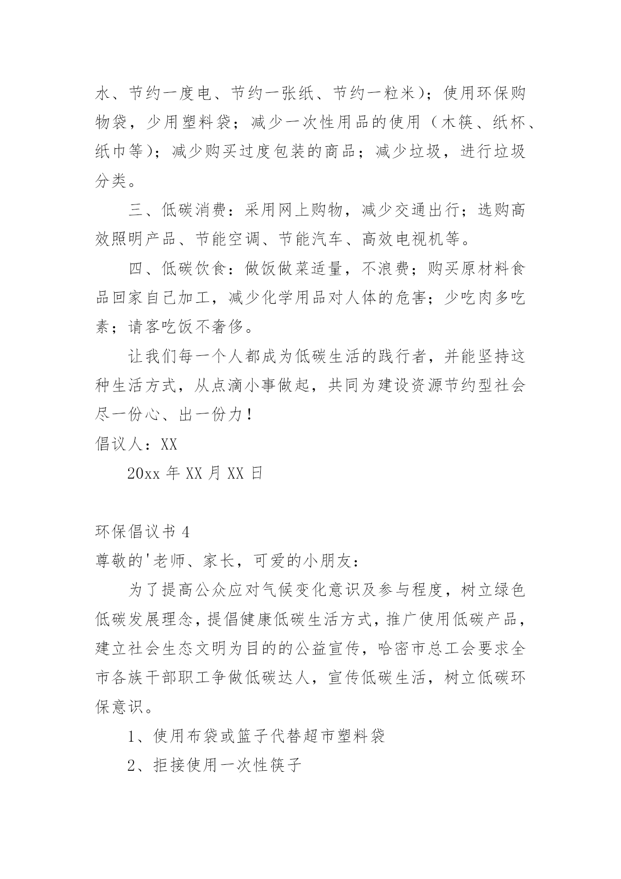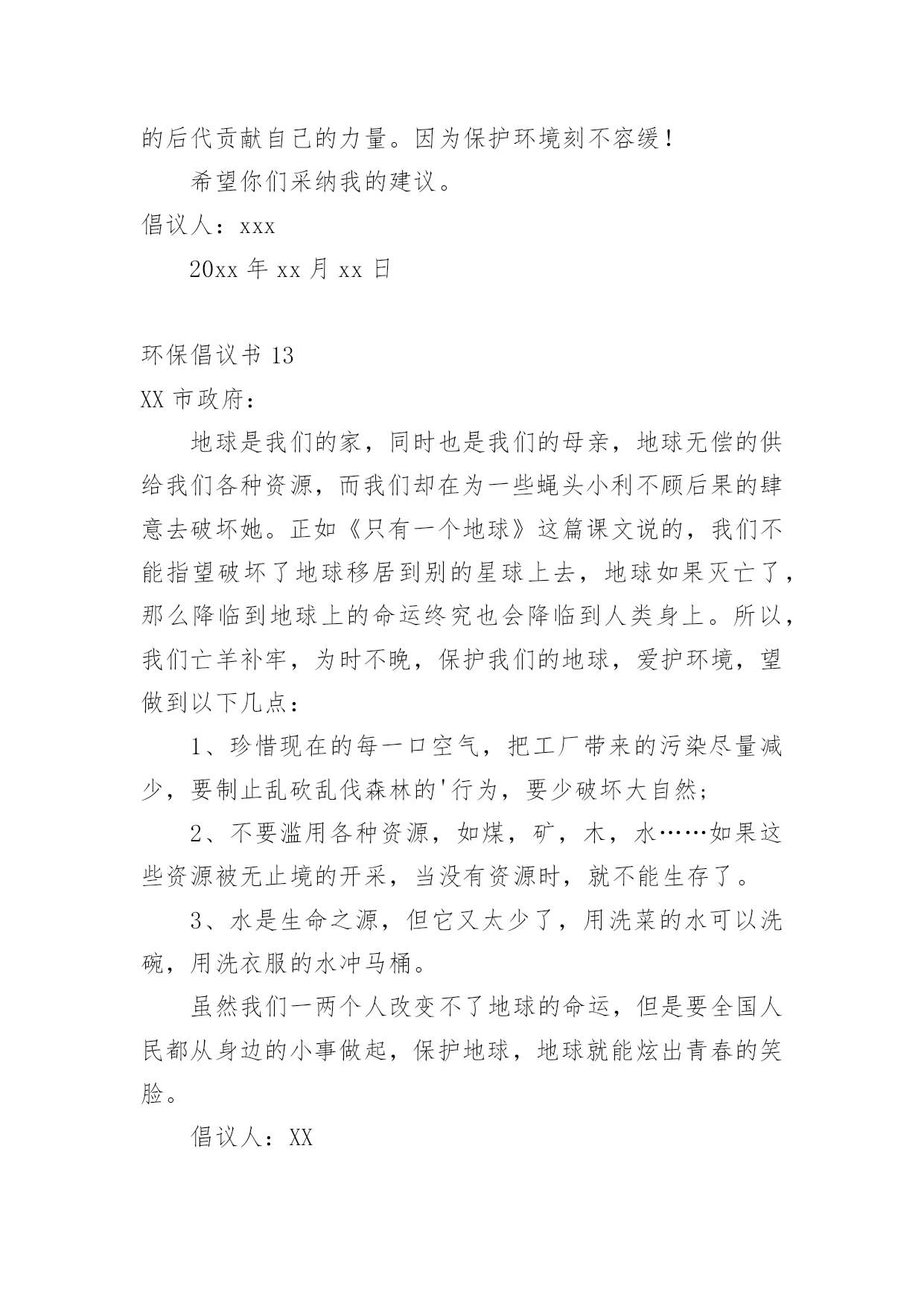 环保倡议书在日新月异的现代社会中,接触并使用倡议书的人越来越多,倡议书是为倡议、发起某项活动而写的号召性的公开提议性的专用书信。那要怎么写好倡议书呢?下面是小编整理的环保倡议书,仅供参考,大家一起来看看吧。环保倡议书1还未清醒的人们:大家好!地球,这位人类的母亲,曾是那样的壮观,和蔼可亲,但是由于我们的破坏,地球那容光焕发的面孔变得皱皱巴巴,一条条“皱纹”刻在了“母亲的.脸上!”为了母亲展开那久违的笑容,我想大家提出一些保护环境的建议,第一:不乱扔乱丢,不随地吐痰,不在公共场所吸烟;第二:节约水电,出门不忘关灯,洗手后关水龙头;第三:要爱护花草树木,不践踏草地;第四:不用塑料袋;第五:不用一次性筷子,以上是我提出的不大成熟的建议,我希望大家行动起来,从我做起,从身边的小事做起,让我们为建设一个环境优美的家园而共同努力!倡议人:XX20xx年XX月XX日环保倡议书2少先队队员们:地球是人类共同的家园。保护地球,人人有责!我们是祖国的未来和希望,是21世纪的小主人,应该成为环境保护的'小模范。为此,我们向全校的少先队员倡议一人人争当“环保小天使”。1、认真学习环境知识,关心社会环境问题。2、积极参加环保宣传,劝说、阻止破坏环境问题。3、从我做起,从小事做起一爱护花草树木,不乱丢垃圾。4、节约能源,随时关灯、关好水龙头。亲爱的小伙伴们,让我们行动起来吧!用小行动保护大地球!倡议人:XX20xx年XX月XX日环保倡议书3尊敬的老师、家长,可爱的'小朋友:近年来,国家大力倡导低碳生活方式,为节能减排做贡献。我们向全体同学发出如下倡议:请大家选择以下低碳生活方式,体验自然、简单、朴实、轻松的、生活。一、低碳出行:多选择公交、地铁、自行车、步行等交通方式,尽量少开车,采取节能驾驶。二、低碳生活习惯:生活中做到“四个一”(节约一滴水、节约一度电、节约一张纸、节约一粒米);使用环保购物袋,少用塑料袋;减少一次性用品的使用(木筷、纸杯、纸巾等);减少购买过度包装的商品;减少垃圾,进行垃圾分类。三、低碳消费:采用网上购物,减少交通出行;选购高效照明产品、节能空调、节能汽车、高效电视机等。四、低碳饮食:做饭做菜适量,不浪费;购买原材料食品回家自己加工,减少化学用品对人体的危害;少吃肉多吃素;请客吃饭不奢侈。让我们每一个人都成为低碳生活的践行者,并能坚持这种生活方式,从点滴小事做起,共同为建设资源节约型社会尽一份心、出一份力!倡议人:XX20xx年XX月XX日环保倡议书4尊敬的'老师、家长,可爱的小朋友:为了提高公众应对气候变化意识及参与程度,树立绿色低碳发展理念,提倡健康低碳生活方式,推广使用低碳产品,建立社会生态文明为目的的公益宣传,哈密市总工会要求全市各族干部职工争做低碳达人,宣传低碳生活,树立低碳环保意识。1、使用布袋或篮子代替超市塑料袋2、拒接使用一次性筷子3、拒接使用一次性用品4、减少开车次数,尽可能以步代车,以骑带车5、随手关灯,节约用电6、随手关闭水龙头7、注重办公节能,减少办公设备待机耗能和一次性办公消耗8、重视会议节能,压减会议时间和规模9、倡导无纸化办公和双面用纸,减少纸质文件印发10、做环保志愿者千里之行,始于足下,低碳行动,从我做起。让我们共同倡导低碳,践行低碳,共享低碳生活,共建美好家园。倡议人:XX20xx年XX月XX日环保倡议书5各位同学、老师:为了让我们家乡的天更蓝,水更绿,请不要乱丢果皮,随意丢弃废旧电池。这样,才能保护环境。由于现在经济发达,造成了城市被污染的现象,许多工厂排放出的污水流到了原本清澈见底的小河内,人们随意的.乱丢、乱扔垃圾的种种现象都表明了城市被污染的现象,所以我们要“从我做起,从现在做起!”倡议人:XX20xx年XX月XX日环保倡议书6尊敬的环保工作者们:您好!今天,我想向你们反映一些问题,希望这些问题得以解决后,能让我们的家园更加美好。1、保护森林资源。森林能够给我们充足的氧气,吸收二氧化碳。抵挡沙尘暴、龙卷风等天灾,并美化环境。2、保护水资源。现在,地球上的`水资源,实在是太少了。所以,我们应尽自身所能,来节约水资源,不浪费。3、保护大气资源。那些触目惊心的数字,直观地说明了大气资源的、危机。保护大气资源,我们可以采取少排放汽车尾气等的办法。希望在采取了保护措施后,我们的环境能更加美好,如果人人都从身边做起,迈出一小步,那么,环保就迈出了一大步!祝您工作顺利。倡议人:XX20xx年XX月XX日环保倡议书7尊敬的老师、亲爱同学:你们好!身为一名小学生,保护环境`爱护环境也是我们应该做的。学校是我们学习知识的地方,我们要珍惜它`爱护它,营造一个良好的学习环境是我们共同的责任。为此我提出以下几点建议:1、不乱丢垃圾、乱吐痰,看到垃圾要主动捡起来;2、爱惜学习用品,培养勤俭节约的'良好品质;3、种