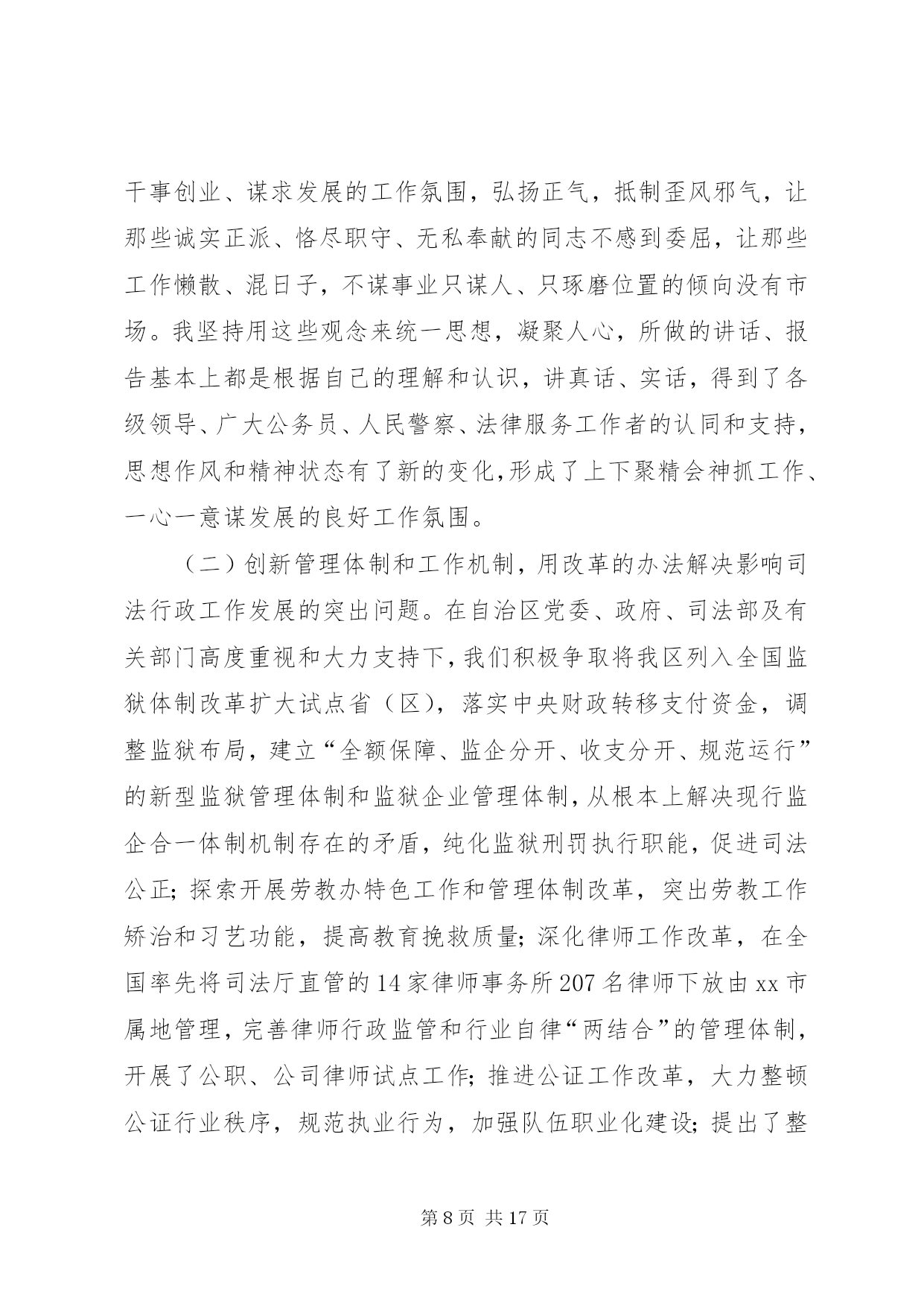 第PAGE\*Arabic\*MERGEFORMAT17页共NUMPAGES\*MERGEFORMAT17页自治区司法厅厅长个人述职报告主任、各位副主任、秘书长、各位委员。按照自治区人大常委会安排要求,现将我任司法厅厅长以来履行职责情况做述职汇报,请各位领导、委员予以评议。2003年2月19日,自治区九届人大常委会第一次会议任命我为司法厅厅长。司法厅承担着监狱工作、劳教工作、普法依法治理、人民调解、刑释解教人员安置帮教、律师、公证、法律援助、法学教育、司法鉴定管理、国家统一司法考试和司法外事协助等职能,既是重要的执法机关,也是政府直接为人民服务的法制部门,在推进依法治区、维护社会稳定、构建和谐社会中负有重要职责。面对党和人民的重托,我深知责任重大,不敢有丝毫懈怠。两年多来,在自治区党委、政府的正确领导下,在自治区人大的监督指导和各有关部门的关怀支持下,在厅党委各成员的全力配合和全系统同志们的共同努力下,我忠实地履行自治区人大赋予的职责,团结带领广大公务员、人民警察、法律服务工作者和职工,坚定不移地贯彻党的路线方针政策和国家的法律法规,严格执行人大的各项决议决定,紧紧围绕中心工作,服务大局,咬定发展,深化改革,团结鼓劲,务实苦干,凝聚全系统上下的智慧和力量,全力推动司法行政工作创新发展,为服务人民群众、维护社会稳定和促进经济发展做出了不懈努力。一、牢记宗旨,执政为民,坚持以“三个代表”重要思想统揽司法行政工作(一)不断学习,努力提高工作能力和水平。多年来,我坚持把学习作为工作和生活的一项重要内容,不断充实、丰富和提高自己。比较系统地学习掌握了马列主义、毛泽东思想、邓小平理论、“三个代表”重要思想和以胡锦涛同志为总书记的中央领导集体关于树立和落实科学发展观、新的人才观和正确的政绩观、加强党的执政能力建设、构建社会主义和谐社会等一系列重大理论决策,形成了一些学习成果。到司法厅后,在中央、自治区级刊物上发表论文15篇,其中多篇获奖。坚持读完了中国人民大学政治经济学硕士学位,又继续学习中央党校法学研究生课程。通过不间断的学习,工作能力和领导水平有新的提高,很快适应了新的工作岗位和新的工作任务要求。(二)坚决贯彻执行党的路线方针政策,努力践行“三个代表”重要思想。我与厅党委一班人认真贯彻执行党的路线方针政策和国家的法律法规,在思想上、行动上与党中央保持高度一致,维护自治区党委、政府领导集体的权威。坚持党的组织原则,严格执行党的民主集中制,襟怀坦荡,尊重同志,顾全大局,事业为重,努力使司法行政工作与党和国家的重大政策调整和社会发展进程相适应,肩负起历史的重任。坚持做好“四个服务”:坚持执政为民,积极为维护社会稳定服务;拓展和规范法律服务,为完善我区社会主义市场经济体制和经济社会快速发展服务;加强法制宣传教育,为推进依法治区进程服务;健全完善法律援助制度,为实现好、维护好广大人民群众的根本利益服务。把“三个代表”重要思想和立党为公、执政为民的本质要求落实到公务员、人民警察和法律服务工作者的思想和行动上,落实到司法行政工作的具体措施中,各项工作有新的突破,全面提速。(三)坚持向自治区党委、政府汇报请示,保证司法行政工作的正确方向。我始终保持着对党、对人民事业高度的责任心,以如牛负重、如履薄冰的意识警醒、鞭策自己,认真做好党组织交给的每一项工作。一是坚持党对司法行政工作的绝对领导。提请自治区党委成立司法厅党委,理顺关系,改善管理,加强监督。二是严肃政治纪律。厅党委做出《关于进一步严肃政治纪律的通知》,保证了中央的路线方针政策和自治区党委、政府、司法部各项重大决策部署不折不扣的贯彻落实,政令畅通,步调一致。三是抢抓机遇。坚持及时汇报全区司法行政工作改革发展思路和各项工作措施,积极争取支持,长期制约司法行政工作一些根本性困难障碍逐步化解。我主持制定并提请自治区党委、政府“两办”及有关部门连续转发了关于加强新时期人民调解工作、刑释解教人员安置帮教工作、基层司法所规范化建设、法律援助工作等一系列政策性文件,为司法行政工作提供了强有力的政治保障。使司法行政工作与全区经济社会各项事业同步前进,进入良性互动、快速发展的轨道。二、围绕中心,服务大局,积极为全区经济社会发展提供法律服务和法律保障两年多来,我和厅党委班子成员带领广大公务员、人民警察、法律服务工作者和职工,进一步解放思想,更新观念,与时俱进,在坚持中发展,在继承中创新,在创新中前进,司法行政各项工作保持了积极向上的良好态势。(一)全力维护社会稳定。监狱、劳教工作不断提高罪犯教育改造和劳教人员教育挽救质量,“法轮功”服刑人员和劳教人员转化率累计达100%,确保了监管场所安全稳定。全区3746个调委会17212名人民调解员共调解各类民间矛盾纠纷47069件,成功率在96%以上。其