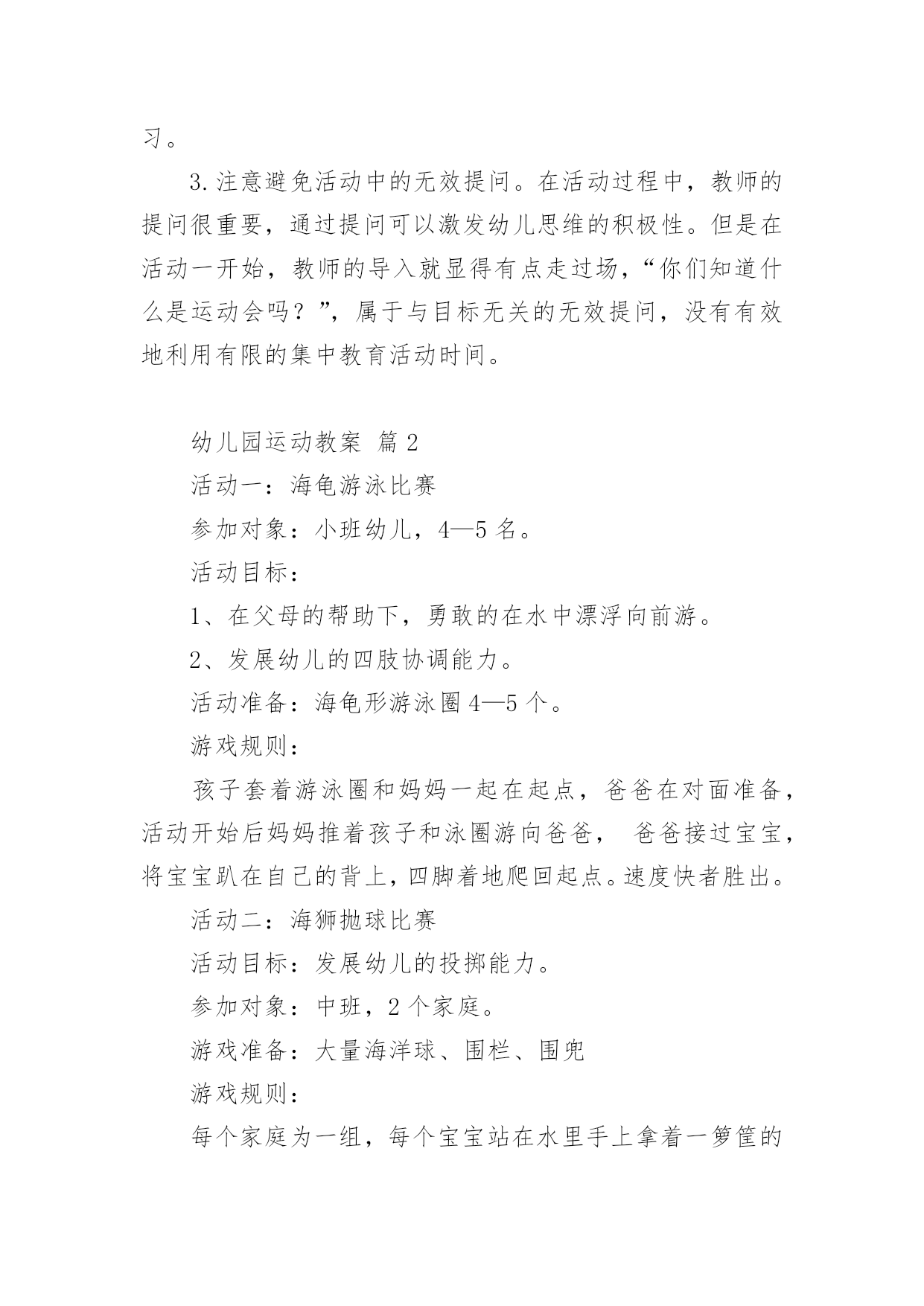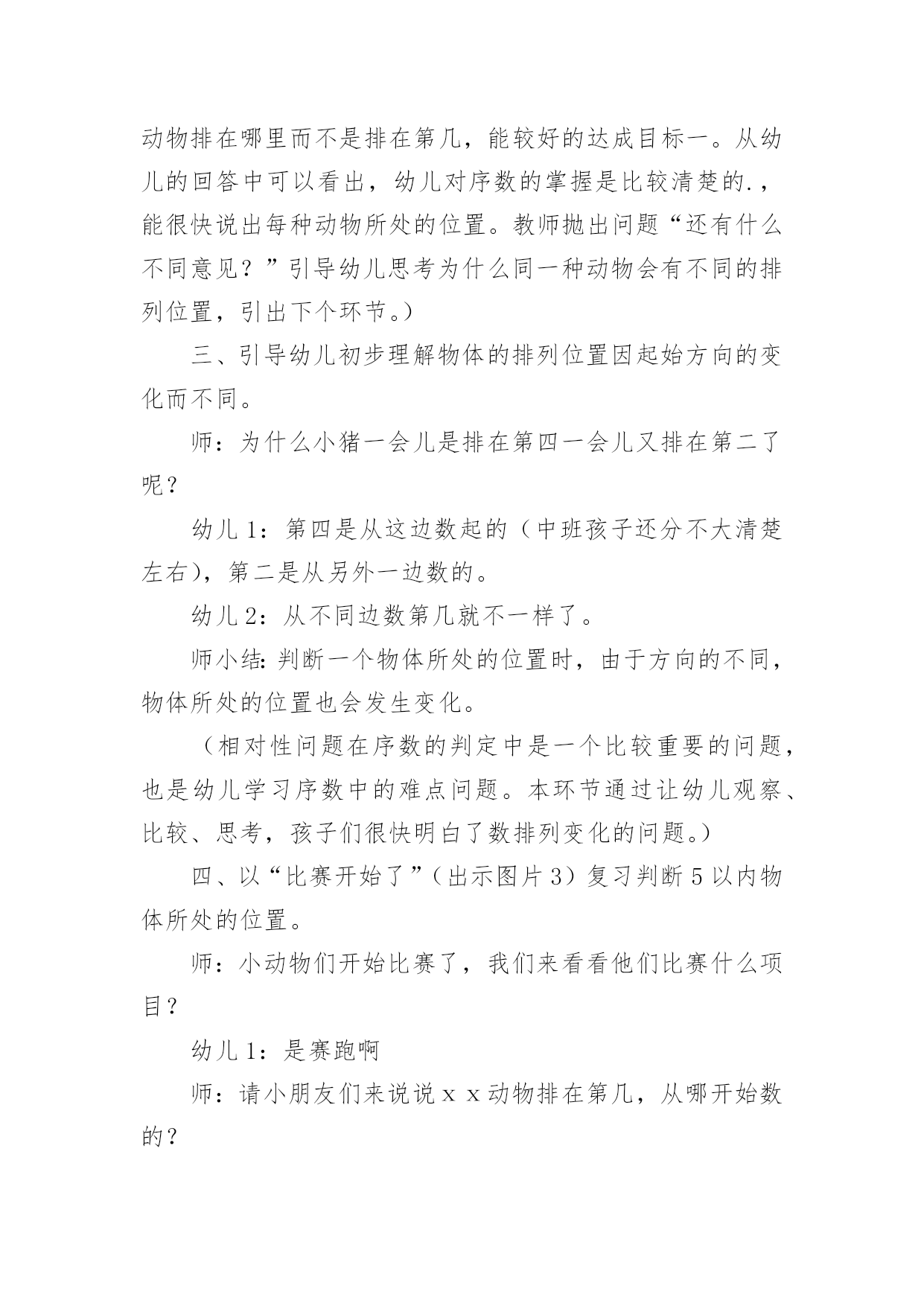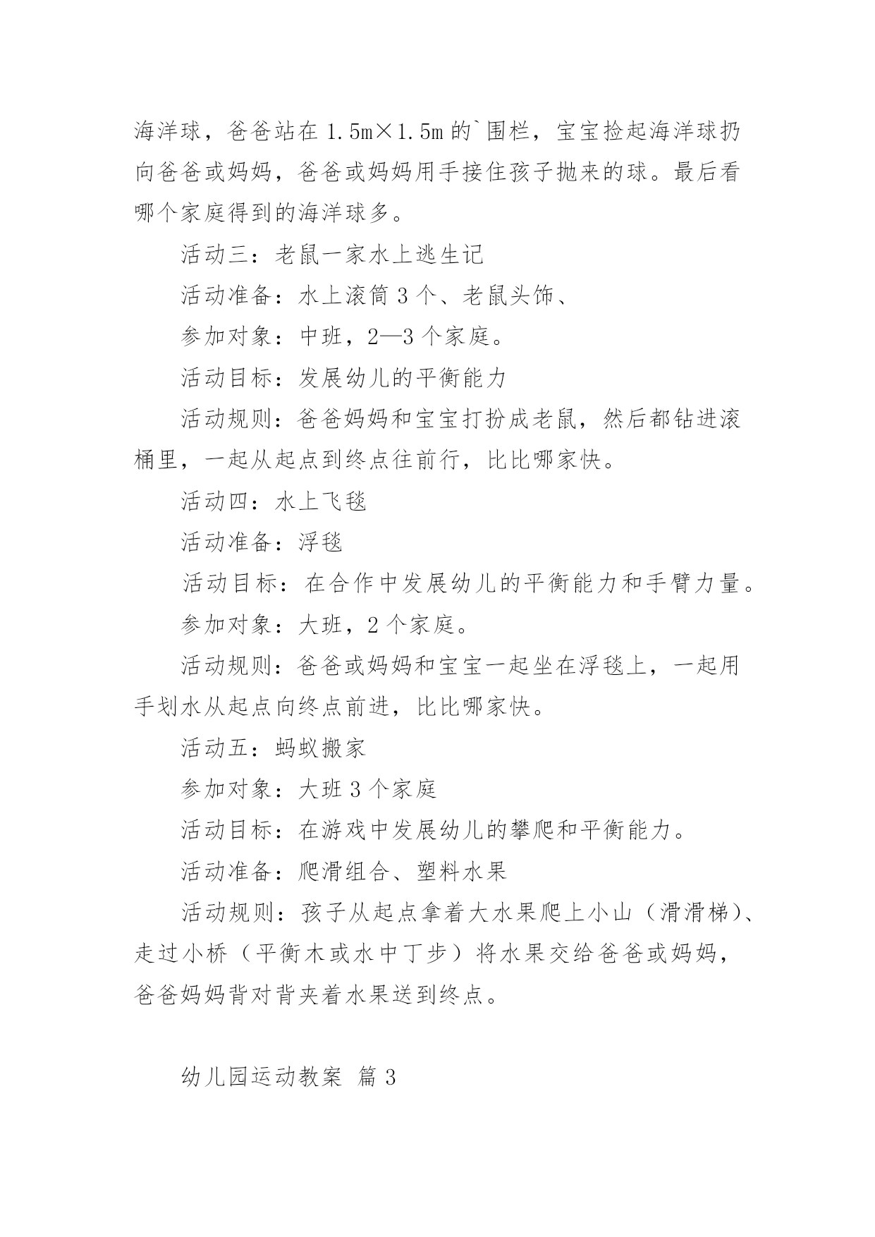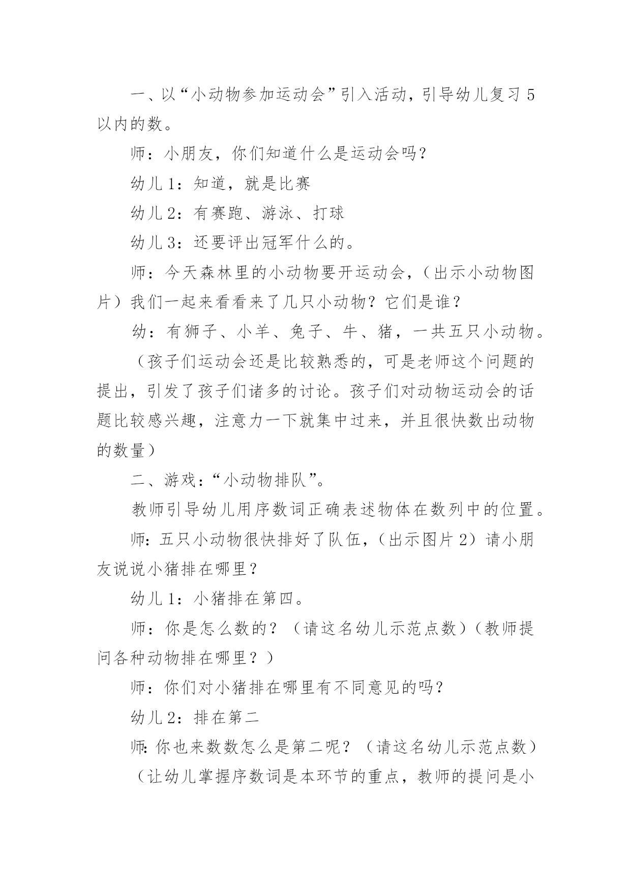 幼儿园运动教案幼儿园运动教案14篇作为一名教职工,往往需要进行教案编写工作,教案有助于顺利而有效地开展教学活动。来参考自己需要的教案吧!以下是小编为大家整理的幼儿园运动教案,仅供参考,大家一起来看看吧。幼儿园运动教案篇1活动目标:1.理解序数的含义,能用序数词正确表示5以内物体排列的次序。2.从不同的方向(从左到右、从右到左)判定某一物体所处的位置,初步理解物体的排列位置因起始方向的变化而不同。3.在活动中,让幼儿体验与同伴共游戏的快乐,乐意与同伴一起游戏。4.通过活动幼儿学会游戏,感受游戏的乐趣。5.使小朋友们感到快乐、好玩,在不知不觉中应经学习了知识。活动准备:“动物运动会”课件、小动物图片若干、房子图卡、幼儿操作卡活动过程:一、以“小动物参加运动会”引入活动,引导幼儿复习5以内的数。师:小朋友,你们知道什么是运动会吗?幼儿1:知道,就是比赛幼儿2:有赛跑、游泳、打球幼儿3:还要评出冠军什么的。师:今天森林里的小动物要开运动会,(出示小动物图片)我们一起来看看来了几只小动物?它们是谁?幼:有狮子、小羊、兔子、牛、猪,一共五只小动物。(孩子们运动会还是比较熟悉的,可是老师这个问题的提出,引发了孩子们诸多的讨论。孩子们对动物运动会的话题比较感兴趣,注意力一下就集中过来,并且很快数出动物的数量)二、游戏:“小动物排队”。教师引导幼儿用序数词正确表述物体在数列中的位置。师:五只小动物很快排好了队伍,(出示图片2)请小朋友说说小猪排在哪里?幼儿1:小猪排在第四。师:你是怎么数的?(请这名幼儿示范点数)(教师提问各种动物排在哪里?)师:你们对小猪排在哪里有不同意见的吗?幼儿2:排在第二师:你也来数数怎么是第二呢?(请这名幼儿示范点数)(让幼儿掌握序数词是本环节的重点,教师的提问是小动物排在哪里而不是排在第几,能较好的达成目标一。从幼儿的回答中可以看出,幼儿对序数的掌握是比较清楚的.,能很快说出每种动物所处的位置。教师抛出问题“还有什么不同意见?”引导幼儿思考为什么同一种动物会有不同的排列位置,引出下个环节。)三、引导幼儿初步理解物体的排列位置因起始方向的变化而不同。师:为什么小猪一会儿是排在第四一会儿又排在第二了呢?幼儿1:第四是从这边数起的(中班孩子还分不大清楚左右),第二是从另外一边数的。幼儿2:从不同边数第几就不一样了。师小结:判断一个物体所处的位置时,由于方向的不同,物体所处的位置也会发生变化。(相对性问题在序数的判定中是一个比较重要的问题,也是幼儿学习序数中的难点问题。本环节通过让幼儿观察、比较、思考,孩子们很快明白了数排列变化的问题。)四、以“比赛开始了”(出示图片3)复习判断5以内物体所处的位置。师:小动物们开始比赛了,我们来看看他们比赛什么项目?幼儿1:是赛跑啊师:请小朋友们来说说ⅹⅹ动物排在第几,从哪开始数的?(本环节让幼儿根据上面所学的经验,从不同的方向数出动物的排列次序)五、幼儿操作活动,复习5以内的序数,进一步理解序数的含义。1、出示房子图卡,认识小动物的新家,根据小动物身上的数字把小动物送到相应的楼层。2、“快乐的郊游”,根据提示画出动物的相应位置。3、“找一找,连一连”,根据两次动物排队的次序,按要求写出动物每次的各是第几位。活动反思:通过本次活动,幼儿学会了5之内的单向序数,初步建立了序数的概念,并且能按从左到右和从右到左的顺序进行点数,为今后学习不同的方位序数奠定了基础,也为幼儿在生活中自己的位置找准了坐标。整节活动环节安排比较合理,,思路也比较清楚,幼儿所学效果较好。具体体现在:1、关注幼儿对序数词的掌握。序数词的掌握是序数教学的重点,在本次活动中,教师能关注幼儿是否已经正确掌握序数词,借助直观教具进行讲解演示,帮助幼儿理解数的含义,能用序数词正确表示物体排列的次序。2、渗透物体排列位置的相对性问题。相对性在幼儿数学教育中是一个重要的数量关系,在序数判定中,即物体排列的位置不变,但对其所处位置的判定会因起始方向的不同而改变。在本次活动活动中,教师能用很自然的问题“为什么小猪的位置有的小朋友说是在第二,而有的小朋友说是第四呢?”引发幼儿思考、讨论,让幼儿初步理解从不同的方向点数,其结果是不同的。3、注重通过操作和游戏进行学习与巩固。学习序数不仅要让幼儿掌握序数词,而且应注重让幼儿在积极操作的过程中,构建初步的数概念,在本次活动中,教师设计了“小动物运动会”的游戏情节,先出示五只小动物,在幼儿点数数量的基础上说说“什么小动物排在哪里?”让幼儿学习从左到右或从右到左说出某个动物在整排动物中的序数;接着出示动物比赛的图片,让幼儿说说哪只动物站在哪条跑道,帮助幼儿利用刚学的有关对序数的认识解决新的问题;最后让幼儿操作练习,按幼儿能力不同分成三组,投放难度不同的操作材料让幼儿巩固对序数的认识。4、应用多媒体课