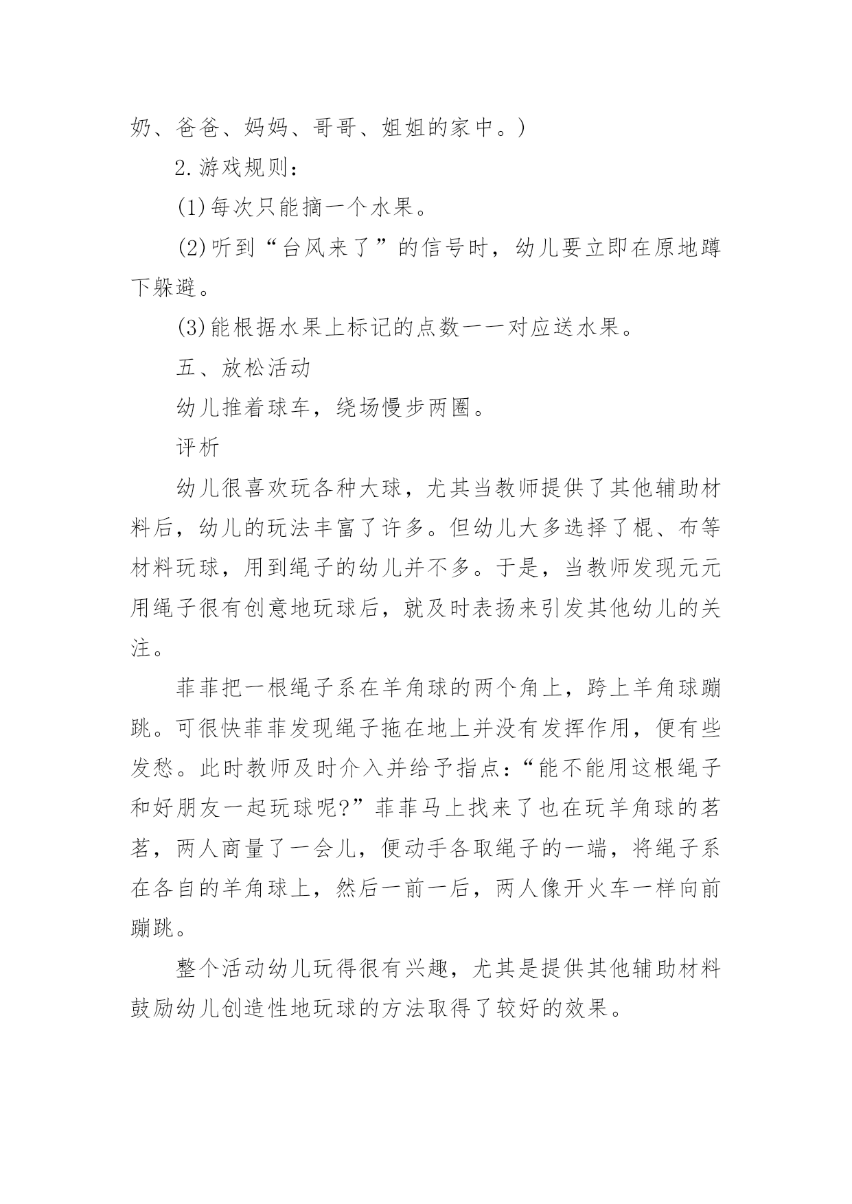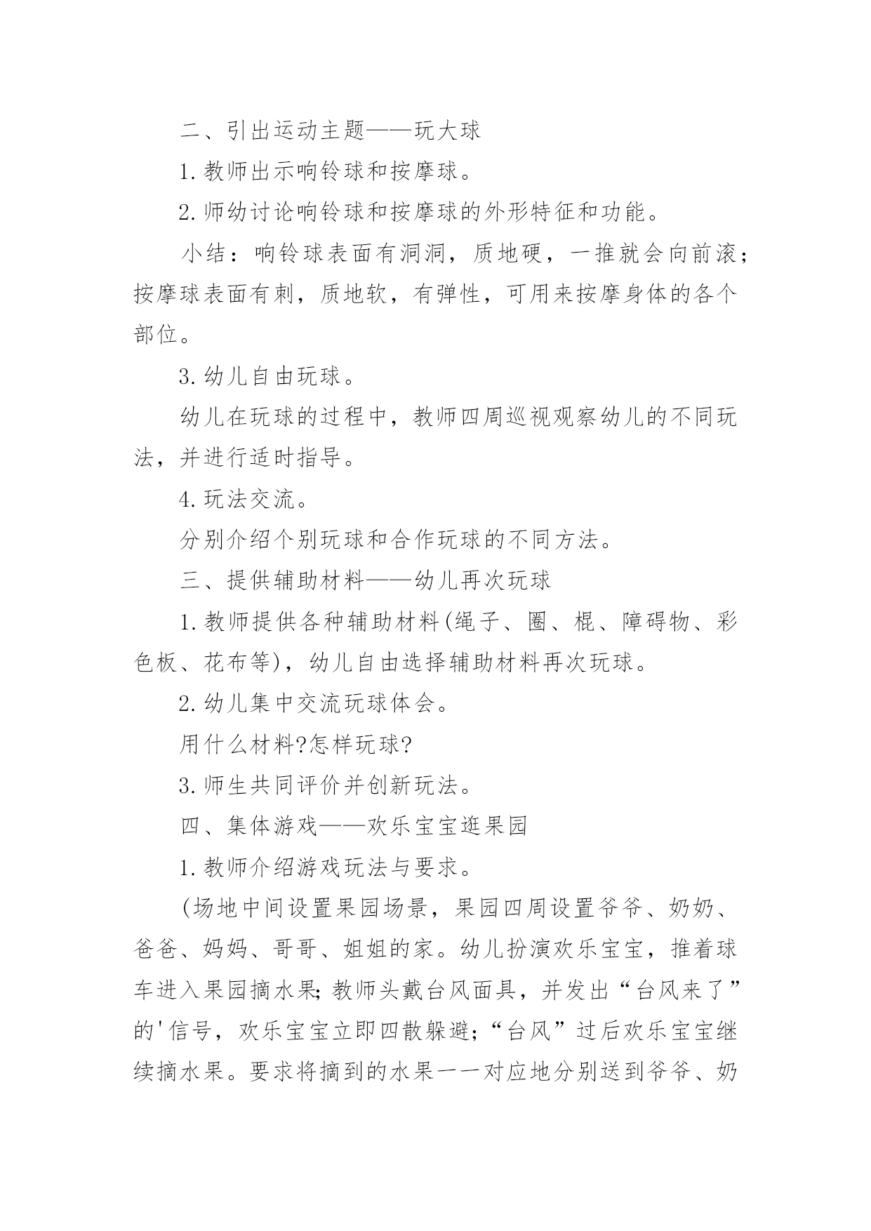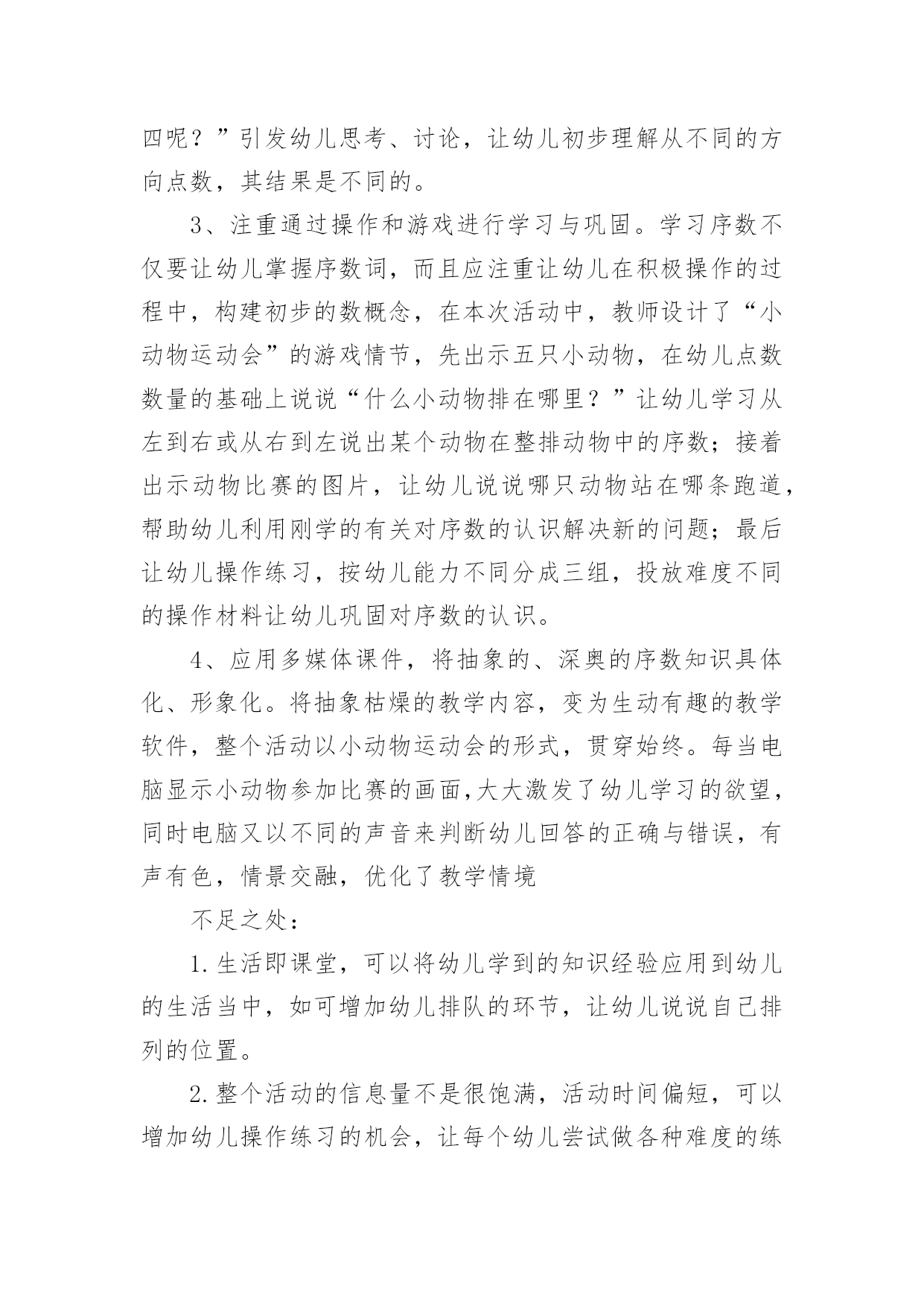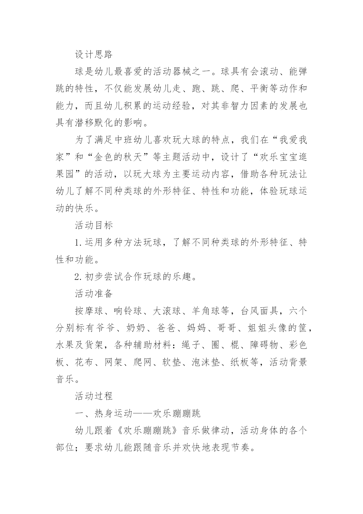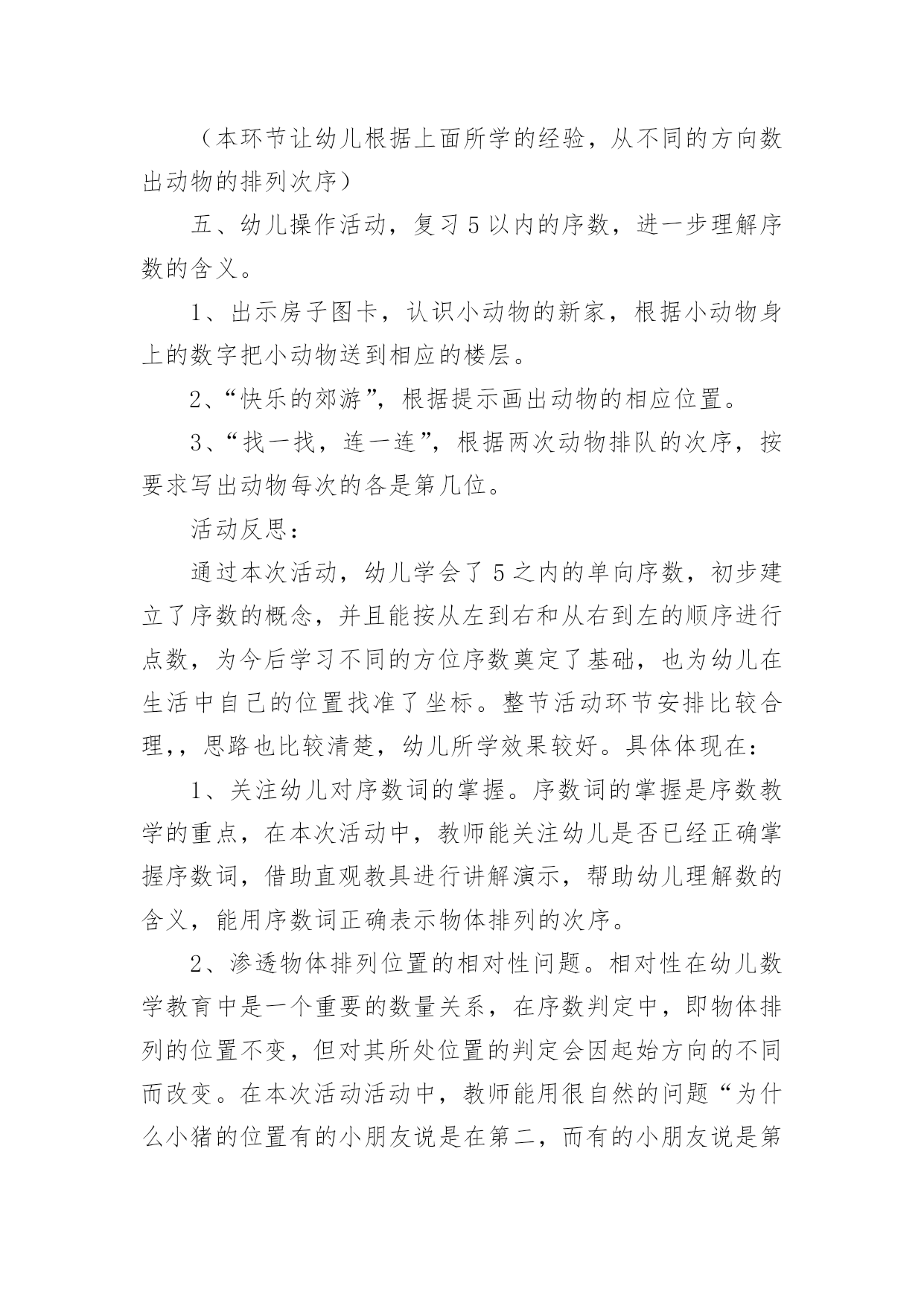 幼儿园运动教案幼儿园运动教案14篇作为一名教职工,往往需要进行教案编写工作,教案有助于顺利而有效地开展教学活动。来参考自己需要的教案吧!以下是小编为大家整理的幼儿园运动教案,仅供参考,大家一起来看看吧。幼儿园运动教案篇1活动目标:1.理解序数的含义,能用序数词正确表示5以内物体排列的次序。2.从不同的方向(从左到右、从右到左)判定某一物体所处的位置,初步理解物体的排列位置因起始方向的变化而不同。3.在活动中,让幼儿体验与同伴共游戏的快乐,乐意与同伴一起游戏。4.通过活动幼儿学会游戏,感受游戏的乐趣。5.使小朋友们感到快乐、好玩,在不知不觉中应经学习了知识。活动准备:“动物运动会”课件、小动物图片若干、房子图卡、幼儿操作卡活动过程:一、以“小动物参加运动会”引入活动,引导幼儿复习5以内的数。师:小朋友,你们知道什么是运动会吗?幼儿1:知道,就是比赛幼儿2:有赛跑、游泳、打球幼儿3:还要评出冠军什么的。师:今天森林里的小动物要开运动会,(出示小动物图片)我们一起来看看来了几只小动物?它们是谁?幼:有狮子、小羊、兔子、牛、猪,一共五只小动物。(孩子们运动会还是比较熟悉的,可是老师这个问题的提出,引发了孩子们诸多的讨论。孩子们对动物运动会的话题比较感兴趣,注意力一下就集中过来,并且很快数出动物的数量)二、游戏:“小动物排队”。教师引导幼儿用序数词正确表述物体在数列中的位置。师:五只小动物很快排好了队伍,(出示图片2)请小朋友说说小猪排在哪里?幼儿1:小猪排在第四。师:你是怎么数的?(请这名幼儿示范点数)(教师提问各种动物排在哪里?)师:你们对小猪排在哪里有不同意见的吗?幼儿2:排在第二师:你也来数数怎么是第二呢?(请这名幼儿示范点数)(让幼儿掌握序数词是本环节的重点,教师的提问是小动物排在哪里而不是排在第几,能较好的达成目标一。从幼儿的回答中可以看出,幼儿对序数的掌握是比较清楚的.,能很快说出每种动物所处的位置。教师抛出问题“还有什么不同意见?”引导幼儿思考为什么同一种动物会有不同的排列位置,引出下个环节。)三、引导幼儿初步理解物体的排列位置因起始方向的变化而不同。师:为什么小猪一会儿是排在第四一会儿又排在第二了呢?幼儿1:第四是从这边数起的(中班孩子还分不大清楚左右),第二是从另外一边数的。幼儿2:从不同边数第几就不一样了。师小结:判断一个物体所处的位置时,由于方向的不同,物体所处的位置也会发生变化。(相对性问题在序数的判定中是一个比较重要的问题,也是幼儿学习序数中的难点问题。本环节通过让幼儿观察、比较、思考,孩子们很快明白了数排列变化的问题。)四、以“比赛开始了”(出示图片3)复习判断5以内物体所处的位置。师:小动物们开始比赛了,我们来看看他们比赛什么项目?幼儿1:是赛跑啊师:请小朋友们来说说ⅹⅹ动物排在第几,从哪开始数的?(本环节让幼儿根据上面所学的经验,从不同的方向数出动物的排列次序)五、幼儿操作活动,复习5以内的序数,进一步理解序数的含义。1、出示房子图卡,认识小动物的新家,根据小动物身上的数字把小动物送到相应的楼层。2、“快乐的郊游”,根据提示画出动物的相应位置。3、“找一找,连一连”,根据两次动物排队的次序,按要求写出动物每次的各是第几位。活动反思:通过本次活动,幼儿学会了5之内的单向序数,初步建立了序数的概念,并且能按从左到右和从右到左的顺序进行点数,为今后学习不同的方位序数奠定了基础,也为幼儿在生活中自己的位置找准了坐标。整节活动环节安排比较合理,,思路也比较清楚,幼儿所学效果较好。具体体现在:1、关注幼儿对序数词的掌握。序数词的掌握是序数教学的重点,在本次活动中,教师能关注幼儿是否已经正确掌握序数词,借助直观教具进行讲解演示,帮助幼儿理解数的含义,能用序数词正确表示物体排列的次序。2、渗透物体排列位置的相对性问题。相对性在幼儿数学教育中是一个重要的数量关系,在序数判定中,即物体排列的位置不变,但对其所处位置的判定会因起始方向的不同而改变。在本次活动活动中,教师能用很自然的问题“为什么小猪的位置有的小朋友说是在第二,而有的小朋友说是第四呢?”引发幼儿思考、讨论,让幼儿初步理解从不同的方向点数,其结果是不同的。3、注重通过操作和游戏进行学习与巩固。学习序数不仅要让幼儿掌握序数词,而且应注重让幼儿在积极操作的过程中,构建初步的数概念,在本次活动中,教师设计了“小动物运动会”的游戏情节,先出示五只小动物,在幼儿点数数量的基础上说说“什么小动物排在哪里?”让幼儿学习从左到右或从右到左说出某个动物在整排动物中的序数;接着出示动物比赛的图片,让幼儿说说哪只动物站在哪条跑道,帮助幼儿利用刚学的有关对序数的认识解决新的问题;最后让幼儿操作练习,按幼儿能力不同分成三组,投放难度不同的操作材料让幼儿巩固对序数的认识。4、应用多媒体课