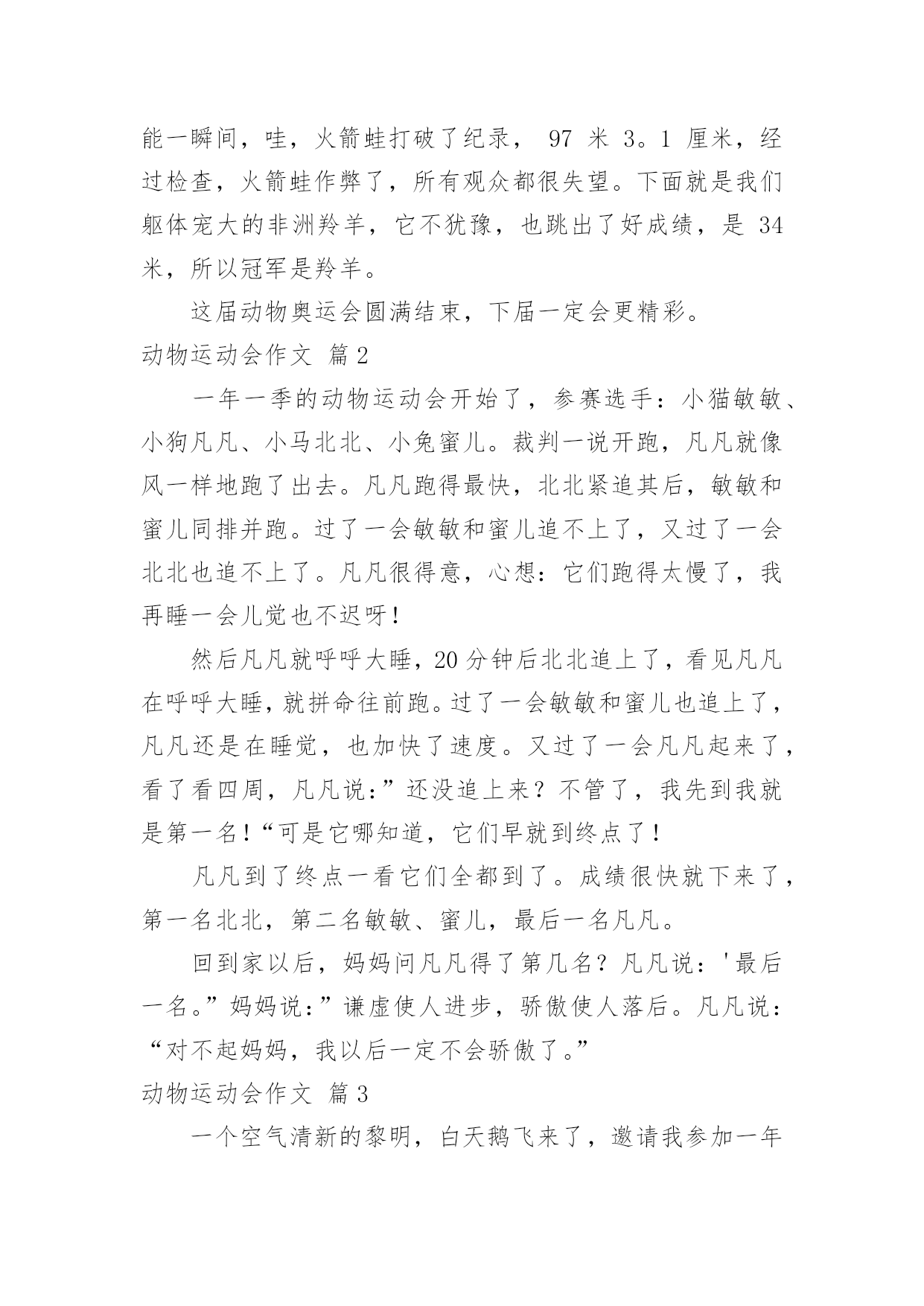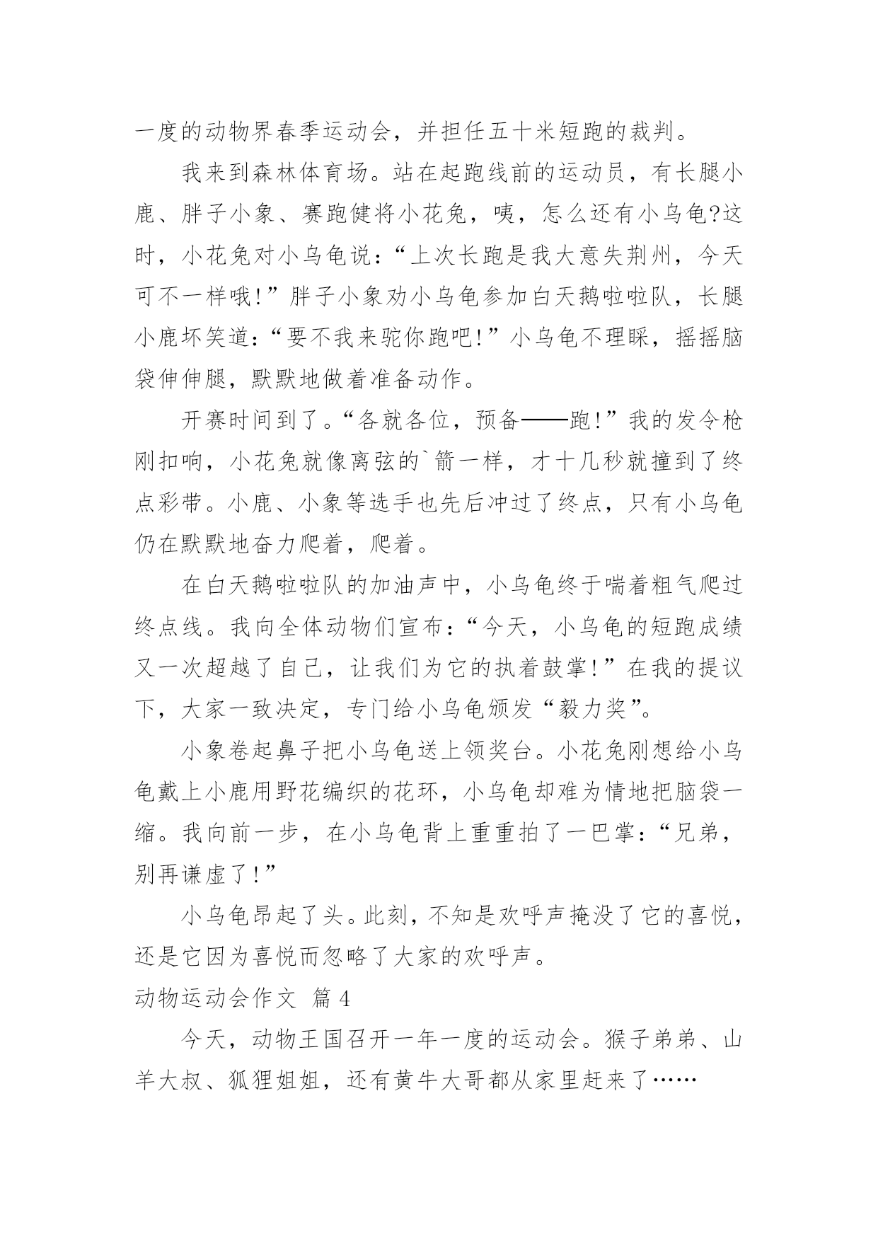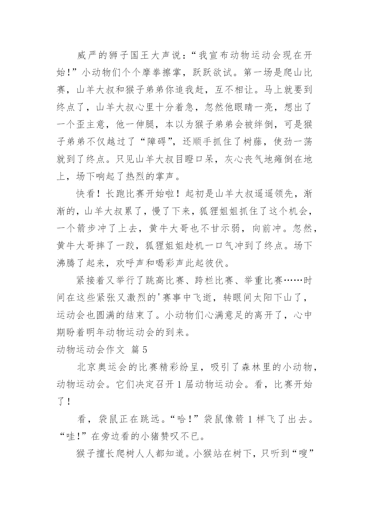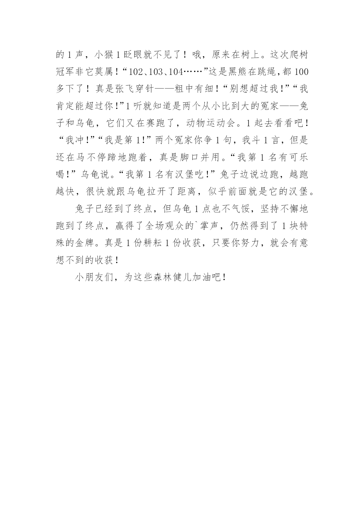 动物运动会作文【推荐】动物运动会作文汇总五篇在学习、工作乃至生活中,大家都有写作文的经历,对作文很是熟悉吧,根据写作命题的特点,作文可以分为命题作文和非命题作文。相信许多人会觉得作文很难写吧,下面是小编整理的动物运动会作文5篇,欢迎大家分享。动物运动会作文篇1人类在我国首都举行了奥运会,动物朋友们看了不服气,于是也热热闹闹得举行了一场动物奥运会。奥运会一开始,动物们纷纷议论自己该干吗、参加什么运动项目。十天后,报名表出来了,豹子、兔子和马儿参加了跑步,袋鼠、火箭蛙和羚羊参加了跳远比赛,金鱼、青蛙和鲨鱼参加了游泳比赛……最动人心的要数300米跑步比赛啦!各位运动员们都随着裁判员的一声令下,运动员们开跑了,所有观众的呐喊声冲入云霄,比赛可精彩了,情况不妙,豹子现在在最后一位了,雄马领先了。豹子不气馁,发挥出自己最好的水平,赢得了冠军,观众们也为豹子捏了一把汗。最具影响力的`跳远比赛开始了,袋鼠怕自己状态不佳,放弃比赛,由青蛙代替袋鼠,比赛开始了,青蛙一个劲的往前跳,哇,太厉害了!成绩是17米2。3厘米,下面是我们的小王子火箭蛙,那可厉害了喽,火箭蛙毫不犹豫,在哪能一瞬间,哇,火箭蛙打破了纪录,97米3。1厘米,经过检查,火箭蛙作弊了,所有观众都很失望。下面就是我们躯体宠大的非洲羚羊,它不犹豫,也跳出了好成绩,是34米,所以冠军是羚羊。这届动物奥运会圆满结束,下届一定会更精彩。动物运动会作文篇2一年一季的动物运动会开始了,参赛选手:小猫敏敏、小狗凡凡、小马北北、小兔蜜儿。裁判一说开跑,凡凡就像风一样地跑了出去。凡凡跑得最快,北北紧追其后,敏敏和蜜儿同排并跑。过了一会敏敏和蜜儿追不上了,又过了一会北北也追不上了。凡凡很得意,心想:它们跑得太慢了,我再睡一会儿觉也不迟呀!然后凡凡就呼呼大睡,20分钟后北北追上了,看见凡凡在呼呼大睡,就拼命往前跑。过了一会敏敏和蜜儿也追上了,凡凡还是在睡觉,也加快了速度。又过了一会凡凡起来了,看了看四周,凡凡说:”还没追上来?不管了,我先到我就是第一名!“可是它哪知道,它们早就到终点了!凡凡到了终点一看它们全都到了。成绩很快就下来了,第一名北北,第二名敏敏、蜜儿,最后一名凡凡。回到家以后,妈妈问凡凡得了第几名?凡凡说:'最后一名。”妈妈说:”谦虚使人进步,骄傲使人落后。凡凡说:“对不起妈妈,我以后一定不会骄傲了。”动物运动会作文篇3一个空气清新的黎明,白天鹅飞来了,邀请我参加一年一度的动物界春季运动会,并担任五十米短跑的裁判。我来到森林体育场。站在起跑线前的运动员,有长腿小鹿、胖子小象、赛跑健将小花兔,咦,怎么还有小乌龟?这时,小花兔对小乌龟说:“上次长跑是我大意失荆州,今天可不一样哦!”胖子小象劝小乌龟参加白天鹅啦啦队,长腿小鹿坏笑道:“要不我来驼你跑吧!”小乌龟不理睬,摇摇脑袋伸伸腿,默默地做着准备动作。开赛时间到了。“各就各位,预备──跑!”我的发令枪刚扣响,小花兔就像离弦的`箭一样,才十几秒就撞到了终点彩带。小鹿、小象等选手也先后冲过了终点,只有小乌龟仍在默默地奋力爬着,爬着。在白天鹅啦啦队的加油声中,小乌龟终于喘着粗气爬过终点线。我向全体动物们宣布:“今天,小乌龟的短跑成绩又一次超越了自己,让我们为它的执着鼓掌!”在我的提议下,大家一致决定,专门给小乌龟颁发“毅力奖”。小象卷起鼻子把小乌龟送上领奖台。小花兔刚想给小乌龟戴上小鹿用野花编织的花环,小乌龟却难为情地把脑袋一缩。我向前一步,在小乌龟背上重重拍了一巴掌:“兄弟,别再谦虚了!”小乌龟昂起了头。此刻,不知是欢呼声掩没了它的喜悦,还是它因为喜悦而忽略了大家的欢呼声。动物运动会作文篇4今天,动物王国召开一年一度的运动会。猴子弟弟、山羊大叔、狐狸姐姐,还有黄牛大哥都从家里赶来了……威严的狮子国王大声说:“我宣布动物运动会现在开始!”小动物们个个摩拳擦掌,跃跃欲试。第一场是爬山比赛,山羊大叔和猴子弟弟你追我赶,互不相让。马上就要到终点了,山羊大叔心里十分着急,忽然他眼睛一亮,想出了一个歪主意,他一伸腿,本以为猴子弟弟会被绊倒,可是猴子弟弟不仅越过了“障碍”,还顺手抓住了树藤,使劲一荡就到了终点。只见山羊大叔目瞪口呆,灰心丧气地瘫倒在地上,场下响起了热烈的掌声。快看!长跑比赛开始啦!起初是山羊大叔遥遥领先,渐渐的,山羊大叔累了,慢了下来,狐狸姐姐抓住了这个机会,一个箭步冲了上去,黄牛大哥也不甘示弱,向前冲。忽然,黄牛大哥摔了一跤,狐狸姐姐趁机一口气冲到了终点。场下沸腾了起来,欢呼声和喝彩声此起彼伏。紧接着又举行了跳高比赛、跨栏比赛、举重比赛……时间在这些紧张又激烈的'赛事中飞逝,转眼间太阳下山了,运动会也圆满的结束了。小动物们心满意足的离开了,心中期盼着明年动物运动会的到来。动物运动会作文篇5北京奥运会的比赛精彩纷呈,吸引了森林里的小动物,动物运动