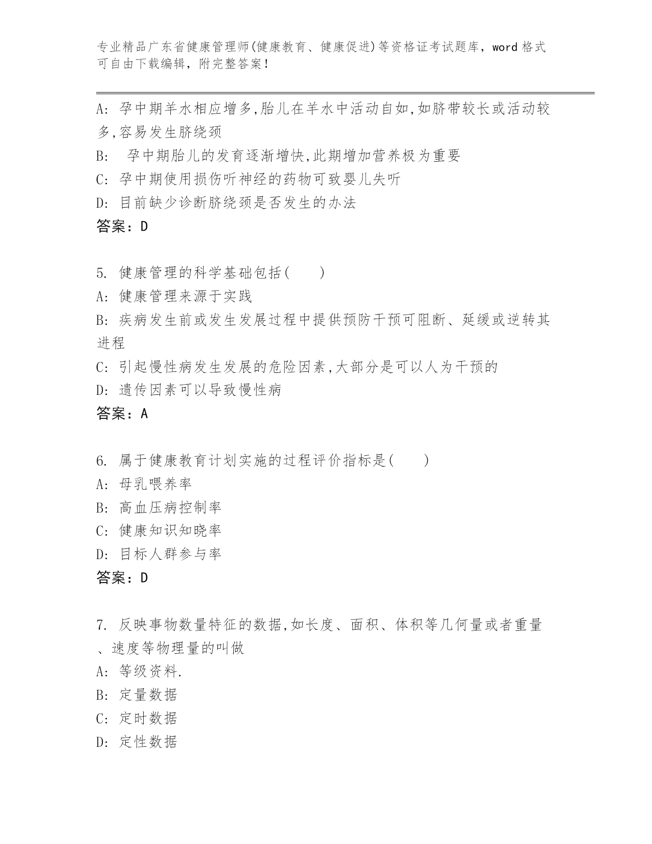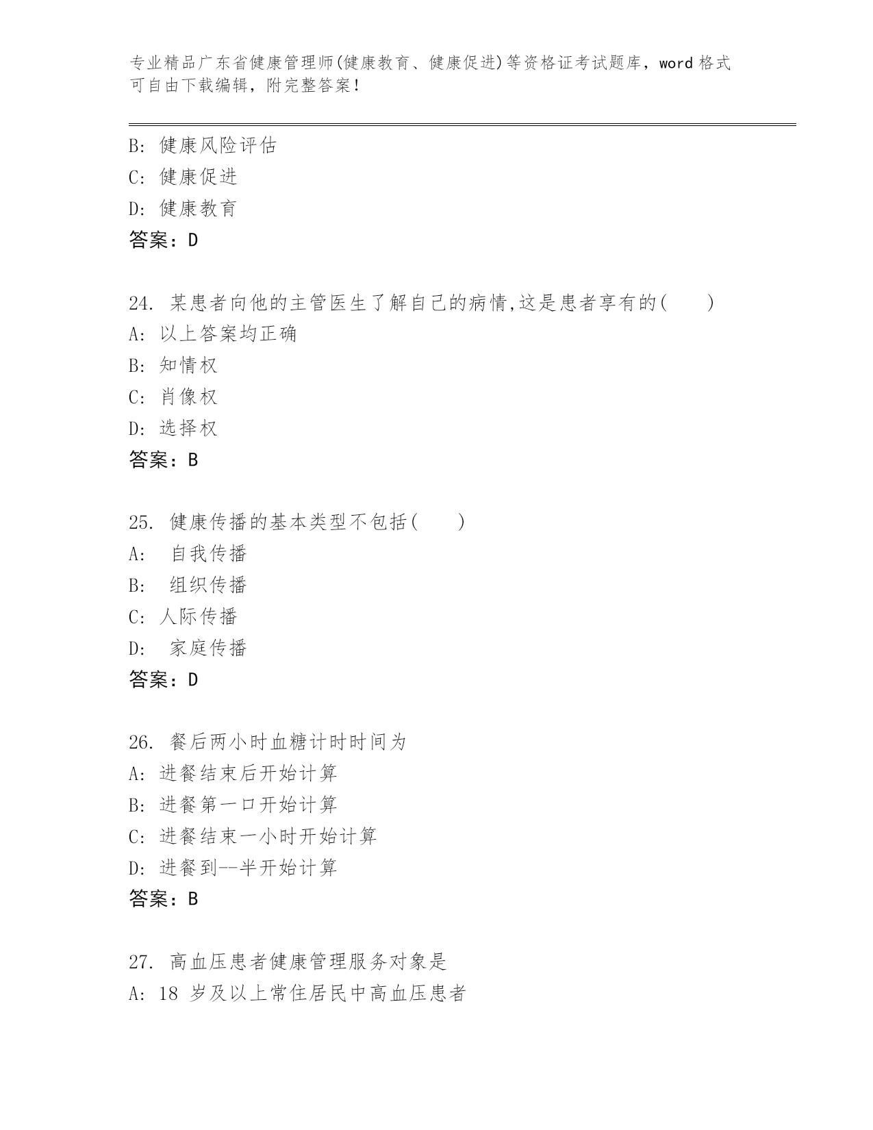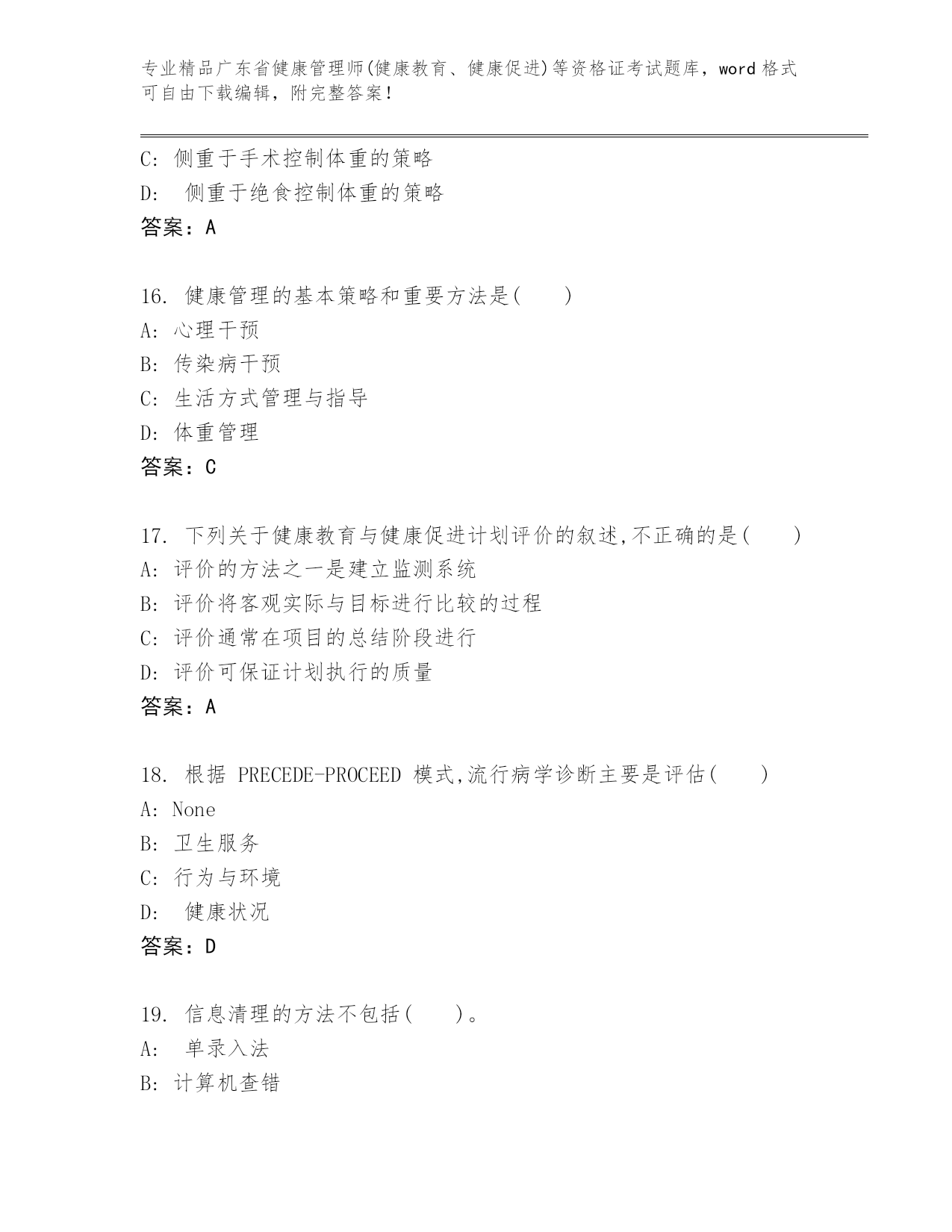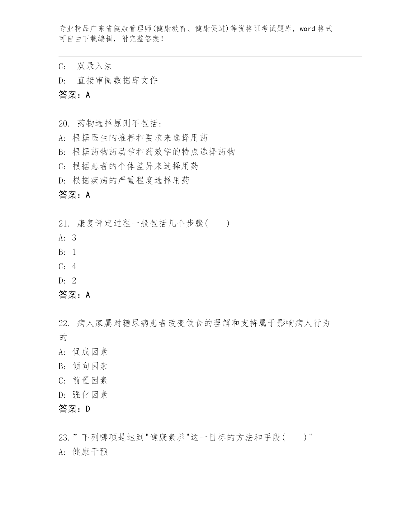 历年广东省健康管理师(健康教育、健康促进)等资格证考试完整版及参考答案AB卷