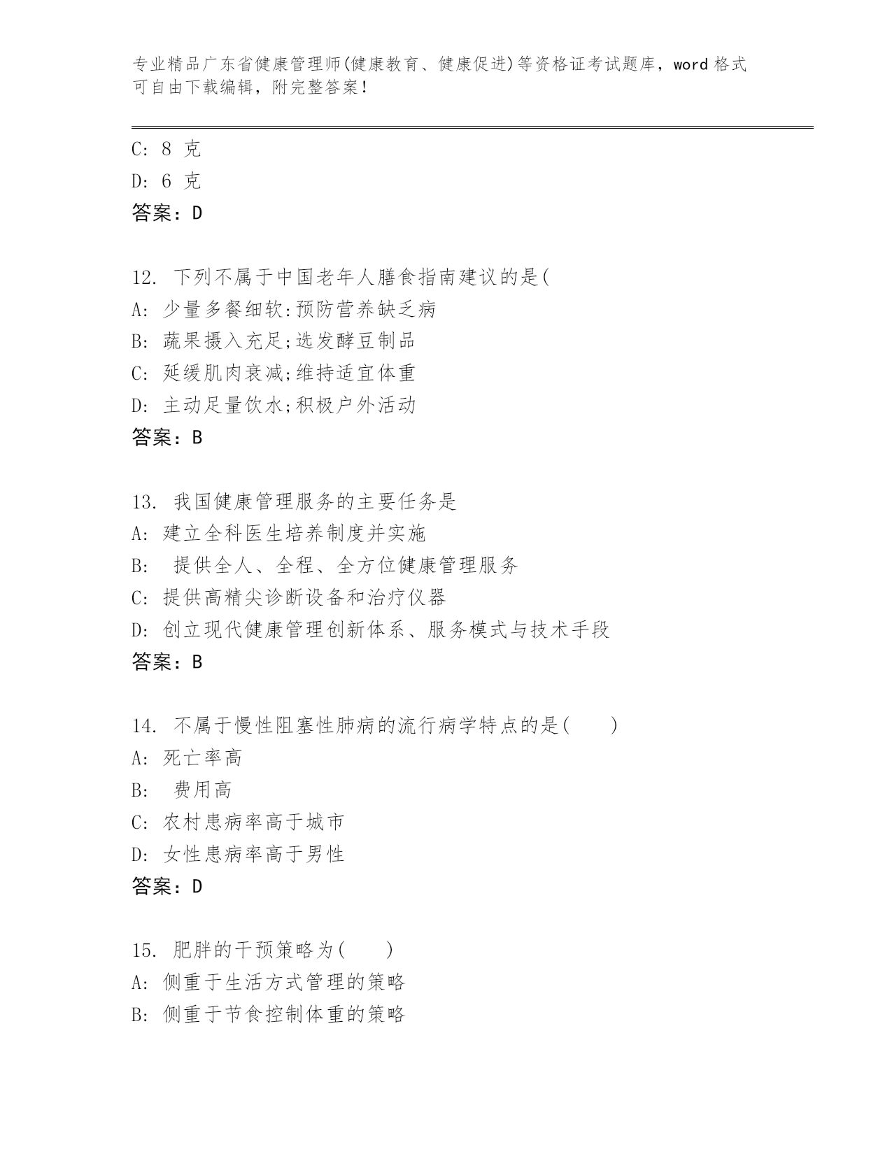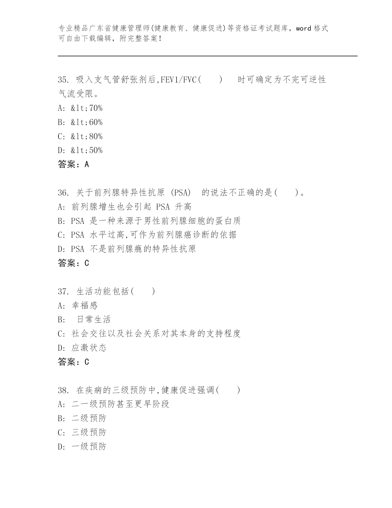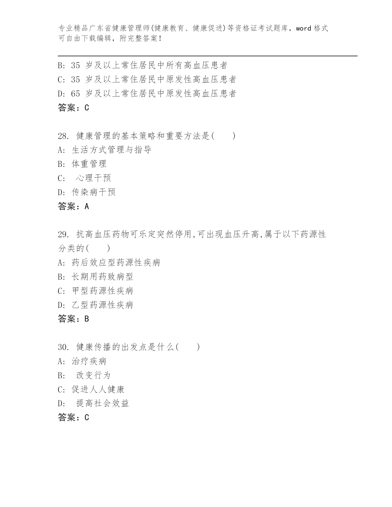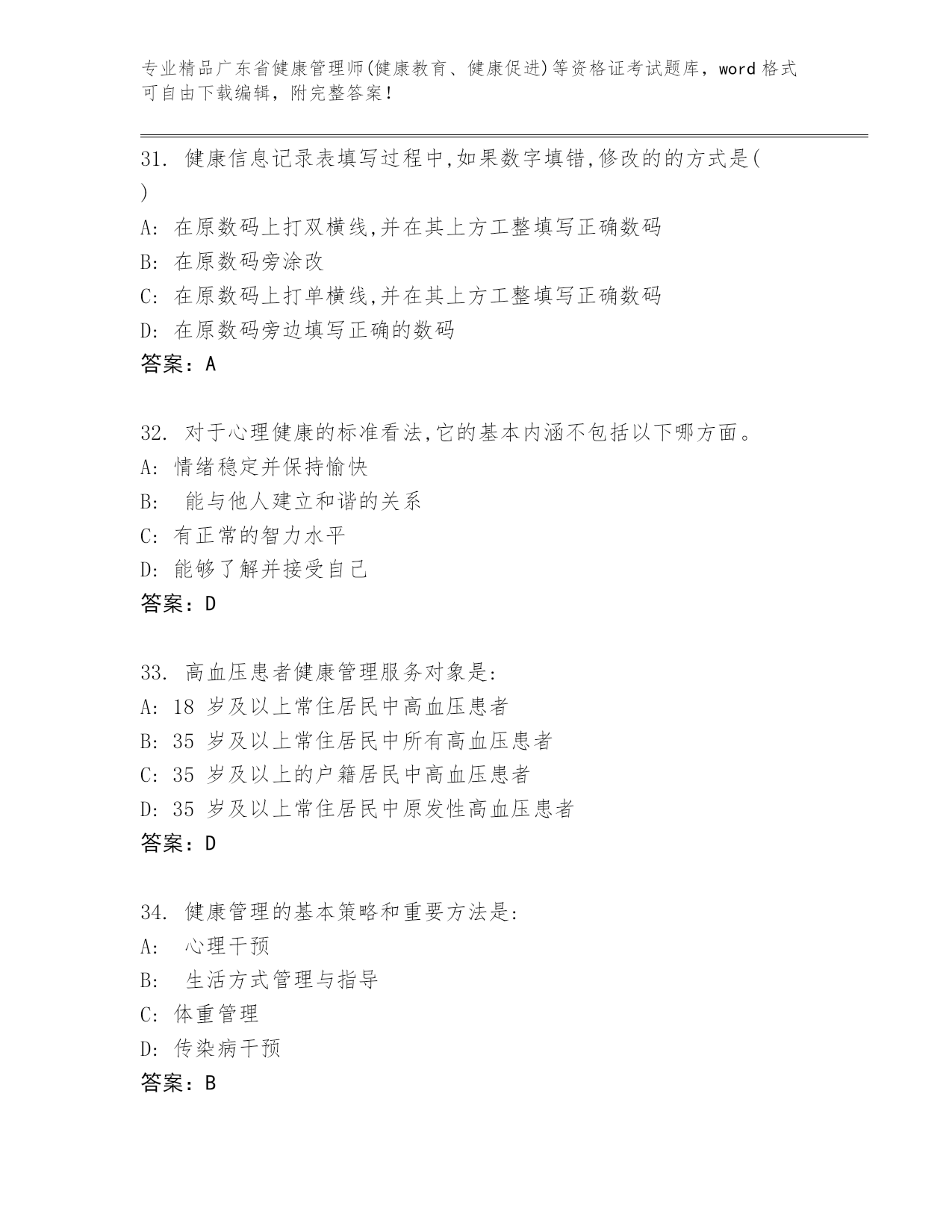 历年广东省健康管理师(健康教育、健康促进)等资格证考试完整版及参考答案AB卷