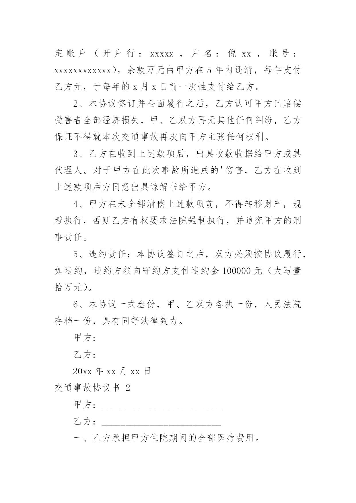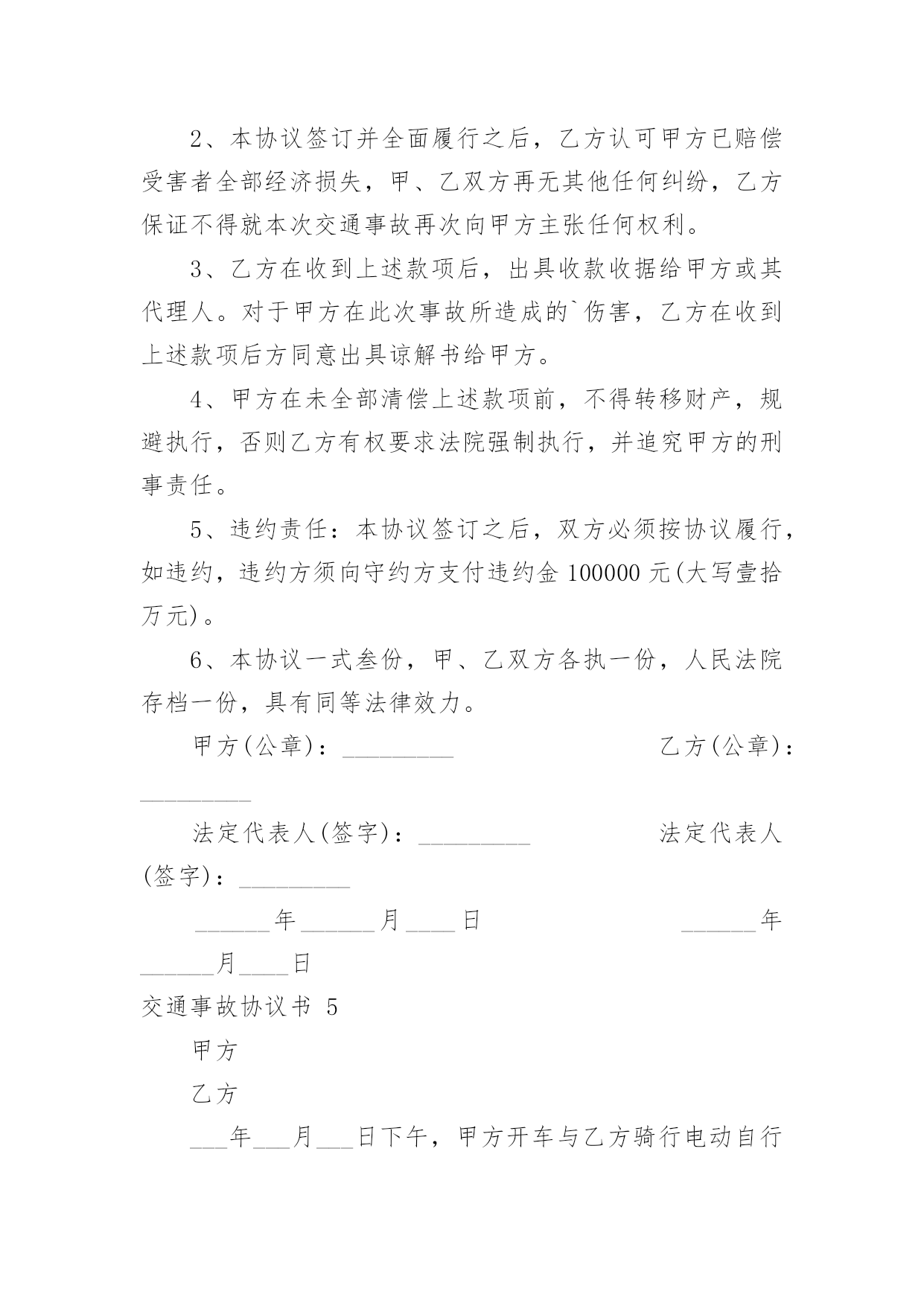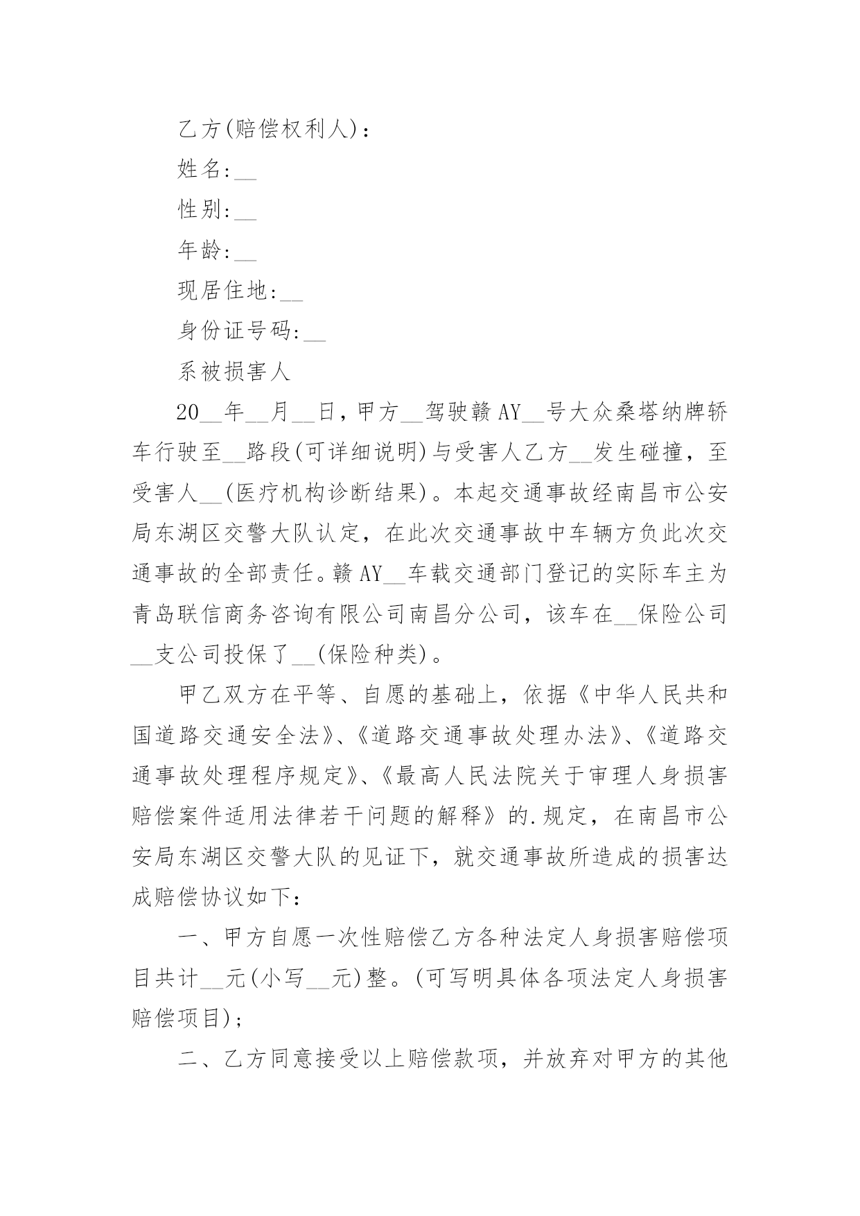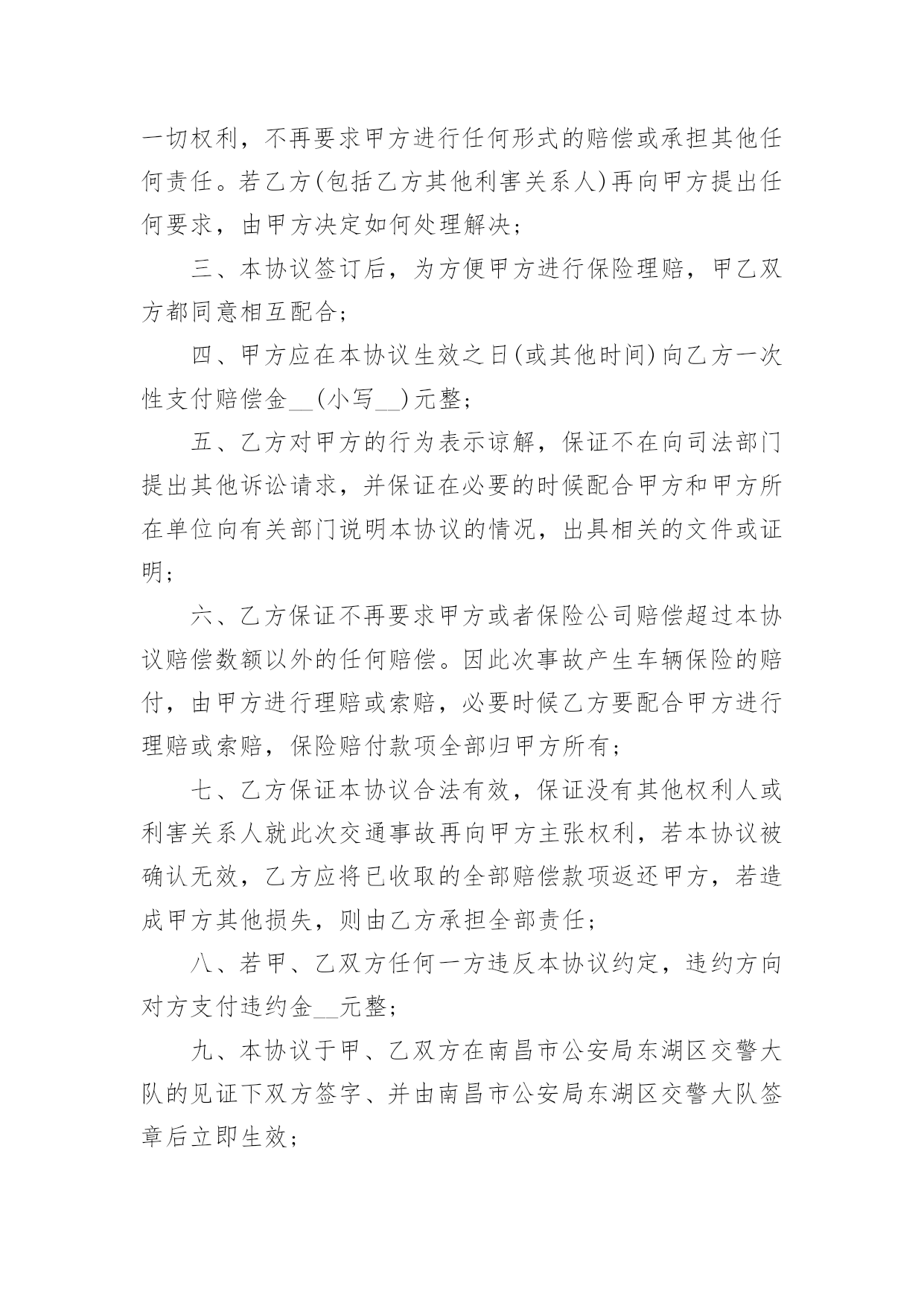 交通事故协议书交通事故协议书集合(15篇)随着社会不断地进步,协议使用的情况越来越多,协议协调着人与人,人与事之间的关系。到底应如何拟定协议呢?以下是小编帮大家整理的交通事故协议书,希望对大家有所帮助。交通事故协议书1甲方:乙方:事故经过:xx年xx月xx日x时许,王xx驾驶xxxxx号“xx”牌中型普通货车在xx省道由北向南行驶至xxx桥处时因超载并未确保安全车速行驶导致侧翻。造成车内乘坐的被害人张xx受伤经医院抢救无效死亡及车辆损坏的重大道路交通事故。以上事实有xx市公安局交通警察大队出具的x公交认字[2xxx]第xxxxx号《道路交通事故认定书》予以证实,该事故认定书认定王xx负事故全部责任,被害人张xx无过错行为。现甲、乙双方经过充分协商,达成如下和解协议:1、甲方在本协议签订当日一次性先赔偿乙方各项经济损失00000元整(大写壹拾万元整),由甲方转账至乙方指定账户(开户行:xxxxx,户名:倪xx,账号:xxxxxxxxxxxx)。余款万元由甲方在5年内还清,每年支付乙方元,于每年的x月x日前一次性支付给乙方。2、本协议签订并全面履行之后,乙方认可甲方已赔偿受害者全部经济损失,甲、乙双方再无其他任何纠纷,乙方保证不得就本次交通事故再次向甲方主张任何权利。3、乙方在收到上述款项后,出具收款收据给甲方或其代理人。对于甲方在此次事故所造成的'伤害,乙方在收到上述款项后方同意出具谅解书给甲方。4、甲方在未全部清偿上述款项前,不得转移财产,规避执行,否则乙方有权要求法院强制执行,并追究甲方的刑事责任。5、违约责任:本协议签订之后,双方必须按协议履行,如违约,违约方须向守约方支付违约金100000元(大写壹拾万元)。6、本协议一式叁份,甲、乙双方各执一份,人民法院存档一份,具有同等法律效力。甲方:乙方:20xx年xx月xx日交通事故协议书2甲方:_________________________乙方:_________________________一、乙方承担甲方住院期间的全部医疗费用。二、乙方赔偿甲方后续治疗、劳务和精神损失费肆千元(4000元)。3、甲方在月日下午出院后对身体和胎儿承担异常责任。4、本协议签订时,乙方通过事故处理向警方支付甲方4000元(4000元),视为本案纠纷立即结束。甲方确认乙方立即起诉与本案无关。5、双方均承认上述赔偿事项。甲方承诺不再提起与本案有关的诉讼和仲裁。今后,乙方将不再对甲方受伤和怀孕的'任何变化承担任何法律责任。6、本协议一式三份,甲乙双方各持一份,交警部门留一份。三份均为本协议原件,具有同等法律效力。赔偿收据原件由乙方收取,复印件留存交警部门档案备查。甲方:_________________________乙方:_________________________交通事故协议书3甲方(赔偿义务人):姓名:__性别:__年龄:__现居住地:__身份证号码:__工作单位:__系赣AY__车辆驾驶员乙方(赔偿权利人):姓名:__性别:__年龄:__现居住地:__身份证号码:__系被损害人20__年__月__日,甲方__驾驶赣AY__号大众桑塔纳牌轿车行驶至__路段(可详细说明)与受害人乙方__发生碰撞,至受害人__(医疗机构诊断结果)。本起交通事故经南昌市公安局东湖区交警大队认定,在此次交通事故中车辆方负此次交通事故的全部责任。赣AY__车载交通部门登记的实际车主为青岛联信商务咨询有限公司南昌分公司,该车在__保险公司__支公司投保了__(保险种类)。甲乙双方在平等、自愿的基础上,依据《中华人民共和国道路交通安全法》、《道路交通事故处理办法》、《道路交通事故处理程序规定》、《最高人民法院关于审理人身损害赔偿案件适用法律若干问题的解释》的.规定,在南昌市公安局东湖区交警大队的见证下,就交通事故所造成的损害达成赔偿协议如下:一、甲方自愿一次性赔偿乙方各种法定人身损害赔偿项目共计__元(小写__元)整。(可写明具体各项法定人身损害赔偿项目);二、乙方同意接受以上赔偿款项,并放弃对甲方的其他一切权利,不再要求甲方进行任何形式的赔偿或承担其他任何责任。若乙方(包括乙方其他利害关系人)再向甲方提出任何要求,由甲方决定如何处理解决;三、本协议签订后,为方便甲方进行保险理赔,甲乙双方都同意相互配合;四、甲方应在本协议生效之日(或其他时间)向乙方一次性支付赔偿金__(小写__)元整;五、乙方对甲方的行为表示谅解,保证不在向司法部门提出其他诉讼请求,并保证在必要的时候配合甲方和甲方所在单位向有关部门说明本协议的情况,出具相关的文件或证明;六、乙方保证不再要求甲方或者保险公司赔偿超过本协议赔偿数额以外的任何赔偿。因此次事故产生车辆保险的赔付,由甲方进行理赔或索赔,必要时候乙方要配合甲方进行理赔或索赔,保险赔付款