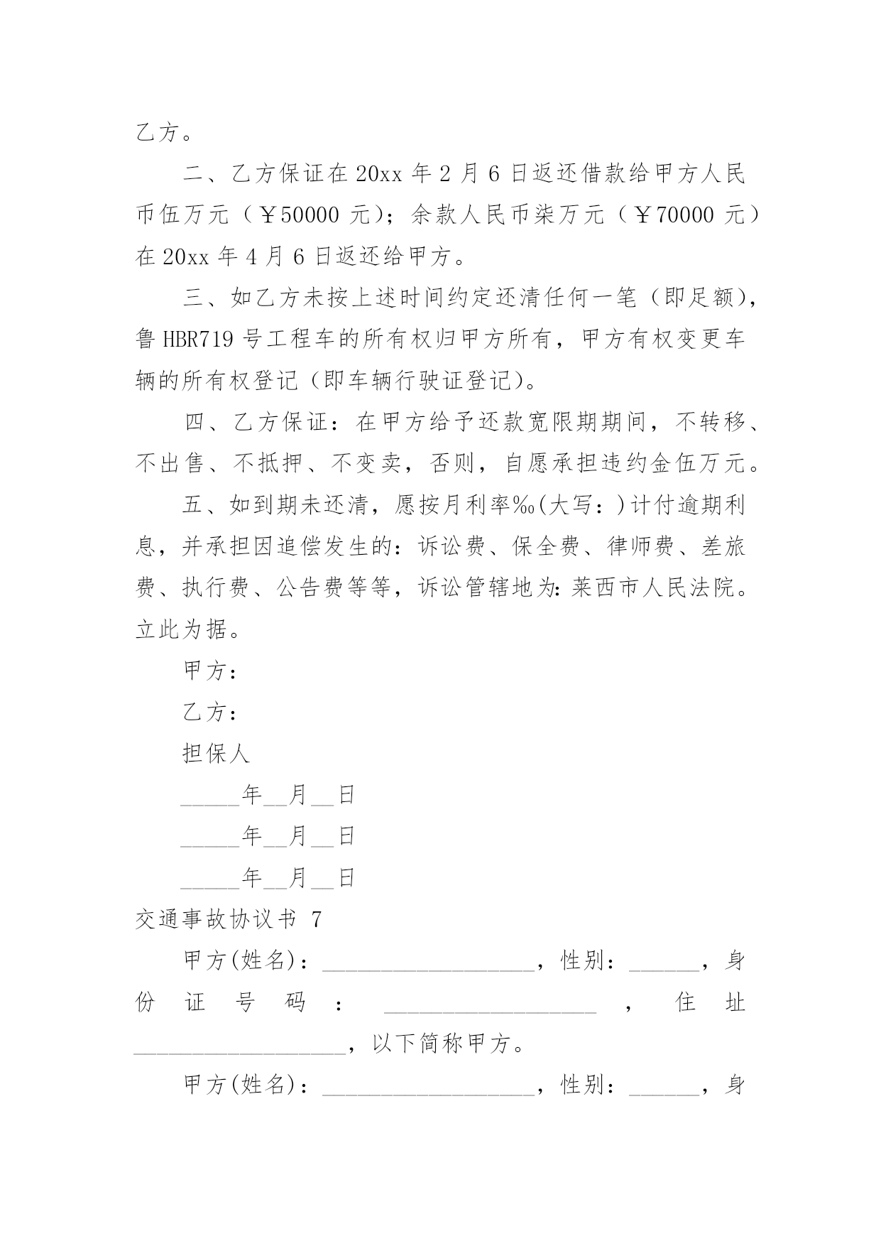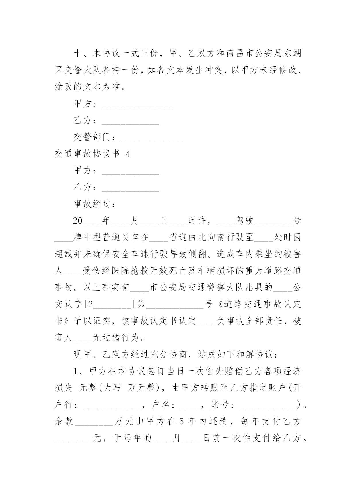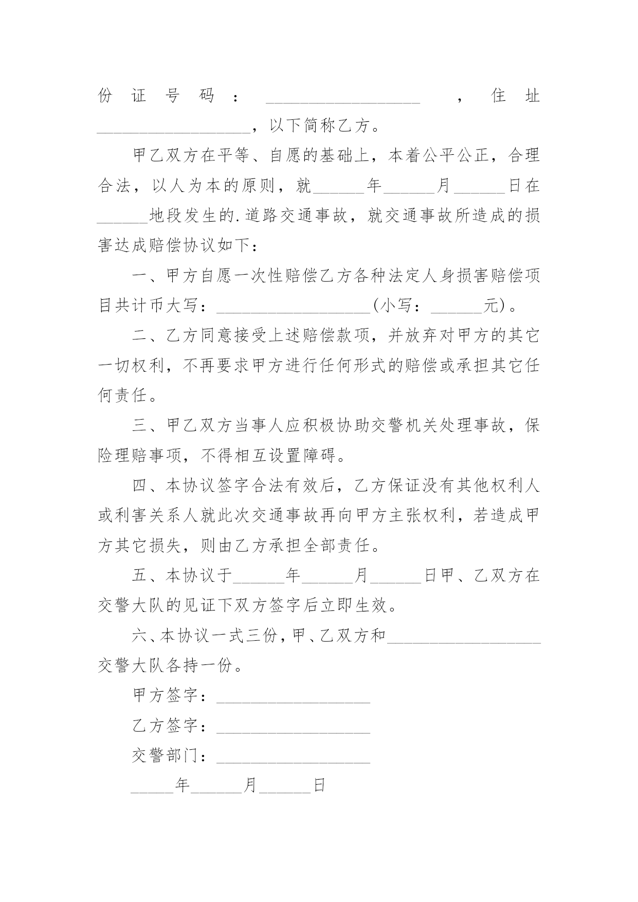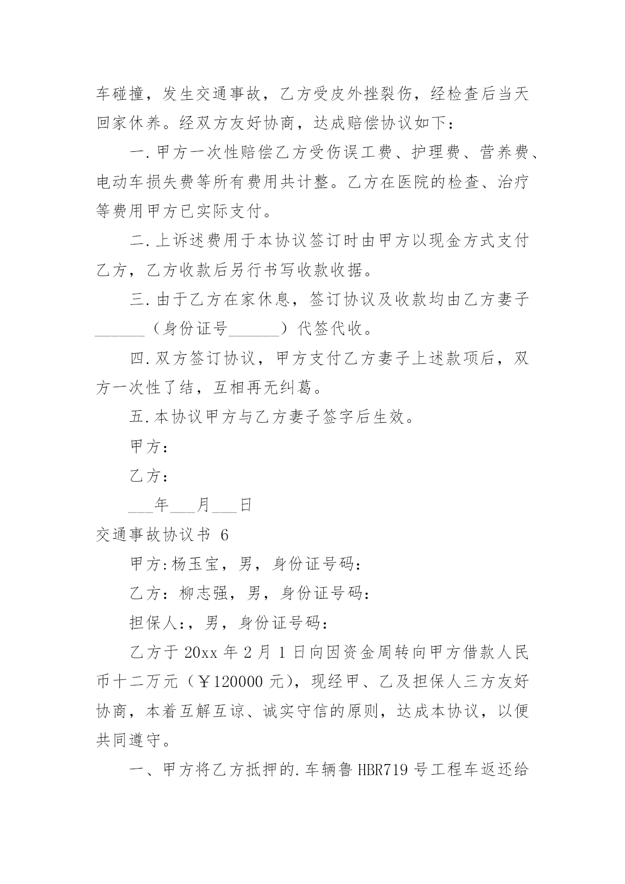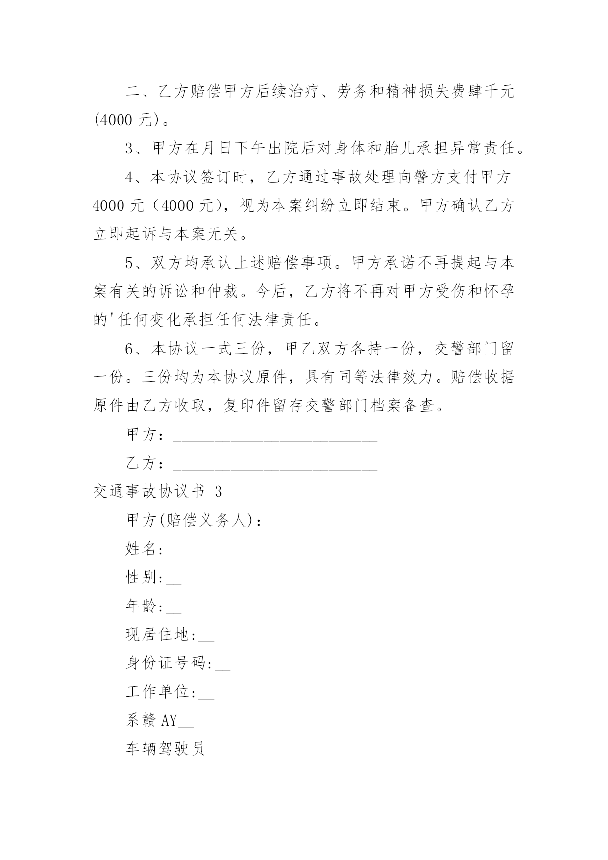 交通事故协议书交通事故协议书集合(15篇)随着社会不断地进步,协议使用的情况越来越多,协议协调着人与人,人与事之间的关系。到底应如何拟定协议呢?以下是小编帮大家整理的交通事故协议书,希望对大家有所帮助。交通事故协议书1甲方:乙方:事故经过:xx年xx月xx日x时许,王xx驾驶xxxxx号“xx”牌中型普通货车在xx省道由北向南行驶至xxx桥处时因超载并未确保安全车速行驶导致侧翻。造成车内乘坐的被害人张xx受伤经医院抢救无效死亡及车辆损坏的重大道路交通事故。以上事实有xx市公安局交通警察大队出具的x公交认字[2xxx]第xxxxx号《道路交通事故认定书》予以证实,该事故认定书认定王xx负事故全部责任,被害人张xx无过错行为。现甲、乙双方经过充分协商,达成如下和解协议:1、甲方在本协议签订当日一次性先赔偿乙方各项经济损失00000元整(大写壹拾万元整),由甲方转账至乙方指定账户(开户行:xxxxx,户名:倪xx,账号:xxxxxxxxxxxx)。余款万元由甲方在5年内还清,每年支付乙方元,于每年的x月x日前一次性支付给乙方。2、本协议签订并全面履行之后,乙方认可甲方已赔偿受害者全部经济损失,甲、乙双方再无其他任何纠纷,乙方保证不得就本次交通事故再次向甲方主张任何权利。3、乙方在收到上述款项后,出具收款收据给甲方或其代理人。对于甲方在此次事故所造成的'伤害,乙方在收到上述款项后方同意出具谅解书给甲方。4、甲方在未全部清偿上述款项前,不得转移财产,规避执行,否则乙方有权要求法院强制执行,并追究甲方的刑事责任。5、违约责任:本协议签订之后,双方必须按协议履行,如违约,违约方须向守约方支付违约金100000元(大写壹拾万元)。6、本协议一式叁份,甲、乙双方各执一份,人民法院存档一份,具有同等法律效力。甲方:乙方:20xx年xx月xx日交通事故协议书2甲方:_________________________乙方:_________________________一、乙方承担甲方住院期间的全部医疗费用。二、乙方赔偿甲方后续治疗、劳务和精神损失费肆千元(4000元)。3、甲方在月日下午出院后对身体和胎儿承担异常责任。4、本协议签订时,乙方通过事故处理向警方支付甲方4000元(4000元),视为本案纠纷立即结束。甲方确认乙方立即起诉与本案无关。5、双方均承认上述赔偿事项。甲方承诺不再提起与本案有关的诉讼和仲裁。今后,乙方将不再对甲方受伤和怀孕的'任何变化承担任何法律责任。6、本协议一式三份,甲乙双方各持一份,交警部门留一份。三份均为本协议原件,具有同等法律效力。赔偿收据原件由乙方收取,复印件留存交警部门档案备查。甲方:_________________________乙方:_________________________交通事故协议书3甲方(赔偿义务人):姓名:__性别:__年龄:__现居住地:__身份证号码:__工作单位:__系赣AY__车辆驾驶员乙方(赔偿权利人):姓名:__性别:__年龄:__现居住地:__身份证号码:__系被损害人20__年__月__日,甲方__驾驶赣AY__号大众桑塔纳牌轿车行驶至__路段(可详细说明)与受害人乙方__发生碰撞,至受害人__(医疗机构诊断结果)。本起交通事故经南昌市公安局东湖区交警大队认定,在此次交通事故中车辆方负此次交通事故的全部责任。赣AY__车载交通部门登记的实际车主为青岛联信商务咨询有限公司南昌分公司,该车在__保险公司__支公司投保了__(保险种类)。甲乙双方在平等、自愿的基础上,依据《中华人民共和国道路交通安全法》、《道路交通事故处理办法》、《道路交通事故处理程序规定》、《最高人民法院关于审理人身损害赔偿案件适用法律若干问题的解释》的.规定,在南昌市公安局东湖区交警大队的见证下,就交通事故所造成的损害达成赔偿协议如下:一、甲方自愿一次性赔偿乙方各种法定人身损害赔偿项目共计__元(小写__元)整。(可写明具体各项法定人身损害赔偿项目);二、乙方同意接受以上赔偿款项,并放弃对甲方的其他一切权利,不再要求甲方进行任何形式的赔偿或承担其他任何责任。若乙方(包括乙方其他利害关系人)再向甲方提出任何要求,由甲方决定如何处理解决;三、本协议签订后,为方便甲方进行保险理赔,甲乙双方都同意相互配合;四、甲方应在本协议生效之日(或其他时间)向乙方一次性支付赔偿金__(小写__)元整;五、乙方对甲方的行为表示谅解,保证不在向司法部门提出其他诉讼请求,并保证在必要的时候配合甲方和甲方所在单位向有关部门说明本协议的情况,出具相关的文件或证明;六、乙方保证不再要求甲方或者保险公司赔偿超过本协议赔偿数额以外的任何赔偿。因此次事故产生车辆保险的赔付,由甲方进行理赔或索赔,必要时候乙方要配合甲方进行理赔或索赔,保险赔付款