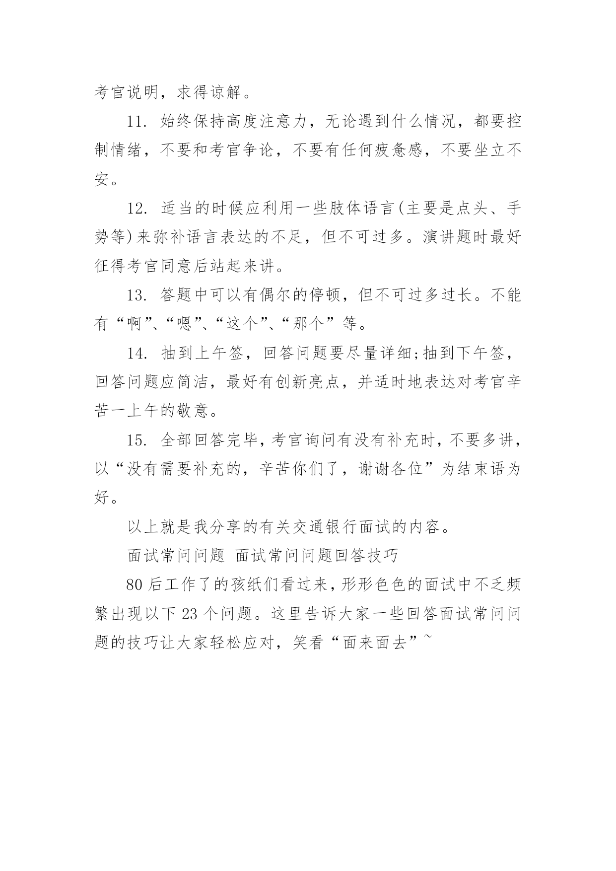 交通银行面试答题技巧交通银行面试答题技巧交通银行面试问题:你最崇拜谁?答题思路:1、最崇拜的人能在一定程度上反映应聘者的性格、观念、心态,这是面试官问该问题的主要原因。2、不宜说自己谁都不崇拜。3、不宜说崇拜自己。4、不宜说崇拜一个虚幻的、或是不知名的人。5、不宜说崇拜一个明显具有负面形象的人。6、所崇拜的人人最好与自己所应聘的工作能"搭"上关系。7、最好说出自己所崇拜的人的哪些品质、哪些思想感染着自己、鼓舞着自己。例如考生这样回答:是我的母亲。我的母亲是一个勤劳朴实的工人,母亲对我和姐姐的期望很高,并且一直无怨无悔的付出。在我读高中的时候,父亲失业,姐姐当时在上大学,母亲一个人供2个孩子上学,很不容易,可想而知,母亲付出了多大的艰辛和努力,并且要很大的毅力。银行面试过程中需要注意以下几点:1.听到考官对自己笔试通过的祝福后用微笑加谢谢应对。2.当考官导语读完,下达考试答题指令后,对考官说“谢谢”,然后说:“请让我考虑一下”或“请让我考虑几分钟”,“好的,我准备一下”。3.说普通话:语速要中等偏慢。4.四个题目,可以一题一题作答,每个题目前都可以略微思考一下。回答完一题,要说“回答完毕”。5.考虑时间不要太长,每个题目1-2分钟,可以打草稿,写要点,如果一时实在不知道从何答起,可用诸如“关于”之类的一句话缩短思考间隙,这也是不留痕迹地延长了思考时间;也可重复一下该题题目,这既给自己赢得了思考时间,也表示了对答题的重视。6.尽量用“一、二、三……”、“第一,第二,第三……”等句式;进行要点式答题,以显示自己的思路清晰有条理,也便于考官明明白白地去听你的回答。7.没听清题或自己一下子不知道怎么回答,可以请考官再读一遍题目,但不可超过两遍。有的地区有题本提供,则不存在这个问题。8.怎么想都不会回答时,不要浪费时间,坦率地承认,争取下一题答好。9.合理分配每一题的答题时间,不可太短,也不要超时。超时后立刻结束。10.保持适度的音量,保证考官听得到、听得清。提前几天保养好嗓子,不要痰多咳嗽、吐痰等。如果感冒,要向考官说明,求得谅解。11.始终保持高度注意力,无论遇到什么情况,都要控制情绪,不要和考官争论,不要有任何疲惫感,不要坐立不安。12.适当的时候应利用一些肢体语言(主要是点头、手势等)来弥补语言表达的不足,但不可过多。演讲题时最好征得考官同意后站起来讲。13.答题中可以有偶尔的停顿,但不可过多过长。不能有“啊”、“嗯”、“这个”、“那个”等。14.抽到上午签,回答问题要尽量详细;抽到下午签,回答问题应简洁,最好有创新亮点,并适时地表达对考官辛苦一上午的敬意。15.全部回答完毕,考官询问有没有补充时,不要多讲,以“没有需要补充的,辛苦你们了,谢谢各位”为结束语为好。以上就是我分享的有关交通银行面试的内容。面试常问问题面试常问问题回答技巧80后工作了的孩纸们看过来,形形色色的面试中不乏频繁出现以下23个问题。这里告诉大家一些回答面试常问问题的技巧让大家轻松应对,笑看“面来面去”~