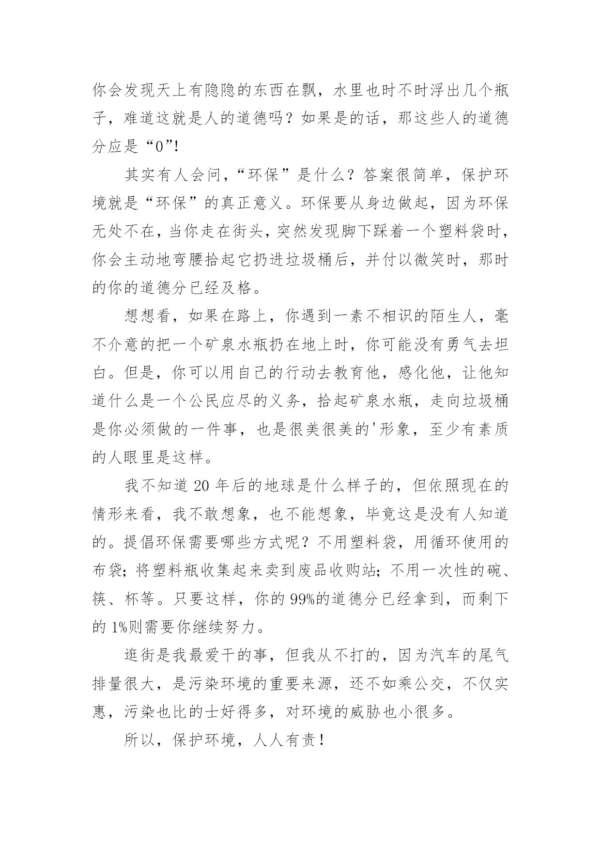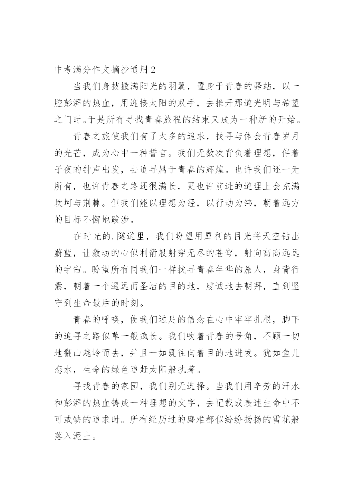 中考满分作文摘抄中考满分作文摘抄通用在平平淡淡的学习、工作、生活中,大家都经常接触到作文吧,作文可分为小学作文、中学作文、大学作文(论文)。那么你有了解过作文吗?下面是小编为大家收集的中考满分作文摘抄通用,仅供参考,大家一起来看看吧。中考满分作文摘抄通用1沿途的不仅仅是风景,还有那颗装着环保,建立环保的心!在21世纪里,环境卫生似乎对人们没有多大的影响,只要生活舒适,环境并不重要,环保二字显然被丢弃了。看看如今的乡村,再看看现代的城市,乡村远远好过城市的环境,曾经让人不适应,觉得是个不能让人成才的小农村,虽然没有城市舒适,但环境远比城市好得多,这也是一些小城人隐避回农村的理由。我觉得,我是一个没有理由拒绝环保的人,因为我是一名学生,是祖国的未来,想想以前,吃完的零食袋随手乱扔,手上的废纸会被我撕成小碎片飘在风中,当时的我觉得很有趣,现在的我觉得很无知。提倡环保是每一位社会公民的责任,因为我们需要健康,祖国需要健康,地球也需要健康!档您坐着缆车观赏风景时,你会觉得风光无限好,便掏出手机来拍照,可照片洗出来时,你会发现天上有隐隐的东西在飘,水里也时不时浮出几个瓶子,难道这就是人的道德吗?如果是的话,那这些人的道德分应是“0”!其实有人会问,“环保”是什么?答案很简单,保护环境就是“环保”的真正意义。环保要从身边做起,因为环保无处不在,当你走在街头,突然发现脚下踩着一个塑料袋时,你会主动地弯腰拾起它扔进垃圾桶后,并付以微笑时,那时的你的道德分已经及格。想想看,如果在路上,你遇到一素不相识的陌生人,毫不介意的把一个矿泉水瓶扔在地上时,你可能没有勇气去坦白。但是,你可以用自己的行动去教育他,感化他,让他知道什么是一个公民应尽的义务,拾起矿泉水瓶,走向垃圾桶是你必须做的一件事,也是很美很美的'形象,至少有素质的人眼里是这样。我不知道20年后的地球是什么样子的,但依照现在的情形来看,我不敢想象,也不能想象,毕竟这是没有人知道的。提倡环保需要哪些方式呢?不用塑料袋,用循环使用的布袋;将塑料瓶收集起来卖到废品收购站;不用一次性的碗、筷、杯等。只要这样,你的99%的道德分已经拿到,而剩下的1%则需要你继续努力。逛街是我最爱干的事,但我从不打的,因为汽车的尾气排量很大,是污染环境的重要来源,还不如乘公交,不仅实惠,污染也比的士好得多,对环境的威胁也小很多。所以,保护环境,人人有责!中考满分作文摘抄通用2当我们身披撒满阳光的羽翼,置身于青春的驿站,以一腔彭湃的热血,用迎接太阳的双手,去推开那道光明与希望之门时。于是所有寻找青春旅程的结束又成为一种新的开始。青春之旅使我们有了太多的追求,找寻与体会青春岁月的光芒,成为心中一种誓言。我们无数次背负着理想,伴着子夜的钟声出发,去追寻属于青春的辉煌。也许我们还一无所有,也许青春之路还很满长,更也许前进的道理上会充满坎坷与荆棘。但我们能以理想为经,以行动为纬,朝着远方的目标不懈地跋涉。在时光的.隧道里,我们盼望用犀利的目光将天空钻出蔚蓝,让激动的心似利箭般射穿无尽的苍穹,射向高高远远的宇宙。盼望所有同我们一样找寻青春年华的旅人,身背行囊,朝着一个遥远而圣洁的目的地,虔诚地去朝拜,直到坚守到生命最后的时刻。青春的呼唤,使我们远足的信念在心中牢牢扎根,脚下的追寻之路似草一般疯长。我们吹着青春的号角,不顾一切地翻山越岭而去,并且一如既往向着目的地进发。犹如鱼儿恋水,生命的绿色追赶太阳般执著。寻找青春的家园,我们别无选择。当我们用辛劳的汗水和彭湃的热血铸成一种理想的文字,去记载或表述生命中不可或缺的追求时。所有经历过的磨难都似纷纷扬扬的雪花般落入泥土。曾几何时,我们扪心自问,是不是因为青春的呼唤,使生命的长河过早地澎湃?以至撑起飞翔的翅膀去冲击风雨雷电。是不是因为青春的呼唤,使盛开的理想花朵固守在生命的岸边点缀?以至绽放鲜艳之色去成为人们眼中一片美丽的风景。不可念及许多言不由衷,其实青春之旅许多是涉舟而来,又随波而去。犹如远征的驼队,牢记前方的路依旧漫长而遥远,摇动叮叮当当的驼铃,就知前方的路程无法丈量,穿越的过程便是追求的证明。希望的钟声敲响着黎明时空,相信每个早晨的阳光会使天空灿烂。相信青春的灯火正亮,定会照亮有志青年不懈的追求之路。让我们携起手来,披着阳光穿行岁月,加快青春的脚步,去点亮挂在心头的那束理想之光。用挚爱的情怀去高歌一首青春之歌。