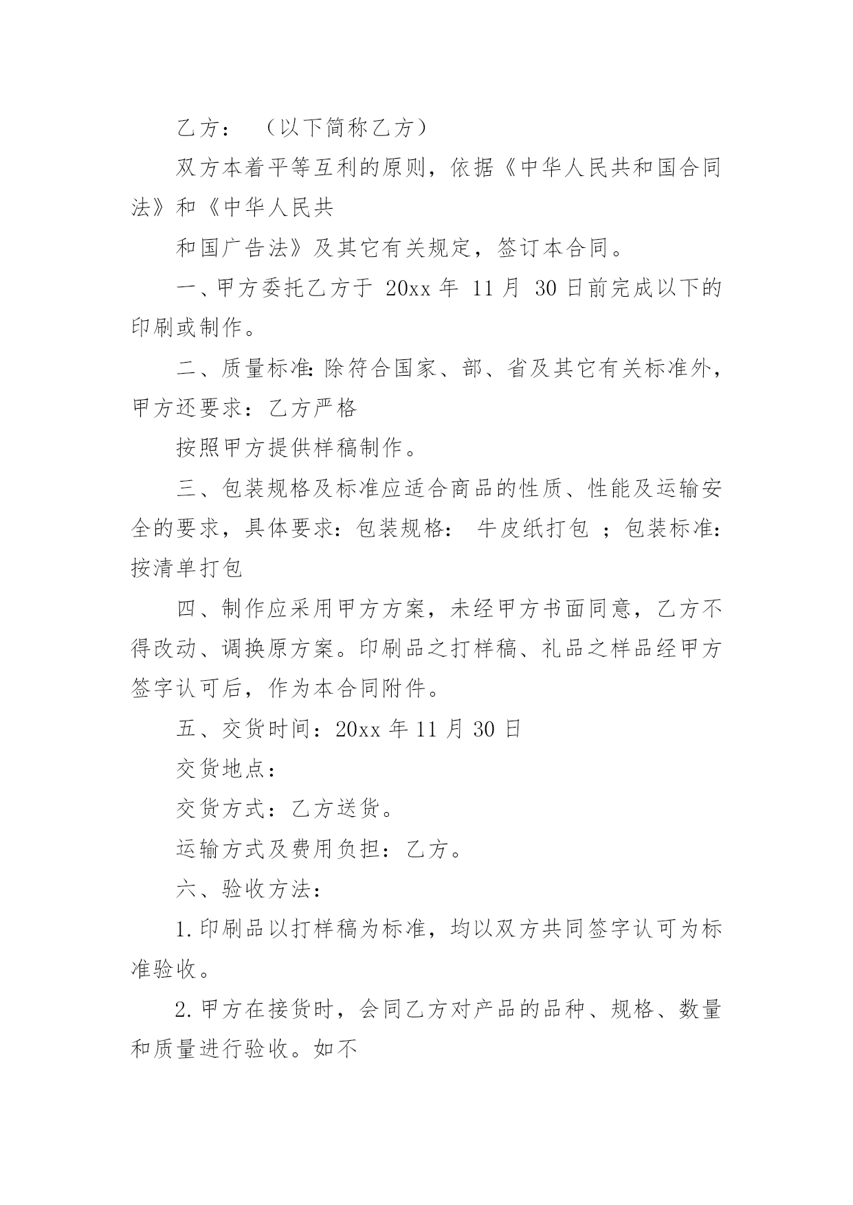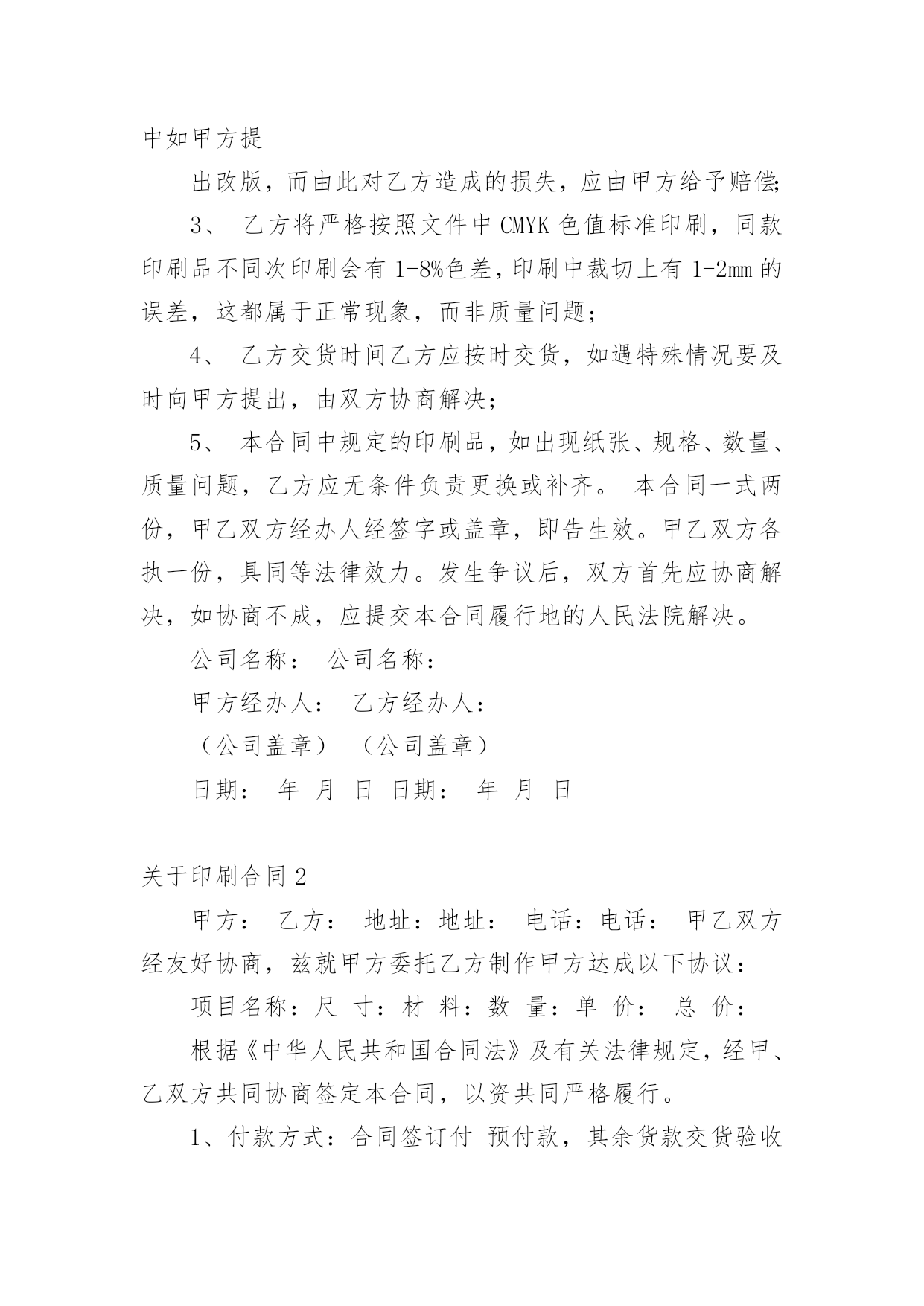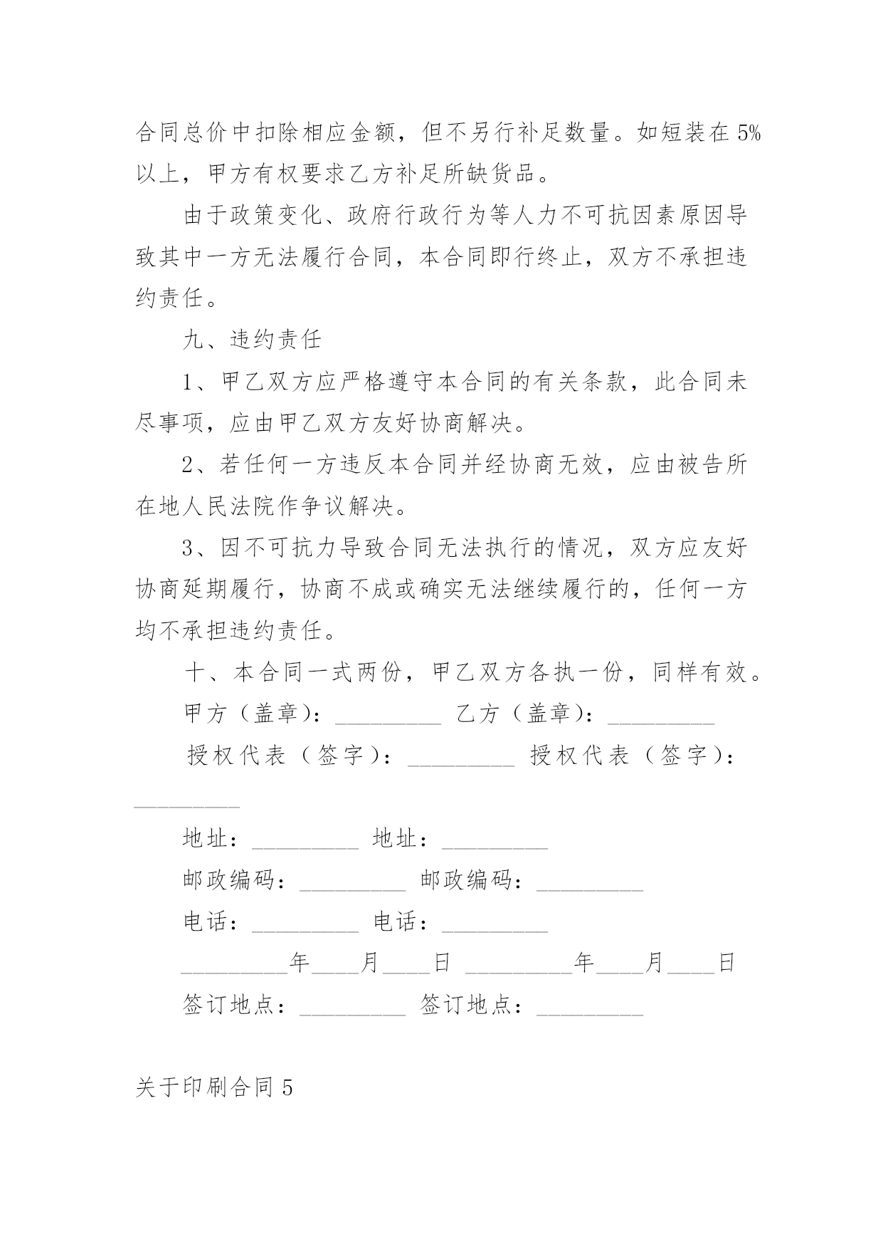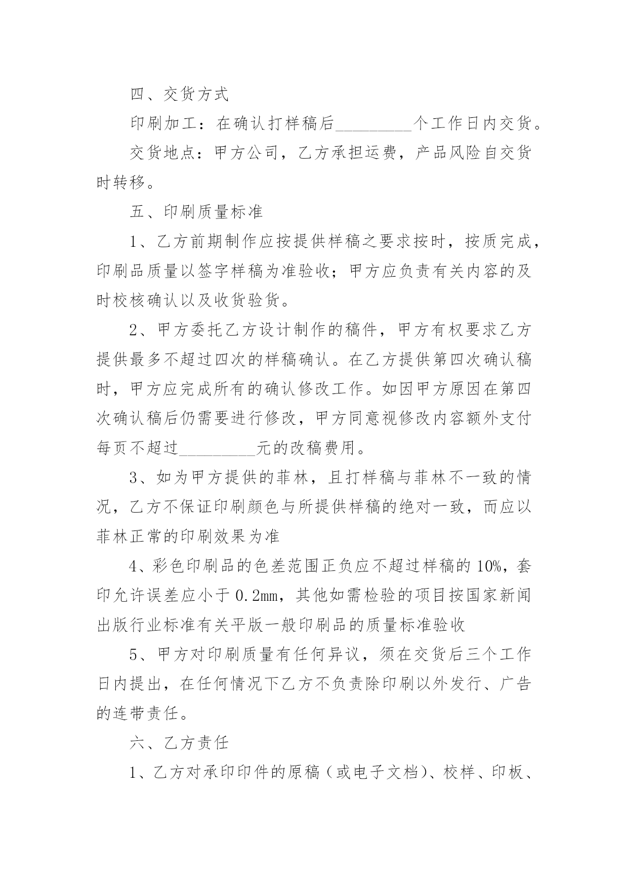 印刷合同关于印刷合同(6篇)在人们越来越相信法律的社会中,合同的地位越来越不容忽视,签订合同是减少和防止发生争议的重要措施。那么一般合同是怎么起草的呢?以下是小编帮大家整理的关于印刷合同,供大家参考借鉴,希望可以帮助到有需要的朋友。关于印刷合同1甲方:(委托方)乙方:(承印方)甲乙双方经友好协商,就甲方委托乙方印刷相关事宜达成如下协议:一、甲方委托乙方印刷的产品、数量、价格及印刷要求:二、甲方付款方式;甲方应付给乙方印刷费总计元RMB,预付元RMB,余额元RMB,甲方要在年月日付清乙方印刷费用。三、双方的义务和责任1、甲方向乙方提供印刷及制作所用的图片、标志与文字素材等,甲方保证提供的图片、标志与文字素材等不侵犯他人著作权,也不违反国家相关法律规定。乙方提供印刷及制作,因印刷及制作内容所引起的任何纠纷而产生的一切责任由甲方承担;2、甲方向乙方提供印刷及制作文件,在乙方印刷过程中如甲方提出改版,而由此对乙方造成的损失,应由甲方给予赔偿;3、乙方将严格按照文件中CMYK色值标准印刷,同款印刷品不同次印刷会有1-8%色差,印刷中裁切上有1-2mm的误差,这都属于正常现象,而非质量问题;4、乙方交货时间乙方应按时交货,如遇特殊情况要及时向甲方提出,由双方协商解决;5、本合同中规定的印刷品,如出现纸张、规格、数量、质量问题,乙方应无条件负责更换或补齐。本合同一式两份,甲乙双方经办人经签字或盖章,即告生效。甲乙双方各执一份,具同等法律效力。发生争议后,双方首先应协商解决,如协商不成,应提交本合同履行地的人民法院解决。公司名称:公司名称:甲方经办人:乙方经办人:(公司盖章)(公司盖章)日期:年月日日期:年月日关于印刷合同2甲方:乙方:地址:地址:电话:电话:甲乙双方经友好协商,兹就甲方委托乙方制作甲方达成以下协议:项目名称:尺寸:材料:数量:单价:总价:根据《中华人民共和国合同法》及有关法律规定,经甲、乙双方共同协商签定本合同,以资共同严格履行。1、付款方式:合同签订付预付款,其余货款交货验收合格时一次付清。2、交货时间:20xx年月日印刷质量标准1、甲方应认真审核设计制作文件,经甲方确认后开印。甲方确认后,若仍有错误,乙方不承担任何责任及费用;若甲方要求改版,其损失费用由甲方承担。乙方根据甲方设计制作图文印刷如有问题,乙方不负责任。2、乙方应严格按照甲方制作工艺要求,如因乙方原因导致印刷品出现质量问题或与清样内容不符,甲方有权拒收产品;乙方应按甲方的制作要求进行更改或重新制作,费用由乙方承担。3、任何一方违反本合同条款,另一方有权终止合同的履行,保留索赔违约金和由此造成的一切经济损失的权力,并按《中华人民共和国合同法》及有关法律规定,由违约方承担经济和法律责任。4、本合同一式两份,甲乙双方各执一份。未尽事宜双方协商解决,协商不成,由仲裁机构仲裁。甲方:乙方:富明华印刷有限公司签字:签字:刘厚怡日期:年月日关于印刷合同3合同编号:甲方:(以下简称甲方)乙方:(以下简称乙方)双方本着平等互利的原则,依据《中华人民共和国合同法》和《中华人民共和国广告法》及其它有关规定,签订本合同。一、甲方委托乙方于20xx年11月30日前完成以下的印刷或制作。二、质量标准:除符合国家、部、省及其它有关标准外,甲方还要求:乙方严格按照甲方提供样稿制作。三、包装规格及标准应适合商品的性质、性能及运输安全的要求,具体要求:包装规格:牛皮纸打包;包装标准:按清单打包四、制作应采用甲方方案,未经甲方书面同意,乙方不得改动、调换原方案。印刷品之打样稿、礼品之样品经甲方签字认可后,作为本合同附件。五、交货时间:20xx年11月30日交货地点:交货方式:乙方送货。运输方式及费用负担:乙方。六、验收方法:1.印刷品以打样稿为标准,均以双方共同签字认可为标准验收。2.甲方在接货时,会同乙方对产品的品种、规格、数量和质量进行验收。如不符合合同约定,甲方可拒绝收货和付款。3.乙方需提交送货单,甲方仓库见甲方验货人签字后方可入库。七、印刷品、礼品制作完毕,经甲方检验合格,在乙方提供发票后,即支付100%,计人民币。支付方式:转帐支票。八、违约责任:1.乙方所交产品应符合合同约定,如出现数量、质量等差错,乙方应无条件负责更换或补齐。无论什么原因引起的延迟交付,视同乙方违约,甲方可以拒收货物,并拒付货款。2.如乙方所交产品存在质量问题时,甲方有权拒收或拒付尾款。九、未尽事宜,经双方协商后,签订补充协议。补充协议与本合同具有同等法律效力。十、合同纠纷解决方式:发生纠纷时,双方应尽量协商解决。协商不成,应向甲方所在地法院起诉。十一、本合同共贰页,自双方签字盖章之日起生效。十二、其它约定事项:十三、本合同一式肆份,双方各持贰份。具有同等法律效力。甲方:乙方:委托代理人:电话:地址:日期:关于