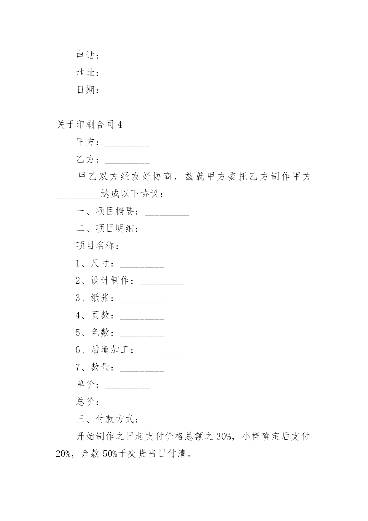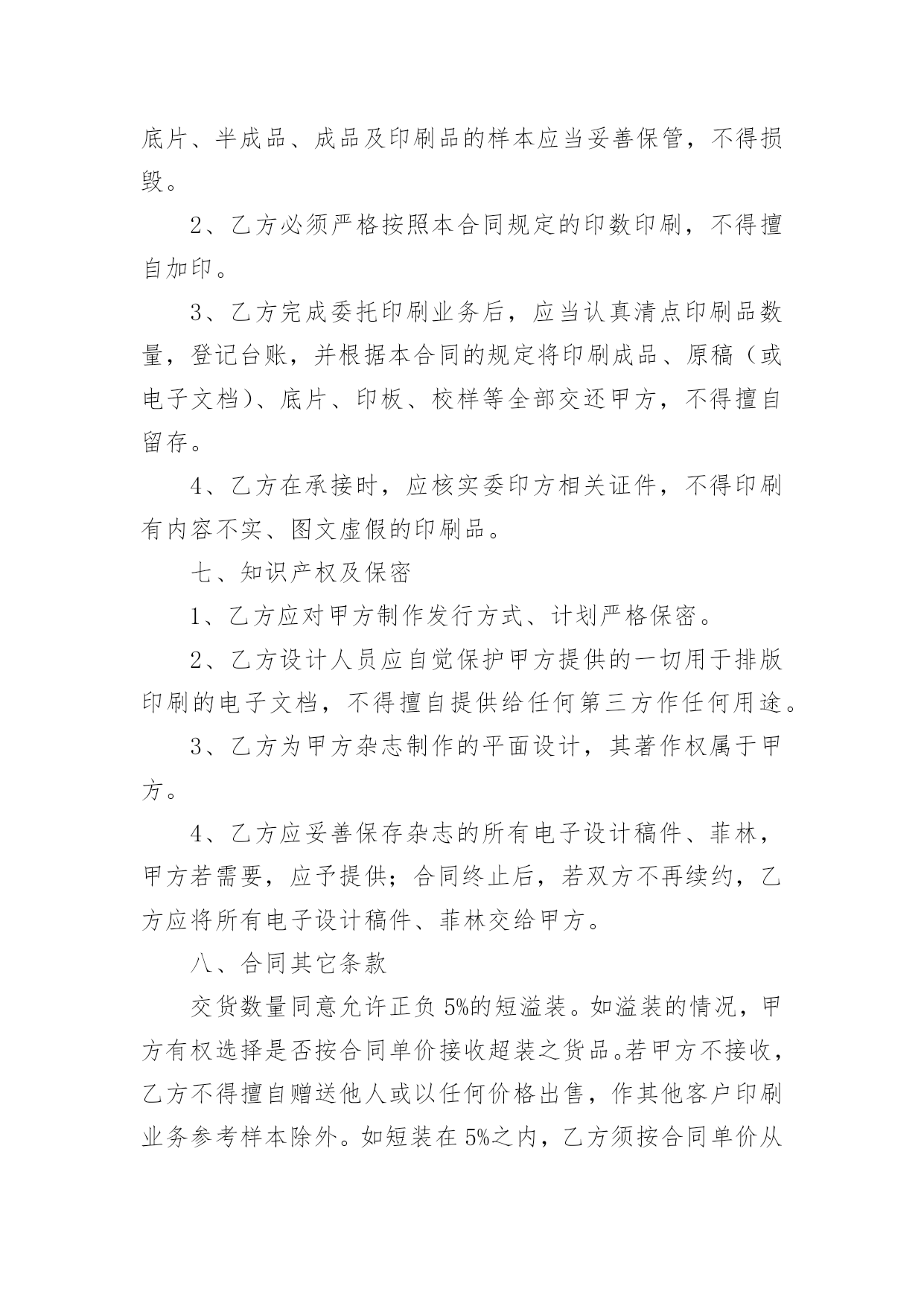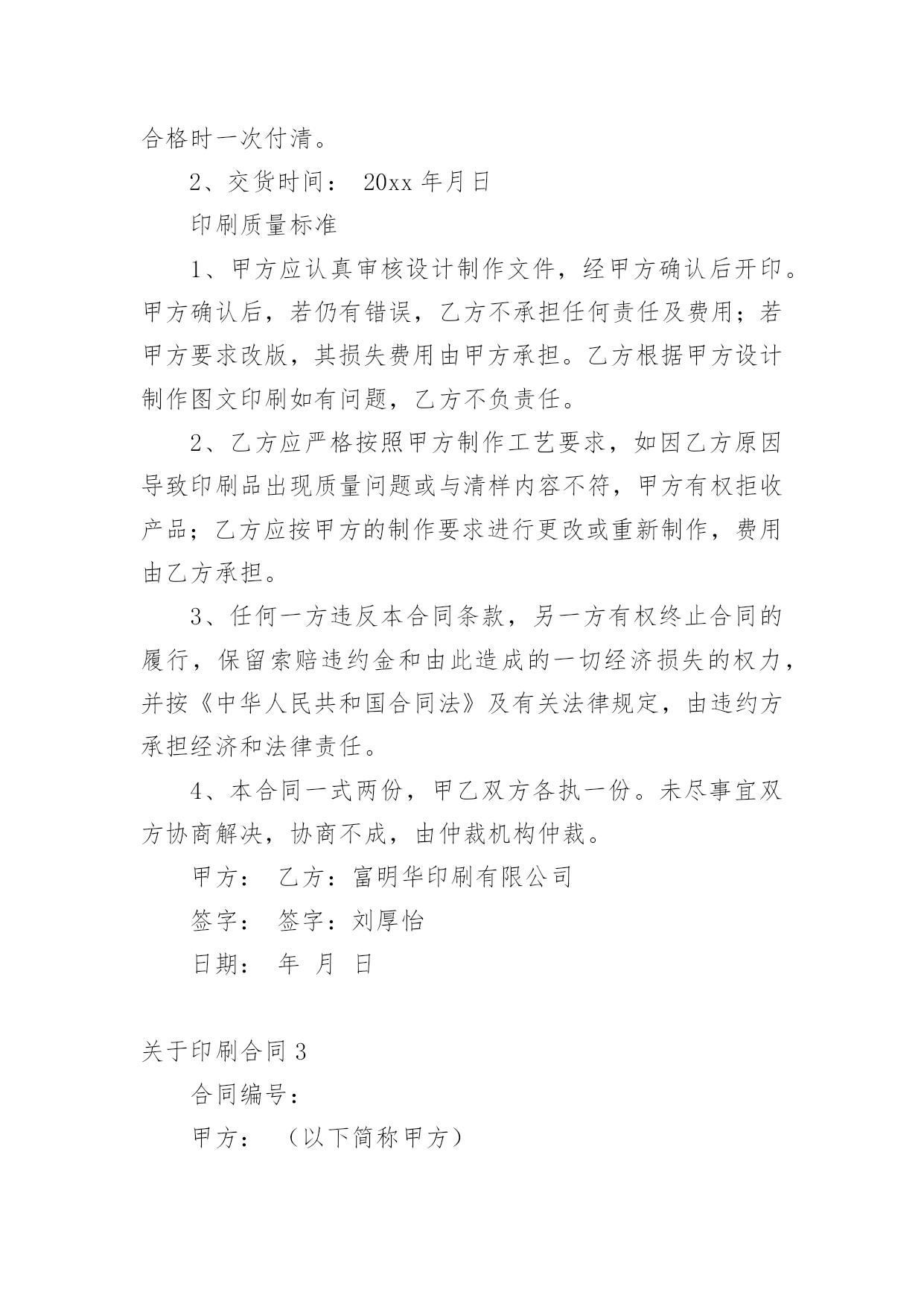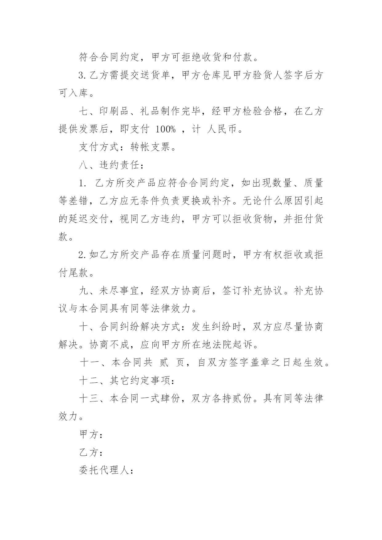 印刷合同关于印刷合同(6篇)在人们越来越相信法律的社会中,合同的地位越来越不容忽视,签订合同是减少和防止发生争议的重要措施。那么一般合同是怎么起草的呢?以下是小编帮大家整理的关于印刷合同,供大家参考借鉴,希望可以帮助到有需要的朋友。关于印刷合同1甲方:(委托方)乙方:(承印方)甲乙双方经友好协商,就甲方委托乙方印刷相关事宜达成如下协议:一、甲方委托乙方印刷的产品、数量、价格及印刷要求:二、甲方付款方式;甲方应付给乙方印刷费总计元RMB,预付元RMB,余额元RMB,甲方要在年月日付清乙方印刷费用。三、双方的义务和责任1、甲方向乙方提供印刷及制作所用的图片、标志与文字素材等,甲方保证提供的图片、标志与文字素材等不侵犯他人著作权,也不违反国家相关法律规定。乙方提供印刷及制作,因印刷及制作内容所引起的任何纠纷而产生的一切责任由甲方承担;2、甲方向乙方提供印刷及制作文件,在乙方印刷过程中如甲方提出改版,而由此对乙方造成的损失,应由甲方给予赔偿;3、乙方将严格按照文件中CMYK色值标准印刷,同款印刷品不同次印刷会有1-8%色差,印刷中裁切上有1-2mm的误差,这都属于正常现象,而非质量问题;4、乙方交货时间乙方应按时交货,如遇特殊情况要及时向甲方提出,由双方协商解决;5、本合同中规定的印刷品,如出现纸张、规格、数量、质量问题,乙方应无条件负责更换或补齐。本合同一式两份,甲乙双方经办人经签字或盖章,即告生效。甲乙双方各执一份,具同等法律效力。发生争议后,双方首先应协商解决,如协商不成,应提交本合同履行地的人民法院解决。公司名称:公司名称:甲方经办人:乙方经办人:(公司盖章)(公司盖章)日期:年月日日期:年月日关于印刷合同2甲方:乙方:地址:地址:电话:电话:甲乙双方经友好协商,兹就甲方委托乙方制作甲方达成以下协议:项目名称:尺寸:材料:数量:单价:总价:根据《中华人民共和国合同法》及有关法律规定,经甲、乙双方共同协商签定本合同,以资共同严格履行。1、付款方式:合同签订付预付款,其余货款交货验收合格时一次付清。2、交货时间:20xx年月日印刷质量标准1、甲方应认真审核设计制作文件,经甲方确认后开印。甲方确认后,若仍有错误,乙方不承担任何责任及费用;若甲方要求改版,其损失费用由甲方承担。乙方根据甲方设计制作图文印刷如有问题,乙方不负责任。2、乙方应严格按照甲方制作工艺要求,如因乙方原因导致印刷品出现质量问题或与清样内容不符,甲方有权拒收产品;乙方应按甲方的制作要求进行更改或重新制作,费用由乙方承担。3、任何一方违反本合同条款,另一方有权终止合同的履行,保留索赔违约金和由此造成的一切经济损失的权力,并按《中华人民共和国合同法》及有关法律规定,由违约方承担经济和法律责任。4、本合同一式两份,甲乙双方各执一份。未尽事宜双方协商解决,协商不成,由仲裁机构仲裁。甲方:乙方:富明华印刷有限公司签字:签字:刘厚怡日期:年月日关于印刷合同3合同编号:甲方:(以下简称甲方)乙方:(以下简称乙方)双方本着平等互利的原则,依据《中华人民共和国合同法》和《中华人民共和国广告法》及其它有关规定,签订本合同。一、甲方委托乙方于20xx年11月30日前完成以下的印刷或制作。二、质量标准:除符合国家、部、省及其它有关标准外,甲方还要求:乙方严格按照甲方提供样稿制作。三、包装规格及标准应适合商品的性质、性能及运输安全的要求,具体要求:包装规格:牛皮纸打包;包装标准:按清单打包四、制作应采用甲方方案,未经甲方书面同意,乙方不得改动、调换原方案。印刷品之打样稿、礼品之样品经甲方签字认可后,作为本合同附件。五、交货时间:20xx年11月30日交货地点:交货方式:乙方送货。运输方式及费用负担:乙方。六、验收方法:1.印刷品以打样稿为标准,均以双方共同签字认可为标准验收。2.甲方在接货时,会同乙方对产品的品种、规格、数量和质量进行验收。如不符合合同约定,甲方可拒绝收货和付款。3.乙方需提交送货单,甲方仓库见甲方验货人签字后方可入库。七、印刷品、礼品制作完毕,经甲方检验合格,在乙方提供发票后,即支付100%,计人民币。支付方式:转帐支票。八、违约责任:1.乙方所交产品应符合合同约定,如出现数量、质量等差错,乙方应无条件负责更换或补齐。无论什么原因引起的延迟交付,视同乙方违约,甲方可以拒收货物,并拒付货款。2.如乙方所交产品存在质量问题时,甲方有权拒收或拒付尾款。九、未尽事宜,经双方协商后,签订补充协议。补充协议与本合同具有同等法律效力。十、合同纠纷解决方式:发生纠纷时,双方应尽量协商解决。协商不成,应向甲方所在地法院起诉。十一、本合同共贰页,自双方签字盖章之日起生效。十二、其它约定事项:十三、本合同一式肆份,双方各持贰份。具有同等法律效力。甲方:乙方:委托代理人:电话:地址:日期:关于