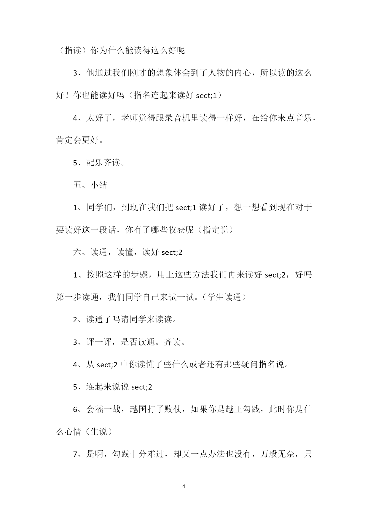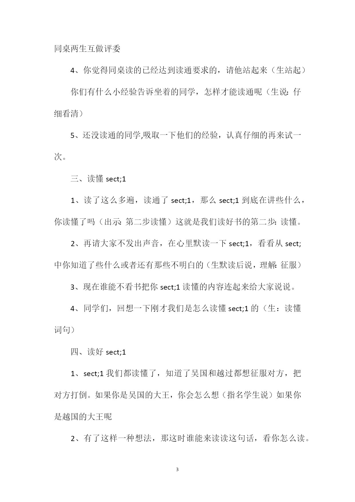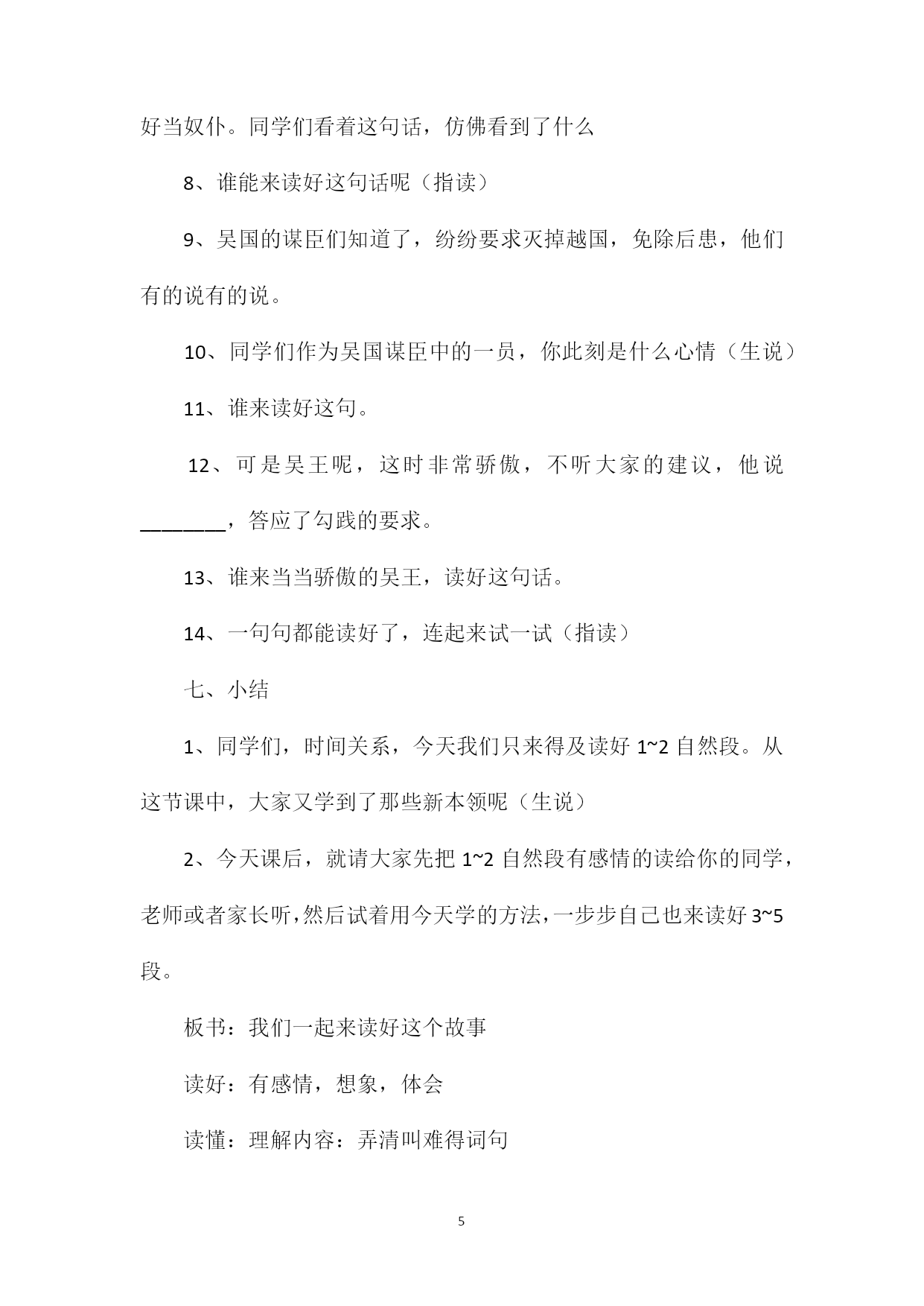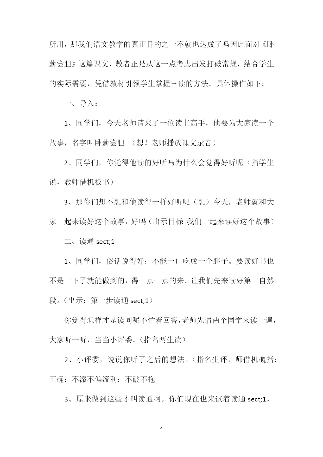 PAGEPAGE6《卧薪尝胆》教学设计设计理念:随着课改的不断深入,读对于学生的意义和价值已被我们很多老师所认可,将它放置在了语文教学中一个极其重要的位置。语文课堂中,朗朗的读书声不仅是在训练和发展学生的一种语文素养和技能,同时也是引领学生从语言文字中去发现去感悟得一个重要手段。我们学校也正是充分认识到了这一点,并通过长期课堂实践,逐步形成了中年级语文课堂教学的三读模式,即读通rarr;读懂rarr;读好。三年级的孩子可以说是语文阅读的起步阶段,低年级时他们主要学习和积累大量的汉字词语,在此基础上,三年级开始就凭借这孤立的汉字,词语进入到一定的语言环境,进行段、篇的学习。这中间的一个跨越,朗读将成为一座最好的桥梁。三读式的引进正符合他们的这种需要。然而一开始我们往往只把这三读式作为老师课堂中的一个操作流程或者说是课堂组织的方向。至于学生他永远都只是跟着老师在走,而我却觉得这样对待三读式是片面的,我们常说授之以鱼不如授之以渔,训练发展学生读书技能的最终目的是要让学生形成一种自主,自能读书的习惯。习惯的养成离不开良好的方法的,而三读从另一角度讲也正是一种读书的好方法。这样好的读书方法如果能为学生所用,那我们语文教学的真正目的之一不就也达成了吗因此面对《卧薪尝胆》这篇课文,教者正是从这一点考虑出发打破常规,结合学生的实际需要,凭借教材引领学生掌握三读的方法。具体操作如下:一、导入:1、同学们,今天老师请来了一位读书高手,他要为大家读一个故事,名字叫卧薪尝胆。(想!老师播放课文录音)2、同学们,你觉得他读的好听吗为什么会觉得好听呢(指学生说,教师借机板书)3、那你们想不想和他读得一样好听呢(想)今天,老师就和大家一起来读好这个故事,好吗(出示目标:我们一起来读好这个故事)二、读通sect;11、同学们,俗话说得好:不能一口吃成一个胖子。要读好书也不是一下子就能做到的,得一点一点的来。让我们先来读好第一自然段。(出示:第一步读通sect;1)你觉得怎样才是读同呢不忙着回答,老师先请两个同学来读一遍,大家听一听,当当小评委。(指名两生读)2、小评委,说说你听了之后的想法。(指名生评,师借机概括:正确:不添不偏流利:不破不拖3、原来做到这些才叫读通啊。你们现在也来试着读通sect;1,同桌两生互做评委4、你觉得同桌读的已经达到读通要求的,请他站起来(生站起)你们有什么小经验告诉坐着的同学,怎样才能读通呢(生说:仔细看清)5、还没读通的同学,吸取一下他们的经验,认真仔细的再来试一次。三、读懂sect;11、读了这么多遍,读通了sect;1,那么sect;1到底在讲些什么,你读懂了吗(出示:第二步读懂)这就是我们读好书的第二步:读懂。2、再请大家不发出声音,在心里默读一下sect;1,看看从sect;中你知道了些什么或者还有那些不明白的(生默读后说,理解:征服)3、现在谁能不看书把你sect;1读懂的内容连起来给大家说说。4、同学们,回想一下刚才我们是怎么读懂sect;1的(生:读懂词句)四、读好sect;11、sect;1我们都读懂了,知道了吴国和越过都想征服对方,把对方打倒。如果你是吴国的大王,你会怎么想(指名学生说)如果你是越国的大王呢2、有了这样一种想法,那这时谁能来读读这句话,看你怎么读。(指读)你为什么能读得这么好呢3、他通过我们刚才的想象体会到了人物的内心,所以读的这么好!你也能读好吗(指名连起来读好sect;1)4、太好了,老师觉得跟录音机里读得一样好,在给你来点音乐,肯定会更好。5、配乐齐读。五、小结1、同学们,到现在我们把sect;1读好了,想一想看到现在对于要读好这一段话,你有了哪些收获呢(指定说)六、读通,读懂,读好sect;21、按照这样的步骤,用上这些方法我们再来读好sect;2,好吗第一步读通,我们同学自己来试一试。(学生读通)2、读通了吗请同学来读读。3、评一评,是否读通。齐读。4、从sect;2中你读懂了些什么或者还有那些疑问指名说。5、连起来说说sect;26、会嵇一战,越国打了败仗,如果你是越王勾践,此时你是什么心情(生说)7、是啊,勾践十分难过,却又一点办法也没有,万般无奈,只好当奴仆。同学们看着这句话,仿佛看到了什么8、谁能来读好这句话呢(指读)9、吴国的谋臣们知道了,纷纷要求灭掉越国,免除后患,他们有的说有的说。10、同学们作为吴国谋臣中的一员,你此刻是什么心情(生说)11、谁来读好这句。12、可是吴王呢,这时非常骄傲,不听大家的建议,他说________,答应了勾践的要求。13、谁来当当骄傲的吴王,读好这句话。14、一句句都能读好了,连起来试一试(指读)七、小结1、同学们,时间关系