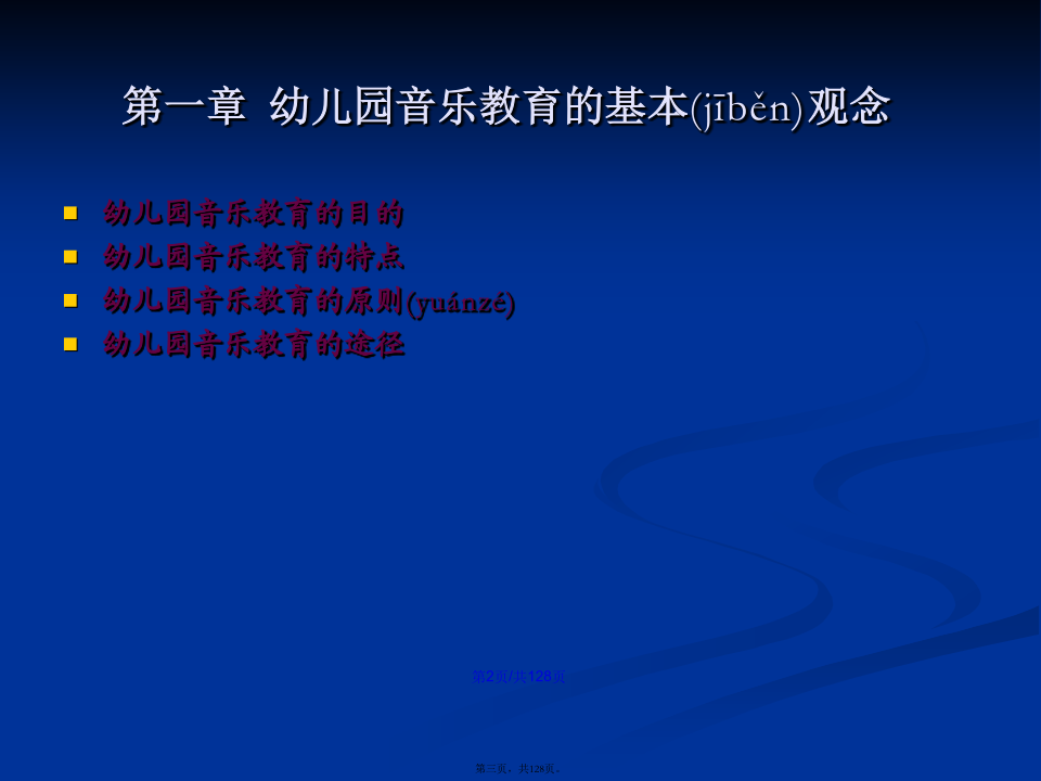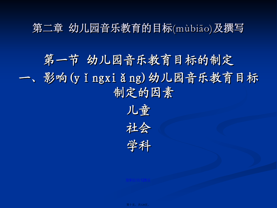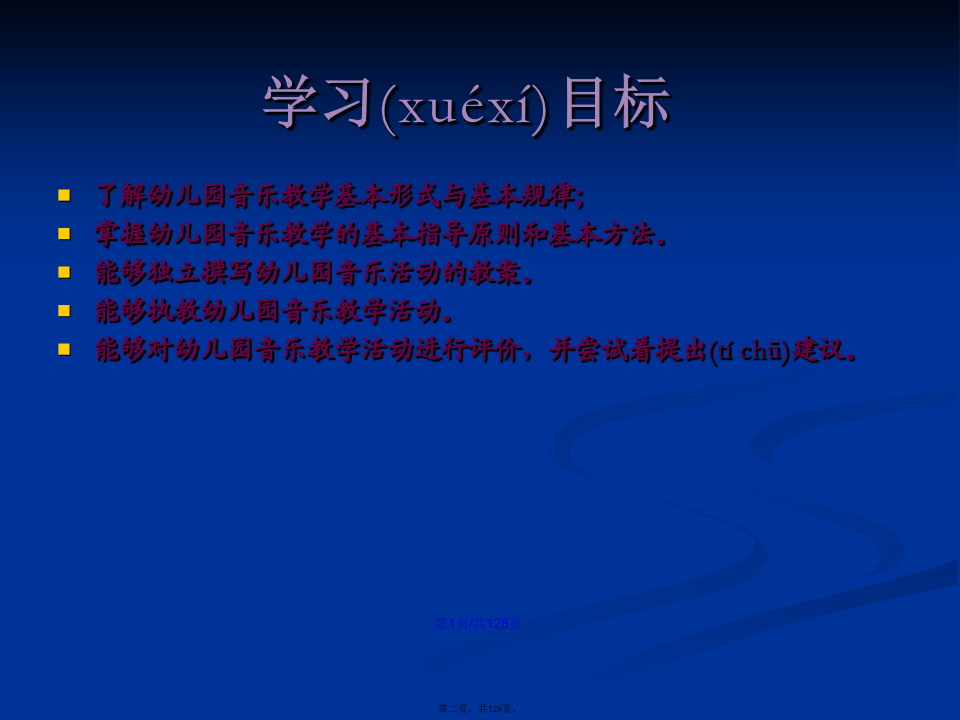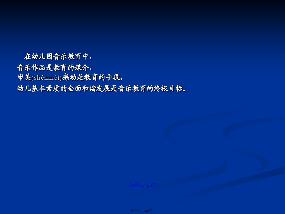 会计学学习(xuéxí)目标第一章幼儿园音乐教育的基本(jīběn)观念第一节幼儿园音乐教育的目的(mùdì)幼儿园音乐教育的基本(jīběn)含义是:第二节幼儿园音乐教育的特点(tèdiǎn)第三节幼儿园音乐教育的原则(yuánzé)第四节幼儿园音乐教育的途径(tújìng)第二章幼儿园音乐教育的目标(mùbiāo)及撰写二、幼儿园音乐教育目标(mùbiāo)的制定过程第二节幼儿园音乐教育目标(mùbiāo)的功能第三节幼儿园音乐教育目标(mùbiāo)的结构三、新《纲要》中艺术教育(jiàoyù)的总目标第四节幼儿园音乐活动目标(mùbiāo)的撰写二、音乐教育活动(huódòng)目标的编写方法(二)学习(xuéxí)能力发展目标的提出和撰写记忆、模仿;探索、创造性地解决问题的能力。积累学习(xuéxí)策略:体态暗示音乐前奏对学习(xuéxí)策略有意识:歌曲演唱中的预令策略选择学习(xuéxí)策略:集体舞学习(xuéxí)中的运用标记的策略主动迁移学习(xuéxí)策略:将日常生活中的动作迁移到舞蹈中创造性学习(xuéxí):选择与别人不一样的策略个性化学习(xuéxí):各自选择各自喜欢的策略第五节学前儿童音乐教育活动目标(mùbiāo)的范例分析第三章幼儿园音乐教育活动(huódòng)的指导案例(ànlì):新授歌曲《头发肩膀膝盖脚》7、教师先用极慢的边唱边做,然后加快至不可能再快,体验速度变化的乐趣。(改变速度,体验乐趣)8、如果是大班或者基础比较好的班级,教师还可以继续尝试:(1)教师教幼儿学会将歌曲中的“脚”变为默唱,只做动作。(2)教师请幼儿提出还可以将歌曲中那个身体(shēntǐ)部位改为默唱。并进行尝试。9、放松与欣赏。10、结束。中班歌唱活动(huódòng)《买菜》(常规活动(huódòng))(3)反馈(fǎnkuì)运用语言(yǔyán)指导时,需要注意的问题:第四章幼儿园歌唱活动第一节歌唱活动的教育(jiàoyù)内容第二节学前儿童歌唱材料(cáiliào)的选择第三节学前儿童歌唱活动的设计(shèjì)与指导第四节歌唱活动(huódòng)中的能力培养2、一般(yībān)注意事项第六章学前儿童(értóng)韵律活动教育一、韵律动作(dòngzuò)及其组合第二节学前儿童(értóng)韵律活动材料的选择第三节学前儿童韵律(yùnlǜ)活动的设计与指导第四节韵律活动中的能力(nénglì)培养第五节系列韵律教育(jiàoyù)活动方案设计与案例分析第六章幼儿园打击乐演奏(yǎnzòu)活动第二节打击乐演奏活动材料(cáiliào)的选择第三节新授打击乐活动(huódòng)的设计与活动(huódòng)第四节打击乐演奏(yǎnzòu)活动中的能力培养第五节系列打击乐器演奏教育(jiàoyù)活动方案设计与实例分析第七章幼儿园音乐欣赏活动(huódòng)第二节音乐欣赏活动材料(cáiliào)的选择第三节新授音乐欣赏活动(huódòng)的设计与组织
