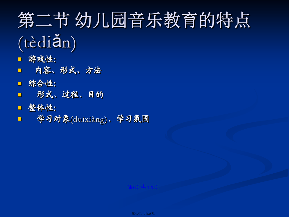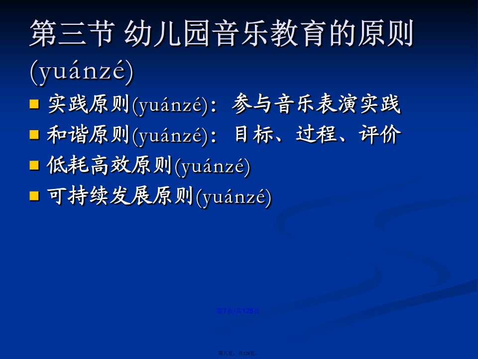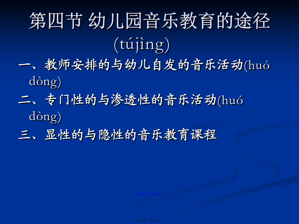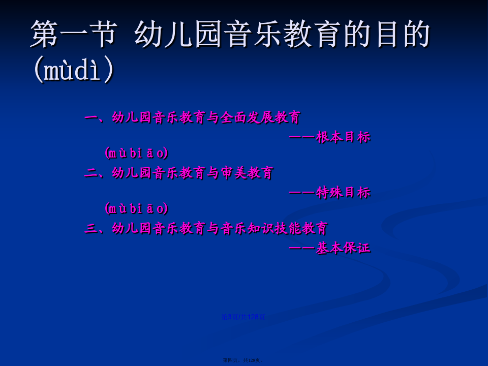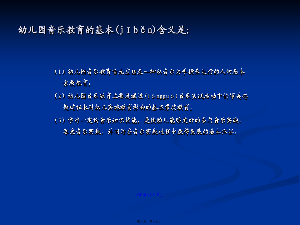 会计学学习(xuéxí)目标第一章幼儿园音乐教育的基本(jīběn)观念第一节幼儿园音乐教育的目的(mùdì)幼儿园音乐教育的基本(jīběn)含义是:第二节幼儿园音乐教育的特点(tèdiǎn)第三节幼儿园音乐教育的原则(yuánzé)第四节幼儿园音乐教育的途径(tújìng)第二章幼儿园音乐教育的目标(mùbiāo)及撰写二、幼儿园音乐教育目标(mùbiāo)的制定过程第二节幼儿园音乐教育目标(mùbiāo)的功能第三节幼儿园音乐教育目标(mùbiāo)的结构三、新《纲要》中艺术教育(jiàoyù)的总目标第四节幼儿园音乐活动目标(mùbiāo)的撰写二、音乐教育活动(huódòng)目标的编写方法(二)学习(xuéxí)能力发展目标的提出和撰写记忆、模仿;探索、创造性地解决问题的能力。积累学习(xuéxí)策略:体态暗示音乐前奏对学习(xuéxí)策略有意识:歌曲演唱中的预令策略选择学习(xuéxí)策略:集体舞学习(xuéxí)中的运用标记的策略主动迁移学习(xuéxí)策略:将日常生活中的动作迁移到舞蹈中创造性学习(xuéxí):选择与别人不一样的策略个性化学习(xuéxí):各自选择各自喜欢的策略第五节学前儿童音乐教育活动目标(mùbiāo)的范例分析第三章幼儿园音乐教育活动(huódòng)的指导案例(ànlì):新授歌曲《头发肩膀膝盖脚》7、教师先用极慢的边唱边做,然后加快至不可能再快,体验速度变化的乐趣。(改变速度,体验乐趣)8、如果是大班或者基础比较好的班级,教师还可以继续尝试:(1)教师教幼儿学会将歌曲中的“脚”变为默唱,只做动作。(2)教师请幼儿提出还可以将歌曲中那个身体(shēntǐ)部位改为默唱。并进行尝试。9、放松与欣赏。10、结束。中班歌唱活动(huódòng)《买菜》(常规活动(huódòng))(3)反馈(fǎnkuì)运用语言(yǔyán)指导时,需要注意的问题:第四章幼儿园歌唱活动第一节歌唱活动的教育(jiàoyù)内容第二节学前儿童歌唱材料(cáiliào)的选择第三节学前儿童歌唱活动的设计(shèjì)与指导第四节歌唱活动(huódòng)中的能力培养2、一般(yībān)注意事项第六章学前儿童(értóng)韵律活动教育一、韵律动作(dòngzuò)及其组合第二节学前儿童(értóng)韵律活动材料的选择第三节学前儿童韵律(yùnlǜ)活动的设计与指导第四节韵律活动中的能力(nénglì)培养第五节系列韵律教育(jiàoyù)活动方案设计与案例分析第六章幼儿园打击乐演奏(yǎnzòu)活动第二节打击乐演奏活动材料(cáiliào)的选择第三节新授打击乐活动(huódòng)的设计与活动(huódòng)第四节打击乐演奏(yǎnzòu)活动中的能力培养第五节系列打击乐器演奏教育(jiàoyù)活动方案设计与实例分析第七章幼儿园音乐欣赏活动(huódòng)第二节音乐欣赏活动材料(cáiliào)的选择第三节新授音乐欣赏活动(huódòng)的设计与组织