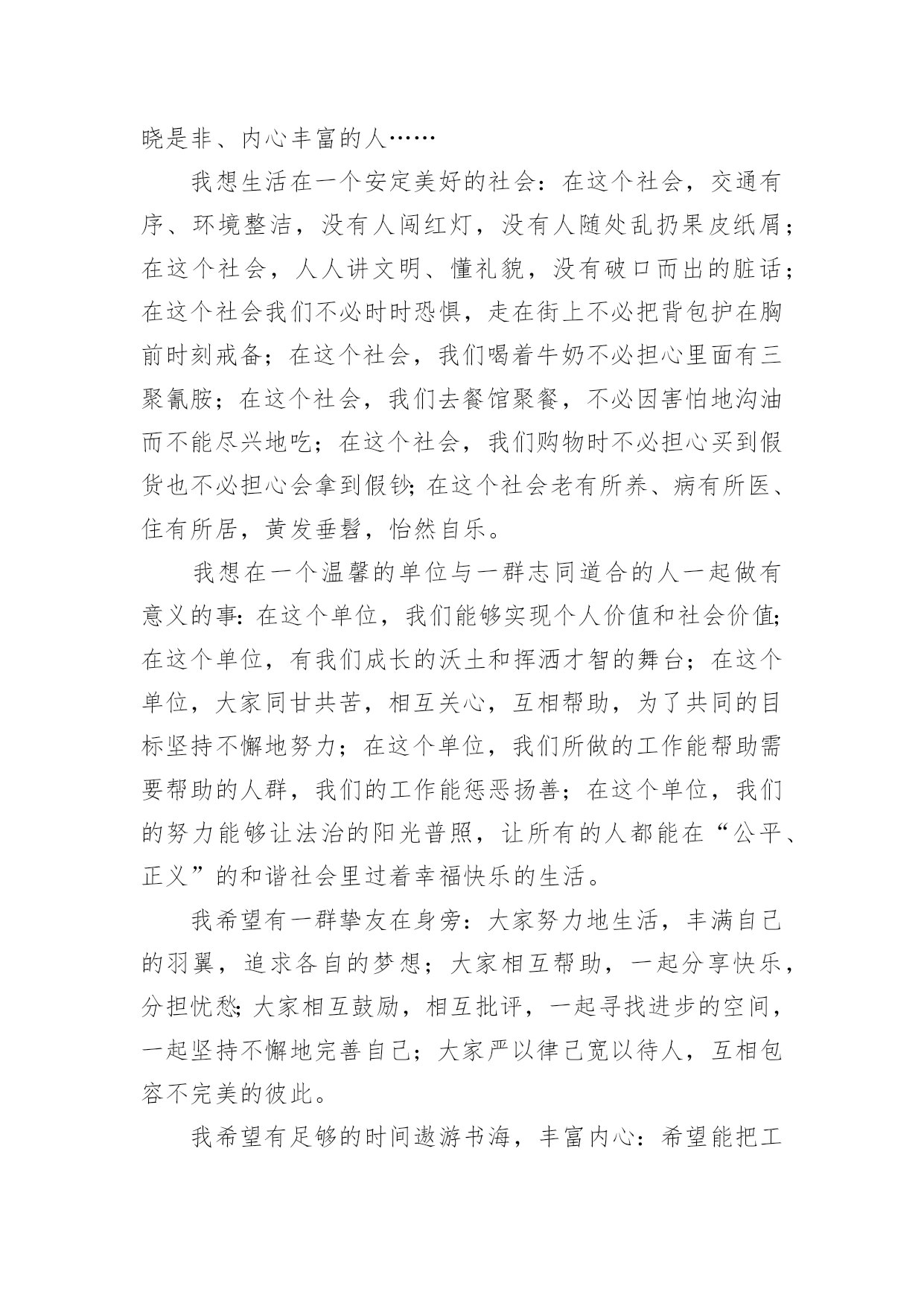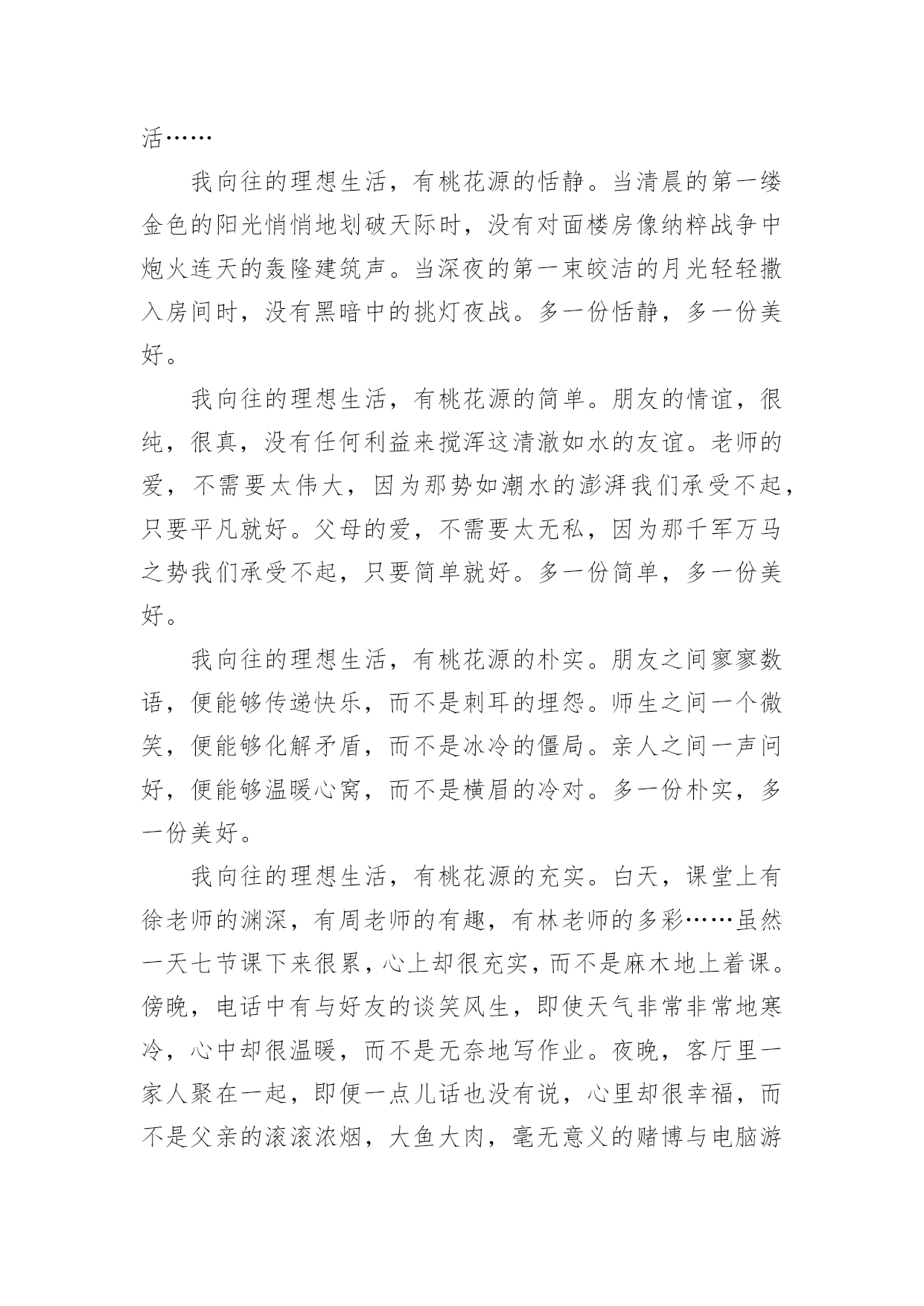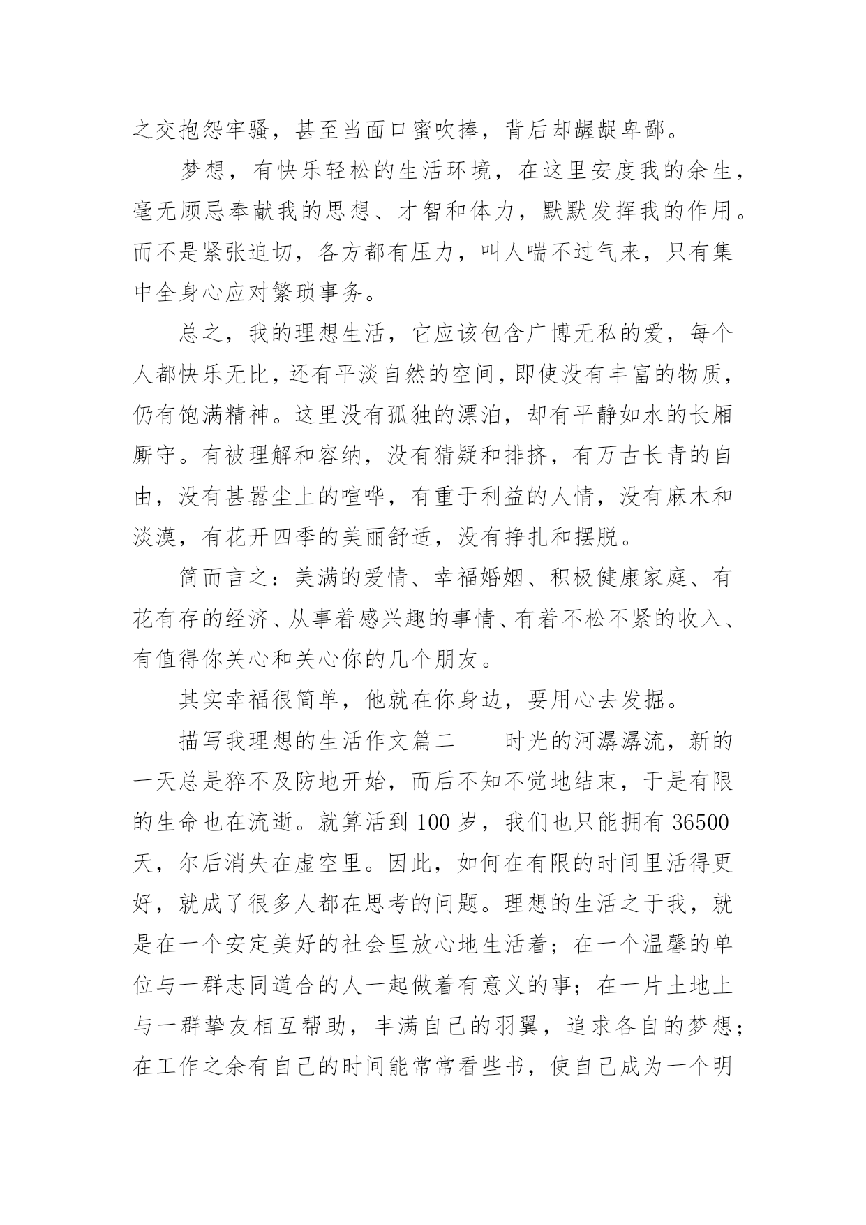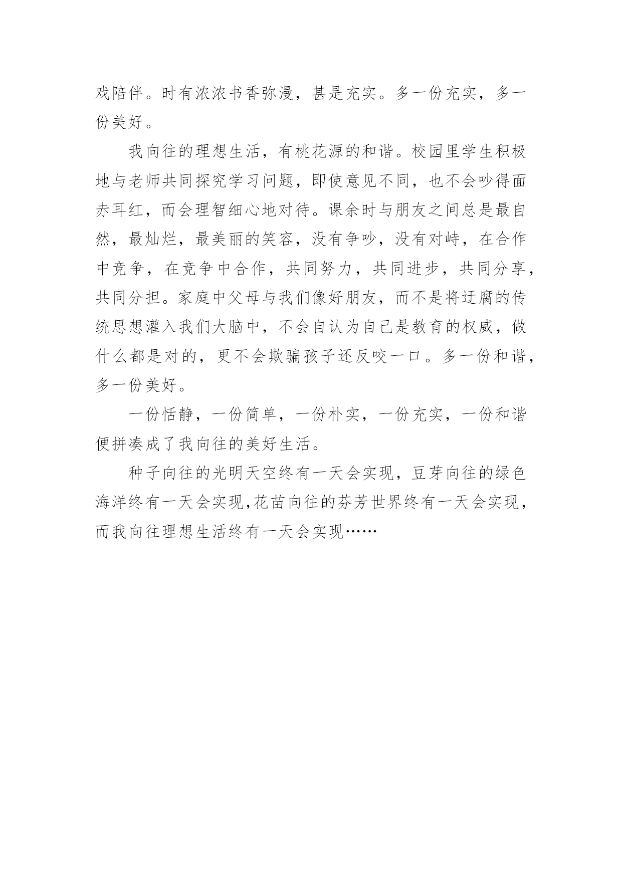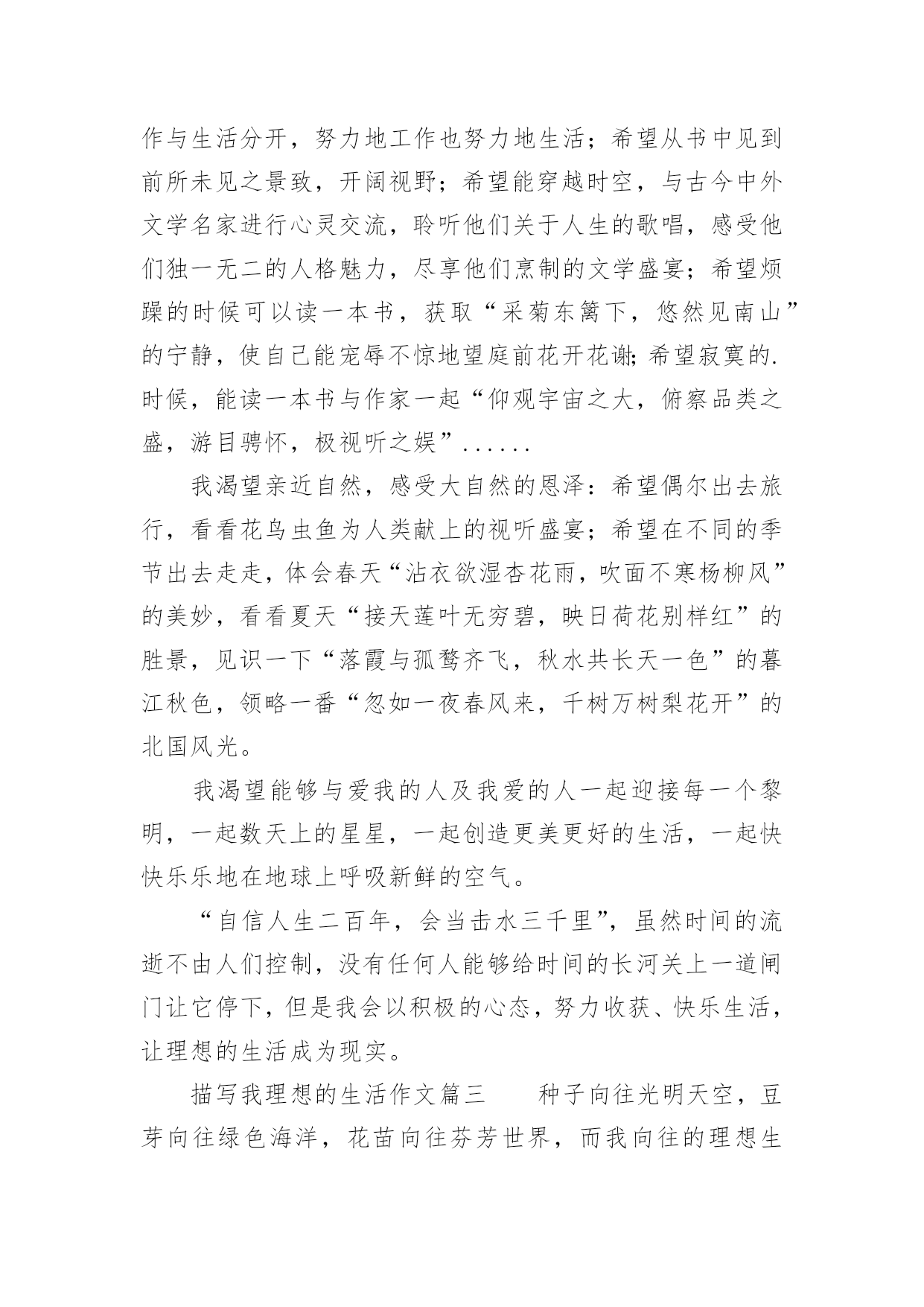 描写我理想的生活作文描写我理想的生活作文导语:每个人对自己的的生活都会有另外一种假设,他们想要过上自己的理想生活。下面由小编为大家整理的描写我理想的生活作文,希望可以帮助到大家!描写我理想的生活作文篇一每个人都想过上自己理想的生活:有的想地位显赫,高官厚禄;有的想家财万贯,华车豪宅;有的想美女如云,左揽右抱;有的想浪迹天涯,寻觅出路;有的想一展才华,名利双收;有的想快活自由,不受约束;有的想深居简出,享受寂寞……那么,理想生活是什么?希望,能够和父母生活在一起,他们都很健康快乐,充分享受晚年生活。每当傍晚,所有的子女像归巢的小鸟,陆续回家,团聚桌前,共用丰盛的晚餐,笑声曼曼,其乐融融。而不是家人各奔东西,只有节假日偶尔聚集,像过客一样短暂相聚,再继续分离。祈求,拥有一位温柔体贴的妻子,当我踏着疲惫的脚步回来时,看见她的笑容,就会抛掉所有的烦恼与忧愁。而不是都很忙碌,很晚才回家,已经都吃过了晚饭,只是把家当作住宿过夜的旅馆。渴盼,单位同事们能友好相处,以宽容的友谊建立彼此互助的关系,发挥整体的团结优势,合力大于各个之和,为所在事业一起取得发展。而不是明争暗斗,互相提防,酒肉之交抱怨牢骚,甚至当面口蜜吹捧,背后却龌龊卑鄙。梦想,有快乐轻松的生活环境,在这里安度我的余生,毫无顾忌奉献我的思想、才智和体力,默默发挥我的作用。而不是紧张迫切,各方都有压力,叫人喘不过气来,只有集中全身心应对繁琐事务。总之,我的理想生活,它应该包含广博无私的爱,每个人都快乐无比,还有平淡自然的空间,即使没有丰富的物质,仍有饱满精神。这里没有孤独的漂泊,却有平静如水的长厢厮守。有被理解和容纳,没有猜疑和排挤,有万古长青的自由,没有甚嚣尘上的喧哗,有重于利益的人情,没有麻木和淡漠,有花开四季的美丽舒适,没有挣扎和摆脱。简而言之:美满的爱情、幸福婚姻、积极健康家庭、有花有存的经济、从事着感兴趣的事情、有着不松不紧的收入、有值得你关心和关心你的几个朋友。其实幸福很简单,他就在你身边,要用心去发掘。描写我理想的生活作文篇二时光的河潺潺流,新的一天总是猝不及防地开始,而后不知不觉地结束,于是有限的生命也在流逝。就算活到100岁,我们也只能拥有36500天,尔后消失在虚空里。因此,如何在有限的时间里活得更好,就成了很多人都在思考的问题。理想的生活之于我,就是在一个安定美好的社会里放心地生活着;在一个温馨的单位与一群志同道合的人一起做着有意义的事;在一片土地上与一群挚友相互帮助,丰满自己的羽翼,追求各自的梦想;在工作之余有自己的时间能常常看些书,使自己成为一个明晓是非、内心丰富的人……我想生活在一个安定美好的社会:在这个社会,交通有序、环境整洁,没有人闯红灯,没有人随处乱扔果皮纸屑;在这个社会,人人讲文明、懂礼貌,没有破口而出的脏话;在这个社会我们不必时时恐惧,走在街上不必把背包护在胸前时刻戒备;在这个社会,我们喝着牛奶不必担心里面有三聚氰胺;在这个社会,我们去餐馆聚餐,不必因害怕地沟油而不能尽兴地吃;在这个社会,我们购物时不必担心买到假货也不必担心会拿到假钞;在这个社会老有所养、病有所医、住有所居,黄发垂髫,怡然自乐。我想在一个温馨的单位与一群志同道合的人一起做有意义的事:在这个单位,我们能够实现个人价值和社会价值;在这个单位,有我们成长的沃土和挥洒才智的舞台;在这个单位,大家同甘共苦,相互关心,互相帮助,为了共同的目标坚持不懈地努力;在这个单位,我们所做的工作能帮助需要帮助的人群,我们的工作能惩恶扬善;在这个单位,我们的努力能够让法治的阳光普照,让所有的人都能在“公平、正义”的和谐社会里过着幸福快乐的生活。我希望有一群挚友在身旁:大家努力地生活,丰满自己的羽翼,追求各自的梦想;大家相互帮助,一起分享快乐,分担忧愁;大家相互鼓励,相互批评,一起寻找进步的空间,一起坚持不懈地完善自己;大家严以律己宽以待人,互相包容不完美的彼此。我希望有足够的时间遨游书海,丰富内心:希望能把工作与生活分开,努力地工作也努力地生活;希望从书中见到前所未见之景致,开阔视野;希望能穿越时空,与古今中外文学名家进行心灵交流,聆听他们关于人生的歌唱,感受他们独一无二的人格魅力,尽享他们烹制的文学盛宴;希望烦躁的时候可以读一本书,获取“采菊东篱下,悠然见南山”的宁静,使自己能宠辱不惊地望庭前花开花谢;希望寂寞的.时候,能读一本书与作家一起“仰观宇宙之大,俯察品类之盛,游目骋怀,极视听之娱”......我渴望亲近自然,感受大自然的恩泽:希望偶尔出去旅行,看看花鸟虫鱼为人类献上的视听盛宴;希望在不同的季节出去走走,体会春天“沾衣欲湿杏花雨,吹面不寒杨柳风”的美妙,看看夏天“接天莲叶无穷碧,映日荷花别样红”的胜景,见识一下“落霞与孤鹜齐飞,秋水共长天一色”的暮江秋色,领略一番“忽如一夜春风来,千树万树梨