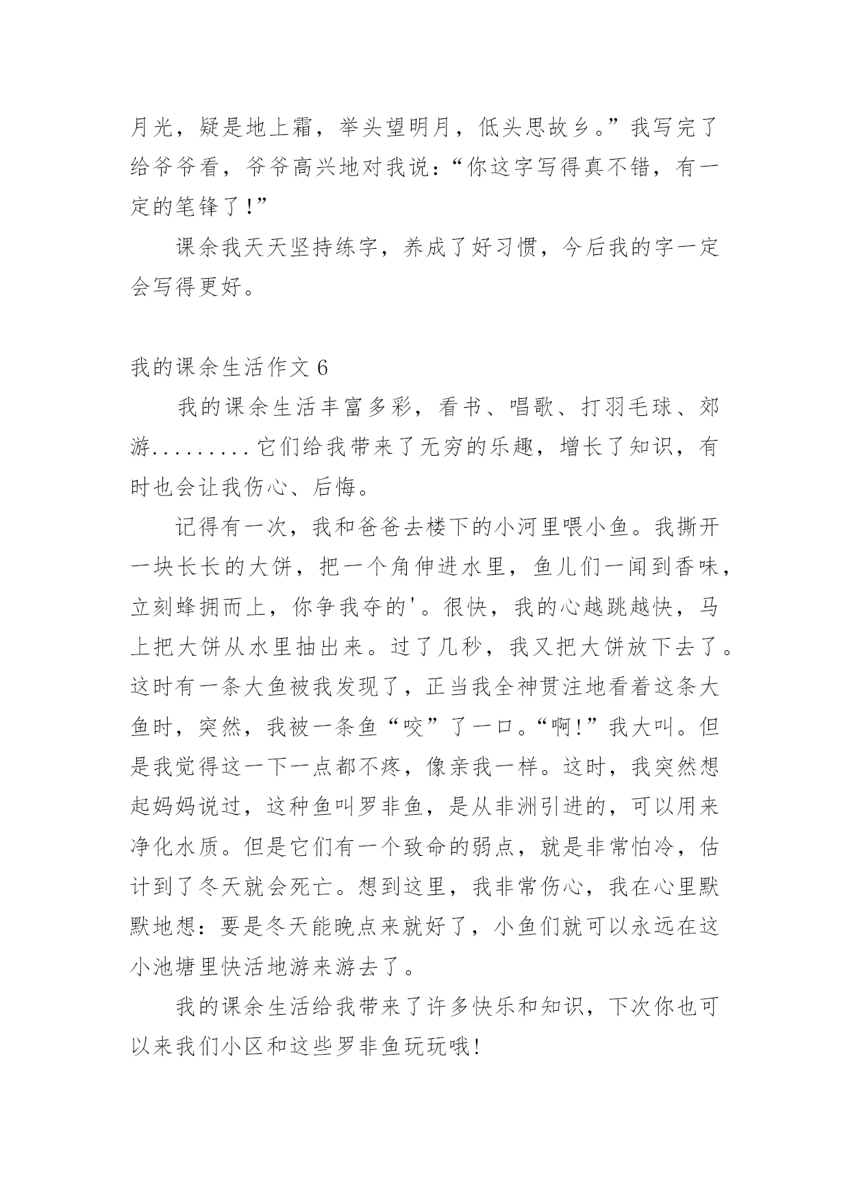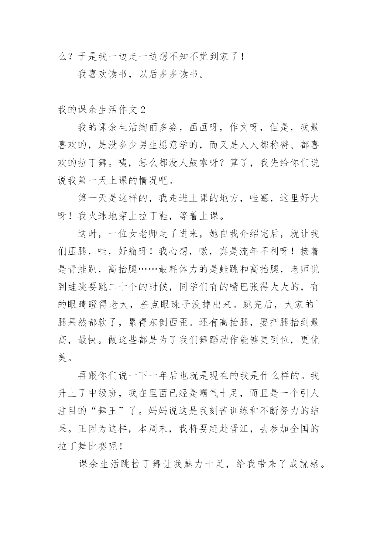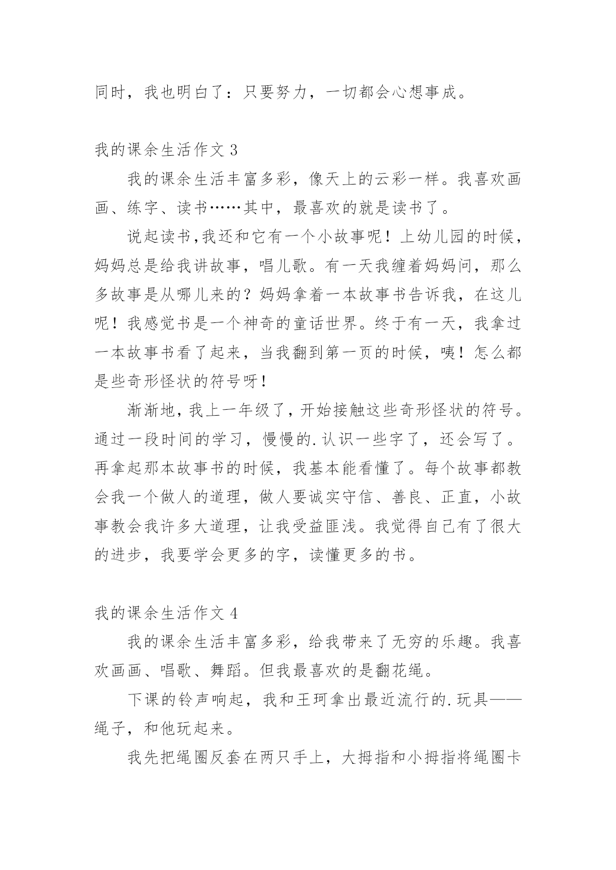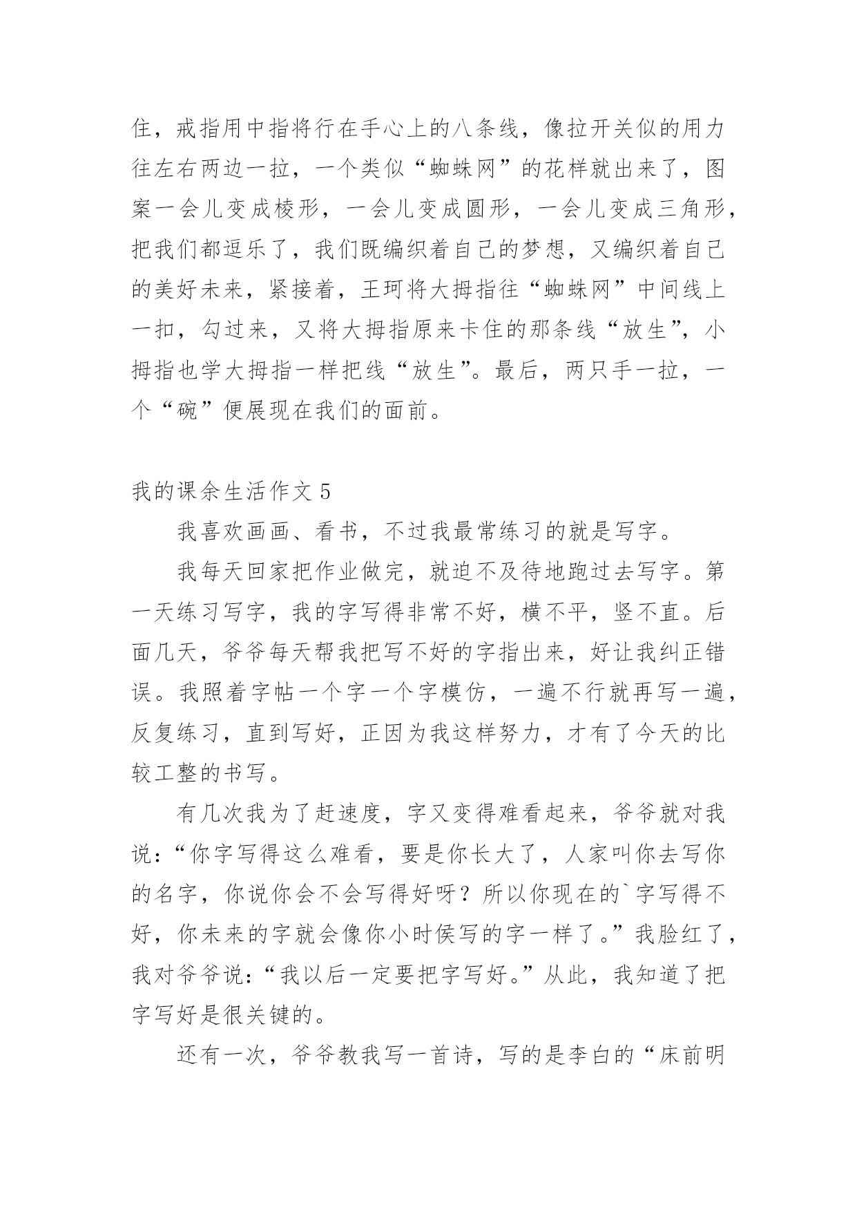 我的课余生活作文在日常的学习、工作、生活中,说到作文,大家肯定都不陌生吧,借助作文可以提高我们的语言组织能力。你知道作文怎样写才规范吗?下面是小编帮大家整理的我的课余生活作文,欢迎大家借鉴与参考,希望对大家有所帮助。我的课余生活作文1我的课余生活真是丰富多彩,跳绳、丢手绢、画画、看书……,但是我最喜欢的是看课外书。俗话说“读书破万卷,下笔如有神”。我感觉读书使人获得知识,让你的心灵更加美丽!这几年我看过诗歌、散文、小说、童话等等。我最喜欢的作家是冰心老人,因为她有一颗童心:最喜欢看的是小说,有时可以看上几个小时自己却不知道,只感觉自己跟着主人公时而哭,时而笑,被故事情节深深的`打动。我从上小学一年级就开始读书,读的第一本书是《鲁滨逊漂流记》作者是英国的丹尼尔。笛福。这本书主要描写了17世纪一名英国水手鲁滨逊。克鲁索乘坐的轮船不幸被无情的大海吞没,他流落荒岛,过着艰苦的生活。后来救了野人星期五,主仆二人凭着自己坚强的毅力,依靠个人的双手创造美好的生活。通过阅读使我有了坚强的意志,变得更加勇敢,记得第一次我独自回家时,心里害怕极了,大马路上人山人海的。心里想:鲁滨逊都可以自己生活,这点困难怕什么?于是我一边走一边想不知不觉到家了!我喜欢读书,以后多多读书。我的课余生活作文2我的课余生活绚丽多姿,画画呀,作文呀,但是,我最喜欢的,是没多少男生愿意学的,而又是人人都称赞、都喜欢的拉丁舞。咦,怎么都没人鼓掌呀?算了,我先给你们说说我第一天上课的情况吧。第一天是这样的,我走进上课的地方,哇塞,这里好大呀!我火速地穿上拉丁鞋,等着上课。这时,一位女老师走了进来,她自我介绍完后,就让我们压腿,哇,好痛呀!我心想,嗷,真是流年不利呀!接着是青蛙趴,高抬腿……最耗体力的是蛙跳和高抬腿,老师说到蛙跳要跳二十个的时候,同学们有的嘴巴张得大大的,有的眼睛瞪得老大,差点眼珠子没掉出来。跳完后,大家的`腿果然都软了,累得东倒西歪。还有高抬腿,要把腿抬到最高,最快。做这些都是为了我们舞蹈动作能够更到位,更优美。再跟你们说一下一年后也就是现在的我是什么样的。我升上了中级班,我在里面已经是霸气十足,而且是一个引人注目的“舞王”了。妈妈说这是我刻苦训练和不断努力的结果。正因为这样,本周末,我将要赶赴晋江,去参加全国的拉丁舞比赛呢!课余生活跳拉丁舞让我魅力十足,给我带来了成就感。同时,我也明白了:只要努力,一切都会心想事成。我的课余生活作文3我的课余生活丰富多彩,像天上的云彩一样。我喜欢画画、练字、读书……其中,最喜欢的就是读书了。说起读书,我还和它有一个小故事呢!上幼儿园的时候,妈妈总是给我讲故事,唱儿歌。有一天我缠着妈妈问,那么多故事是从哪儿来的?妈妈拿着一本故事书告诉我,在这儿呢!我感觉书是一个神奇的童话世界。终于有一天,我拿过一本故事书看了起来,当我翻到第一页的时候,咦!怎么都是些奇形怪状的符号呀!渐渐地,我上一年级了,开始接触这些奇形怪状的符号。通过一段时间的学习,慢慢的.认识一些字了,还会写了。再拿起那本故事书的时候,我基本能看懂了。每个故事都教会我一个做人的道理,做人要诚实守信、善良、正直,小故事教会我许多大道理,让我受益匪浅。我觉得自己有了很大的进步,我要学会更多的字,读懂更多的书。我的课余生活作文4我的课余生活丰富多彩,给我带来了无穷的乐趣。我喜欢画画、唱歌、舞蹈。但我最喜欢的是翻花绳。下课的铃声响起,我和王珂拿出最近流行的.玩具——绳子,和他玩起来。我先把绳圈反套在两只手上,大拇指和小拇指将绳圈卡住,戒指用中指将行在手心上的八条线,像拉开关似的用力往左右两边一拉,一个类似“蜘蛛网”的花样就出来了,图案一会儿变成棱形,一会儿变成圆形,一会儿变成三角形,把我们都逗乐了,我们既编织着自己的梦想,又编织着自己的美好未来,紧接着,王珂将大拇指往“蜘蛛网”中间线上一扣,勾过来,又将大拇指原来卡住的那条线“放生”,小拇指也学大拇指一样把线“放生”。最后,两只手一拉,一个“碗”便展现在我们的面前。我的课余生活作文5我喜欢画画、看书,不过我最常练习的就是写字。我每天回家把作业做完,就迫不及待地跑过去写字。第一天练习写字,我的字写得非常不好,横不平,竖不直。后面几天,爷爷每天帮我把写不好的字指出来,好让我纠正错误。我照着字帖一个字一个字模仿,一遍不行就再写一遍,反复练习,直到写好,正因为我这样努力,才有了今天的比较工整的书写。有几次我为了赶速度,字又变得难看起来,爷爷就对我说:“你字写得这么难看,要是你长大了,人家叫你去写你的名字,你说你会不会写得好呀?所以你现在的`字写得不好,你未来的字就会像你小时侯写的字一样了。”我脸红了,我对爷爷说:“我以后一定要把字写好。”从此,我知道了把字写好是很关键的。还有一次,爷爷教我写一首诗,写的是李白的“床前明月光,疑是地上霜