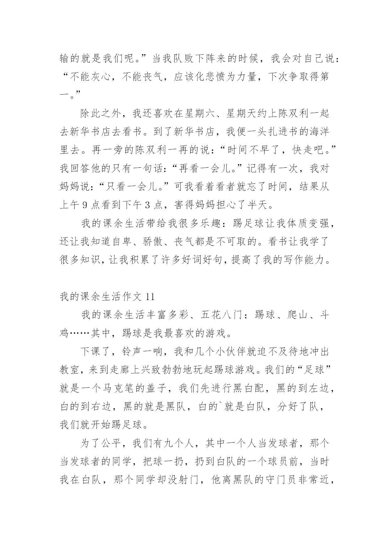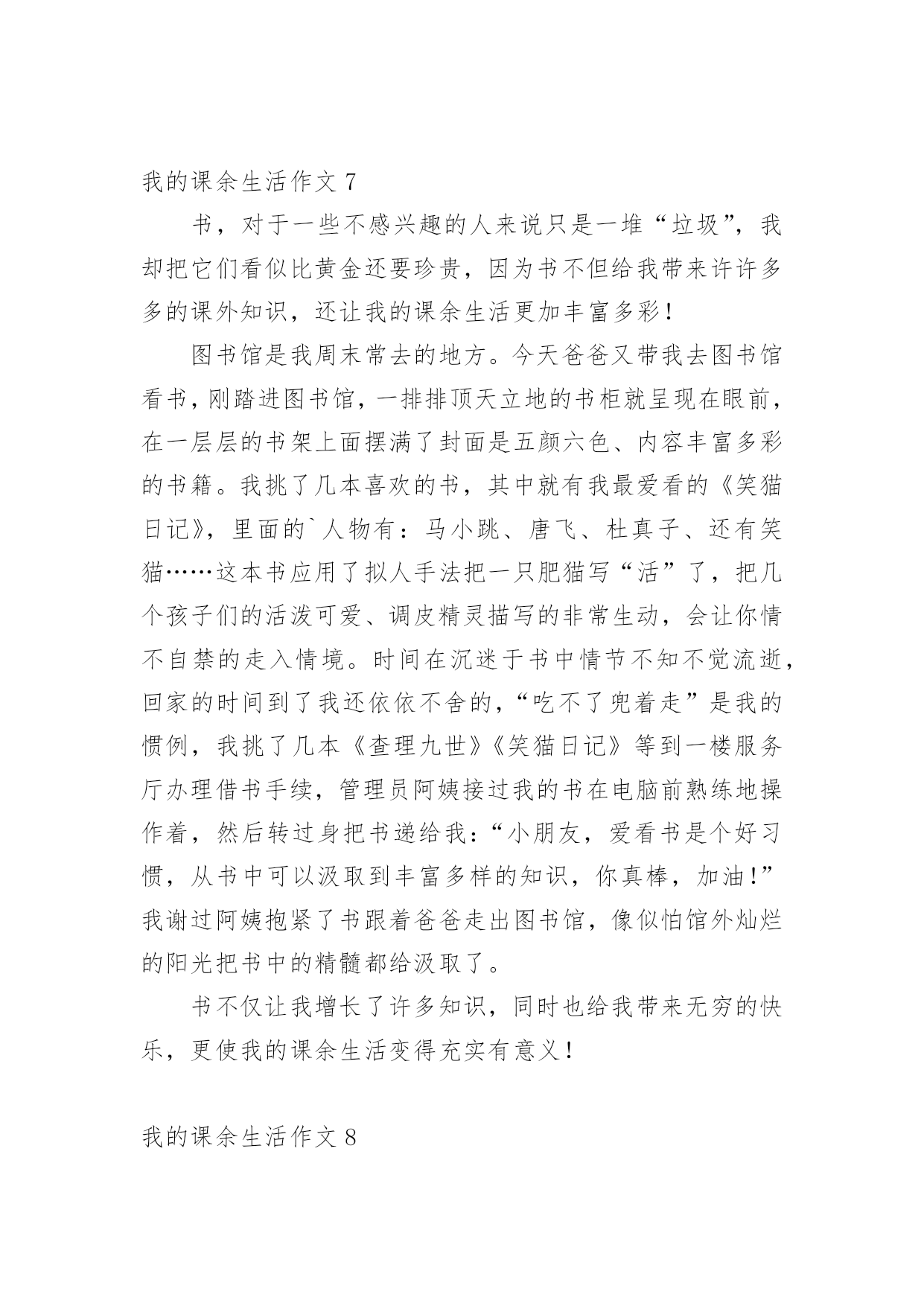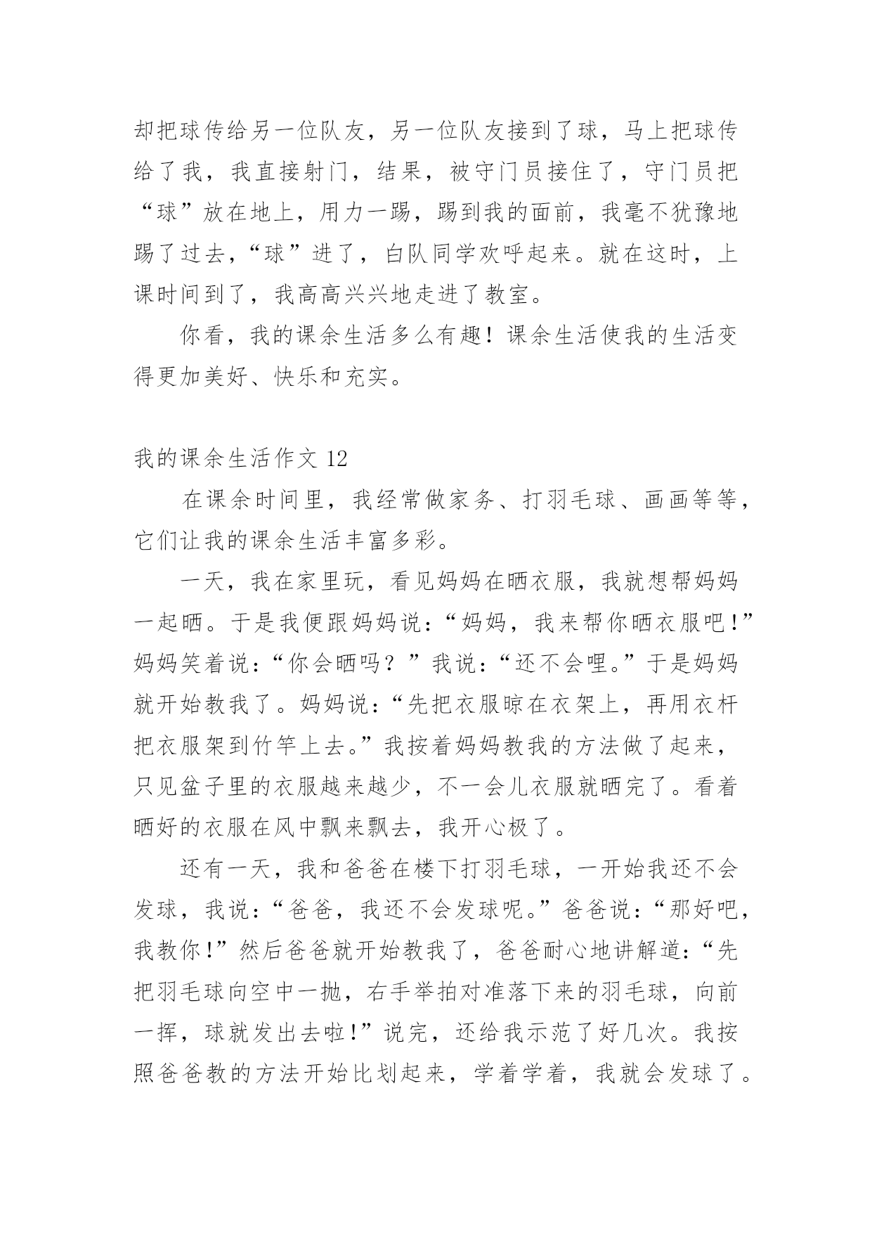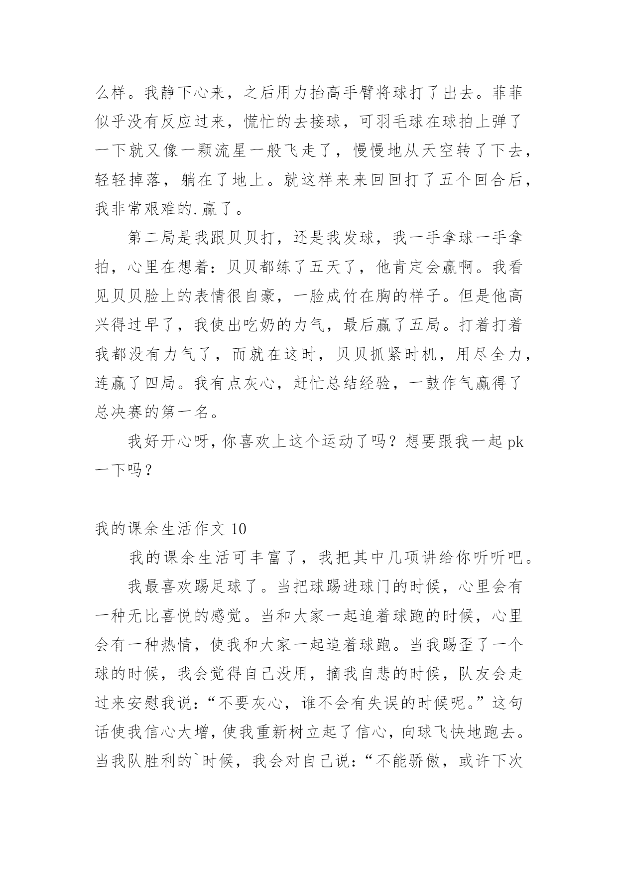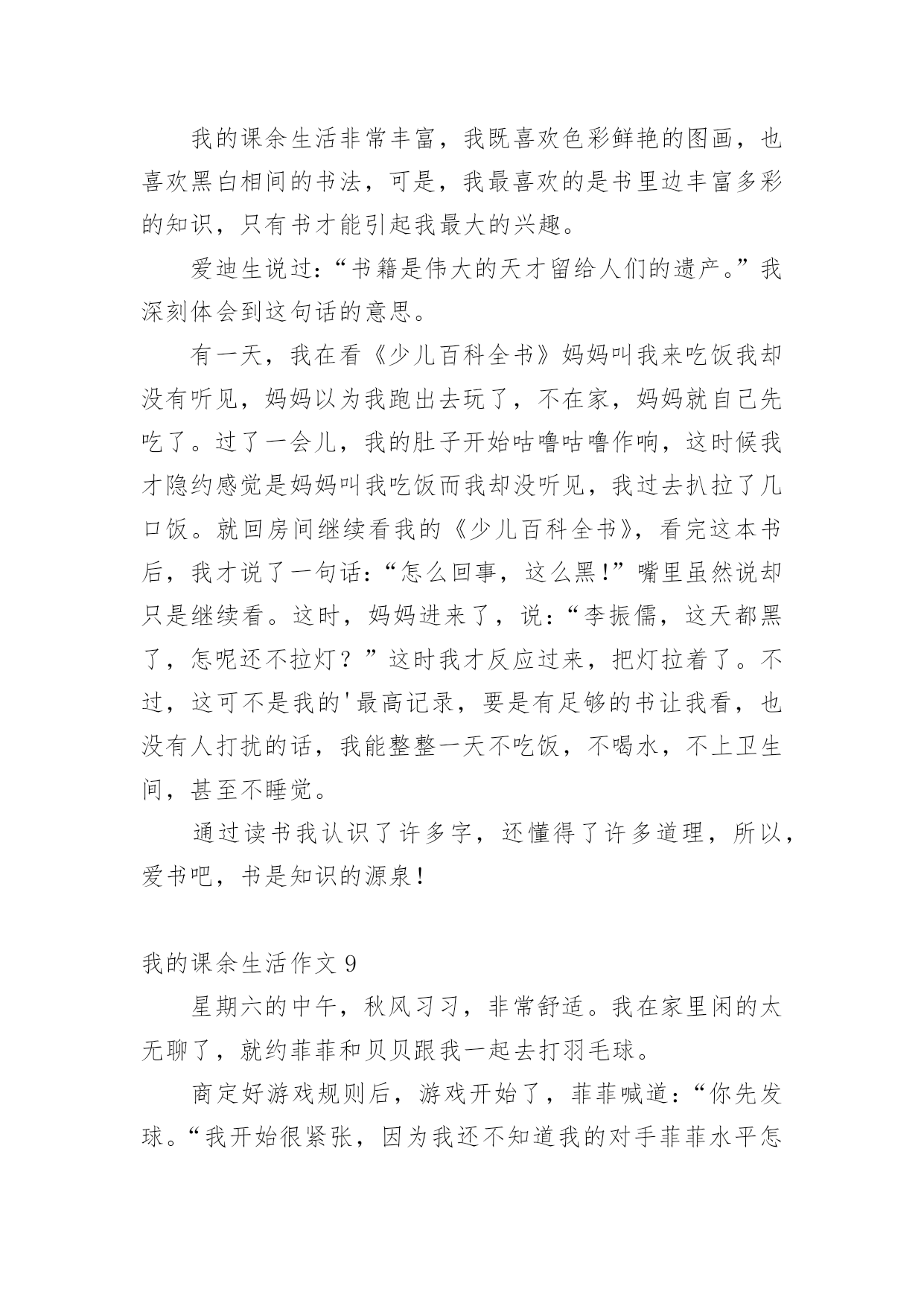 我的课余生活作文在日常的学习、工作、生活中,说到作文,大家肯定都不陌生吧,借助作文可以提高我们的语言组织能力。你知道作文怎样写才规范吗?下面是小编帮大家整理的我的课余生活作文,欢迎大家借鉴与参考,希望对大家有所帮助。我的课余生活作文1我的课余生活真是丰富多彩,跳绳、丢手绢、画画、看书……,但是我最喜欢的是看课外书。俗话说“读书破万卷,下笔如有神”。我感觉读书使人获得知识,让你的心灵更加美丽!这几年我看过诗歌、散文、小说、童话等等。我最喜欢的作家是冰心老人,因为她有一颗童心:最喜欢看的是小说,有时可以看上几个小时自己却不知道,只感觉自己跟着主人公时而哭,时而笑,被故事情节深深的`打动。我从上小学一年级就开始读书,读的第一本书是《鲁滨逊漂流记》作者是英国的丹尼尔。笛福。这本书主要描写了17世纪一名英国水手鲁滨逊。克鲁索乘坐的轮船不幸被无情的大海吞没,他流落荒岛,过着艰苦的生活。后来救了野人星期五,主仆二人凭着自己坚强的毅力,依靠个人的双手创造美好的生活。通过阅读使我有了坚强的意志,变得更加勇敢,记得第一次我独自回家时,心里害怕极了,大马路上人山人海的。心里想:鲁滨逊都可以自己生活,这点困难怕什么?于是我一边走一边想不知不觉到家了!我喜欢读书,以后多多读书。我的课余生活作文2我的课余生活绚丽多姿,画画呀,作文呀,但是,我最喜欢的,是没多少男生愿意学的,而又是人人都称赞、都喜欢的拉丁舞。咦,怎么都没人鼓掌呀?算了,我先给你们说说我第一天上课的情况吧。第一天是这样的,我走进上课的地方,哇塞,这里好大呀!我火速地穿上拉丁鞋,等着上课。这时,一位女老师走了进来,她自我介绍完后,就让我们压腿,哇,好痛呀!我心想,嗷,真是流年不利呀!接着是青蛙趴,高抬腿……最耗体力的是蛙跳和高抬腿,老师说到蛙跳要跳二十个的时候,同学们有的嘴巴张得大大的,有的眼睛瞪得老大,差点眼珠子没掉出来。跳完后,大家的`腿果然都软了,累得东倒西歪。还有高抬腿,要把腿抬到最高,最快。做这些都是为了我们舞蹈动作能够更到位,更优美。再跟你们说一下一年后也就是现在的我是什么样的。我升上了中级班,我在里面已经是霸气十足,而且是一个引人注目的“舞王”了。妈妈说这是我刻苦训练和不断努力的结果。正因为这样,本周末,我将要赶赴晋江,去参加全国的拉丁舞比赛呢!课余生活跳拉丁舞让我魅力十足,给我带来了成就感。同时,我也明白了:只要努力,一切都会心想事成。我的课余生活作文3我的课余生活丰富多彩,像天上的云彩一样。我喜欢画画、练字、读书……其中,最喜欢的就是读书了。说起读书,我还和它有一个小故事呢!上幼儿园的时候,妈妈总是给我讲故事,唱儿歌。有一天我缠着妈妈问,那么多故事是从哪儿来的?妈妈拿着一本故事书告诉我,在这儿呢!我感觉书是一个神奇的童话世界。终于有一天,我拿过一本故事书看了起来,当我翻到第一页的时候,咦!怎么都是些奇形怪状的符号呀!渐渐地,我上一年级了,开始接触这些奇形怪状的符号。通过一段时间的学习,慢慢的.认识一些字了,还会写了。再拿起那本故事书的时候,我基本能看懂了。每个故事都教会我一个做人的道理,做人要诚实守信、善良、正直,小故事教会我许多大道理,让我受益匪浅。我觉得自己有了很大的进步,我要学会更多的字,读懂更多的书。我的课余生活作文4我的课余生活丰富多彩,给我带来了无穷的乐趣。我喜欢画画、唱歌、舞蹈。但我最喜欢的是翻花绳。下课的铃声响起,我和王珂拿出最近流行的.玩具——绳子,和他玩起来。我先把绳圈反套在两只手上,大拇指和小拇指将绳圈卡住,戒指用中指将行在手心上的八条线,像拉开关似的用力往左右两边一拉,一个类似“蜘蛛网”的花样就出来了,图案一会儿变成棱形,一会儿变成圆形,一会儿变成三角形,把我们都逗乐了,我们既编织着自己的梦想,又编织着自己的美好未来,紧接着,王珂将大拇指往“蜘蛛网”中间线上一扣,勾过来,又将大拇指原来卡住的那条线“放生”,小拇指也学大拇指一样把线“放生”。最后,两只手一拉,一个“碗”便展现在我们的面前。我的课余生活作文5我喜欢画画、看书,不过我最常练习的就是写字。我每天回家把作业做完,就迫不及待地跑过去写字。第一天练习写字,我的字写得非常不好,横不平,竖不直。后面几天,爷爷每天帮我把写不好的字指出来,好让我纠正错误。我照着字帖一个字一个字模仿,一遍不行就再写一遍,反复练习,直到写好,正因为我这样努力,才有了今天的比较工整的书写。有几次我为了赶速度,字又变得难看起来,爷爷就对我说:“你字写得这么难看,要是你长大了,人家叫你去写你的名字,你说你会不会写得好呀?所以你现在的`字写得不好,你未来的字就会像你小时侯写的字一样了。”我脸红了,我对爷爷说:“我以后一定要把字写好。”从此,我知道了把字写好是很关键的。还有一次,爷爷教我写一首诗,写的是李白的“床前明月光,疑是地上霜