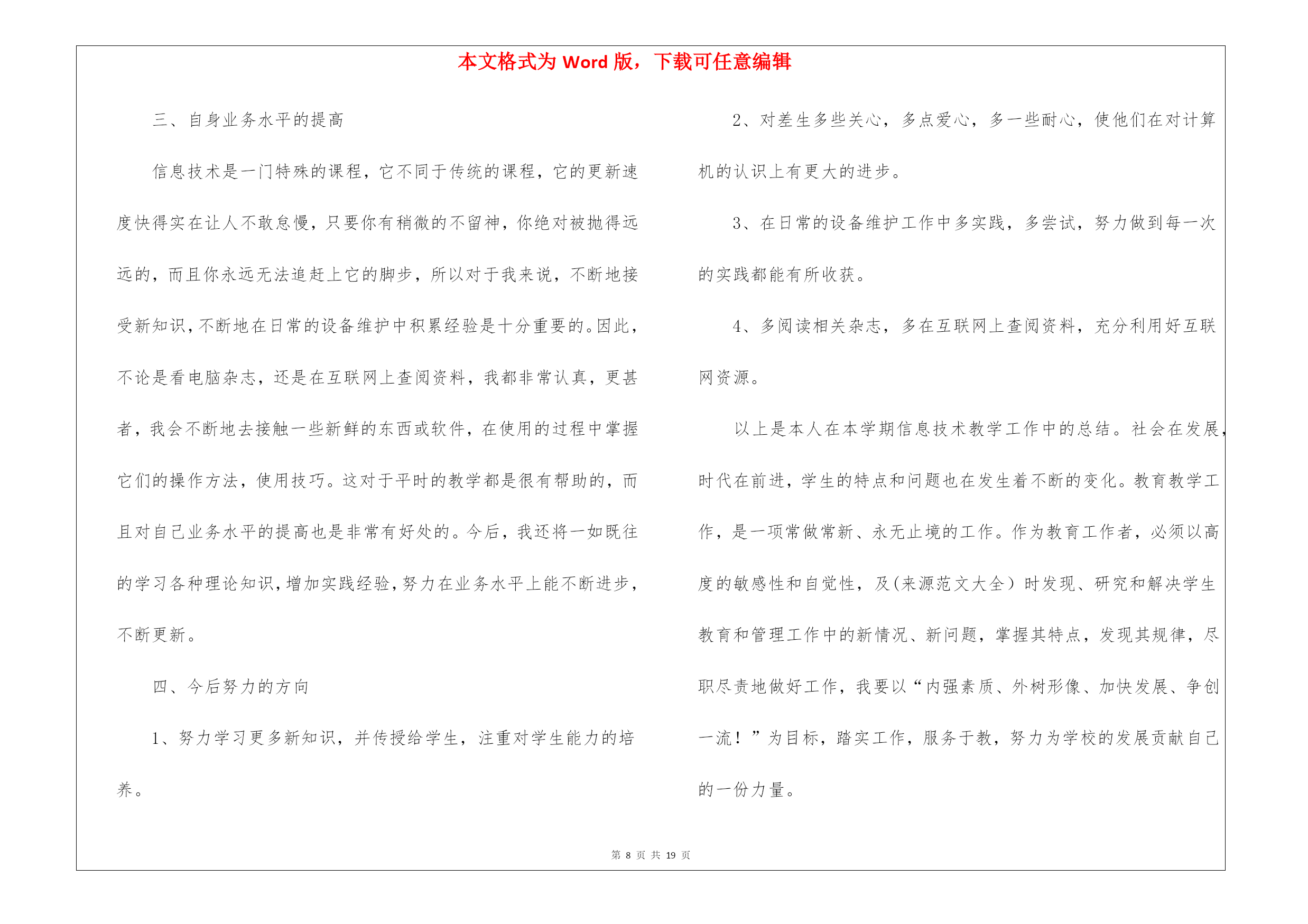 本文格式为Word版,下载可任意编辑第PAGE\*MERGEFORMAT19页共NUMPAGES\*MERGEFORMAT19页有关信息技术教学总结模板集合十篇有关信息技术教学总结模板集合十篇在日常学习、工作抑或是生活中,大家都不可避免地会接触到书信吧,书信可以传达自己的思想感情。相信很多朋友都对写信感到非常苦恼吧,下面是我整理的信息技术教学总结10篇,仅供参考,欢迎大家阅读。信息技术教学总结篇1不知不觉中一个学期就结束了,回顾这个学期所从事的信息技术教学工作,基本上是比较顺利地完成任务。当然在工作中我享受到收获喜悦,也在工作中发现一些存在的问题。我所享有的收获,我会用于下个学期的工作中,我所碰到的问题我会认真思考,想办法解决。在这个学期中,本人能在保持原有良好工作态度的基础上,不断进步,不断进取,不断学习,虚心向有经验的老师学习。为了保持优良的工作姿态,以使下一学年能以更优秀的面貌去继续工作,现将本人该学期的工作情况进行全面的总结,总结如下:一、思想方面在这一个学期里,我在思想上严于律己,热爱教育事业,各方面约束自己,鞭策自己,对自己要求更为严格,力争在思想上、工作上在同事、学生的心目中树立良好的形象,使自己的思想再上一个新的台阶,同时也对自己思想上有了更加高的要求。一学期来,我还积极参加各业务培训学习,努力提高自己的教学水平和业务水平,提高自身的思想觉悟。服从学校的工作安排,默默无声地配合领导和老师们做好校内外的各项工作,得到了领导和同事的肯定。这些肯定使我在以后的工作中变得更有信心、有动力去做好每一样工作。二、工作方面这学期主要担任高三年级共11个班的信息技术教学和学校电教设备的检修、维护等工作。工作是繁忙的,但作为已进入教师行业第二年的我,相对于上一年,无论是工作方法、工作经验、还是工作效率都有了明显的改善。虽然工作量比较大,但为了提高教学水平和提高业务水平,本人在大量编写别人优秀设计,优秀架构,向有经验老师请教的基础上,利用本人有限的时间建成个人教学博客,这有利于同行同事间的交流和学习,方便学生与我的交流,这大大有利于我教学的提高和及时掌握学生的动向,有利于引导学生的学习。在教学之余,我也注重自身发展进步。除了听课,评课,参加教研组教研活动外,我还注意到要自学。从思想上,利用行评机会端正自己;从行动上学电脑技术,学教学技能等;在生活上注意形象,为人师表。在学校设备管理方面,本学期,本人对自己负责的电教设备进行了全面的检修,保养,力求它们能够正常的工作,为学生创造一个良好的学习环境。三、考勤方面。我在做好各项教育教学工作的同时,严格遵守学校的各项规章制度。处理好学校工作与私人之间的关系,不迟到不早退,有时还会加班加点,这同时煅练了自己。对学校的工作尽职尽责,不论是学校分到的哪一项工作,我都配合同事尽自己的努力把工作做好。四、更新知识体系整学期的工作任务虽非常重,但不管怎样,作为一名信息技术老师,应具有比别人更超前的目光,及时掌握最新的科技资讯,明白到自身的责任,为此,我经常通过订阅《教育信息化》、《网络安全》、《新潮电子》等书籍,上网浏览新课程教学网等形式,学习更加多的、好的、新的知识。同时还争取机会多出外听课,从中学习别人的长处,领悟其中的教学艺术。平时还虚心请教有经验的老师。五、总结总括这一学期,本人能在自己的工作岗位上尽职尽责,敬业爱岗,不断进取,不断进步,遵纪守法。展望下一学期,我会在保持原有优良作风的基础上不断发展,我一定要发扬优点,改正不足,扬长避短,争取更大的成绩。信息技术教学总结篇2转眼间学期即将结束,回顾这一学期,我努力工作,认真学习,从多方面进行计算机教学和教导处工作。有辛勤的耕耘,有收获的喜悦。我将享有的收获用于下个学年的工作中,将所碰到的问题认真思考,加以总结,千方百计,想出良好的解决办法。一、教学工作1、备课方面开学初,根据学校要求,认真写好教学计划,提前备好课,写好教案。平时做到周前备课。备课时认真钻研教材,力求吃透教材,找准重点和难点。为上好每一节课,我上网查资料,集中和汲取别人的优点,确定自己的教学思路。为学生能更直观地感受所学的知识内容,我积极制作课件,准备各种直观教学软件,搜集制作各知识点优秀案例展示给学生。2、上课方面上好课的前提是做好课前准备,不打无准备之仗,尤其本学科主要课程都要上机完成,每节都要认真做好上机备课,检查机器状态,有无“不可用机器”。上课时认真讲课,做到演示到位,力求抓住重点,突破难点,精讲精练。运用多种教学方法,从学生的实际出发,注意调动学生学习的积极性和创造性思维,使学生有举一反三的能力,注重学生创新思维的发展,培养学生的创新能力。在学生完成上机任务时,在每台计算机前巡视,注意对学困生进行手把手的辅导。课后,及时做课后反思,找出不足,总结一