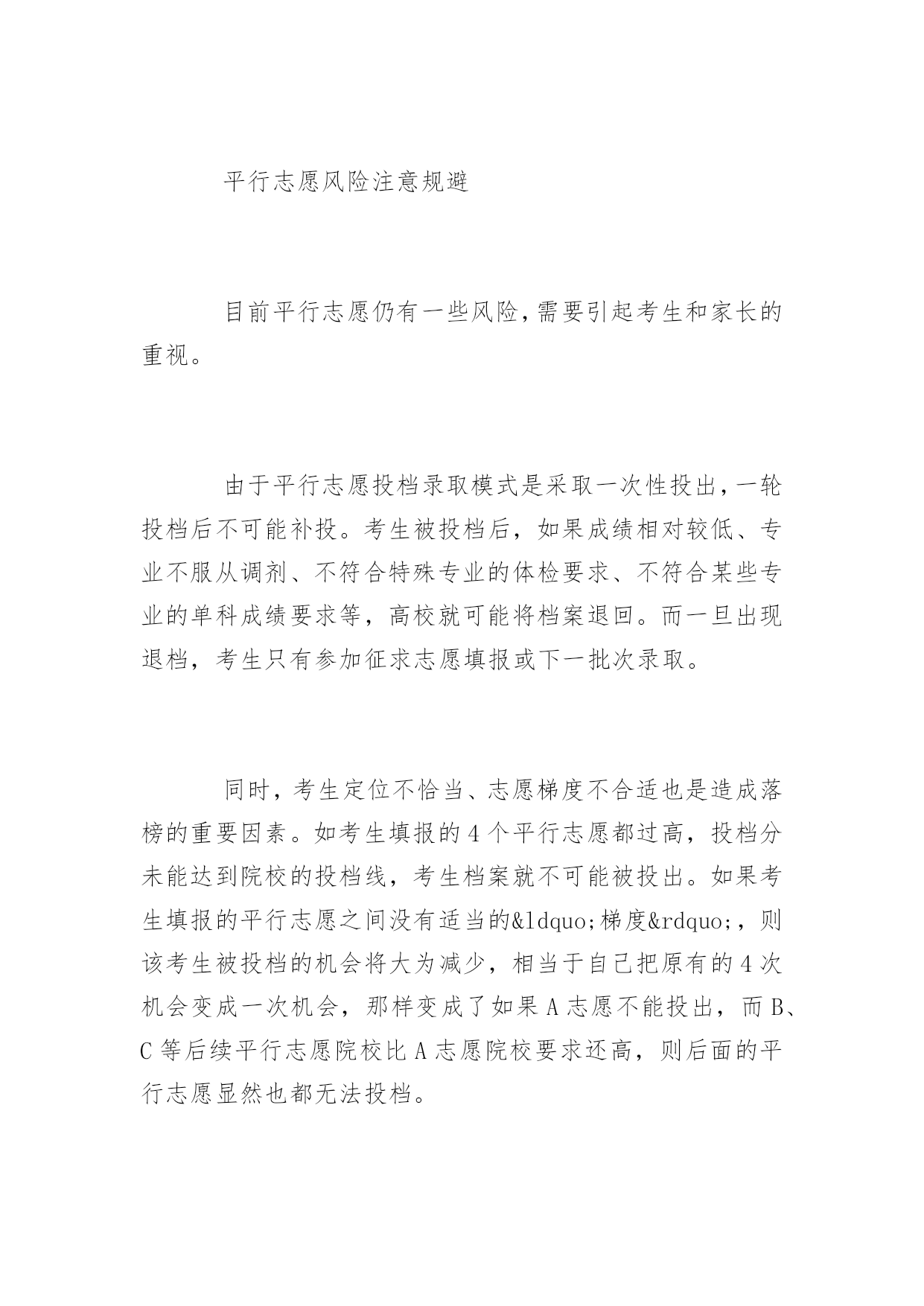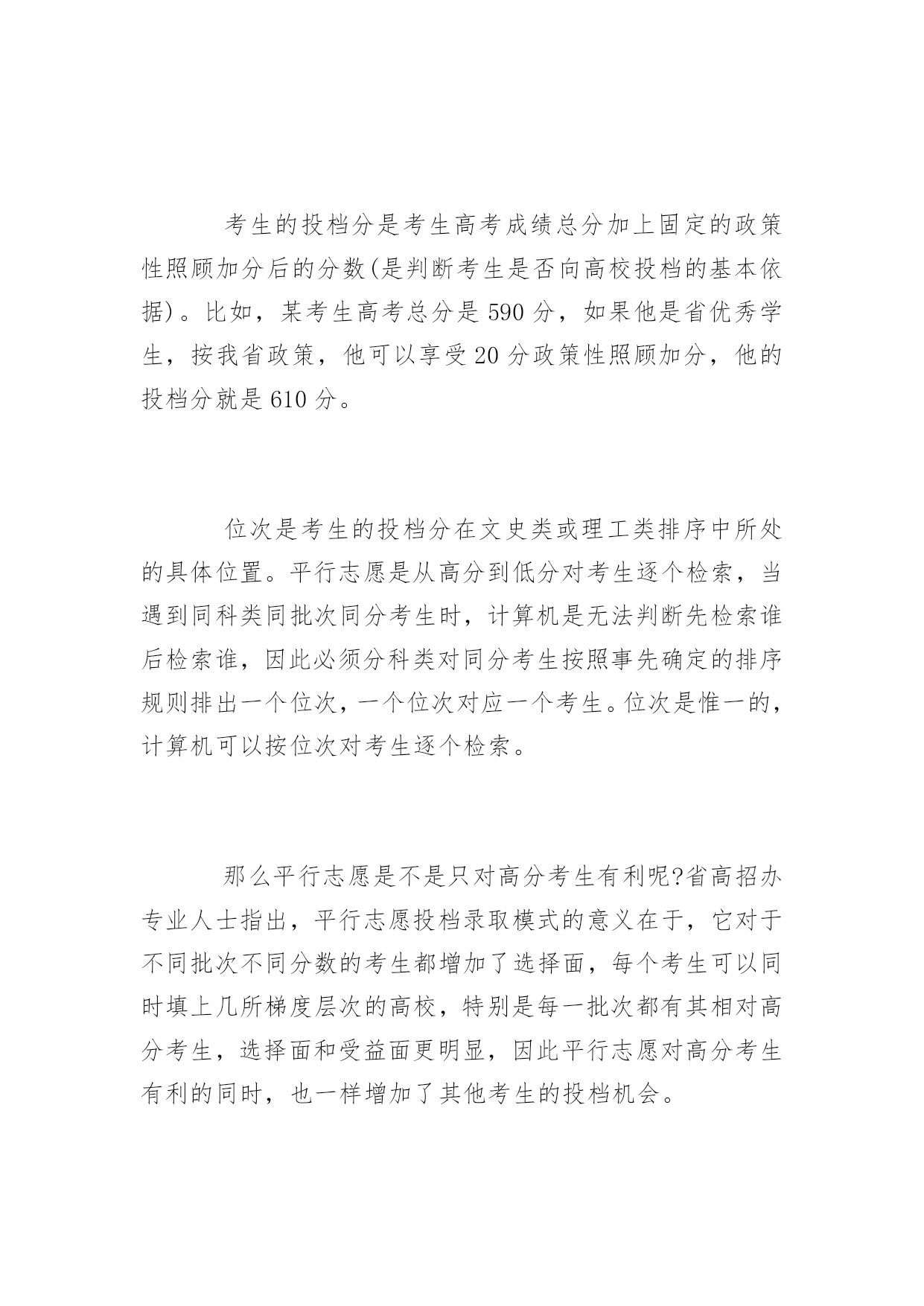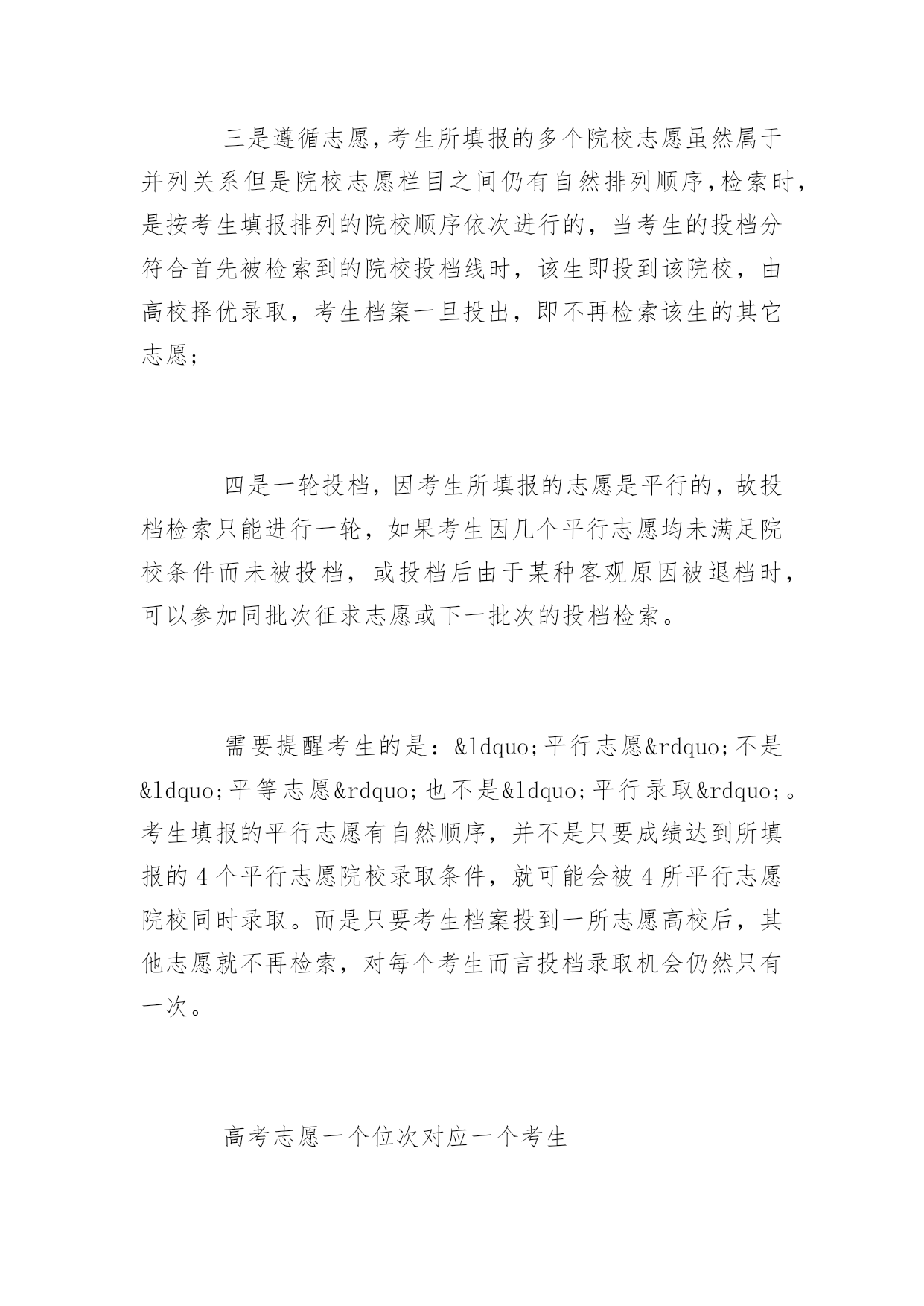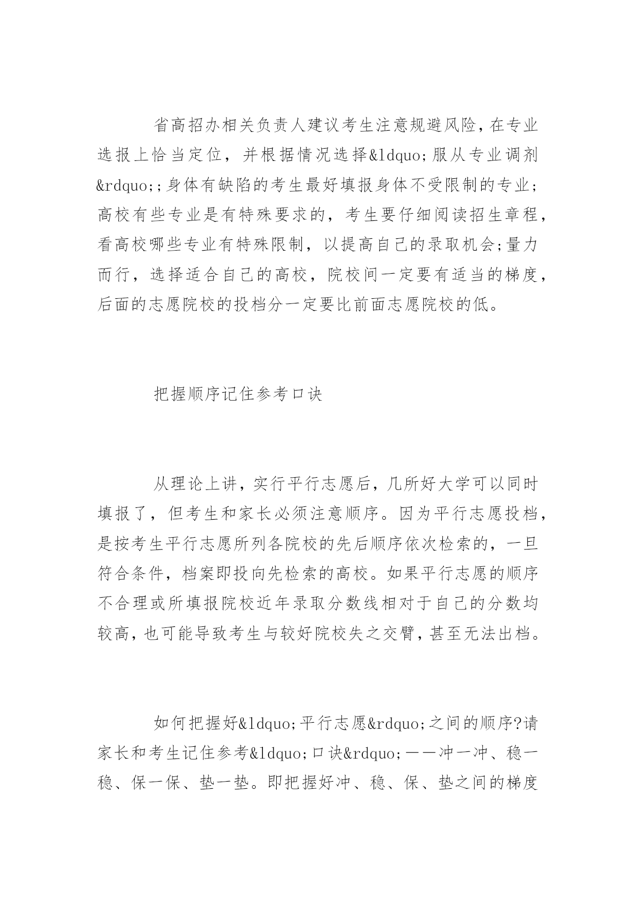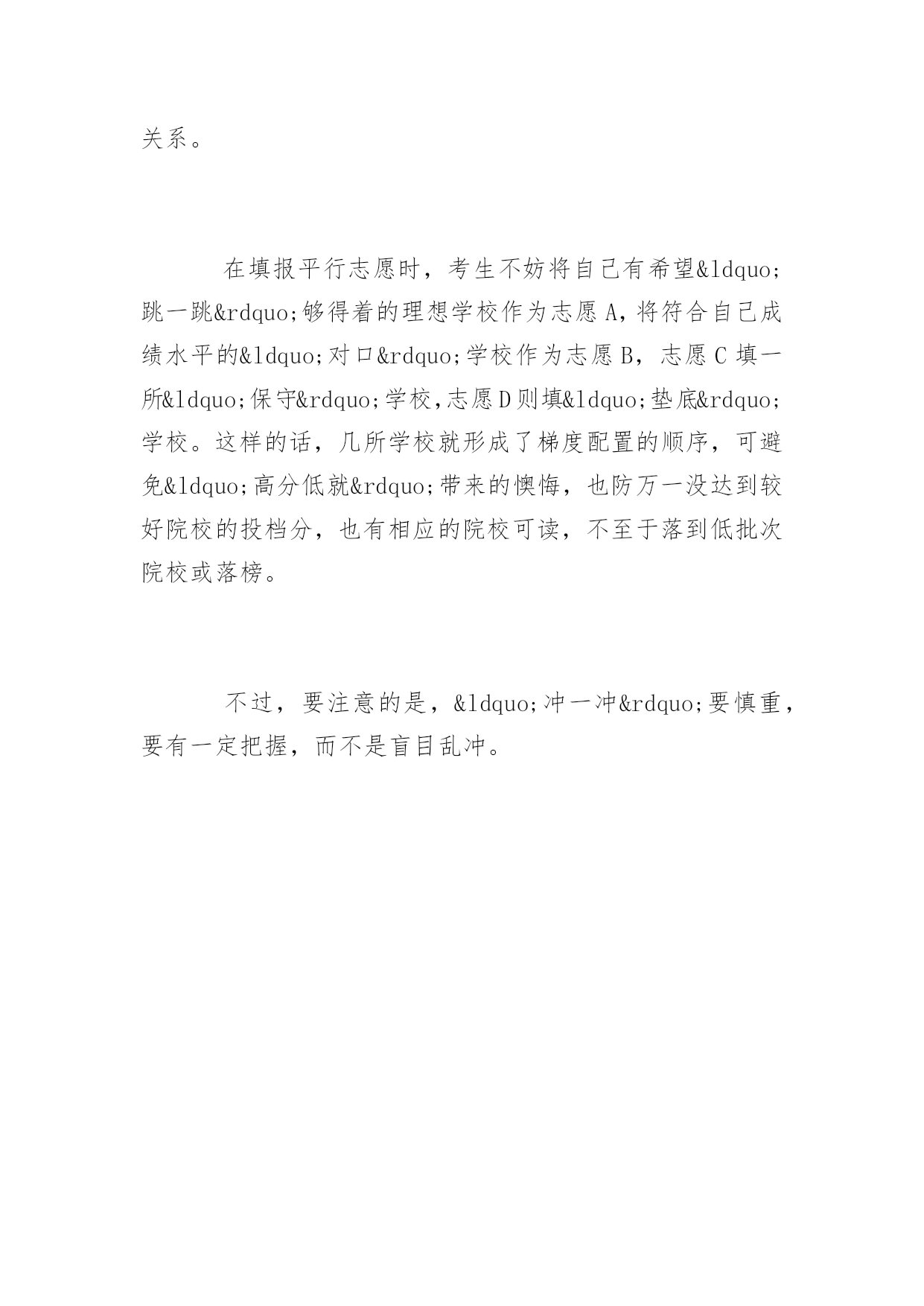 高考志愿填报技巧指导高考志愿填报技巧指导第一节走进平行志愿的陌生世界对考生来讲,高校志愿的填报是一项很重要的工作,如何才能依据自己的成绩被相对较好的院校录取,需要靠正确的志愿填报。下面是阳光网小编为你整理的高考志愿填报技巧指导内容,希望对你有帮助。平行志愿也有自然顺序一是志愿并列,考生所填报的多个院校志愿属于并列关系,即在同一投档时间段,考生所填院校均有可能被检索;二是分数优先,在检索考生填报的院校志愿前,首先要将所有考生分文史、理工类按投档分(高考总分加政策照顾分)从高分到低分进行位次排列,投档检索时,先从最高位次考生志愿检索,再依次检索以后位次的考生志愿;三是遵循志愿,考生所填报的多个院校志愿虽然属于并列关系但是院校志愿栏目之间仍有自然排列顺序,检索时,是按考生填报排列的院校顺序依次进行的,当考生的投档分符合首先被检索到的院校投档线时,该生即投到该院校,由高校择优录取,考生档案一旦投出,即不再检索该生的其它志愿;四是一轮投档,因考生所填报的志愿是平行的,故投档检索只能进行一轮,如果考生因几个平行志愿均未满足院校条件而未被投档,或投档后由于某种客观原因被退档时,可以参加同批次征求志愿或下一批次的投档检索。需要提醒考生的是:“平行志愿”不是“平等志愿”也不是“平行录取”。考生填报的平行志愿有自然顺序,并不是只要成绩达到所填报的4个平行志愿院校录取条件,就可能会被4所平行志愿院校同时录取。而是只要考生档案投到一所志愿高校后,其他志愿就不再检索,对每个考生而言投档录取机会仍然只有一次。高考志愿一个位次对应一个考生考生的投档分是考生高考成绩总分加上固定的政策性照顾加分后的分数(是判断考生是否向高校投档的基本依据)。比如,某考生高考总分是590分,如果他是省优秀学生,按我省政策,他可以享受20分政策性照顾加分,他的投档分就是610分。位次是考生的投档分在文史类或理工类排序中所处的具体位置。平行志愿是从高分到低分对考生逐个检索,当遇到同科类同批次同分考生时,计算机是无法判断先检索谁后检索谁,因此必须分科类对同分考生按照事先确定的排序规则排出一个位次,一个位次对应一个考生。位次是惟一的,计算机可以按位次对考生逐个检索。那么平行志愿是不是只对高分考生有利呢?省高招办专业人士指出,平行志愿投档录取模式的意义在于,它对于不同批次不同分数的考生都增加了选择面,每个考生可以同时填上几所梯度层次的高校,特别是每一批次都有其相对高分考生,选择面和受益面更明显,因此平行志愿对高分考生有利的同时,也一样增加了其他考生的投档机会。平行志愿风险注意规避目前平行志愿仍有一些风险,需要引起考生和家长的重视。由于平行志愿投档录取模式是采取一次性投出,一轮投档后不可能补投。考生被投档后,如果成绩相对较低、专业不服从调剂、不符合特殊专业的体检要求、不符合某些专业的单科成绩要求等,高校就可能将档案退回。而一旦出现退档,考生只有参加征求志愿填报或下一批次录取。同时,考生定位不恰当、志愿梯度不合适也是造成落榜的重要因素。如考生填报的4个平行志愿都过高,投档分未能达到院校的投档线,考生档案就不可能被投出。如果考生填报的平行志愿之间没有适当的“梯度”,则该考生被投档的机会将大为减少,相当于自己把原有的4次机会变成一次机会,那样变成了如果A志愿不能投出,而B、C等后续平行志愿院校比A志愿院校要求还高,则后面的平行志愿显然也都无法投档。省高招办相关负责人建议考生注意规避风险,在专业选报上恰当定位,并根据情况选择“服从专业调剂”;身体有缺陷的考生最好填报身体不受限制的专业;高校有些专业是有特殊要求的,考生要仔细阅读招生章程,看高校哪些专业有特殊限制,以提高自己的录取机会;量力而行,选择适合自己的高校,院校间一定要有适当的梯度,后面的志愿院校的投档分一定要比前面志愿院校的低。把握顺序记住参考口诀从理论上讲,实行平行志愿后,几所好大学可以同时填报了,但考生和家长必须注意顺序。因为平行志愿投档,是按考生平行志愿所列各院校的先后顺序依次检索的,一旦符合条件,档案即投向先检索的高校。如果平行志愿的顺序不合理或所填报院校近年录取分数线相对于自己的分数均较高,也可能导致考生与较好院校失之交臂,甚至无法出档。如何把握好“平行志愿”之间的顺序?请家长和考生记住参考“口诀”――冲一冲、稳一稳、保一保、垫一垫。即把握好冲、稳、保、垫之间的梯度关系。在填报平行志愿时,考生不妨将自己有希望“跳一跳”够得着的理想学校作为志愿A,将符合自己成绩水平的“对口”学