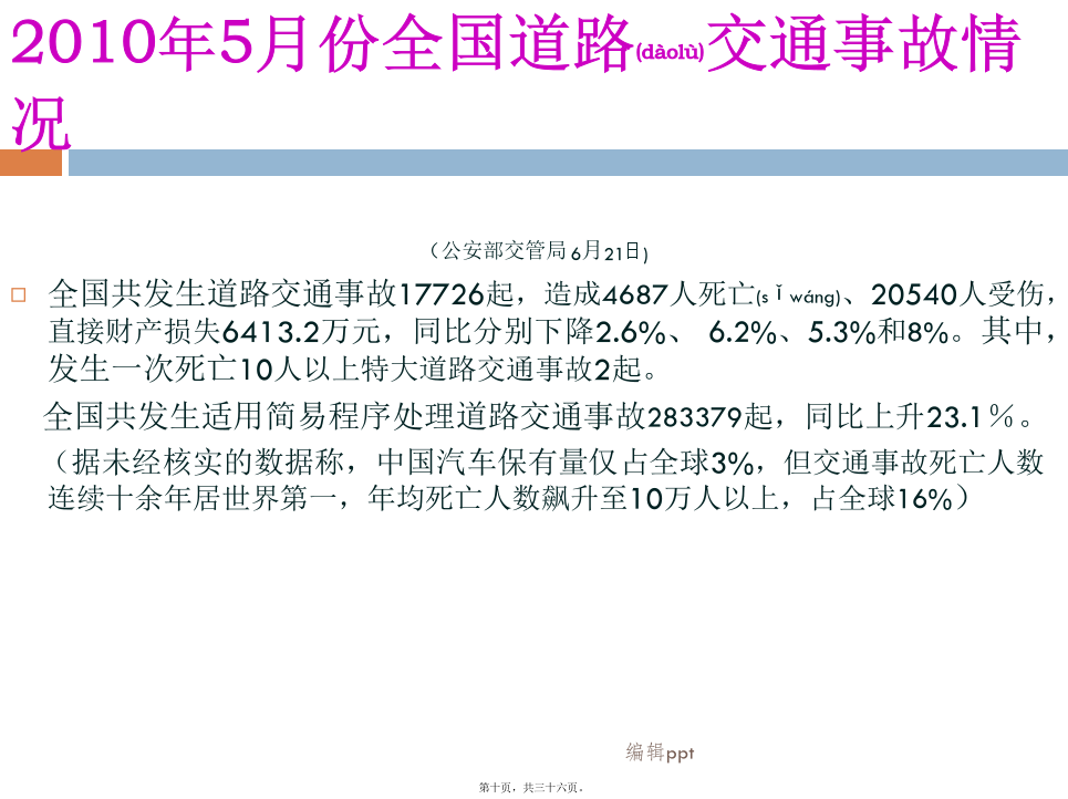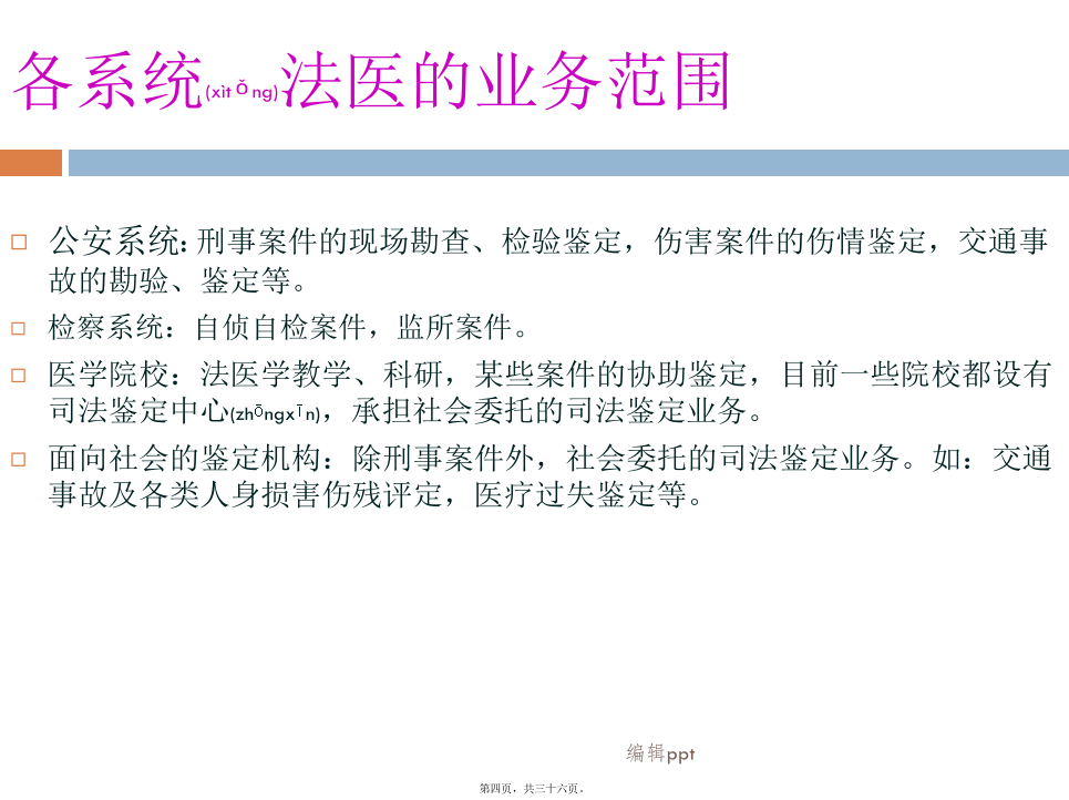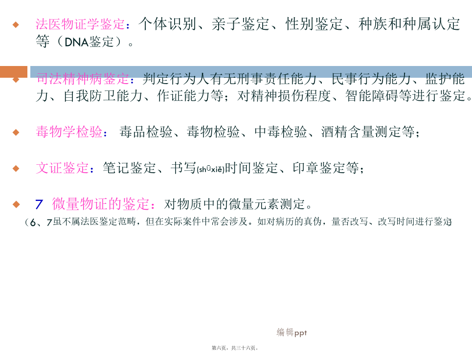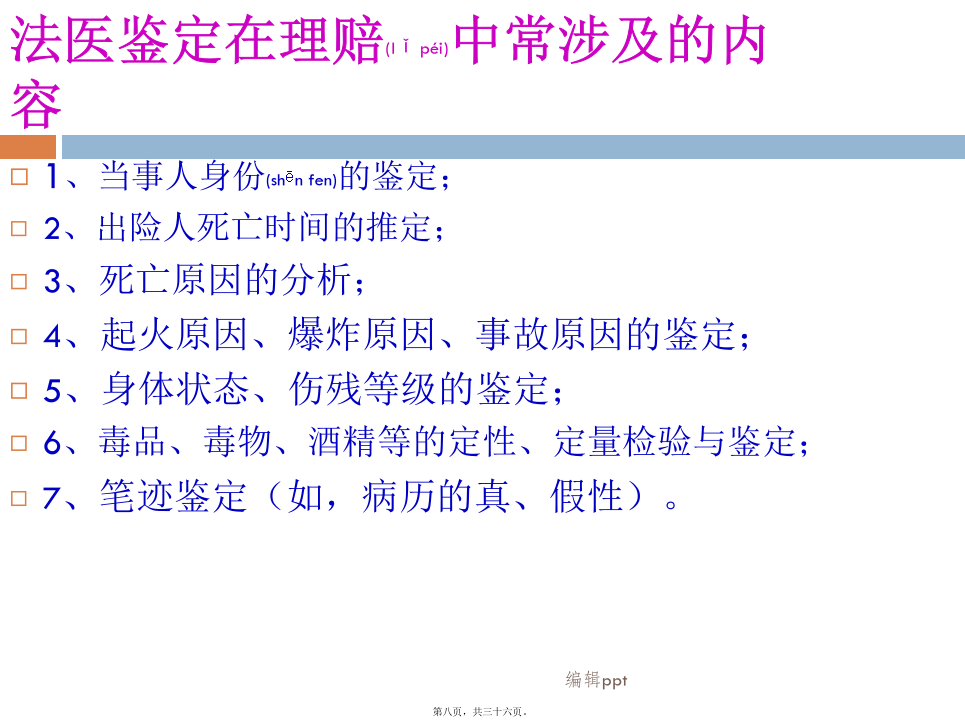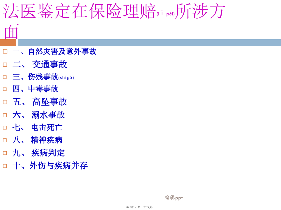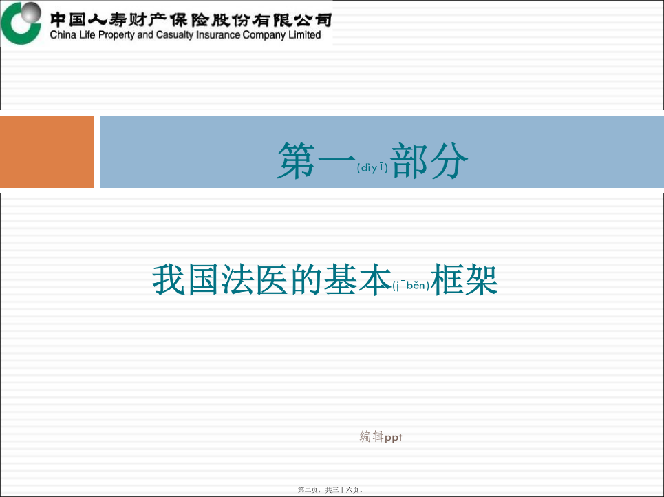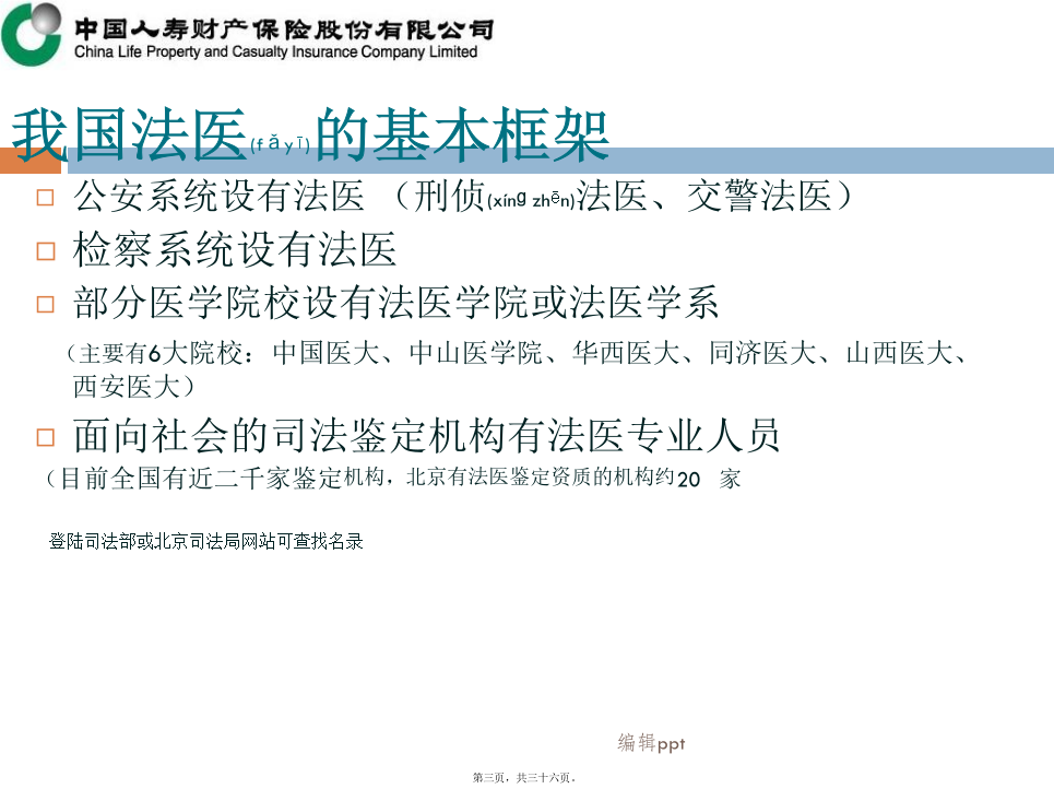 车险部2012年04月我国法医的基本(jīběn)框架我国法医(fǎyī)的基本框架各系统(xìtǒng)法医的业务范围法医学鉴定(jiàndìng)的分类法医物证学鉴定:个体识别、亲子鉴定、性别鉴定、种族和种属认定等(DNA鉴定)。司法精神病鉴定:判定行为人有无刑事责任能力、民事行为能力、监护能力、自我防卫能力、作证能力等;对精神损伤程度、智能障碍等进行鉴定。毒物学检验:毒品检验、毒物检验、中毒检验、酒精含量测定等;文证鉴定:笔记鉴定、书写(shūxiě)时间鉴定、印章鉴定等;7微量物证的鉴定:对物质中的微量元素测定。(6、7虽不属法医鉴定范畴,但在实际案件中常会涉及。如对病历的真伪,量否改写、改写时间进行鉴定)法医鉴定在保险理赔(lǐpéi)所涉方面法医鉴定在理赔(lǐpéi)中常涉及的内容第二(dìèr)部分2010年5月份全国道路(dàolù)交通事故情况法医在保险理赔(lǐpéi)中的作用受理车险理赔的鉴定(jiàndìng)机构与车险理赔(lǐpéi)有关的内容法医受理委托鉴定的程序(chéngxù)和材料与车险理赔(lǐpéi)相关的标准2.《人身损害误工损失日评定准则》GA/T521-2004(行标,公安部发布)由中国(zhōnɡɡuó)法医学会组织制定,标准发布实施后,中国(zhōnɡɡuó)平安保险公司车险理赔部率先将该标准引入,具统计2006-2007年使用标准核赔及委托司法鉴定机构进行评定的案件达1万多宗。这个标准条款清楚、使用简易,理赔人员很容易掌握。目前,许多司法鉴定机构都开设了这个评定项目(误工费)。3.《道路交通事故受伤人员临床诊疗指南》和《道路交通事故受伤人员救治项目评定(píngdìng)规范》(GA/T769-2008行标公安部发布)◆2010年7月1日〈侵权责任法〉实施,该法第63条规定“医疗机构及其医务人员不得违反诊疗规范实施不必要的检查”。也就是说医院过度检查,患者可索赔偿。那么在交通事故救治中如何认定是否(shìfǒu)存在过度医疗的行为,除了我们理赔人员所具备的专业知识外,《救治指南》和《评定规范》则是认定的依据。《评定规范》中对各类伤都有相应的条款,可帮助理赔人员对医疗检查、药费项目等的合理性进行判断和认定。4.《人身损害(sǔnhài)护理依赖程度评定》GA/T880-2008(行标,公安部发布)5.《劳动(láodòng)能力鉴定职工工伤与职业病致残等级》(GB/T16180-2006国标)《道标》与《工标》的差异(chāyì)《工标》与《护理依赖(yīlài)程度》的差异鉴定结论不一致(yīzhì)的问题举例(jǔlì)3.医疗(yīliáo)救治水平的差异,也是影响鉴定结论一个因素(如:伤情重,但结果好;伤情轻,但结果差)。4.不排除个别鉴定人(或机构),出现背离职业道德水准的行为。如何(rúhé)看待法医鉴定的问题理赔人员案件审核应注意(zhùyì)问题举例1某女,50岁。因交通事故造成8根肋骨骨折。于2009年4月15日—6月10日在某一部队医院住院救治(共住院55天)。住院期间拍摄影像学检查片共计(ɡònɡjì)25张。其中胸部三维CR片14张、CT片7张、其它部位CT片4张(入院6天后,平均每3-5天拍一张CT/CR)。另入院前6天,平均每天CT/CR(共计拍片30余张)。保守治疗共花费医药费5万多元。此例为一典型的过度医疗检查。举例(jǔlì)2举例(jǔlì)3同年8月10日法医学检查。周某主诉:双眼视力下降伴不能闭眼1年多。否认甲状腺病史。检查双眼均无光感。眼睑轻度肿胀,眼球突出(tūchū),睑裂增大,眼睑不能闭合,球结膜充血水肿,角膜灰白色混浊,上方球结膜充血不明显,角膜大量新生血管。左眼角膜结膜化,前房浅至消失,眼底窥不清。实验室检查:血清总甲状腺素(TT4)287.0nmol/L、游离甲状腺素(FT4)77.2pmol/L明显增高,促甲状腺激素(FSH)<0.004mIU/L明显降低.。经聘请眼科和内分泌科专家会诊、查体综合分析认定周某符合甲状腺功能亢进症、双眼Graves(甲亢眼)、暴露性角膜炎。鉴定意见甲亢及甲亢眼,致双眼暴露性角膜炎,导致双眼视力下降。其双眼视力下降由甲亢引起,与交通事故所致外伤无关。本例被鉴定人是应伤前有患病史,初次鉴定时忽略了系统的体格检查,也未对视力下降进行伤病关系分析鉴别,鉴定为II级伤残,与重新鉴定差异大。法医鉴定与医疗诊断(zhěnduàn)的区别案例(ànlì)3.保险业公信力的提高(tígāo)谢谢!内容(nèiróng)总结