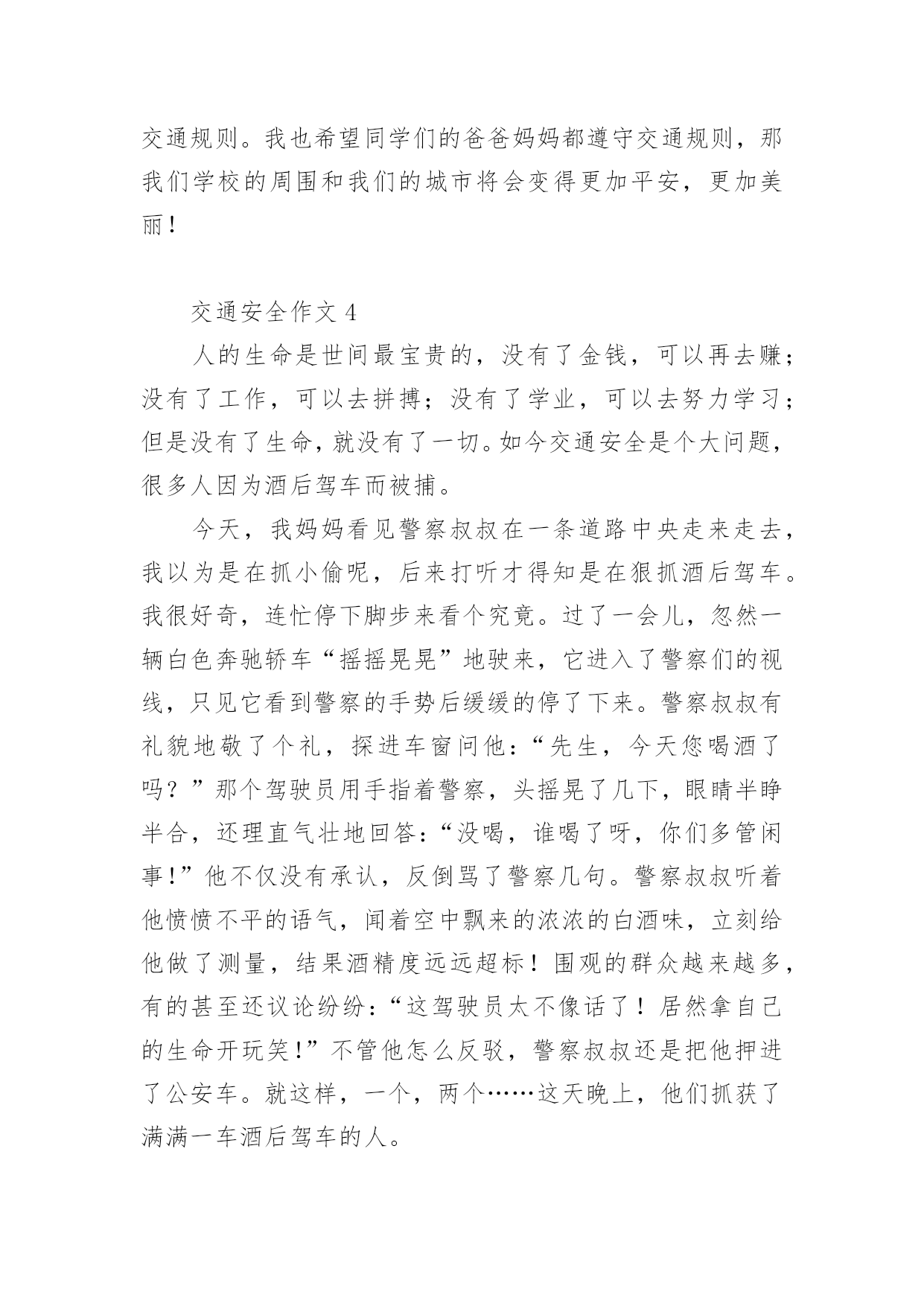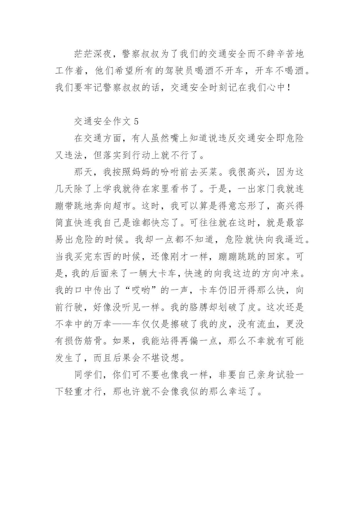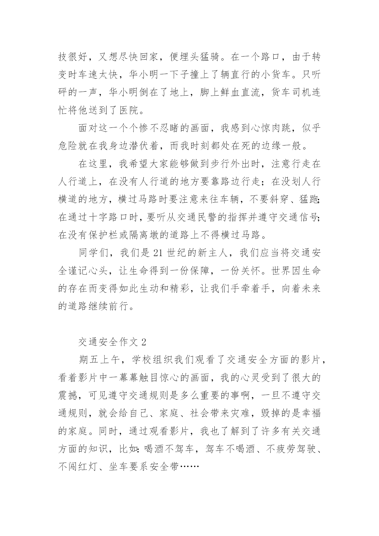 交通安全作文小学交通安全作文(通用5篇)在平凡的学习、工作、生活中,大家总免不了要接触或使用作文吧,作文是通过文字来表达一个主题意义的记叙方法。还是对作文一筹莫展吗?以下是小编精心整理的小学交通安全作文(通用5篇),欢迎大家借鉴与参考,希望对大家有所帮助。交通安全作文1世界上最宝贵的是什么呢?数之不尽的财富;辉煌伟大的事业,还是至高无尚的荣誉。但在我看来唯有“生命”才是无比重要和珍贵的。随着科技的发展,人们的生命水平逐渐提高,交通工具也越来越先进、发达。此刻,人们的生命也面临着巨大的威胁。校园生活是丰富多彩的,学校常会举行一些大型的集体活动,如春游、参观访问等,这是活跃校园气氛,提高同学们对社会的认识,增长同学们的知识与才干的重要举措。由于这些活动参加人数众多、人员高度集中,因此很容易发生安全事故,对同学们造成伤害。20xx年11月14日清晨,犹如一场突如其来的噩梦,21条鲜活的生命瞬间离去,给亲人留下了永远难以平复的伤痛。14日早晨5点14分,长治市沁源县部道镇汾阳至屯留的省道上发生了一起特大交通事故。沁源县第二中学的900多名学生在公路上跑步,后掉头返校时,一辆东风带挂货车横冲直撞地朝学生碾压过来,当场有18名师生命丧车轮。在沁源县第二人民医院抢救伤者的过程中,又有3名学生因抢救无效死亡。上午,在第二中学的校门口,从60多里外的乡村赶来的一位学生家长眼里噙着泪花,正焦急地打听自己女儿的下落,一直等到下午4点,她也没有获得关于孩子的任何消息。随后,她在交警提供的一份死亡名单中查找,翻到第二页就看到了自己女儿的`名字……在晴天出行,无论是步行还是骑车,都会心情愉快,高兴而去,开心而归。可是,天气总是不断变化着的,也许清晨起床,外面就细雨绵绵;或者行至中途,大雨倾盆;也许一夜风雪,早起出门便天寒地冻,路滑难行,或者大雪纷飞,风如刀削。面对这些糟糕的天气,同学们骑车出行时,难免会遭遇不测。华小明是一名七年级学生,由于家离学校较远,公交车不多且经常误点,几次迟到后,老师严厉地批评了他。华小明回家后,便要求爸爸给自己买一辆自行车,开始爸爸不同意,认为小明还小,虽然会骑车,但是路上车多人多,骑车上学不安全。后来,经过妈妈的劝说,华小明终于得到了一辆崭新的自行车,每天骑着它上学,小明都小心翼翼,两个星期后,爸爸也消除了顾虑。可是有一天,放学时天空中乌云翻滚,狂风大作,顷刻间,暴雨倾盆而下。华小明自恃车技很好,又想尽快回家,便埋头猛骑。在一个路口,由于转变时车速太快,华小明一下子撞上了辆直行的小货车。只听砰的一声,华小明倒在了地上,脚上鲜血直流,货车司机连忙将他送到了医院。面对这一个个惨不忍睹的画面,我感到心惊肉跳,似乎危险就在我身边潜伏着,而我时刻都处在死的边缘一般。在这里,我希望大家能够做到步行外出时,注意行走在人行道上,在没有人行道的地方要靠路边行走;在没划人行横道的地方,横过马路时要注意来往车辆,不要斜穿、猛跑;在通过十字路口时,要听从交通民警的指挥并遵守交通信号;在没有保护栏或隔离墩的道路上不得横过马路。同学们,我们是21世纪的新主人,我们应当将交通安全谨记心头,让生命得到一份保障,一份关怀。世界因生命的存在而变得如此生动和精彩,让我们手牵着手,向着未来的道路继续前行。交通安全作文2期五上午,学校组织我们观看了交通安全方面的影片,看着影片中一幕幕触目惊心的画面,我的心灵受到了很大的震撼,可见遵守交通规则是多么重要的事啊,一旦不遵守交通规则,就会给自己、家庭、社会带来灾难,毁掉的是幸福的家庭。同时,通过观看影片,我也了解到了许多有关交通方面的知识,比如:喝酒不驾车,驾车不喝酒、不疲劳驾驶、不闯红灯、坐车要系安全带……提到安全驾驶,我可是深有体会,就在星期四的中午,就发生了一件让我难忘的交通事故。中午,妈妈带我去饭店吃饭,就在转弯停车的时候,突然一个叔叔骑着摩托车飞速驶来,可能是他根本就没有看到我们的转向灯在闪烁,一下子就撞上了我们的车子,只听“砰”的一声响,摩托车甩出去很远,叔叔也躺在了地上,我吓得心怦怦直跳,心想:坏了,出事了!妈妈也吓得脸色煞白,慌忙刹车,我俩急忙下车查看,幸亏人没什么大事,可是双方的车子都受到了不同程度的损伤,交警赶到勘察现场,原来,是那位叔叔严重违章,他不但无证驾驶,而且超速驾驶,按照规定,要对他进行拘留15天并罚款的处罚,此时,那位叔叔才感到了害怕,苦苦哀求。通过这件事让我深受教育,叔叔因为没有遵守交通规则,给他自己和我们带来了多大的麻烦呀,万幸的是上坡,如果是下坡,估计叔叔就惨了。由此,我更加感受到了遵守交通规则的重要性,如果人人都遵守交通规则,就会避免很多事故的发生,就会成全千万个幸福的家庭。所以,我倡议,人人都要自觉遵守交通规则,尤其作为少先队员,更应该起到模范带头作用,用自己的实际行动带动的人,