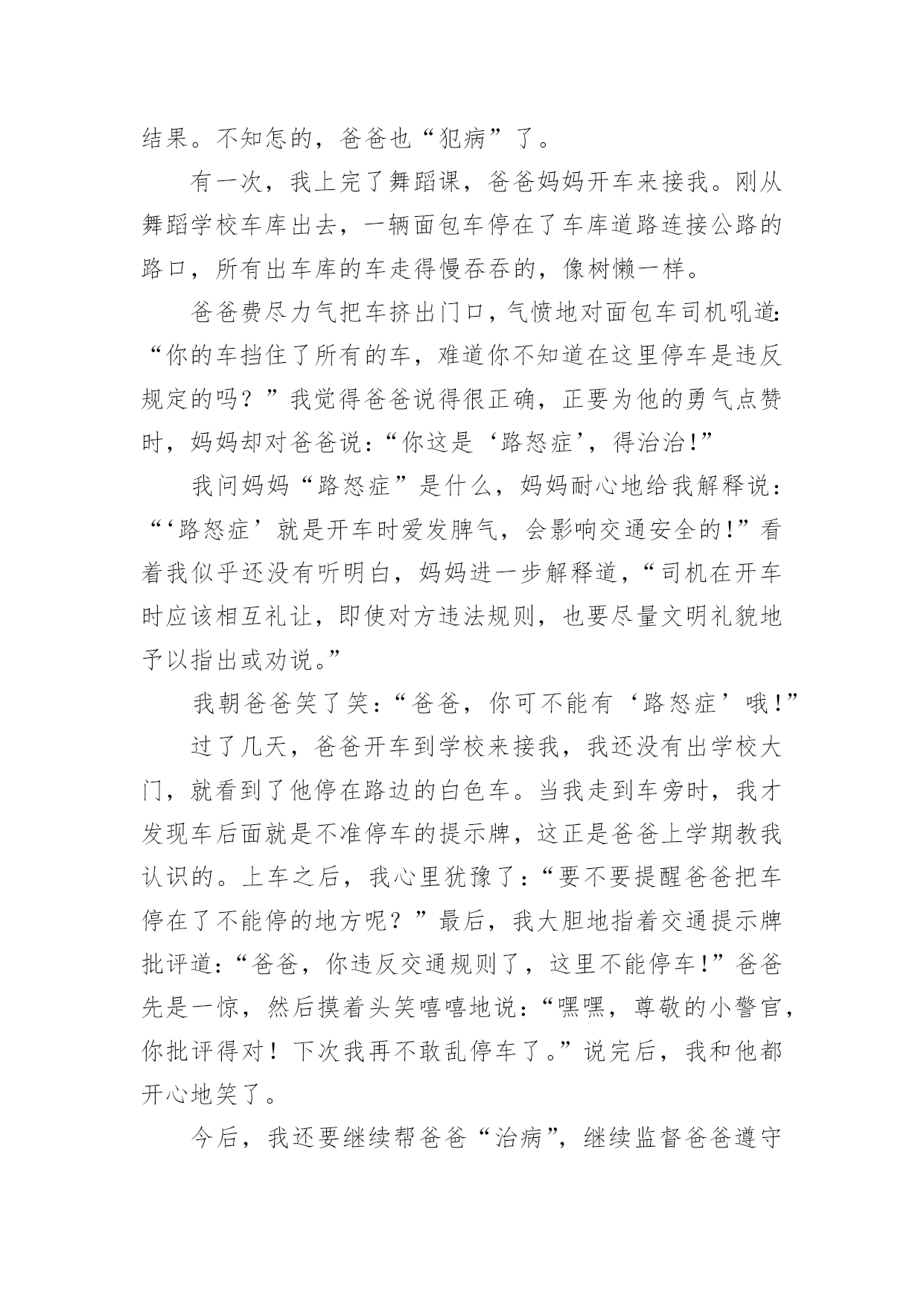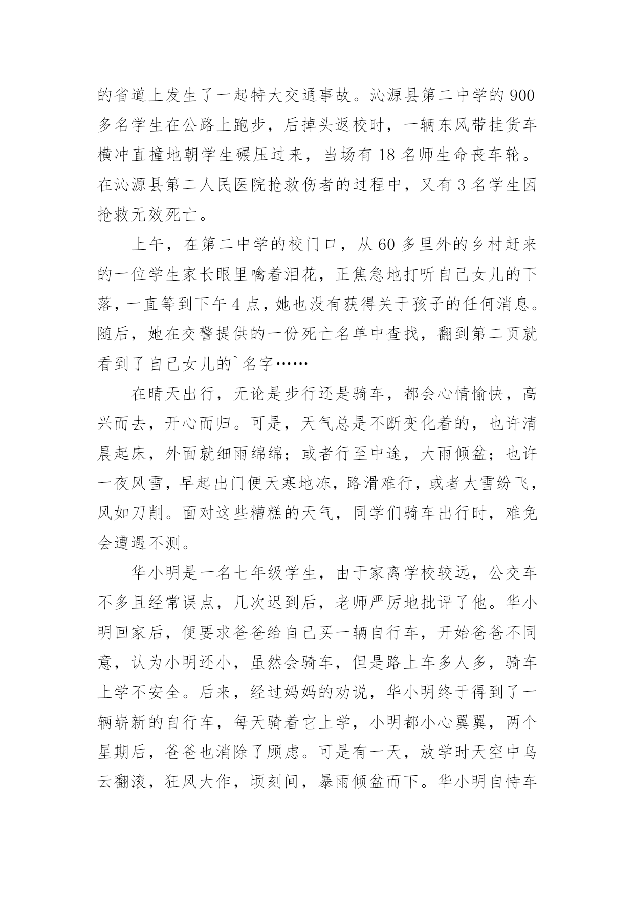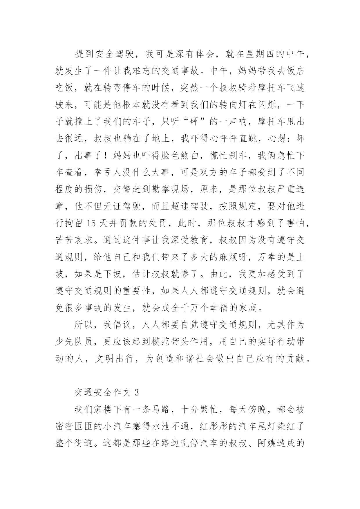 交通安全作文小学交通安全作文(通用5篇)在平凡的学习、工作、生活中,大家总免不了要接触或使用作文吧,作文是通过文字来表达一个主题意义的记叙方法。还是对作文一筹莫展吗?以下是小编精心整理的小学交通安全作文(通用5篇),欢迎大家借鉴与参考,希望对大家有所帮助。交通安全作文1世界上最宝贵的是什么呢?数之不尽的财富;辉煌伟大的事业,还是至高无尚的荣誉。但在我看来唯有“生命”才是无比重要和珍贵的。随着科技的发展,人们的生命水平逐渐提高,交通工具也越来越先进、发达。此刻,人们的生命也面临着巨大的威胁。校园生活是丰富多彩的,学校常会举行一些大型的集体活动,如春游、参观访问等,这是活跃校园气氛,提高同学们对社会的认识,增长同学们的知识与才干的重要举措。由于这些活动参加人数众多、人员高度集中,因此很容易发生安全事故,对同学们造成伤害。20xx年11月14日清晨,犹如一场突如其来的噩梦,21条鲜活的生命瞬间离去,给亲人留下了永远难以平复的伤痛。14日早晨5点14分,长治市沁源县部道镇汾阳至屯留的省道上发生了一起特大交通事故。沁源县第二中学的900多名学生在公路上跑步,后掉头返校时,一辆东风带挂货车横冲直撞地朝学生碾压过来,当场有18名师生命丧车轮。在沁源县第二人民医院抢救伤者的过程中,又有3名学生因抢救无效死亡。上午,在第二中学的校门口,从60多里外的乡村赶来的一位学生家长眼里噙着泪花,正焦急地打听自己女儿的下落,一直等到下午4点,她也没有获得关于孩子的任何消息。随后,她在交警提供的一份死亡名单中查找,翻到第二页就看到了自己女儿的`名字……在晴天出行,无论是步行还是骑车,都会心情愉快,高兴而去,开心而归。可是,天气总是不断变化着的,也许清晨起床,外面就细雨绵绵;或者行至中途,大雨倾盆;也许一夜风雪,早起出门便天寒地冻,路滑难行,或者大雪纷飞,风如刀削。面对这些糟糕的天气,同学们骑车出行时,难免会遭遇不测。华小明是一名七年级学生,由于家离学校较远,公交车不多且经常误点,几次迟到后,老师严厉地批评了他。华小明回家后,便要求爸爸给自己买一辆自行车,开始爸爸不同意,认为小明还小,虽然会骑车,但是路上车多人多,骑车上学不安全。后来,经过妈妈的劝说,华小明终于得到了一辆崭新的自行车,每天骑着它上学,小明都小心翼翼,两个星期后,爸爸也消除了顾虑。可是有一天,放学时天空中乌云翻滚,狂风大作,顷刻间,暴雨倾盆而下。华小明自恃车技很好,又想尽快回家,便埋头猛骑。在一个路口,由于转变时车速太快,华小明一下子撞上了辆直行的小货车。只听砰的一声,华小明倒在了地上,脚上鲜血直流,货车司机连忙将他送到了医院。面对这一个个惨不忍睹的画面,我感到心惊肉跳,似乎危险就在我身边潜伏着,而我时刻都处在死的边缘一般。在这里,我希望大家能够做到步行外出时,注意行走在人行道上,在没有人行道的地方要靠路边行走;在没划人行横道的地方,横过马路时要注意来往车辆,不要斜穿、猛跑;在通过十字路口时,要听从交通民警的指挥并遵守交通信号;在没有保护栏或隔离墩的道路上不得横过马路。同学们,我们是21世纪的新主人,我们应当将交通安全谨记心头,让生命得到一份保障,一份关怀。世界因生命的存在而变得如此生动和精彩,让我们手牵着手,向着未来的道路继续前行。交通安全作文2期五上午,学校组织我们观看了交通安全方面的影片,看着影片中一幕幕触目惊心的画面,我的心灵受到了很大的震撼,可见遵守交通规则是多么重要的事啊,一旦不遵守交通规则,就会给自己、家庭、社会带来灾难,毁掉的是幸福的家庭。同时,通过观看影片,我也了解到了许多有关交通方面的知识,比如:喝酒不驾车,驾车不喝酒、不疲劳驾驶、不闯红灯、坐车要系安全带……提到安全驾驶,我可是深有体会,就在星期四的中午,就发生了一件让我难忘的交通事故。中午,妈妈带我去饭店吃饭,就在转弯停车的时候,突然一个叔叔骑着摩托车飞速驶来,可能是他根本就没有看到我们的转向灯在闪烁,一下子就撞上了我们的车子,只听“砰”的一声响,摩托车甩出去很远,叔叔也躺在了地上,我吓得心怦怦直跳,心想:坏了,出事了!妈妈也吓得脸色煞白,慌忙刹车,我俩急忙下车查看,幸亏人没什么大事,可是双方的车子都受到了不同程度的损伤,交警赶到勘察现场,原来,是那位叔叔严重违章,他不但无证驾驶,而且超速驾驶,按照规定,要对他进行拘留15天并罚款的处罚,此时,那位叔叔才感到了害怕,苦苦哀求。通过这件事让我深受教育,叔叔因为没有遵守交通规则,给他自己和我们带来了多大的麻烦呀,万幸的是上坡,如果是下坡,估计叔叔就惨了。由此,我更加感受到了遵守交通规则的重要性,如果人人都遵守交通规则,就会避免很多事故的发生,就会成全千万个幸福的家庭。所以,我倡议,人人都要自觉遵守交通规则,尤其作为少先队员,更应该起到模范带头作用,用自己的实际行动带动的人,