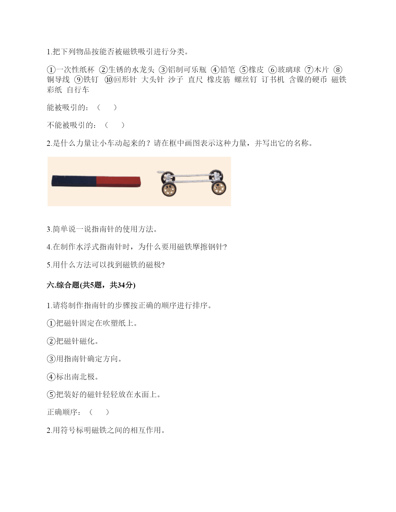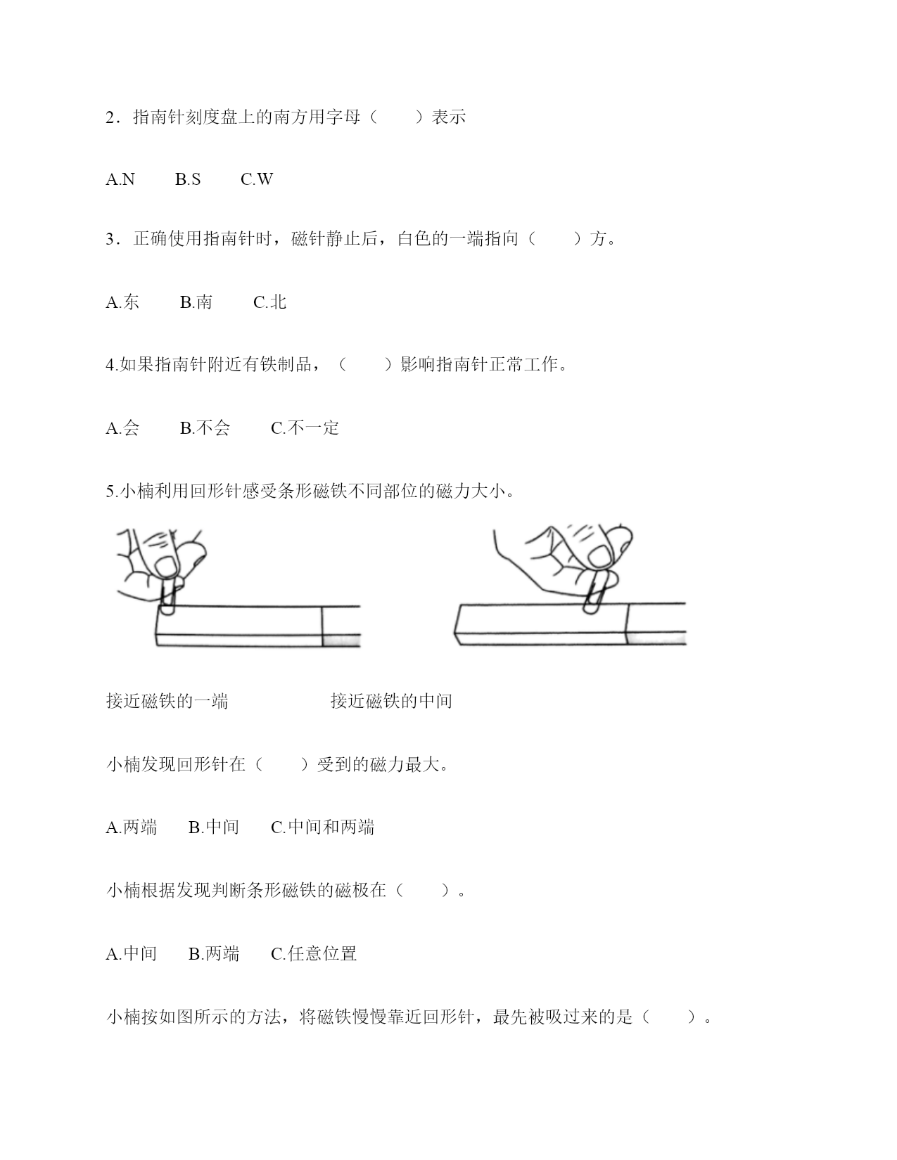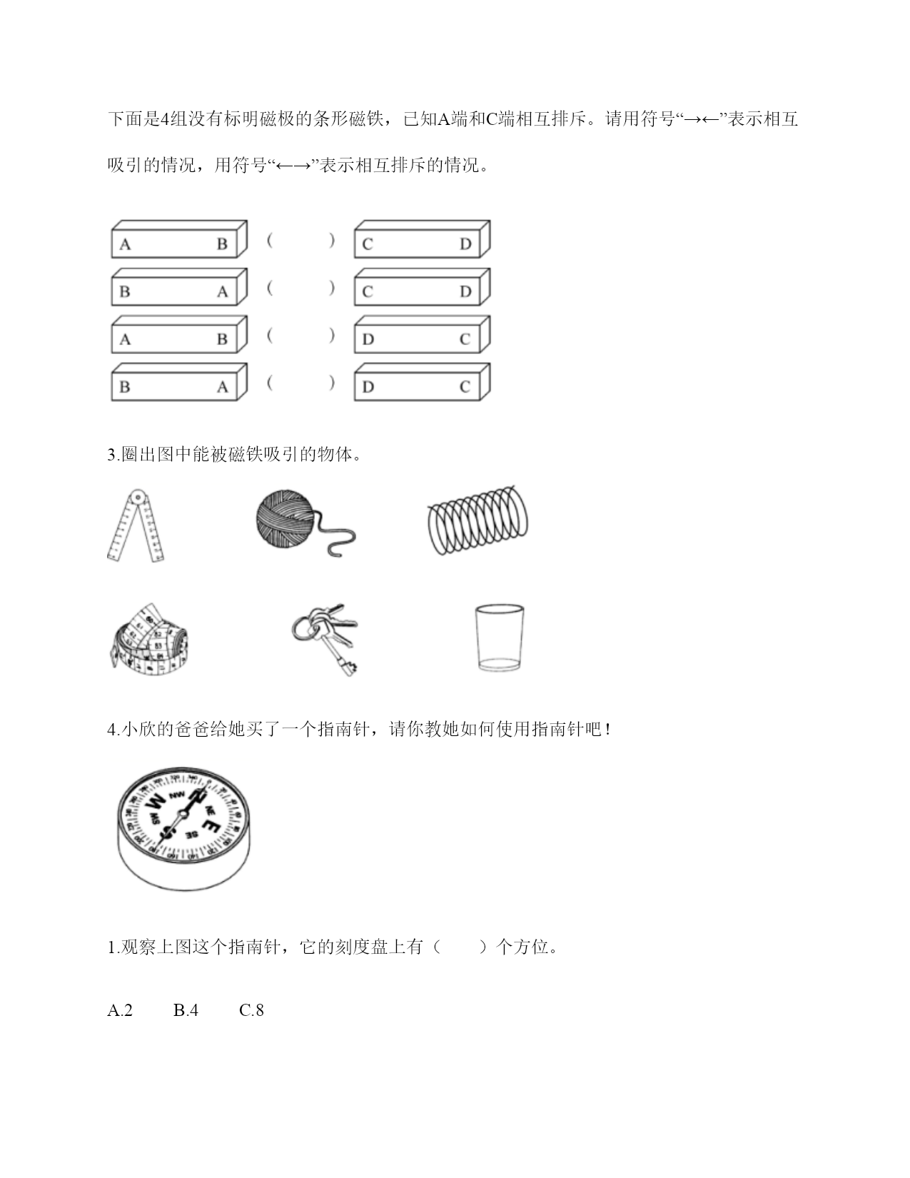 小学科学《磁铁》练习题一.选择题(共6题,共12分)1.指南针中字母S表示的方向为()。A.南B.北C.西2.将小磁针固定在吹塑纸上然后悬挂起来,针尖指示的方向是()方。A.南B.北C.东3.一个能够自由转动的磁铁,静止时,北极指向()方。A.东B.南C.北4.关于磁极,下列说法错误的是()。A.相同磁极相互靠近,会发生排斥现象B.球形磁铁没有磁极C.把蹄形磁铁折断成两部分,每部分上都有两个磁极5.下列运用磁铁同极相斥原理的是()。A.冰箱的门B.门吸C.蝴蝶飞游戏6.如果把小钢珠放在条形磁铁的中间,松开手,小钢珠会()。A.留在中间B.会掉下来滚向一端C.掉下来后不动了二.填空题(共6题,共30分)1.磁铁能吸引物体的性质叫()。2.磁悬浮列车的轨道上都装有特殊的磁铁,利用()的相互作用,列车就悬浮在轨道上了。3.写出两种能被磁铁吸引的物体:()、()。4.写出三种不同形状的磁铁的名字:()、()、()。5.玩具小车动起来是因为受到了()力、()力、()力等。6.磁铁能指示()方向,指南的磁极叫()极,用字母()表示;指北的磁极叫(),用字母()表示。三.判断题(共6题,共12分)1.把两个完全相同的磁铁吸在一起,磁力会增大一些,但不是成倍增长。如果把多个完全相同的磁铁吸在一起,磁力会增大,但是每次增长的磁力会随磁铁个数的增加而变小。()2.一块磁铁摔成两段后,每半段磁铁仍有两个磁极。()3.磁悬浮列车运用了磁铁异极相斥的原理。()4.力一定要接触到玩具小车才能使它动起来。()5.隔着水是不能使小车动起来的。()6.如图“用磁铁的不同部位接触回形针”这种排列是对的。()四.连线题(共1题,共4分)1.把下列事物和它应用的磁铁的原理用线连起来指示方向磁悬浮能吸铁记录信息五.简答题(共5题,共28分)1.把下列物品按能否被磁铁吸引进行分类。①一次性纸杯②生锈的水龙头③铝制可乐瓶④铅笔⑤橡皮⑥玻璃球⑦木片⑧铜导线⑨铁钉⑩回形针大头针沙子直尺橡皮筋螺丝钉订书机含镍的硬币磁铁彩纸自行车能被吸引的:()不能被吸引的:()2.是什么力量让小车动起来的?请在框中画图表示这种力量,并写出它的名称。3.简单说一说指南针的使用方法。4.在制作水浮式指南针时,为什么要用磁铁摩擦钢针?5.用什么方法可以找到磁铁的磁极?六.综合题(共5题,共34分)1.请将制作指南针的步骤按正确的顺序进行排序。①把磁针固定在吹塑纸上。②把磁针磁化。③用指南针确定方向。④标出南北极。⑤把装好的磁针轻轻放在水面上。正确顺序:()2.用符号标明磁铁之间的相互作用。下面是4组没有标明磁极的条形磁铁,已知A端和C端相互排斥。请用符号“→←”表示相互吸引的情况,用符号“←→”表示相互排斥的情况。3.圈出图中能被磁铁吸引的物体。4.小欣的爸爸给她买了一个指南针,请你教她如何使用指南针吧!1.观察上图这个指南针,它的刻度盘上有()个方位。A.2B.4C.82.指南针刻度盘上的南方用字母()表示A.NB.SC.W3.正确使用指南针时,磁针静止后,白色的一端指向()方。A.东B.南C.北4.如果指南针附近有铁制品,()影响指南针正常工作。A.会B.不会C.不一定5.小楠利用回形针感受条形磁铁不同部位的磁力大小。接近磁铁的一端接近磁铁的中间小楠发现回形针在()受到的磁力最大。A.两端B.中间C.中间和两端小楠根据发现判断条形磁铁的磁极在()。A.中间B.两端C.任意位置小楠按如图所示的方法,将磁铁慢慢靠近回形针,最先被吸过来的是()。A.1号和3号B.1号和5号C.3号和5号用条形磁铁的不同位置吸引回形针,下列说法错误的是()。A.a点吸引的回形针数量最少B.a点和e点吸引的回形针数量最多C.b点吸引的回形针数量比e点多参考答案一.选择题1.A2.A3.C4.B5.C6.B二.填空题1.磁性2.磁极3.回形针;一元硬币4.条形磁铁;环形磁铁;蹄形磁铁5.推;拉;磁6.南北;南;S;北;N三.判断题1.×2.√3.×4.×5.×6.√四.连线题1.如下:五.简答题1.能被吸引的:;不能被吸引的:2.磁力。3.1、把指南针放平,让磁针自由转动。2、磁针静止后,红色一端指北方,白色一端指南方。3、转动指南针,使刻度盘上的南(S)北(N)方向与磁针指的方向一致。这样,刻度盘上的方向就是实际的方向了。4.为了让本来没有磁性的钢针变得有磁性。5.用磁铁去吸引铁粉,哪个位置吸引的多,那个位置就是磁极。六.综合题1.②①⑤③④2.→←,←→,←→,→←。3.如下:4.C