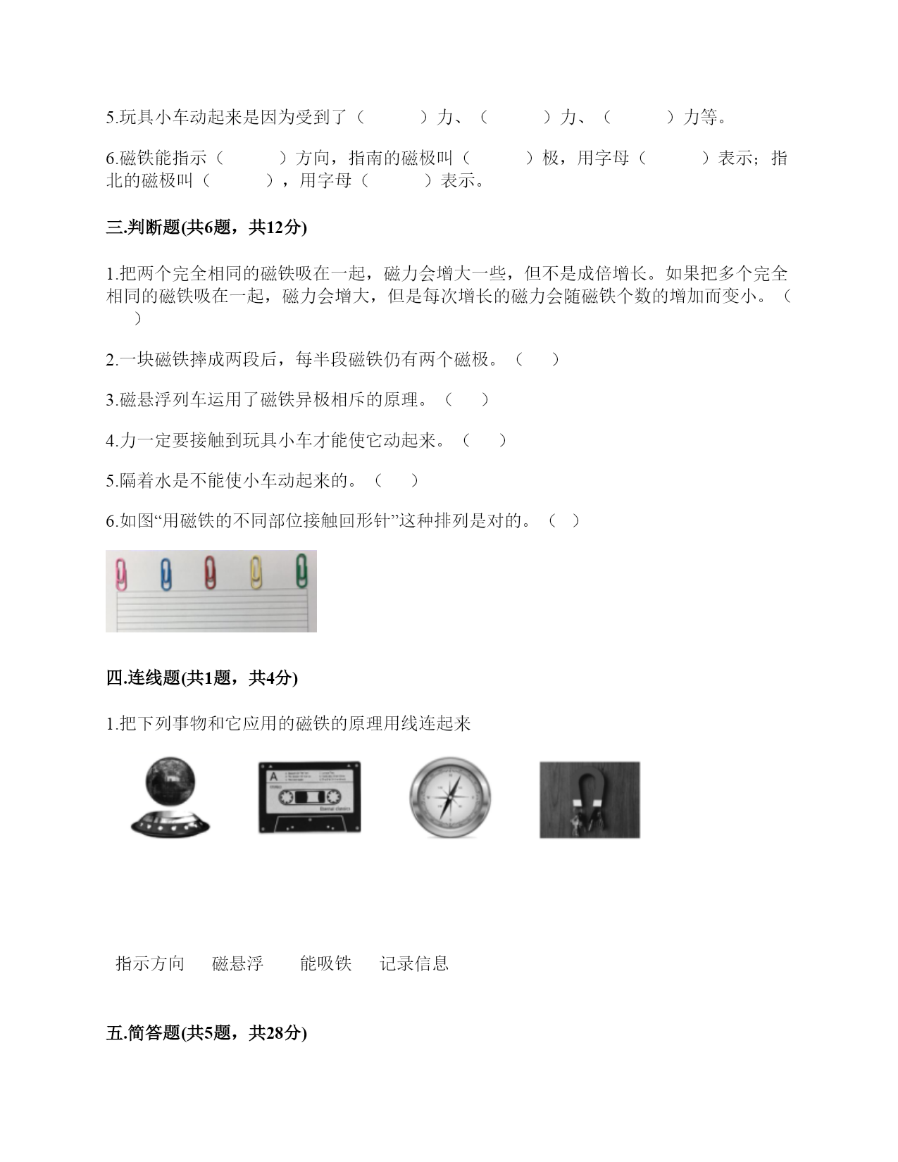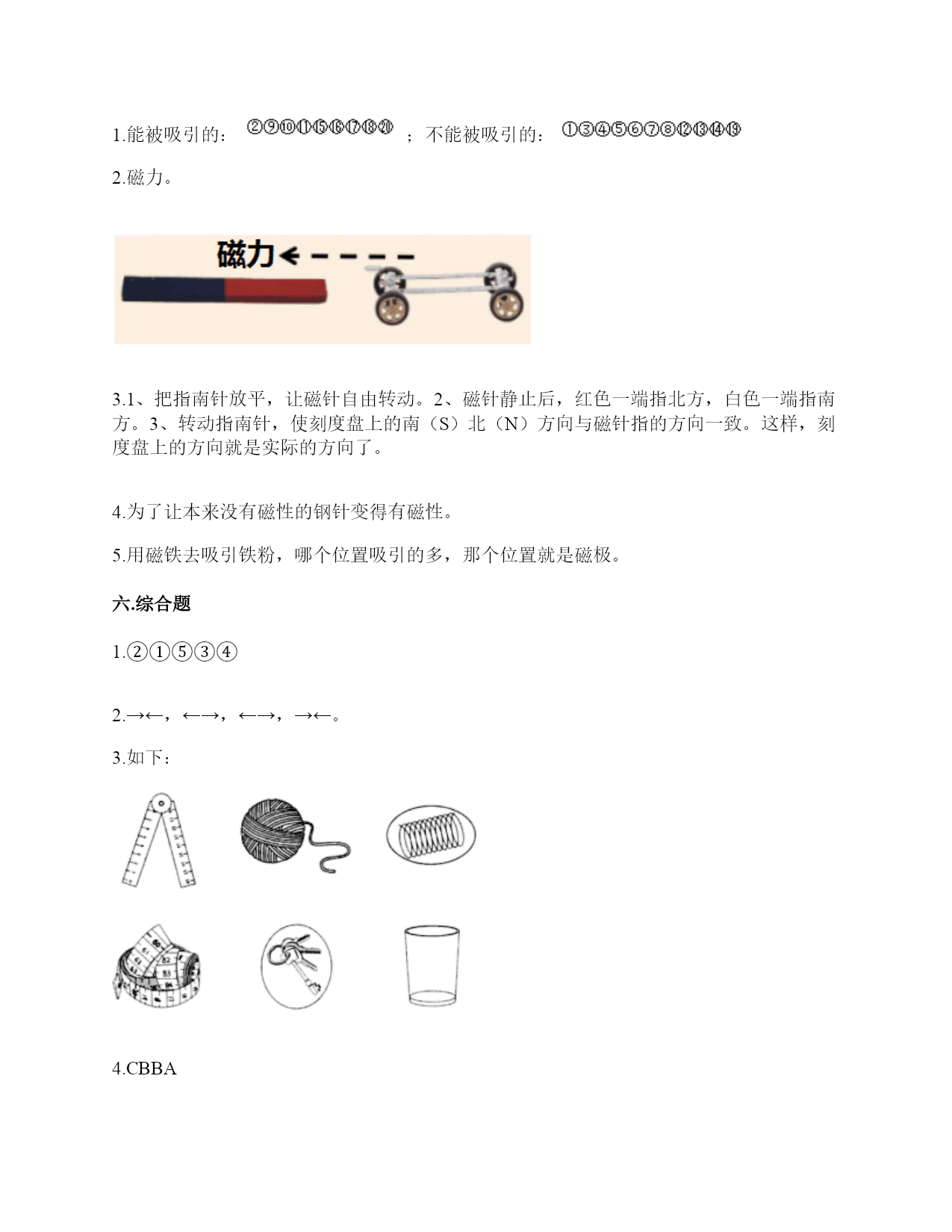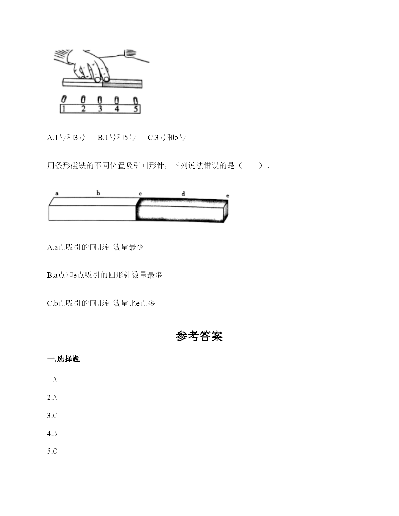 小学科学《磁铁》练习题一.选择题(共6题,共12分)1.指南针中字母S表示的方向为()。A.南B.北C.西2.将小磁针固定在吹塑纸上然后悬挂起来,针尖指示的方向是()方。A.南B.北C.东3.一个能够自由转动的磁铁,静止时,北极指向()方。A.东B.南C.北4.关于磁极,下列说法错误的是()。A.相同磁极相互靠近,会发生排斥现象B.球形磁铁没有磁极C.把蹄形磁铁折断成两部分,每部分上都有两个磁极5.下列运用磁铁同极相斥原理的是()。A.冰箱的门B.门吸C.蝴蝶飞游戏6.如果把小钢珠放在条形磁铁的中间,松开手,小钢珠会()。A.留在中间B.会掉下来滚向一端C.掉下来后不动了二.填空题(共6题,共30分)1.磁铁能吸引物体的性质叫()。2.磁悬浮列车的轨道上都装有特殊的磁铁,利用()的相互作用,列车就悬浮在轨道上了。3.写出两种能被磁铁吸引的物体:()、()。4.写出三种不同形状的磁铁的名字:()、()、()。5.玩具小车动起来是因为受到了()力、()力、()力等。6.磁铁能指示()方向,指南的磁极叫()极,用字母()表示;指北的磁极叫(),用字母()表示。三.判断题(共6题,共12分)1.把两个完全相同的磁铁吸在一起,磁力会增大一些,但不是成倍增长。如果把多个完全相同的磁铁吸在一起,磁力会增大,但是每次增长的磁力会随磁铁个数的增加而变小。()2.一块磁铁摔成两段后,每半段磁铁仍有两个磁极。()3.磁悬浮列车运用了磁铁异极相斥的原理。()4.力一定要接触到玩具小车才能使它动起来。()5.隔着水是不能使小车动起来的。()6.如图“用磁铁的不同部位接触回形针”这种排列是对的。()四.连线题(共1题,共4分)1.把下列事物和它应用的磁铁的原理用线连起来指示方向磁悬浮能吸铁记录信息五.简答题(共5题,共28分)1.把下列物品按能否被磁铁吸引进行分类。①一次性纸杯②生锈的水龙头③铝制可乐瓶④铅笔⑤橡皮⑥玻璃球⑦木片⑧铜导线⑨铁钉⑩回形针大头针沙子直尺橡皮筋螺丝钉订书机含镍的硬币磁铁彩纸自行车能被吸引的:()不能被吸引的:()2.是什么力量让小车动起来的?请在框中画图表示这种力量,并写出它的名称。3.简单说一说指南针的使用方法。4.在制作水浮式指南针时,为什么要用磁铁摩擦钢针?5.用什么方法可以找到磁铁的磁极?六.综合题(共5题,共34分)1.请将制作指南针的步骤按正确的顺序进行排序。①把磁针固定在吹塑纸上。②把磁针磁化。③用指南针确定方向。④标出南北极。⑤把装好的磁针轻轻放在水面上。正确顺序:()2.用符号标明磁铁之间的相互作用。下面是4组没有标明磁极的条形磁铁,已知A端和C端相互排斥。请用符号“→←”表示相互吸引的情况,用符号“←→”表示相互排斥的情况。3.圈出图中能被磁铁吸引的物体。4.小欣的爸爸给她买了一个指南针,请你教她如何使用指南针吧!1.观察上图这个指南针,它的刻度盘上有()个方位。A.2B.4C.82.指南针刻度盘上的南方用字母()表示A.NB.SC.W3.正确使用指南针时,磁针静止后,白色的一端指向()方。A.东B.南C.北4.如果指南针附近有铁制品,()影响指南针正常工作。A.会B.不会C.不一定5.小楠利用回形针感受条形磁铁不同部位的磁力大小。接近磁铁的一端接近磁铁的中间小楠发现回形针在()受到的磁力最大。A.两端B.中间C.中间和两端小楠根据发现判断条形磁铁的磁极在()。A.中间B.两端C.任意位置小楠按如图所示的方法,将磁铁慢慢靠近回形针,最先被吸过来的是()。A.1号和3号B.1号和5号C.3号和5号用条形磁铁的不同位置吸引回形针,下列说法错误的是()。A.a点吸引的回形针数量最少B.a点和e点吸引的回形针数量最多C.b点吸引的回形针数量比e点多参考答案一.选择题1.A2.A3.C4.B5.C6.B二.填空题1.磁性2.磁极3.回形针;一元硬币4.条形磁铁;环形磁铁;蹄形磁铁5.推;拉;磁6.南北;南;S;北;N三.判断题1.×2.√3.×4.×5.×6.√四.连线题1.如下:五.简答题1.能被吸引的:;不能被吸引的:2.磁力。3.1、把指南针放平,让磁针自由转动。2、磁针静止后,红色一端指北方,白色一端指南方。3、转动指南针,使刻度盘上的南(S)北(N)方向与磁针指的方向一致。这样,刻度盘上的方向就是实际的方向了。4.为了让本来没有磁性的钢针变得有磁性。5.用磁铁去吸引铁粉,哪个位置吸引的多,那个位置就是磁极。六.综合题1.②①⑤③④2.→←,←→,←→,→←。3.如下:4.C